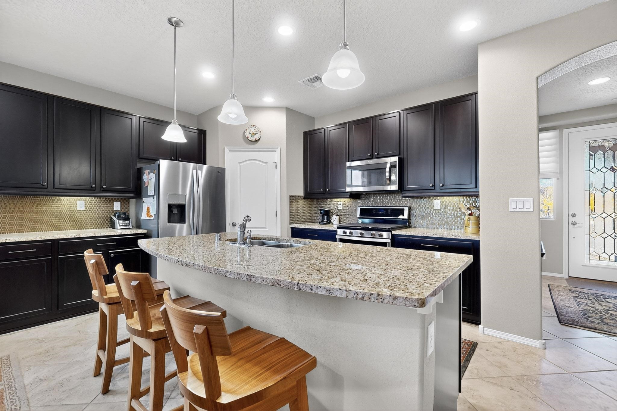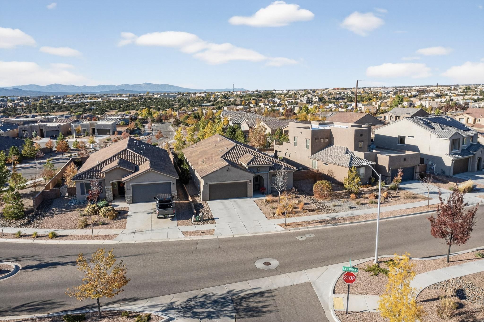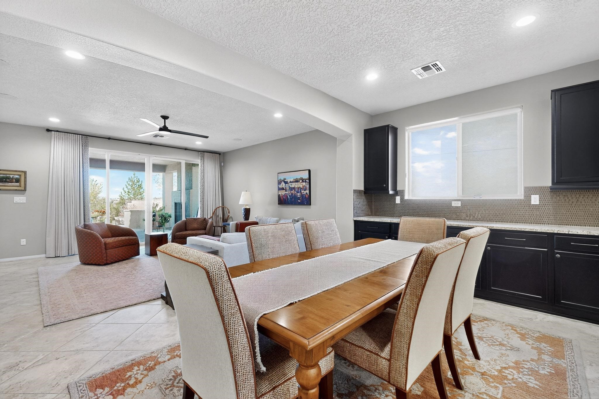 This is a one owner, former model home on a premium lot with many upgrades and even mountain views! There is shopping and restaurants nearby and easy access to I-25. The open concept living area is spacious and separates the primary suite from the 3 guest bedrooms. There are 2 bathrooms and also a den/office. Included are custom window coverings throughout. The front and back yards are beautifully landscaped. The turf and drip irrigation makes for easy maintenance. The backyard will bring year round enjoyment with a gas fireplace in the portal and a gas fire pit with sitting area in the yard. The house backs up to open space from which you will enjoy the mountain views and gorgeous Santa Fe sunsets. This is a must see if you are looking for a meticulously maintained single level home that is truly move in ready.