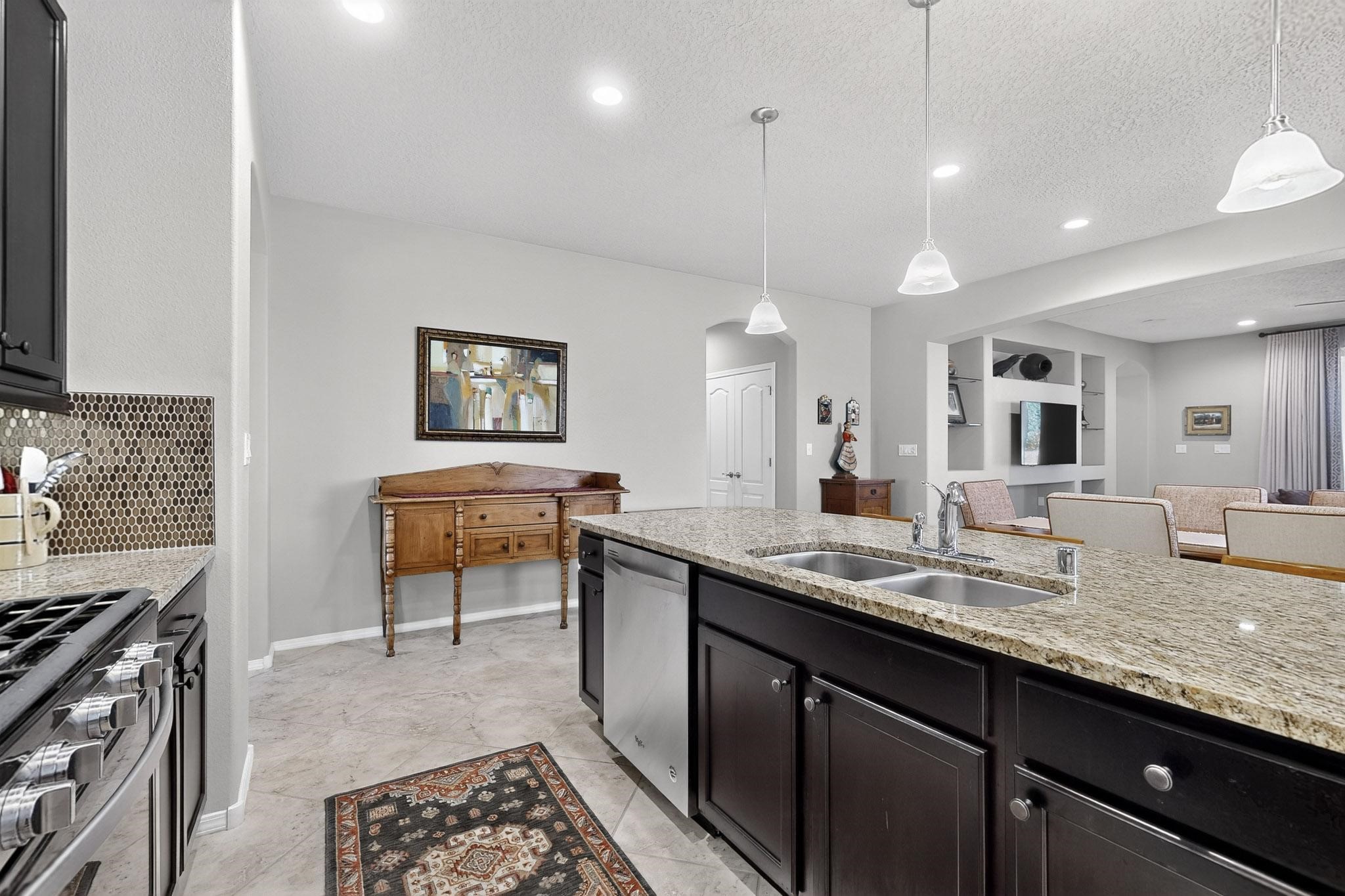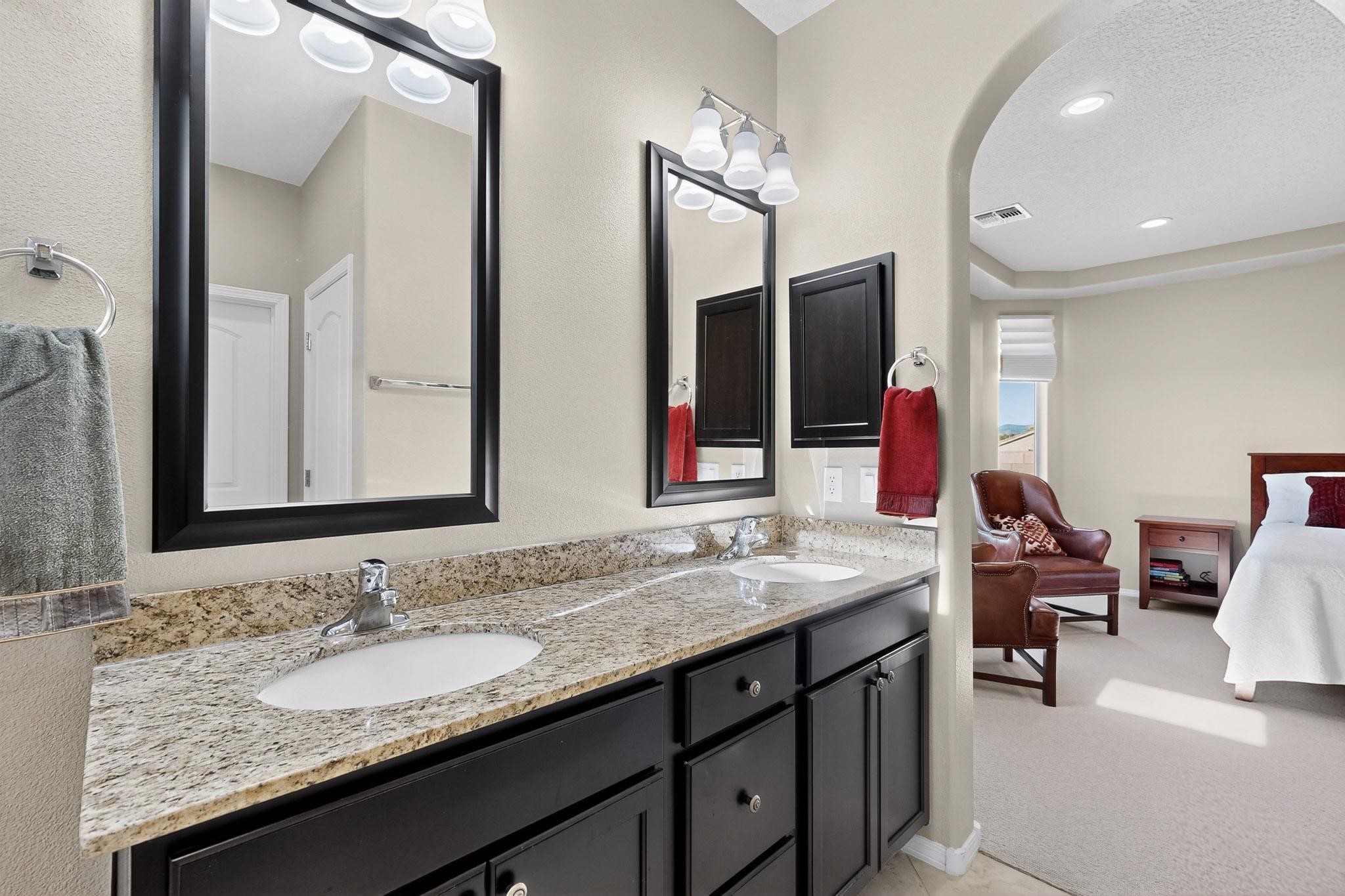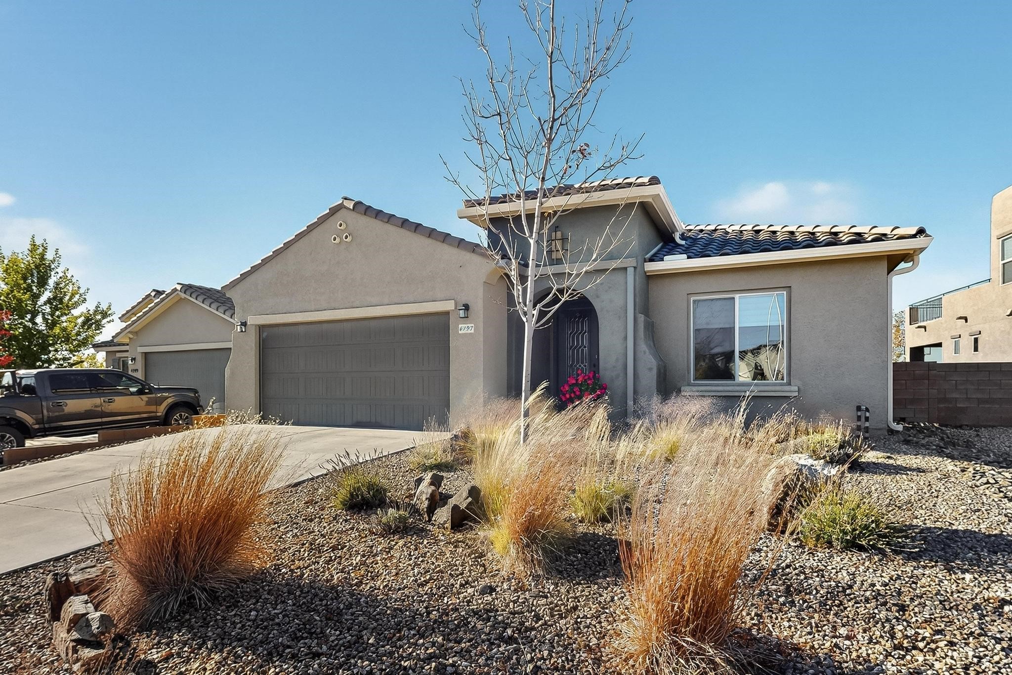 This is a one owner, former model home on a premium lot with many upgrades and even mountain views! There is shopping and restaurants nearby and easy access to I-25. The open concept living area is spacious and separates the primary suite from the 3 guest bedrooms. There are 2 bathrooms and also a den/office. Included are custom window coverings throughout. The front and back yards are beautifully landscaped. The turf and drip irrigation makes for easy maintenance. The backyard will bring year round enjoyment with a gas fireplace in the portal and a gas fire pit with sitting area in the yard. The house backs up to open space from which you will enjoy the mountain views and gorgeous Santa Fe sunsets. This is a must see if you are looking for a meticulously maintained single level home that is truly move in ready.