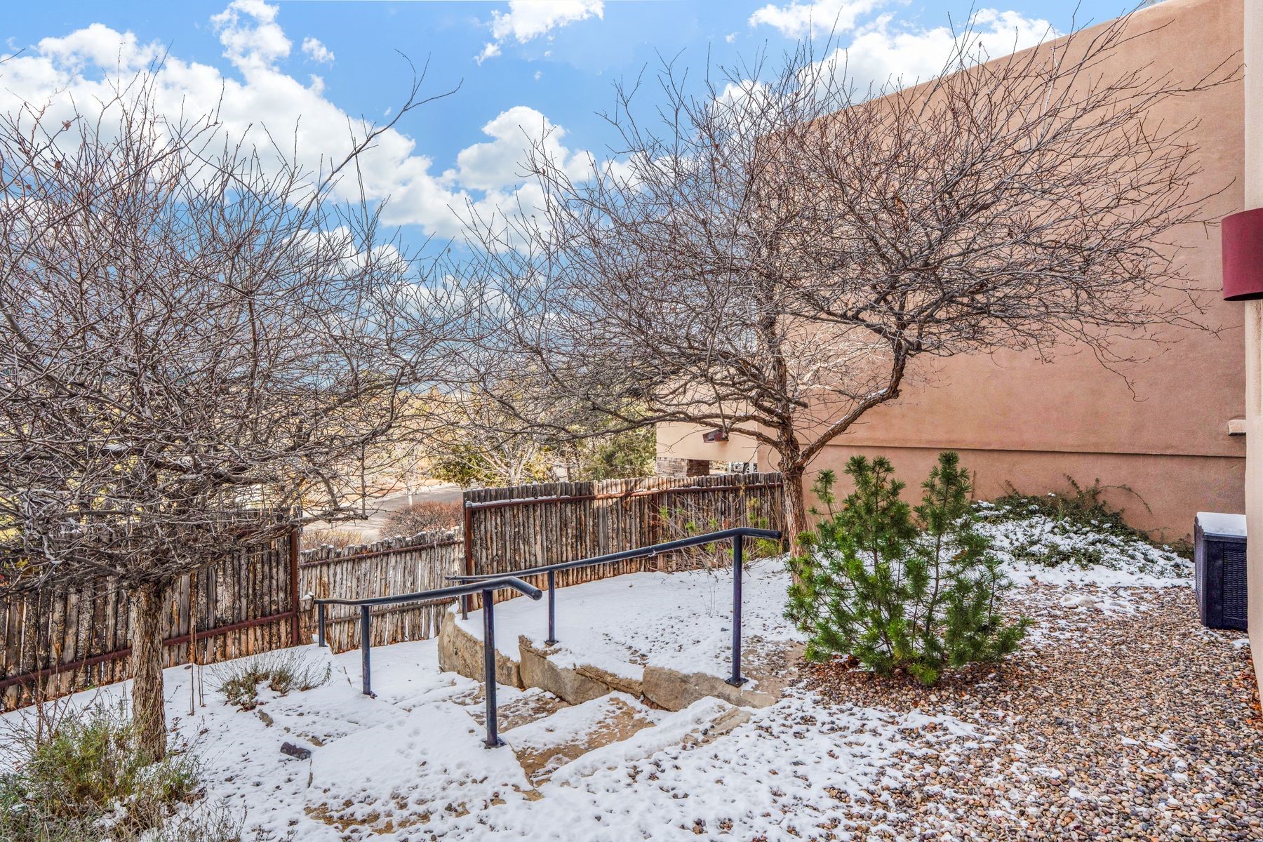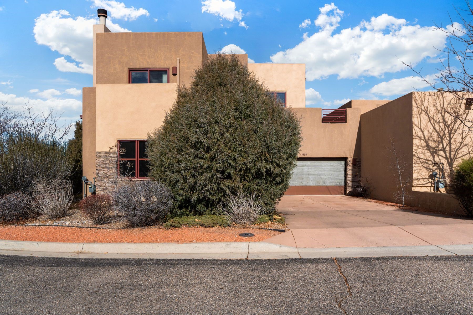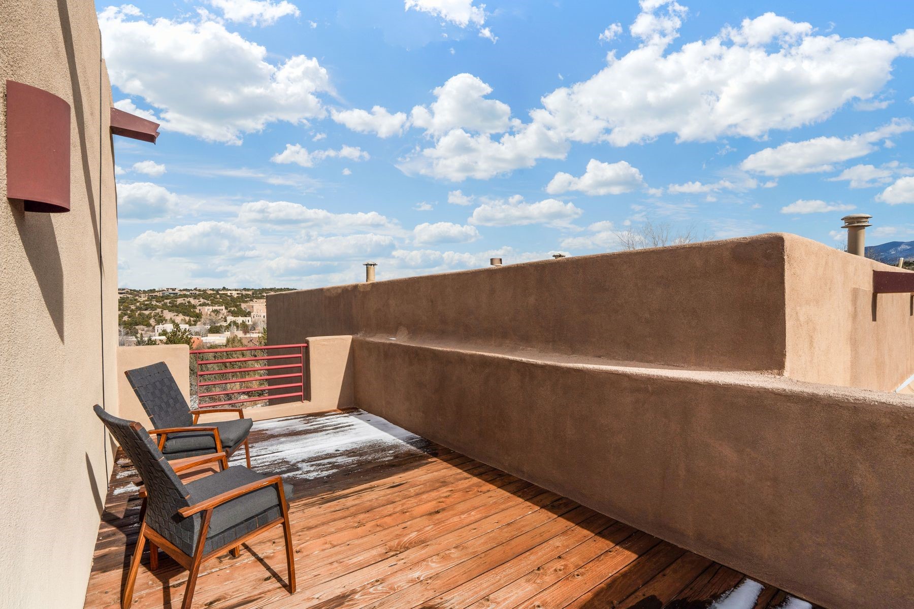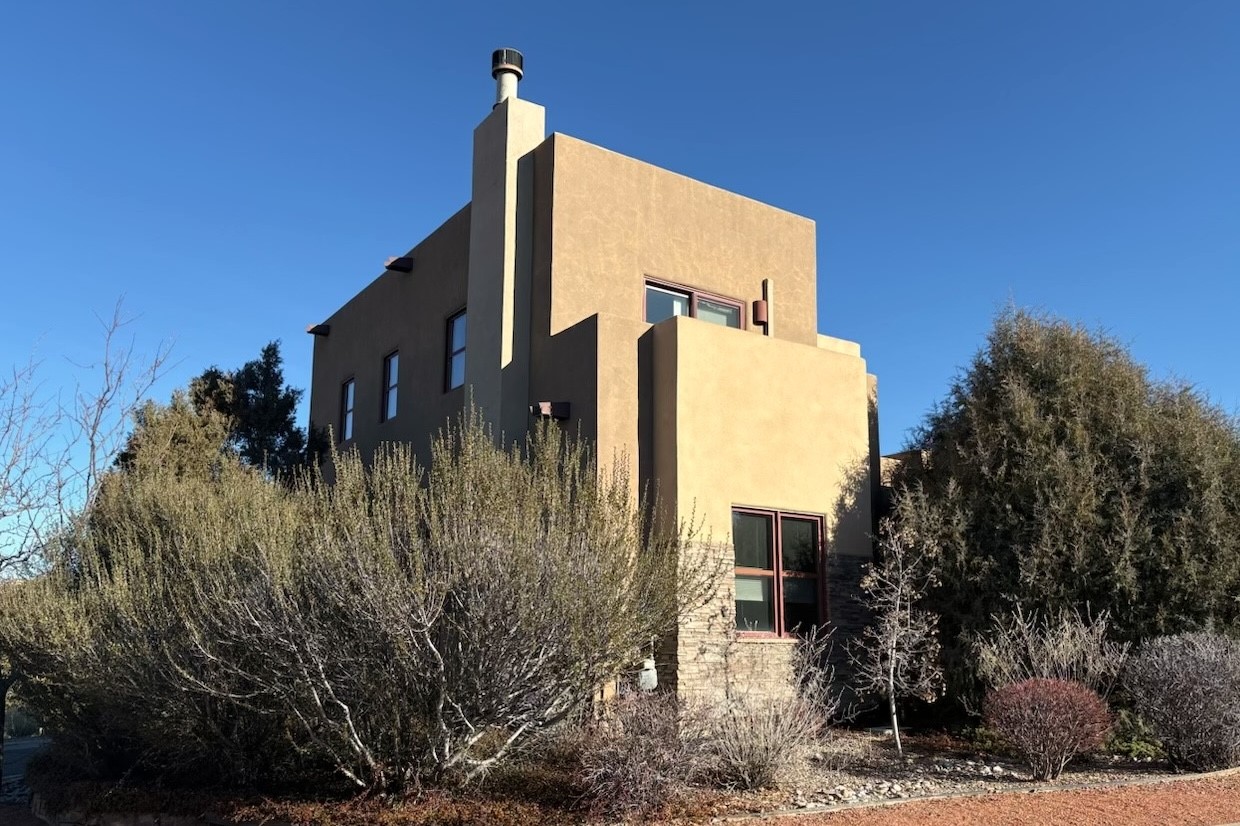 Lofty, light-filled and effortlessly stylish, this exceptional home captures panoramic mountain and city views from every direction. Privately positioned on a corner lot at the end of a cul-de-sac, the residence offers tranquility with the convenience of in-town living. Inside, an open, airy floor plan is anchored by warm wood floors, custom built-in bookshelves and a striking wood-burning fireplace that creates an inviting focal point in the living room. The dining and kitchen area flows seamlessly to a shady, beautifully landscaped backyard, fully fenced for pets and perfectly designed for outdoor entertaining.Originally a model home, the property features thoughtful upgrades throughout, including two upper decks, an optional second portal and full professional landscaping complete with lighting and irrigation. Enhanced finish work elevates every space. Recent improvements bring added comfort and style: a Mitsubishi ductless cooling and supplemental heating system, new stainless steel appliances, updated LED lighting and new window shades.Upstairs, the primary en-suite bedroom boasts a walk-in closet and a private rooftop deck framing Sangre de Cristo views. A sunny second bedroom -- ideal as a home office -- opens to its own balcony, while a third bedroom or den captures serene northern vistas. The layout offers excellent separation of space, making the home equally suited for full-time living or a lock-and-leave lifestyle.Located in the desirable Las Estrellas neighborhood, residents enjoy access to a beautiful community park, paved paths and the city's extensive trail network for hiking and biking. This peaceful Northside location is just minutes from the Plaza and DeVargas Mall, with easy commuting access to both Los Alamos and Albuquerque.With a rare blend of views, privacy and modern comfort, this home is truly a standout in one of Santa Fe's most sought-after settings.