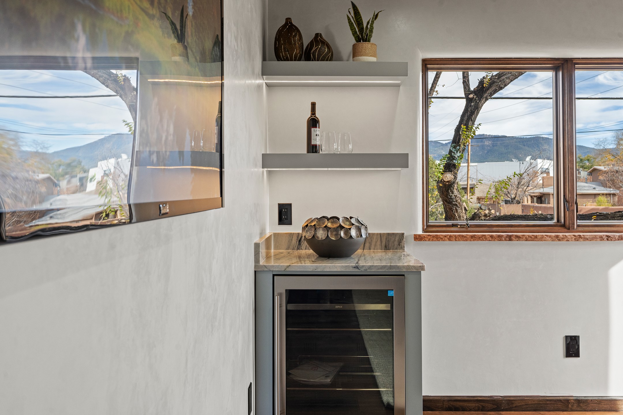 Timeless Santa Fe Charm Just Steps from the Railyard. Nestled in one of Santa Fe's most coveted locations, this beautifully restored adobe offers a rare blend of historic charm and modern luxury--just steps from the vibrant Railyard District and a short walk to the Plaza and Canyon Road. Originally constructed in the early 1900s, this 3-bedroom residence is complete with an attached studio or 4th bedroom that has been meticulously renovated to preserve its authentic character. Original vigas, flawless diamond plaster walls, arched entryways, and tongue-and-groove ceilings with recessed lighting create a warm, light-filled ambiance on a desirable corner lot. The home features two spacious primary suites--one on each level--offering flexibility and privacy. Entire second floor is dedicated to a primary suite with spa like bathroom with views of the Sangre De Cristo Mountains, an extra large closet and oversized suite with roof top access and dry bar with wine fridge. The attached studio, on the main level has its own private entrance, which is perfect for guests, extended family, or a dedicated creative space. The open-concept kitchen is a true showpiece, featuring new stainless steel appliances, a custom hood, hand-painted tile backsplash, and a stunning mix of Cambria and Quartzite countertops. Custom cabinetry, artistic lighting of hand forged steel and alabaster fixtures add a refined touch throughout. Nearly every room includes an ensuite bath with marble or quartzite countertops, premium Kohler plumbing fixtures, and exceptional craftsmanship in the tile showers. Rich, hand-scraped hickory wood floors flow seamlessly throughout, completing this designer-inspired remodel where no detail was overlooked. A rare opportunity to own a timeless Santa Fe treasure--just moments from world-class restaurants, galleries, and boutique shopping Santa Fe has to offer. The house appears to be permit eligible for an STR permit subject to change should someone new apply.