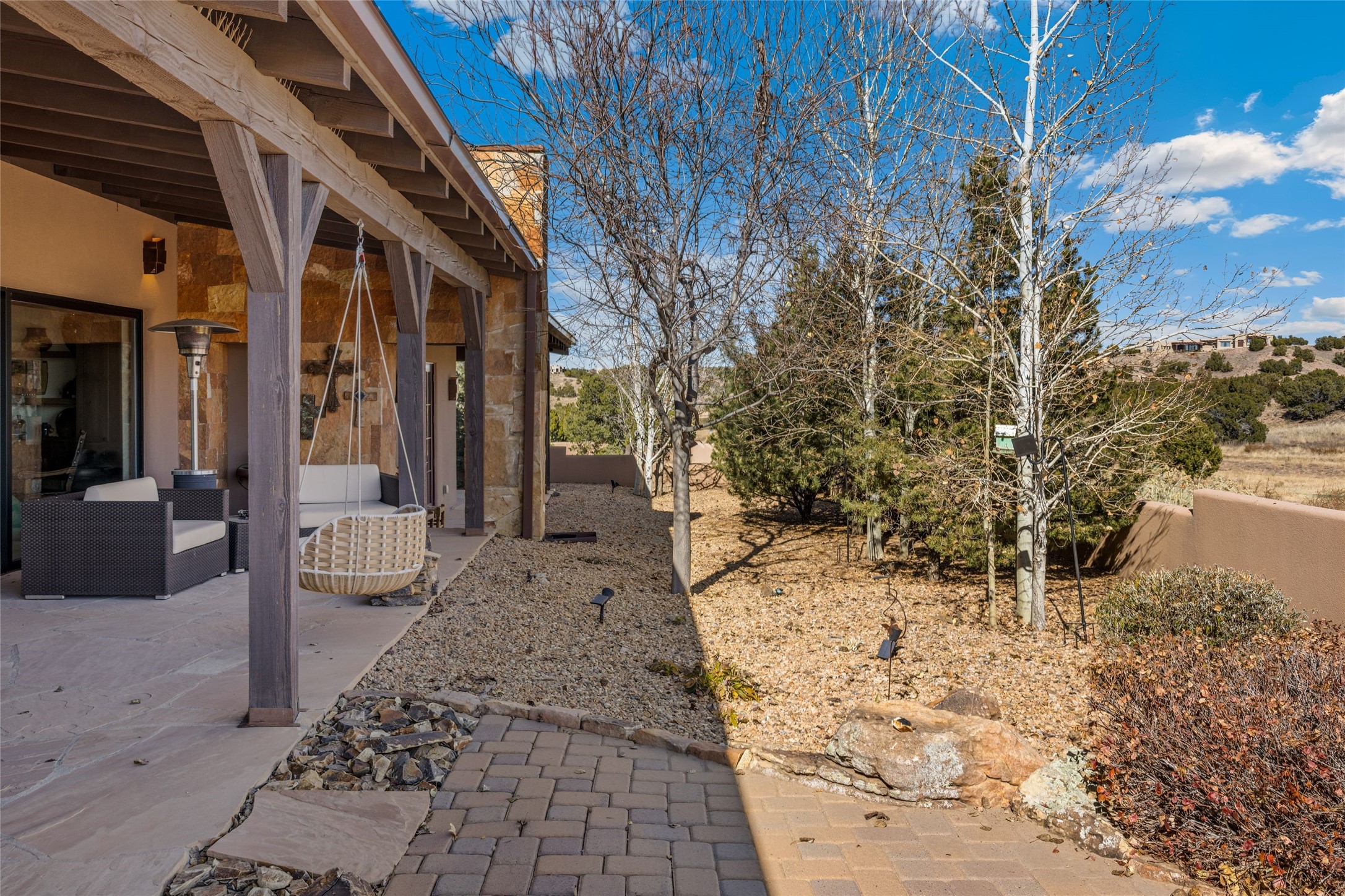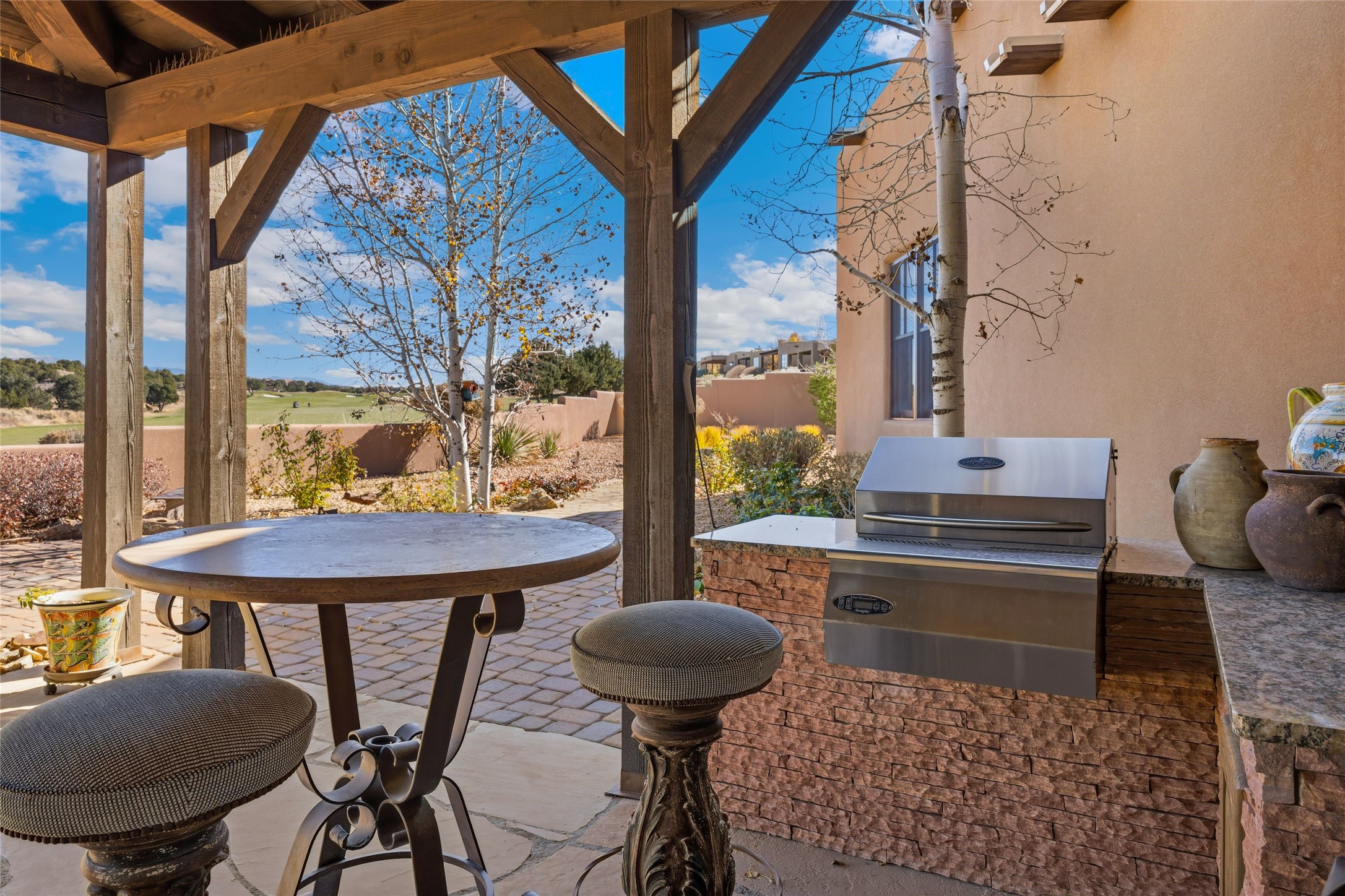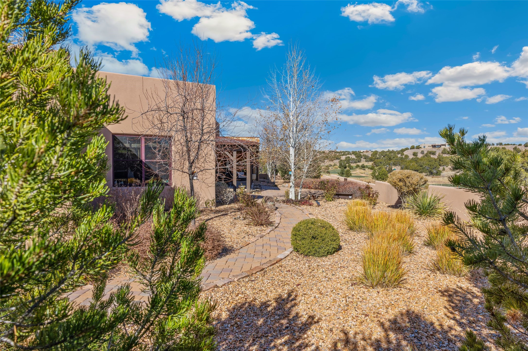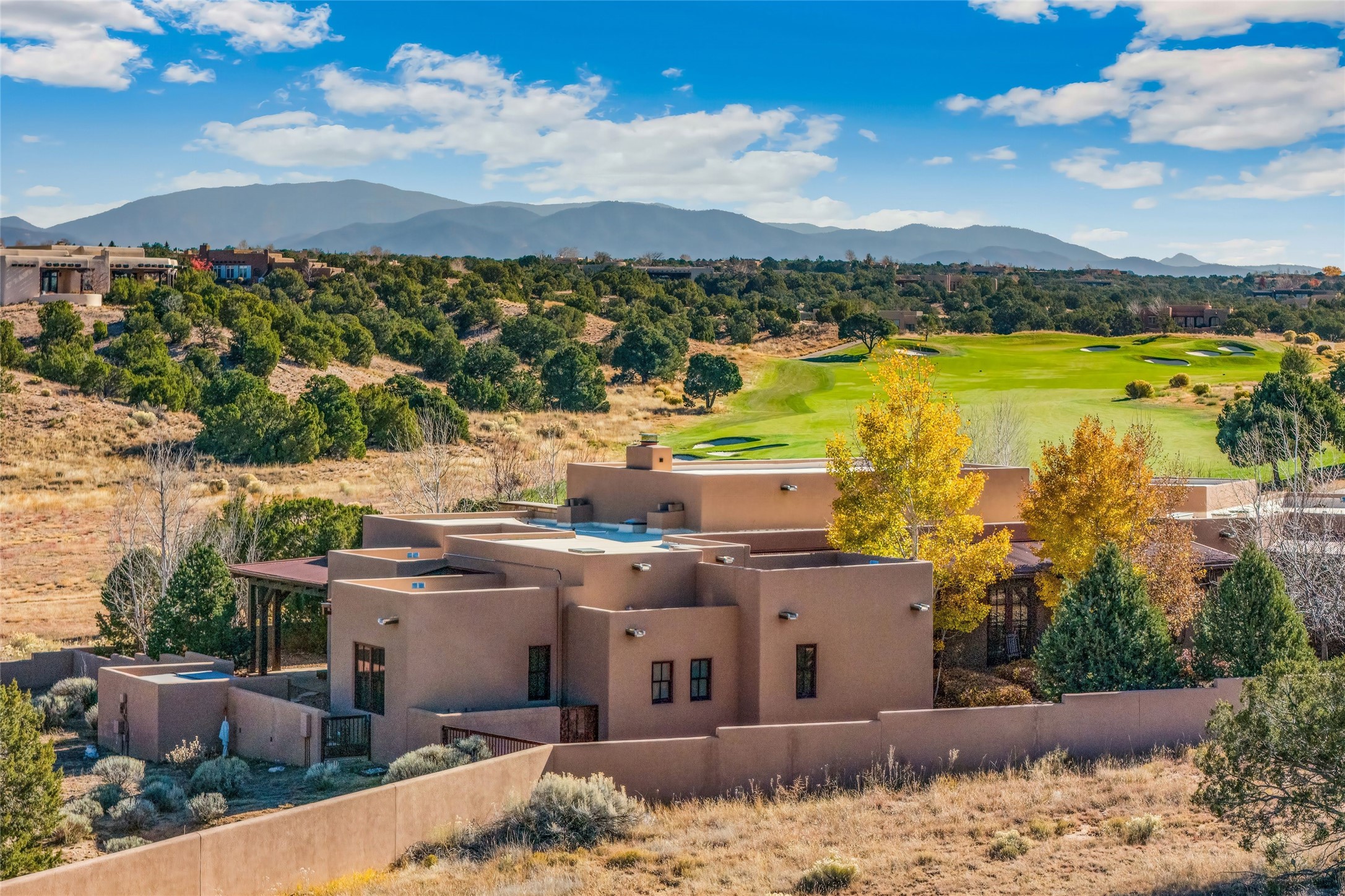 Experience a rare Northern New Mexican architectural gem in the heart of the famed Las Campanas community. Sited on an expansive, premier golf course lot with a park-like ambiance, this extraordinary 4-bedroom residence seamlessly blends iconic Santa Fe warmth with sophisticated modern design. From the lush aspen-lined entrance and wrap-around porch, the home invites you through four sets of French doors into a private front courtyard. Inside, the open-concept living and dining rooms captivate with soaring pitched ceilings, reclaimed wood beams, and a commanding stone fireplace. Newly installed retractable glass walls frame majestic views of the golf course and the Sangre de Cristo and Jemez mountains, creating a seamless, luxury indoor and outdoor living experience. The chef's kitchen is an entertainer's dream, featuring a massive stone-topped island, premium Thermador appliances, and a breakfast bar with direct access to the outdoor BBQ. Retreat to the secluded owner's suite--a sanctuary of peace offering a spa-like bath with a deep soaking tub, dual vanities, and private access to a tranquil outdoor spa. Designed for versatility, the floor plan includes a dedicated office with rich built-ins, two spacious guest bedrooms which share a bath, and a fully independent guest ensuite that serves as a secondary primary suite. Outside, the expansive living areas are surrounded by mature aspens, with over 1,700 square feet of covered portals, creating an unrivaled setting for grand gatherings or quiet reflection. With a recently updated roof, refreshed bathrooms, and meticulous craftsmanship, this one-of-a-kind home represents the absolute pinnacle of Santa Fe living.