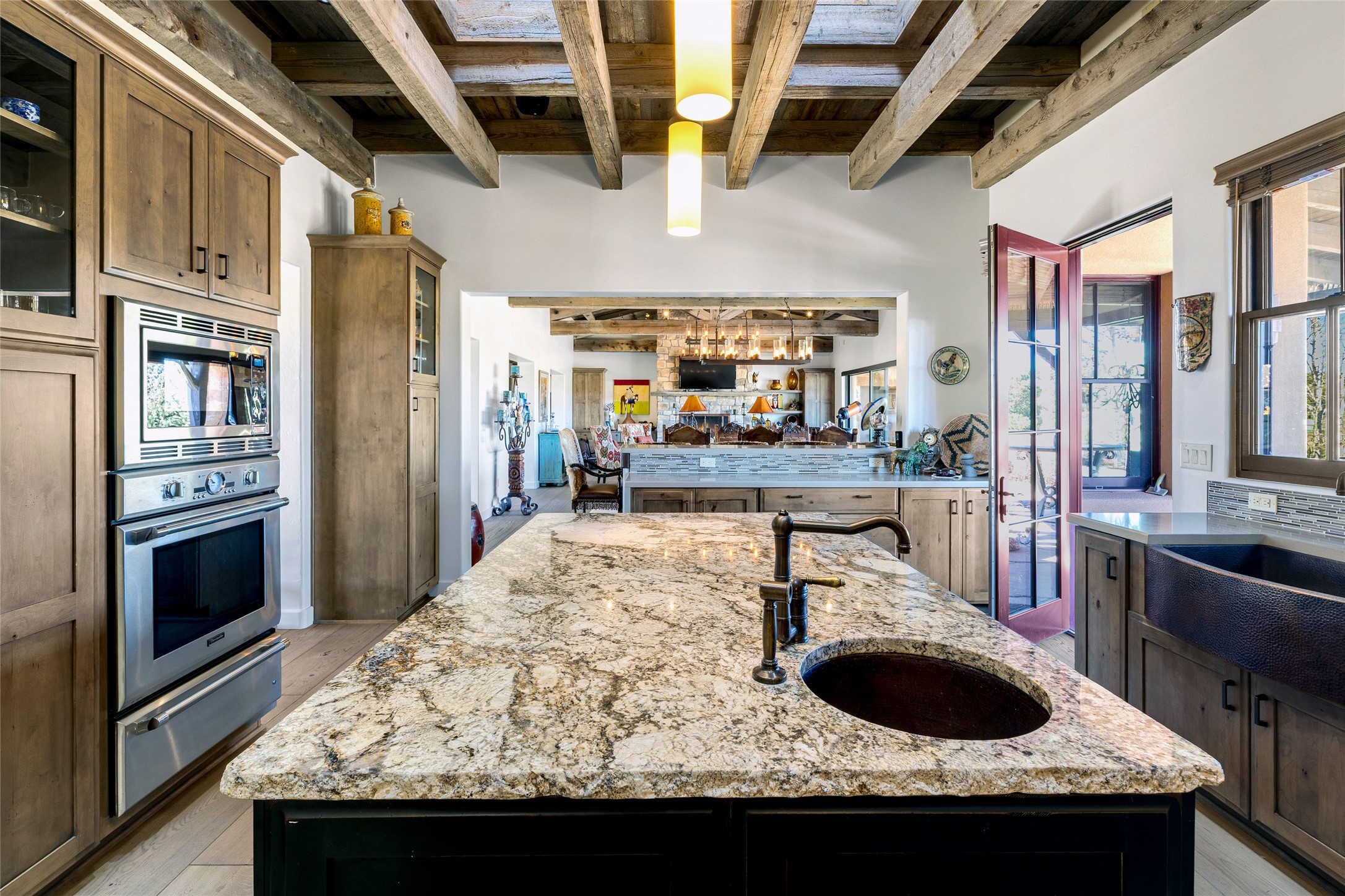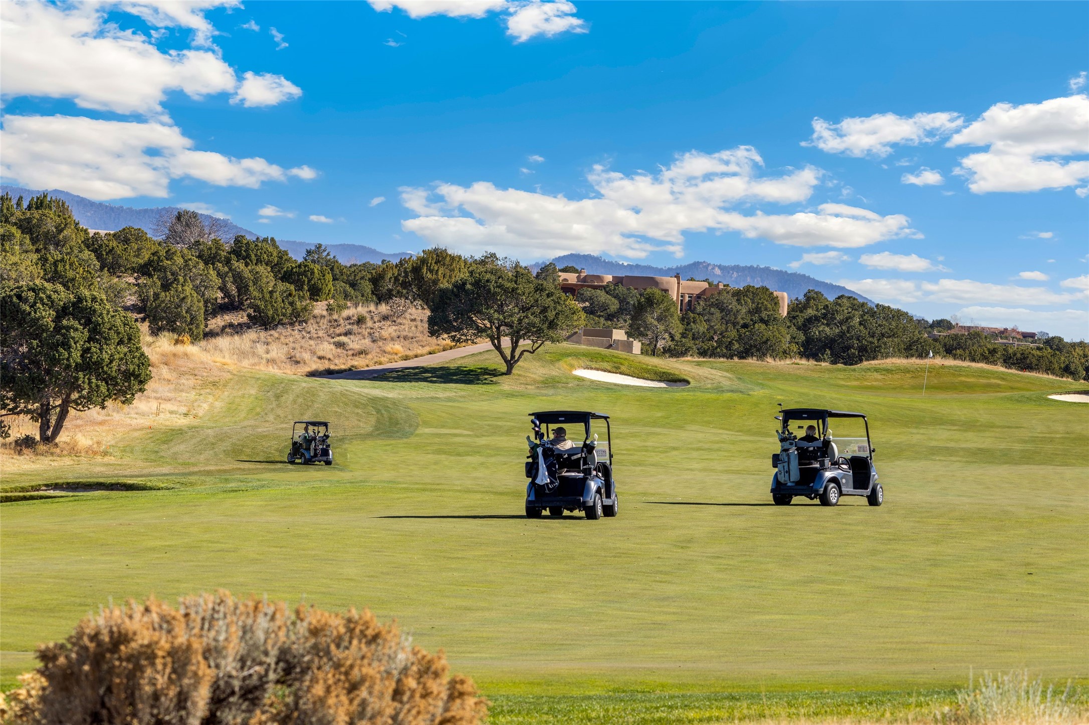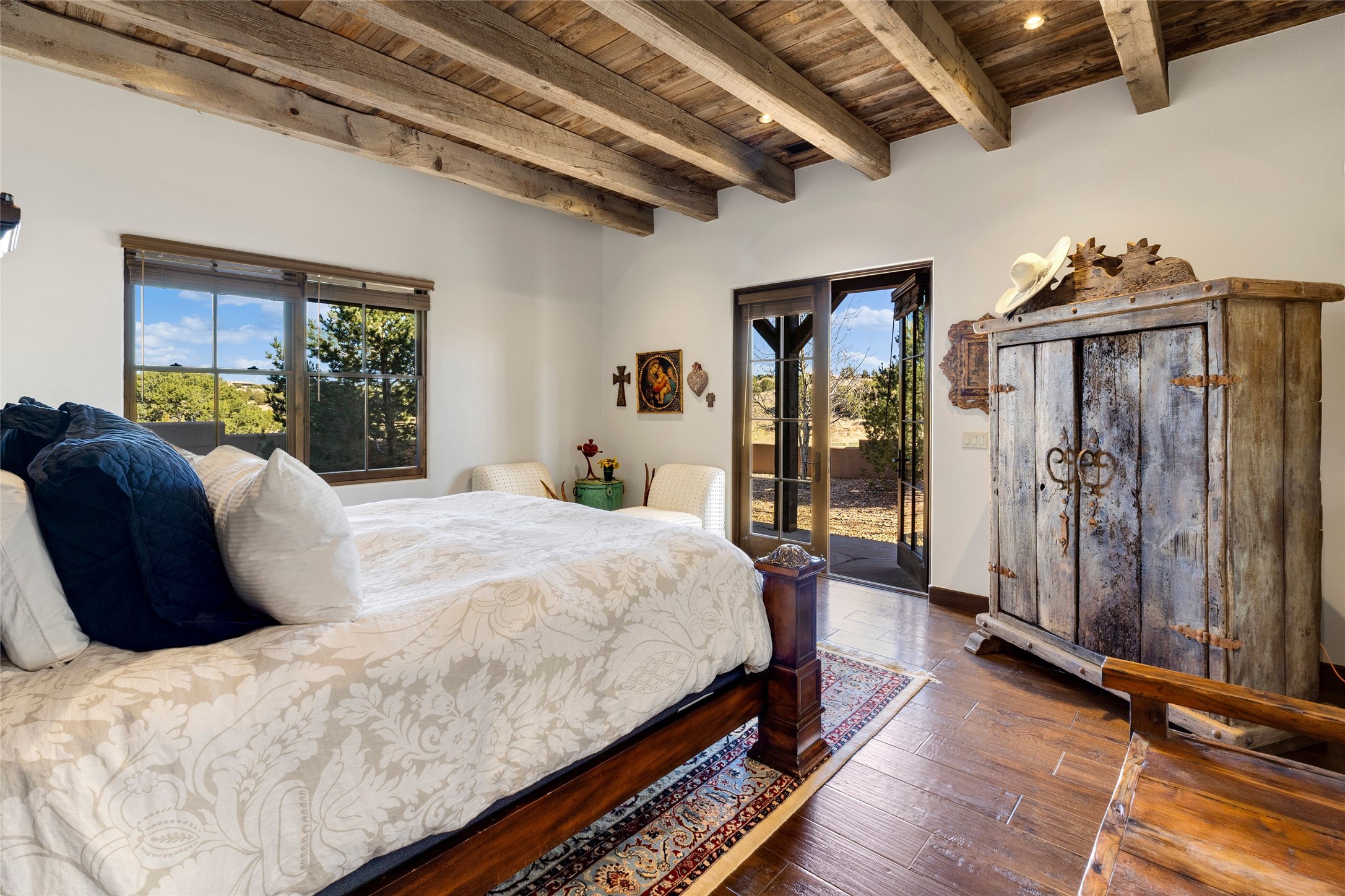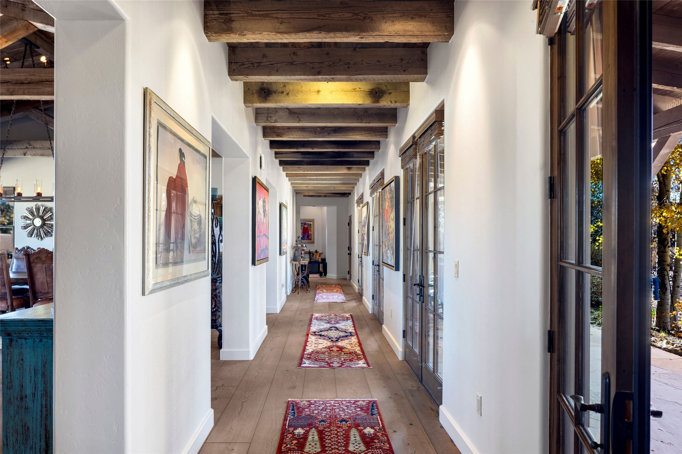 Experience a rare Northern New Mexican architectural gem in the heart of the famed Las Campanas community. Sited on an expansive, premier golf course lot with a park-like ambiance, this extraordinary 4-bedroom residence seamlessly blends iconic Santa Fe warmth with sophisticated modern design. From the lush aspen-lined entrance and wrap-around porch, the home invites you through four sets of French doors into a private front courtyard. Inside, the open-concept living and dining rooms captivate with soaring pitched ceilings, reclaimed wood beams, and a commanding stone fireplace. Newly installed retractable glass walls frame majestic views of the golf course and the Sangre de Cristo and Jemez mountains, creating a seamless, luxury indoor and outdoor living experience. The chef's kitchen is an entertainer's dream, featuring a massive stone-topped island, premium Thermador appliances, and a breakfast bar with direct access to the outdoor BBQ. Retreat to the secluded owner's suite--a sanctuary of peace offering a spa-like bath with a deep soaking tub, dual vanities, and private access to a tranquil outdoor spa. Designed for versatility, the floor plan includes a dedicated office with rich built-ins, two spacious guest bedrooms which share a bath, and a fully independent guest ensuite that serves as a secondary primary suite. Outside, the expansive living areas are surrounded by mature aspens, with over 1,700 square feet of covered portals, creating an unrivaled setting for grand gatherings or quiet reflection. With a recently updated roof, refreshed bathrooms, and meticulous craftsmanship, this one-of-a-kind home represents the absolute pinnacle of Santa Fe living.
