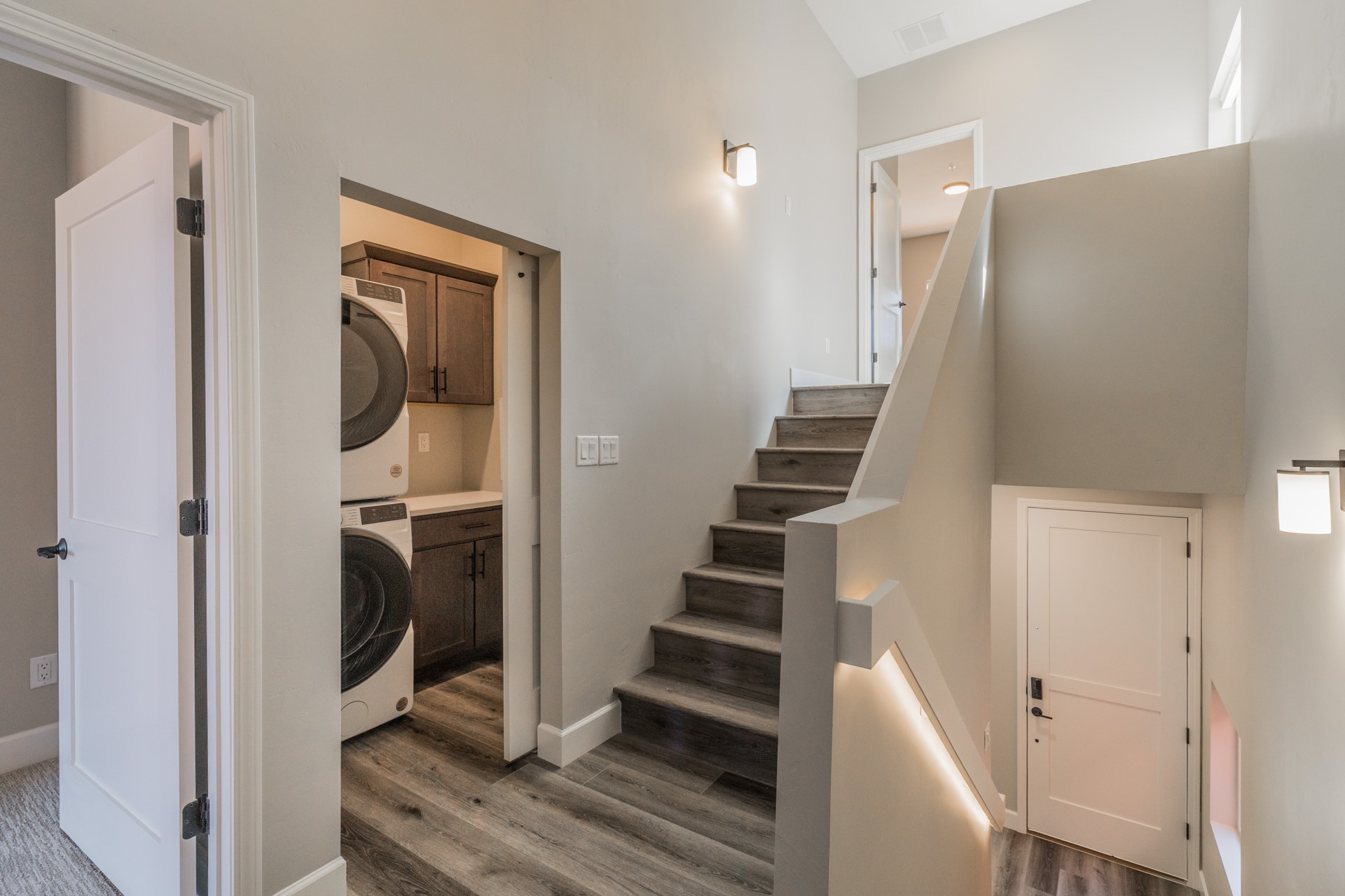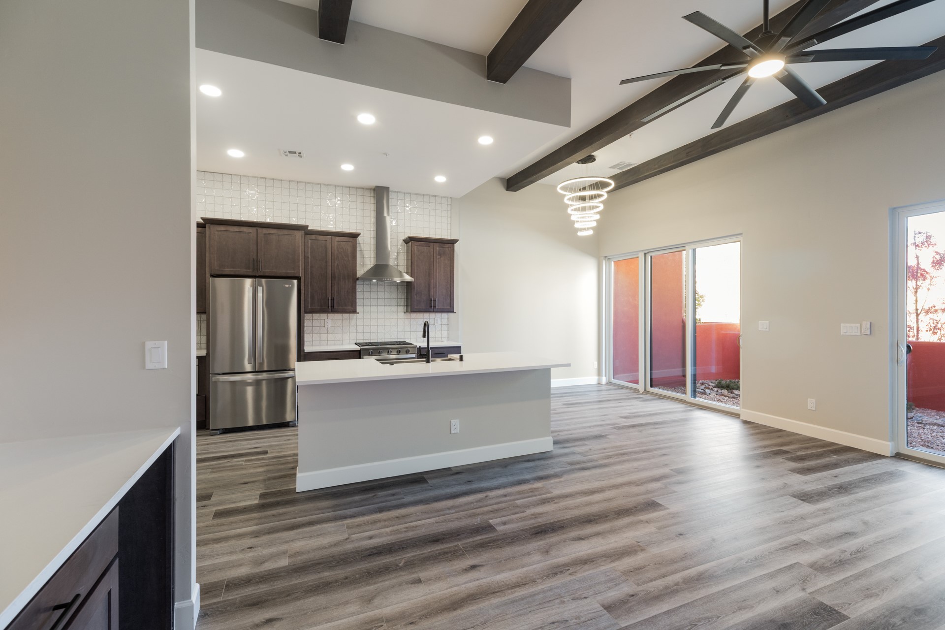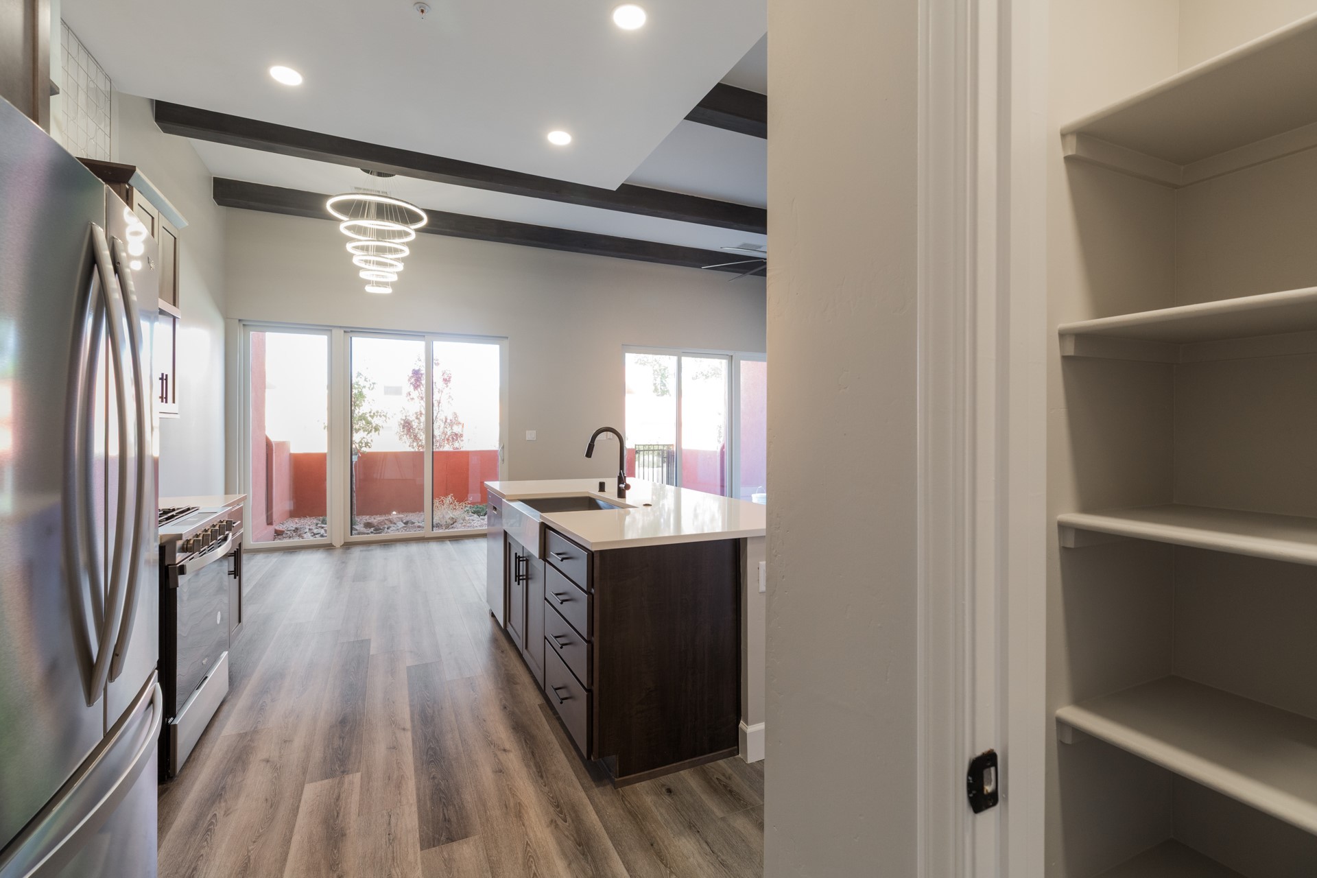 Experience sophisticated Santa Fe living in this stunning move-in ready multi-level condominium that lives like a townhome. With 3 spacious bedrooms, 3 full bathrooms, and a 2-car garage, this home showcases beautiful modern finishes and elegant lighting throughout. The great room features a floor-to-ceiling tiled fireplace, while the lower level's box-beamed ceilings add a touch of timeless Santa Fe charm. Enjoy the warmth of SPC luxury vinyl flooring underfoot, unwind in the spa-like soaking tub, or cozy up by the fireplace in the primary suite. Located in Zocalo--an architectural gem just minutes from the historic Santa Fe Plaza--this home offers incredible community amenities and is perfect for both full-time living or a lock-and-leave lifestyle.