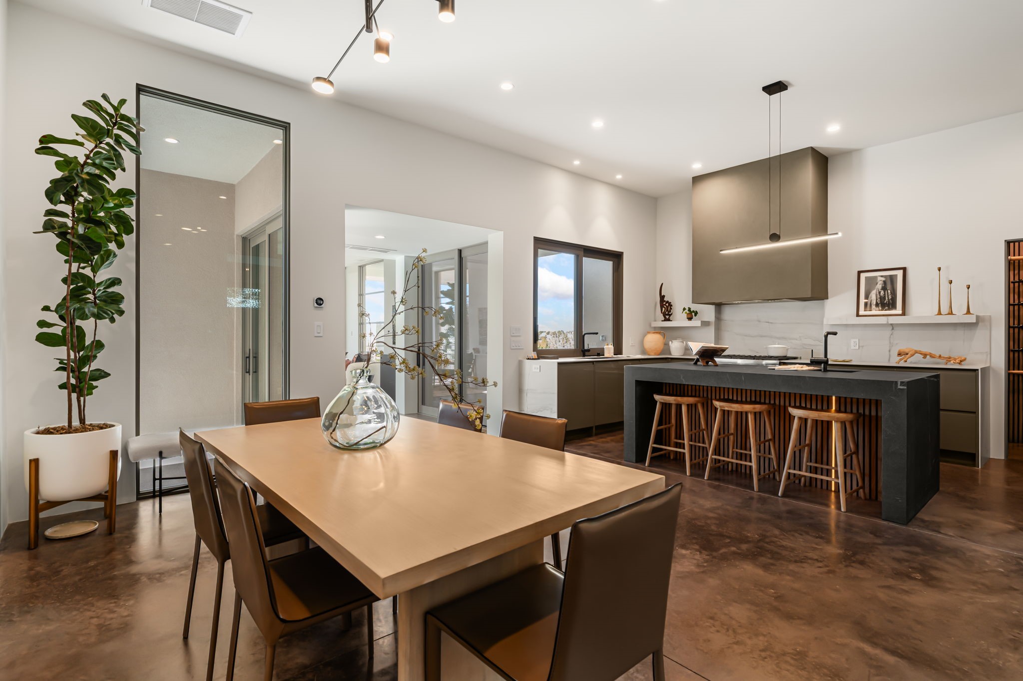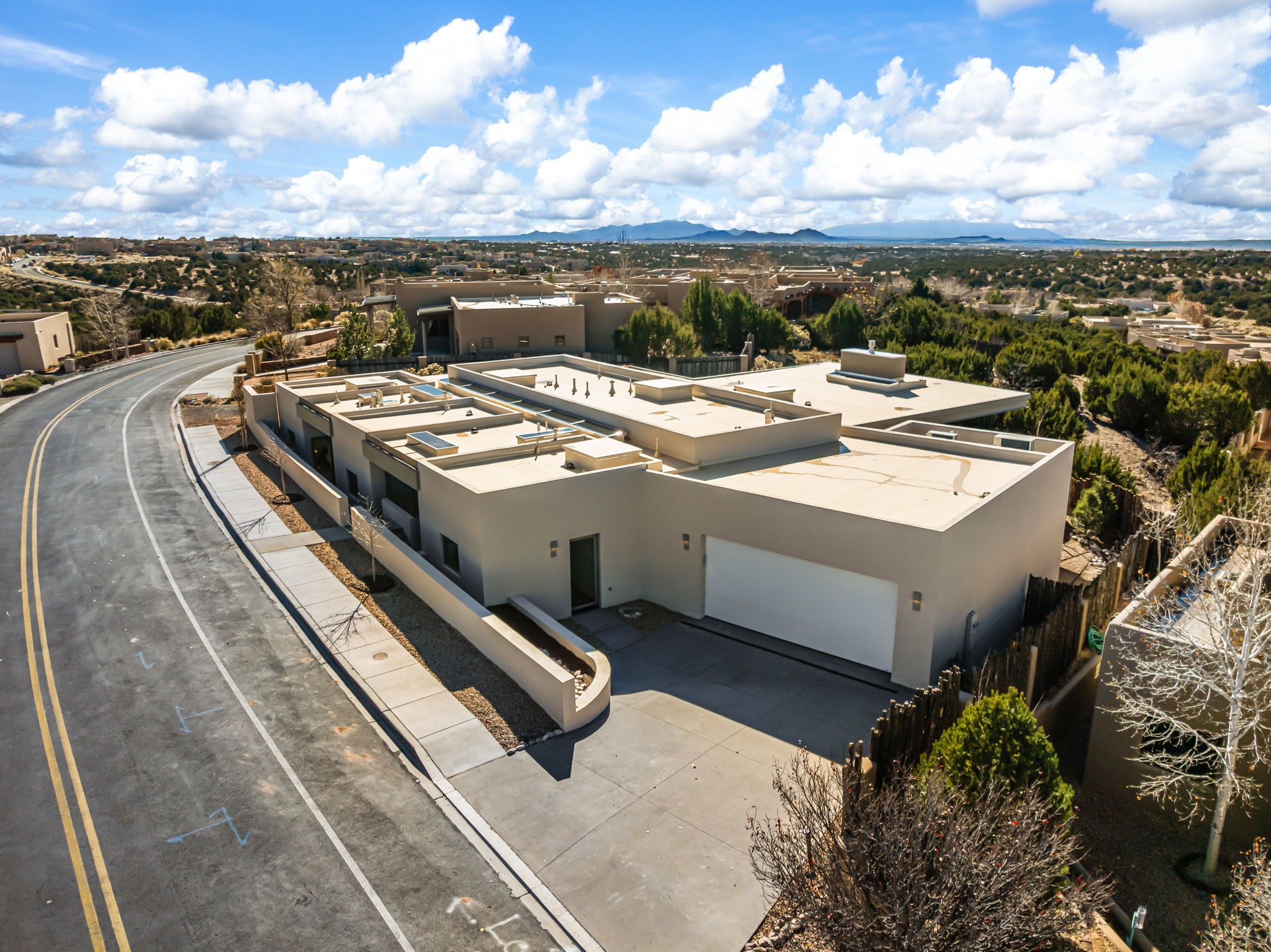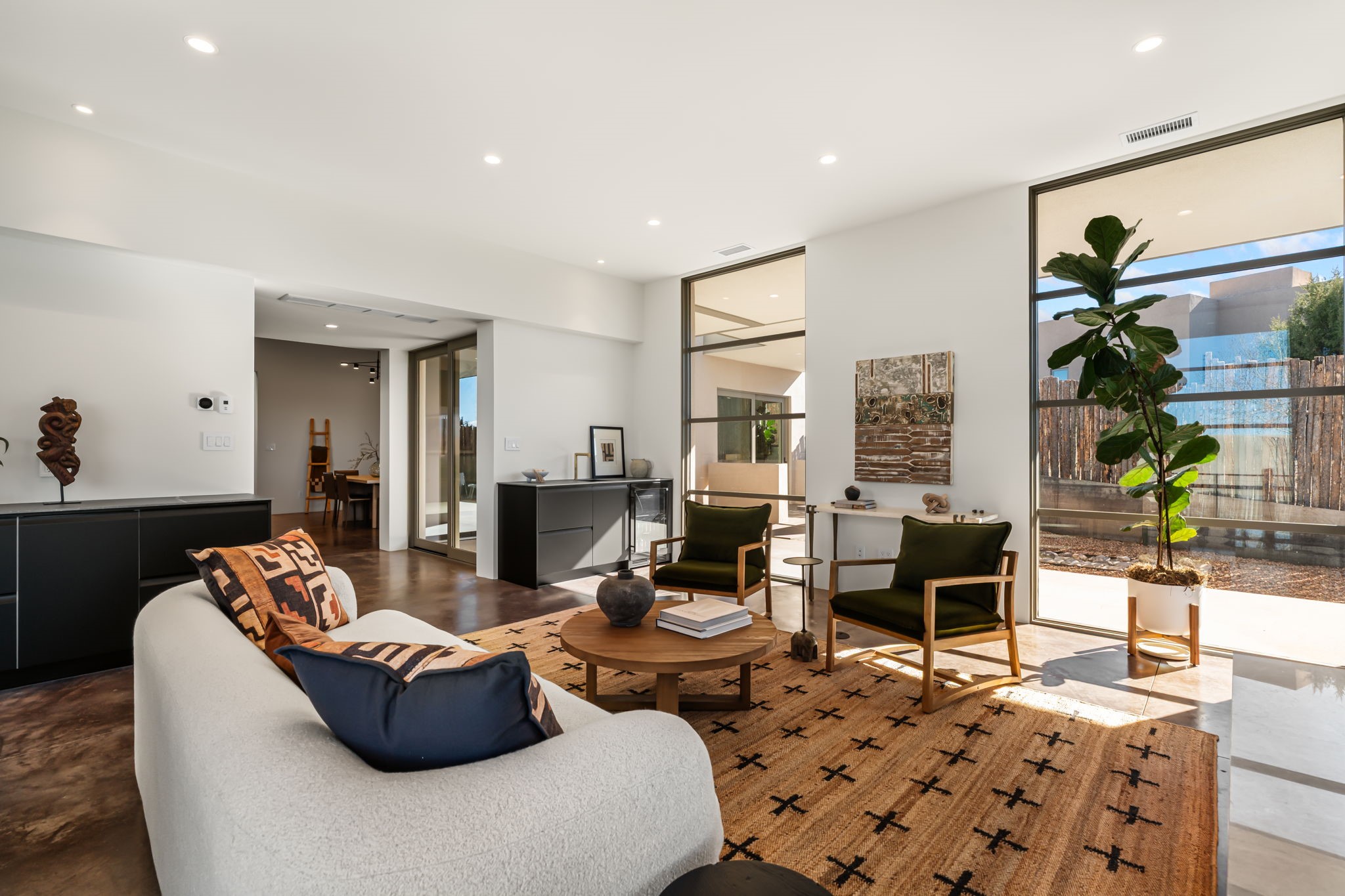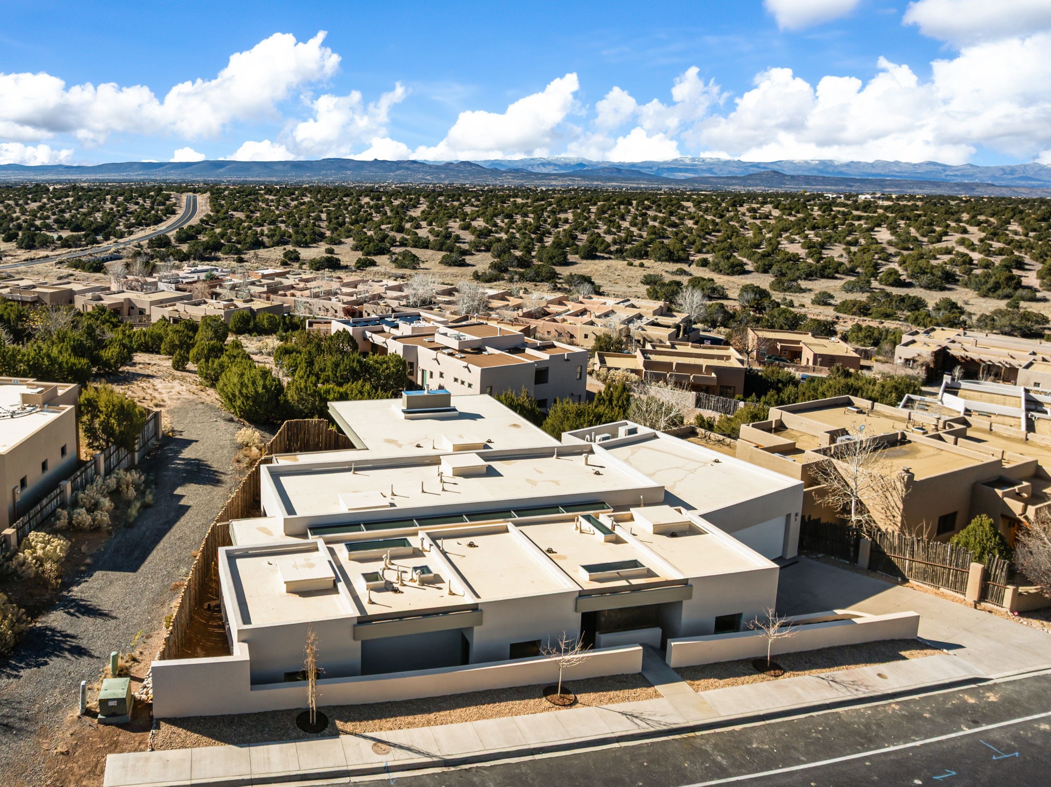 Mesa Modern | Move in now! Experience refined Contemporary Southwestern living in this stunning new construction home by Acacia Builders, a family owned and operated firm renowned for crafting sophisticated, high quality residences. Nestled in the desirable Aldea de Santa Fe community, this 3-bedroom + office home blends modern design with timeless craftsmanship. Just completed, the home Features: Sleek concrete flooring throughout, lux radiant in-floor heating, expansive picture windows that capture western views of the Jemez Mountains, and clean architectural lines that define contemporary elegance. Thoughtfully designed using Eco Friendly, ICF construction materials (insulated concrete forms) and a floorplan to maximize light and space, this residence will offer an ideal balance of form and function -- perfect for both serene living and stylish entertaining. With a legacy rooted in quality, attention to detail, and innovation, Acacia Builders delivers a home where every design choice reflects a deep commitment to excellence and modern aesthetics. Now is your opportunity to own a future-forward home in one of Santa Fe's most sought-after communities.