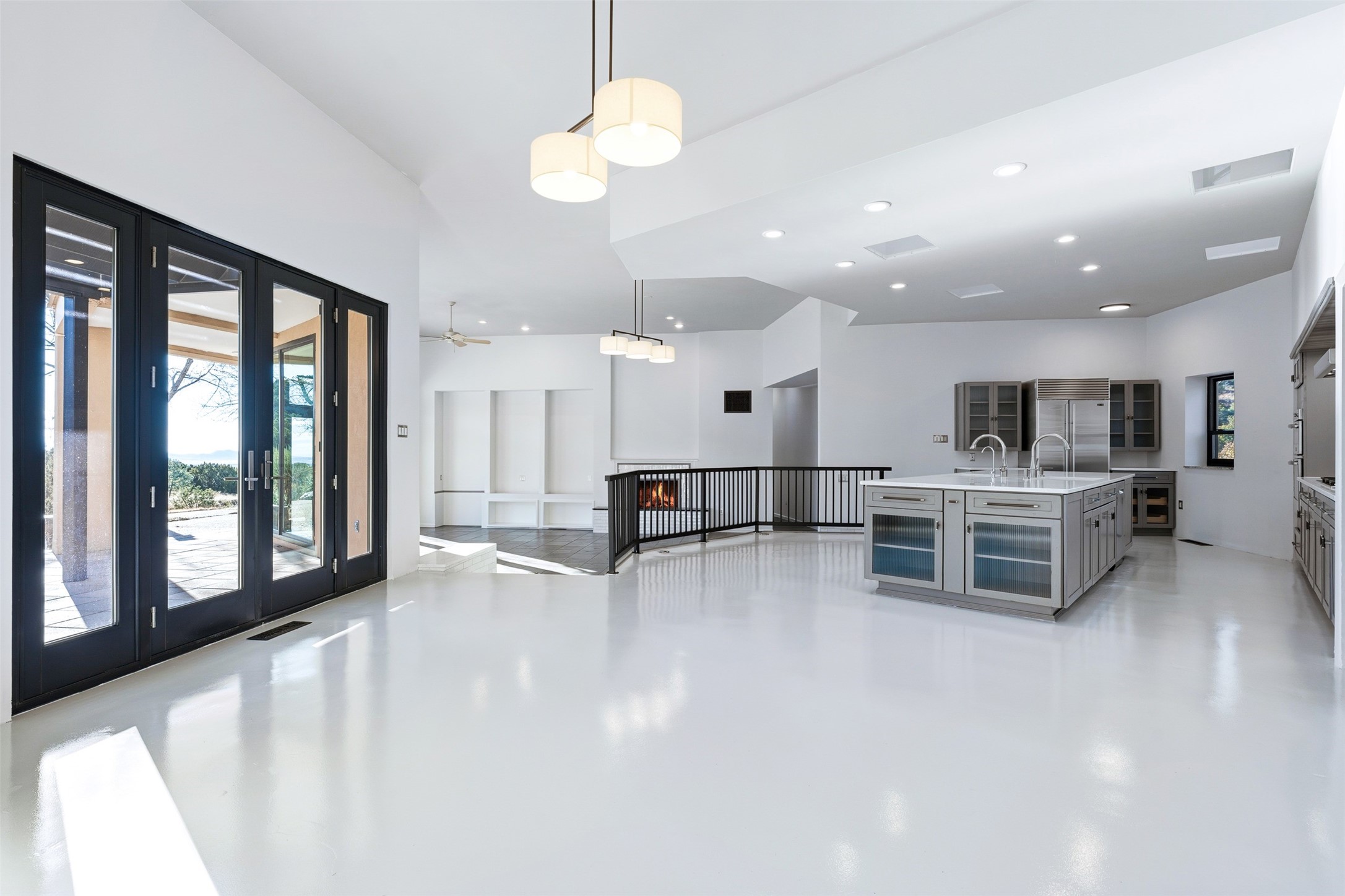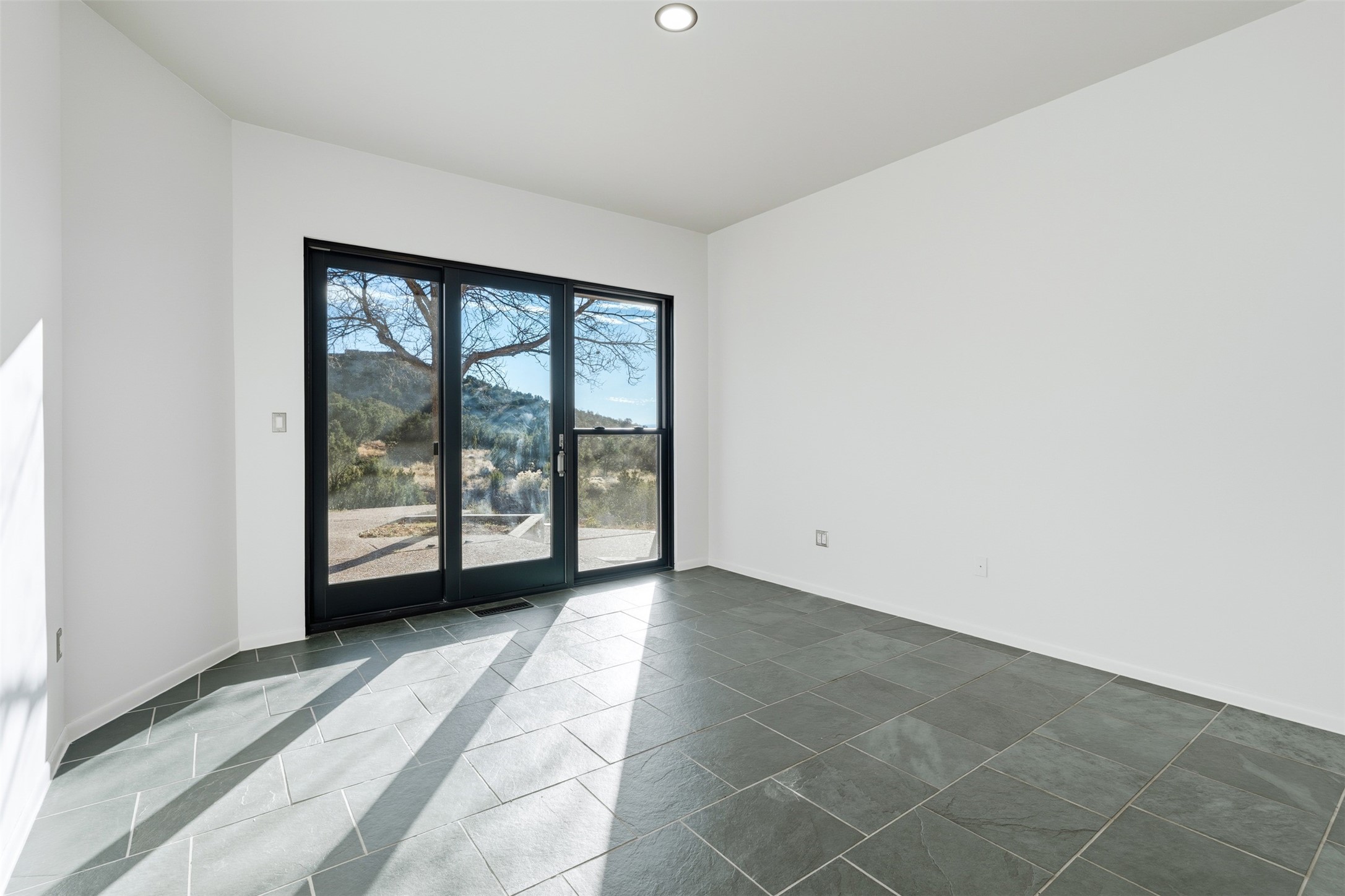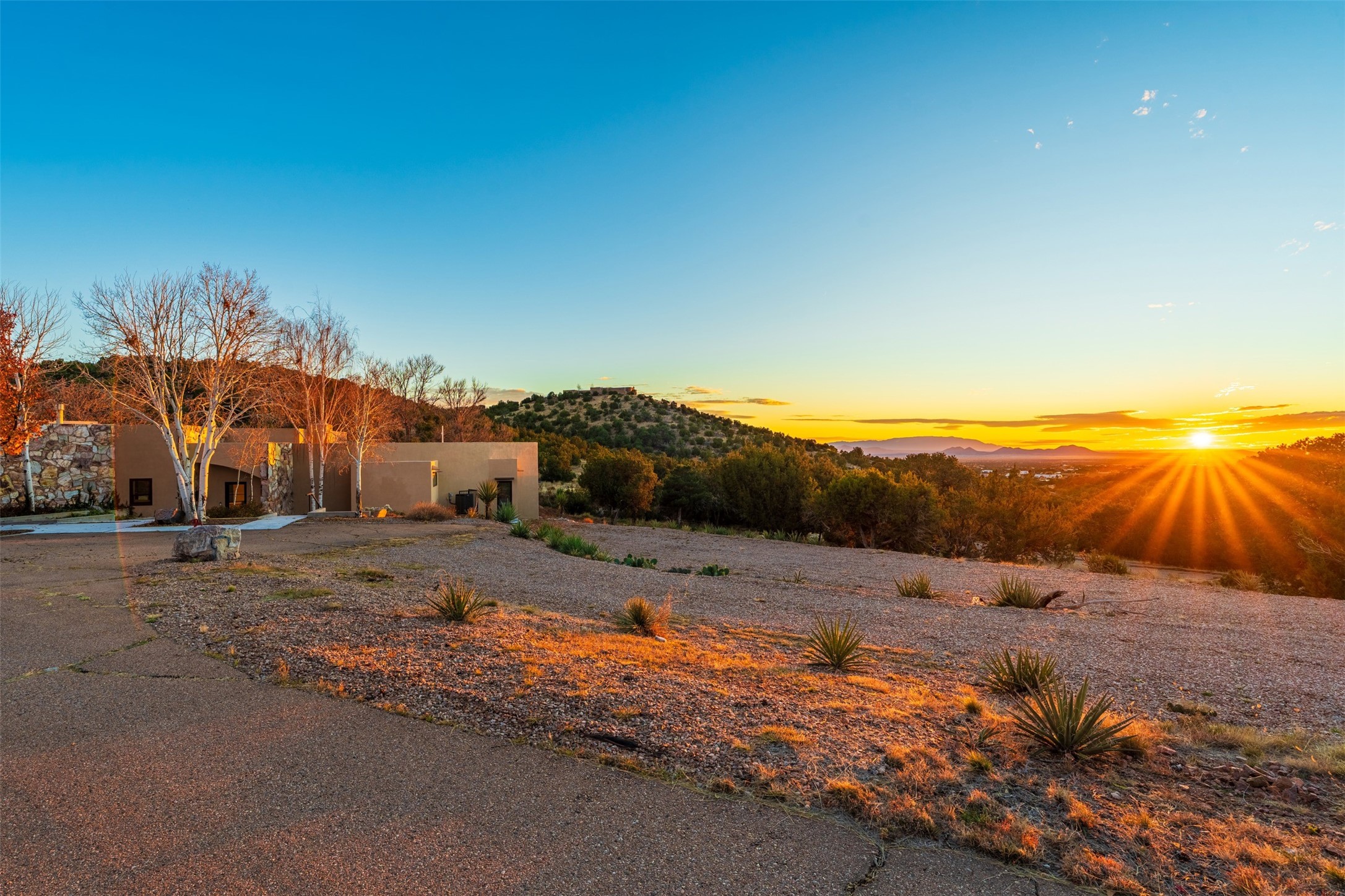 Designed by noted architect John Klee, this 4,300-square-foot 4 bedroom residence embodies the clean lines and luminous spaces of late-century modern design. The home rests gracefully within the contours of Arroyo Hondo Vistas, opening to generous portals and patios that frame sweeping mountain and high-desert views. A landscaped approach sets the tone--mature trees, natural stone, and a low-profile stucco and rock faade emerges as the home comes into sight. Tucked into the terrain, a series of descending steps leads to the front entry. Inside, an expansive great room unfolds beneath high ceilings, where slate floors, a fireplace, and a full wall of custom shelving anchor the space. Huge glass doors and windows dissolve the boundary between indoors and out, creating a luminous, seamless connection to the surrounding landscape. The grand kitchen features generous granite surfaces, a breakfast bar, and excellent flow for both cooking and entertaining. Nearby, the formal dining area offers the first view of one of the home's most distinctive architectural elements: a conservatory crowned by a softly arched, translucent ceiling. The expansive owner's suite includes a sitting area, a walk-in closet, large fireplace, and a well-appointed bath with free-standing tub, double vanity, and walk-in shower. Returning to the main living area, a gently sweeping hallway leads to a wing with two bedrooms, each with walk-in closets, a guest bathroom, and a flexible room that can be used as an office, studio, or exercise room. Nearly every room features large windows and/or patio doors opening to the expansive, view-rich outdoor spaces, creating a lifestyle centered on indoor-outdoor living and quiet retreat. Numerous skylights illuminate the interior throughout. Other features include central air conditioning, forced-air heating, and a gated entry. Some rooms have been digitally staged.