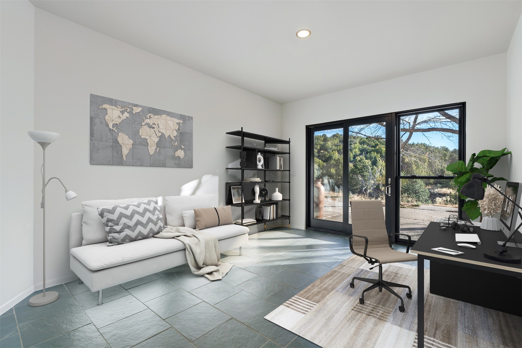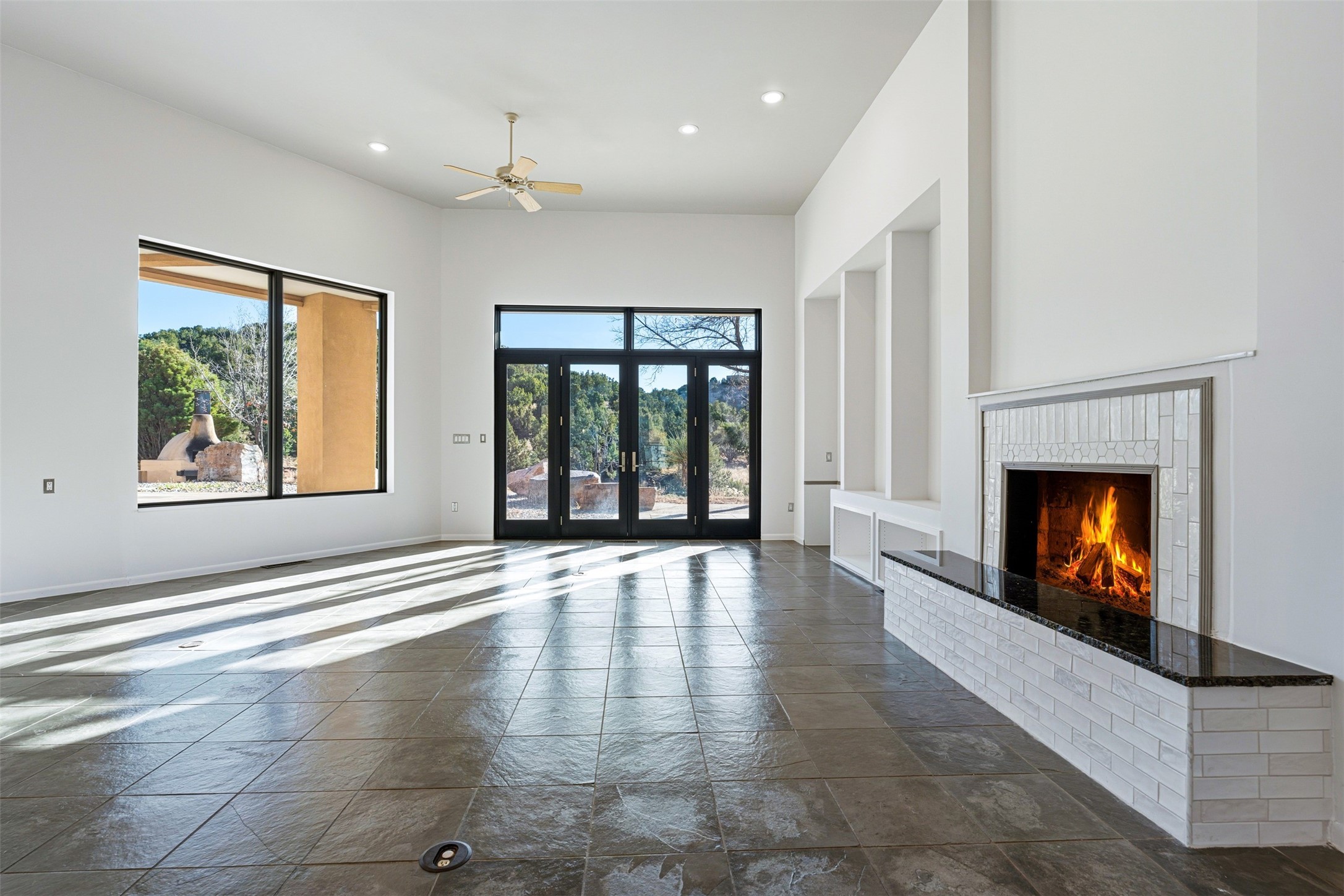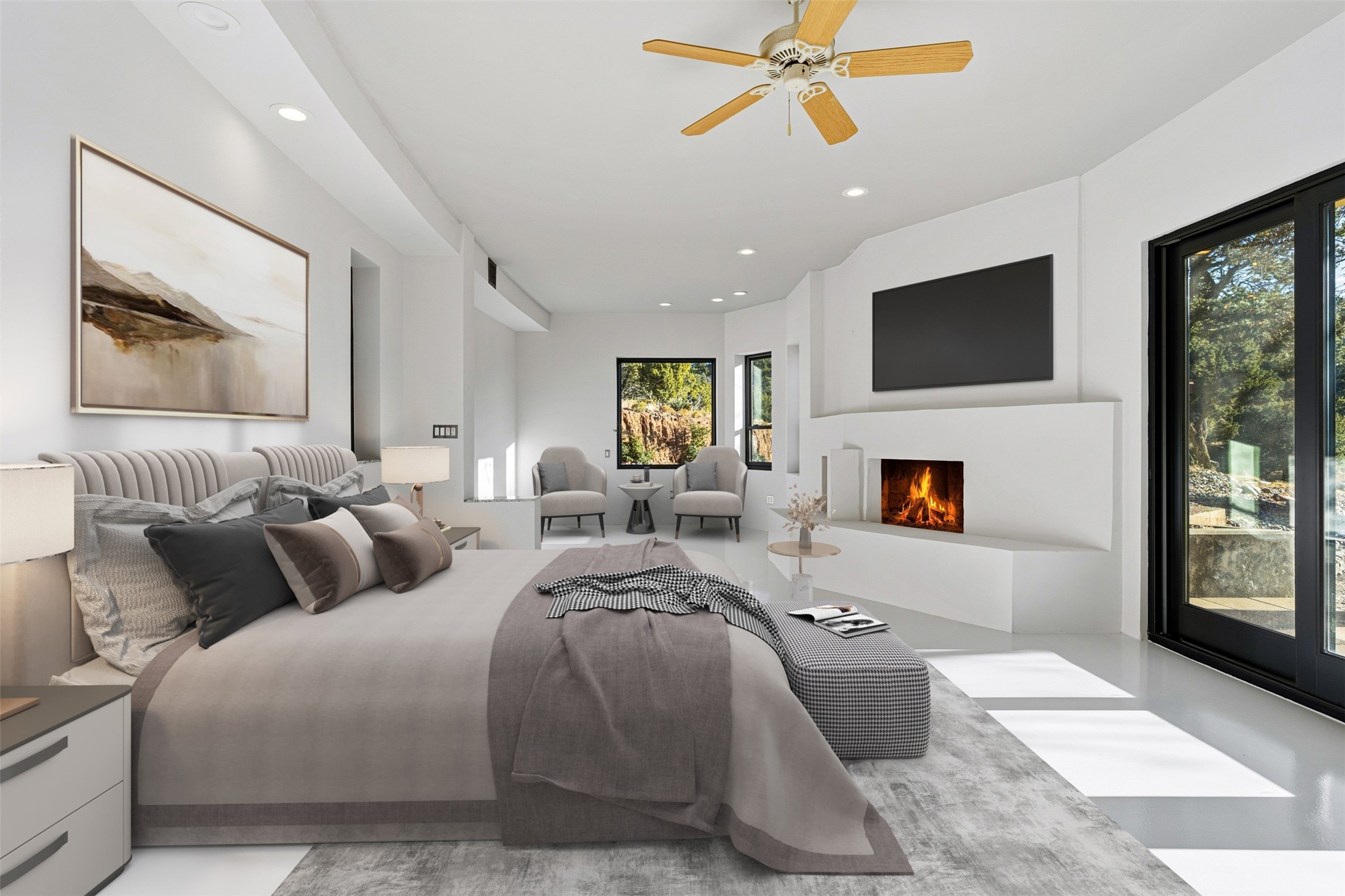 Designed by noted architect John Klee, this 4,300-square-foot 4 bedroom residence embodies the clean lines and luminous spaces of late-century modern design. The home rests gracefully within the contours of Arroyo Hondo Vistas, opening to generous portals and patios that frame sweeping mountain and high-desert views. A landscaped approach sets the tone--mature trees, natural stone, and a low-profile stucco and rock faade emerges as the home comes into sight. Tucked into the terrain, a series of descending steps leads to the front entry. Inside, an expansive great room unfolds beneath high ceilings, where slate floors, a fireplace, and a full wall of custom shelving anchor the space. Huge glass doors and windows dissolve the boundary between indoors and out, creating a luminous, seamless connection to the surrounding landscape. The grand kitchen features generous granite surfaces, a breakfast bar, and excellent flow for both cooking and entertaining. Nearby, the formal dining area offers the first view of one of the home's most distinctive architectural elements: a conservatory crowned by a softly arched, translucent ceiling. The expansive owner's suite includes a sitting area, a walk-in closet, large fireplace, and a well-appointed bath with free-standing tub, double vanity, and walk-in shower. Returning to the main living area, a gently sweeping hallway leads to a wing with two bedrooms, each with walk-in closets, a guest bathroom, and a flexible room that can be used as an office, studio, or exercise room. Nearly every room features large windows and/or patio doors opening to the expansive, view-rich outdoor spaces, creating a lifestyle centered on indoor-outdoor living and quiet retreat. Numerous skylights illuminate the interior throughout. Other features include central air conditioning, forced-air heating, and a gated entry. Some rooms have been digitally staged.