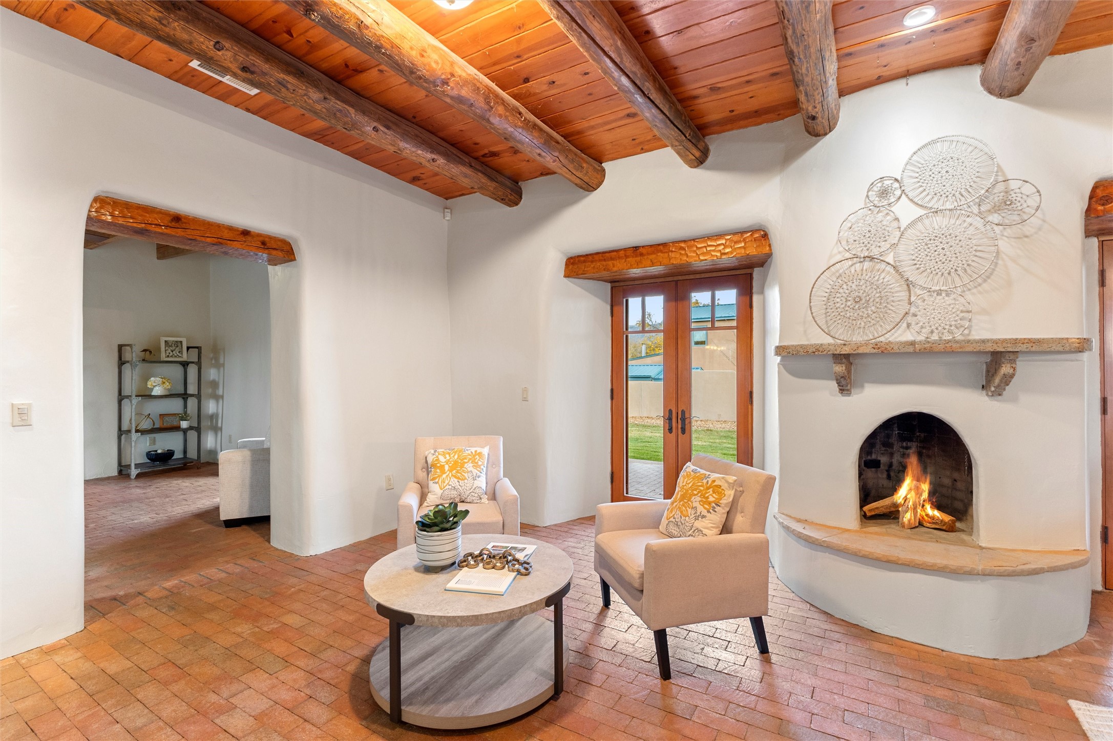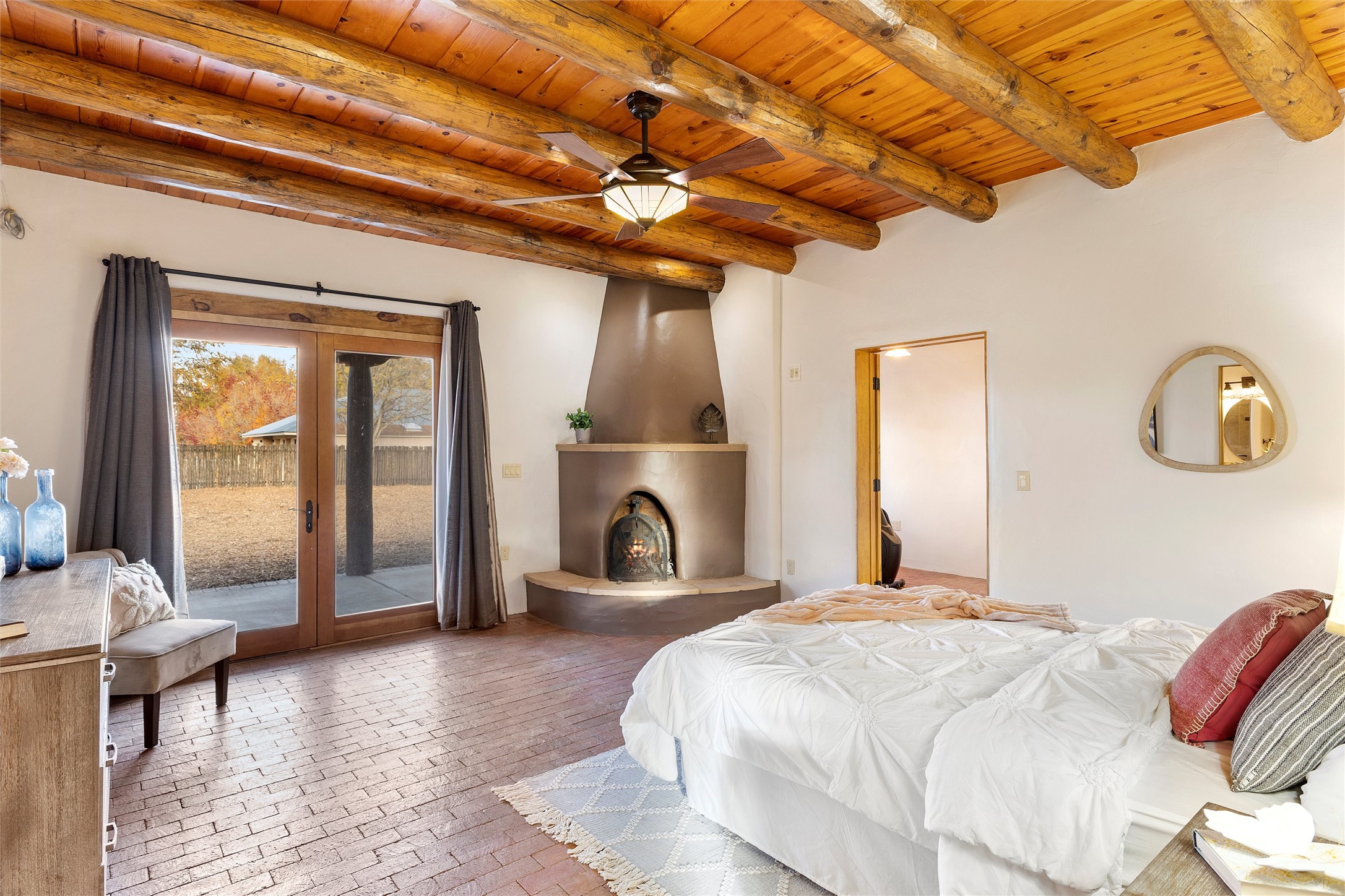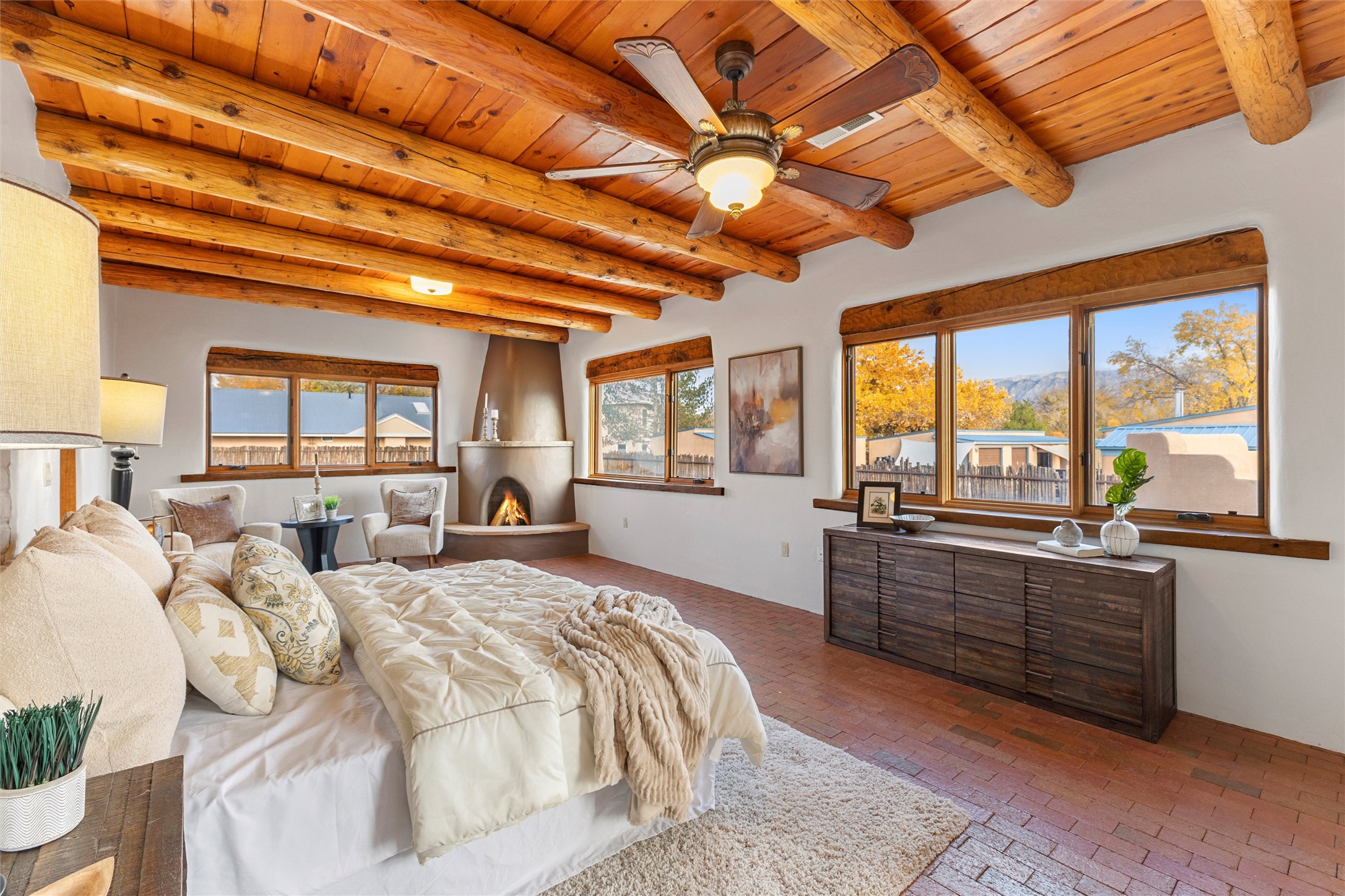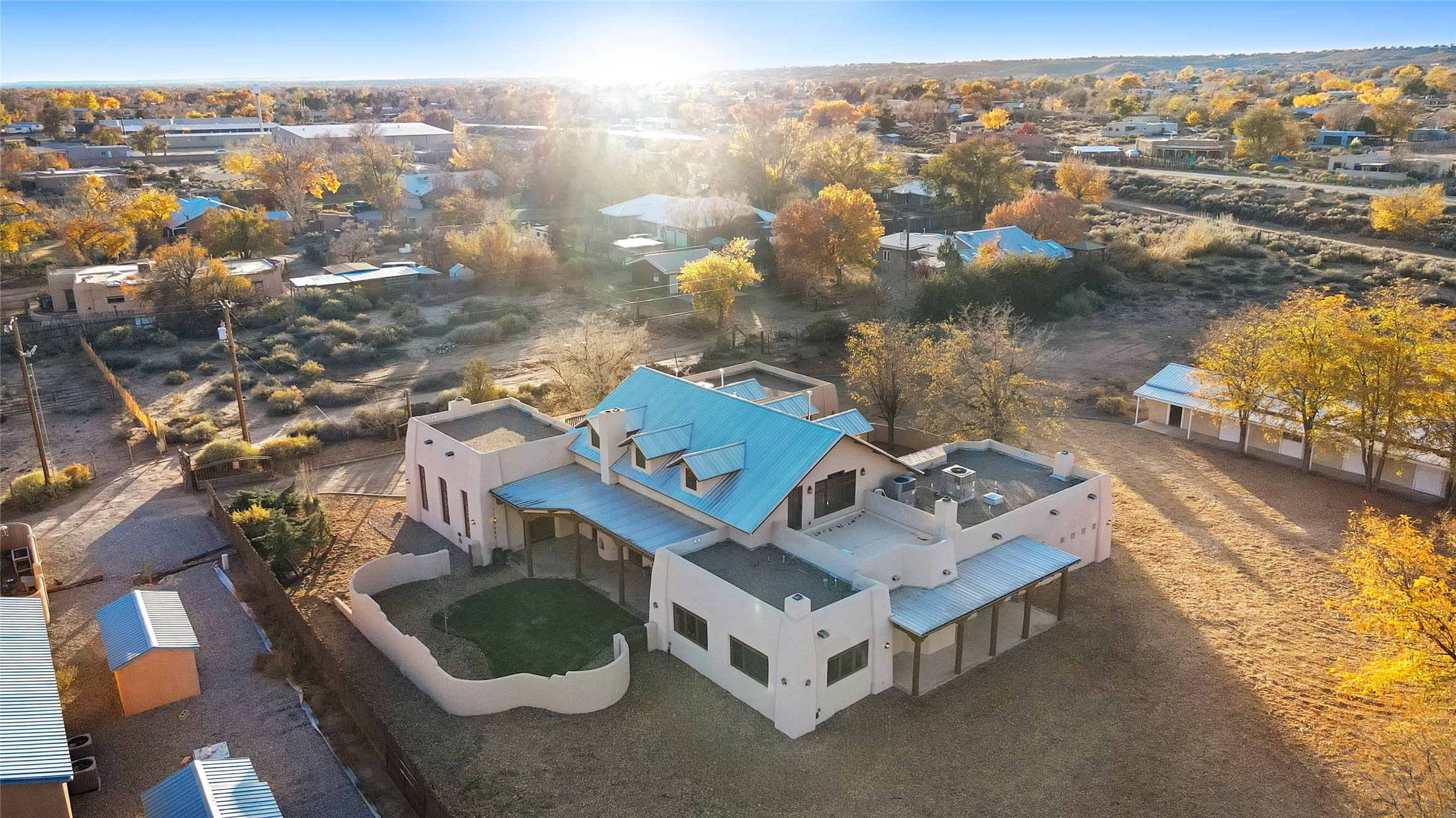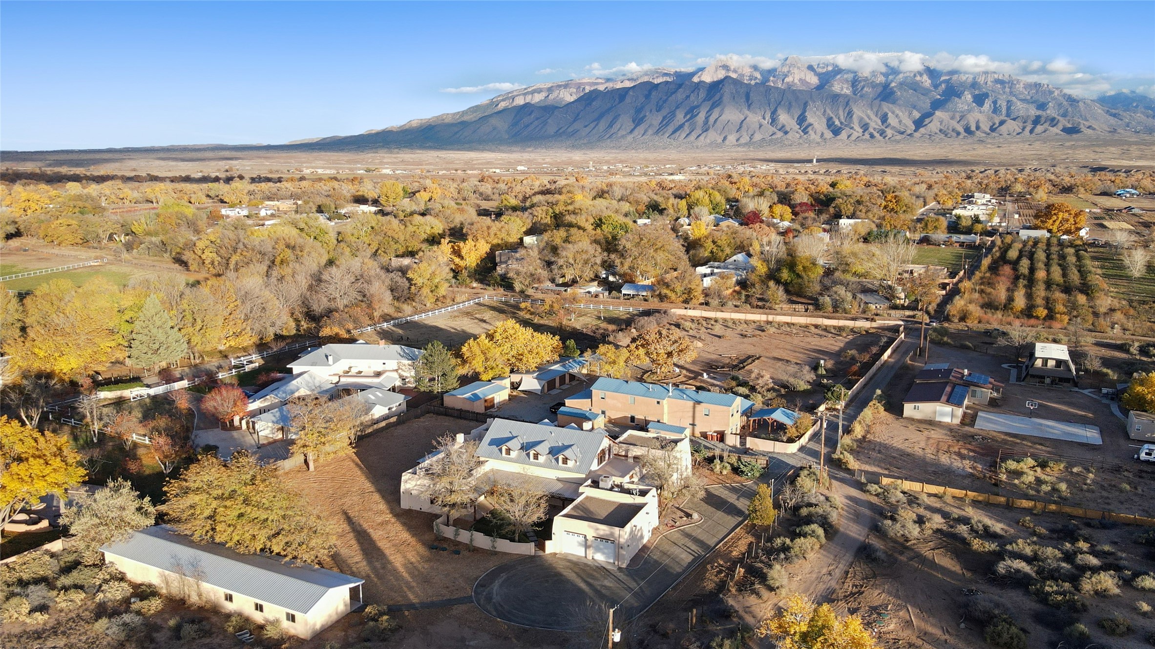 Timeless Corrales, New Mexico living with room to breathe. This expansive 6,491 sq ft, quintessential Santa Fe-style estate marries the soul of an original 150-year-old farmhouse--thick adobe walls, hand-hewn vigas, and soaring ceilings--with a thoughtful 2009 renovation that brings modern comfort and reliability. Tucked on a quiet lane, the home rests on 1.69 serene, level acres that frame lovely Sandia Mountain views and invite an easy rural lifestyle--plenty of usable space for horses, gardens, or future additions. Inside, light-washed halls and artful nichos create gallery-like display walls for sculpture and canvases. Multiple living and gathering areas open effortlessly to two lush, grassy courtyards--perfect for coffee at sunrise, al-fresco dinners at dusk, or relaxed weekend play. An updated kitchen and baths blend warm Southwestern finishes with contemporary function, while long, shaded portals extend everyday living outdoors. Generous bedrooms and flexible rooms accommodate quiet work, fitness, media, or guest needs; host a crowd or savor a private retreat with equal ease. With historic character preserved, modern conveniences in place, and a setting that feels both pastoral and connected, this is a rare convergence of history, scale, privacy, and natural beauty--right in the heart of Corrales.