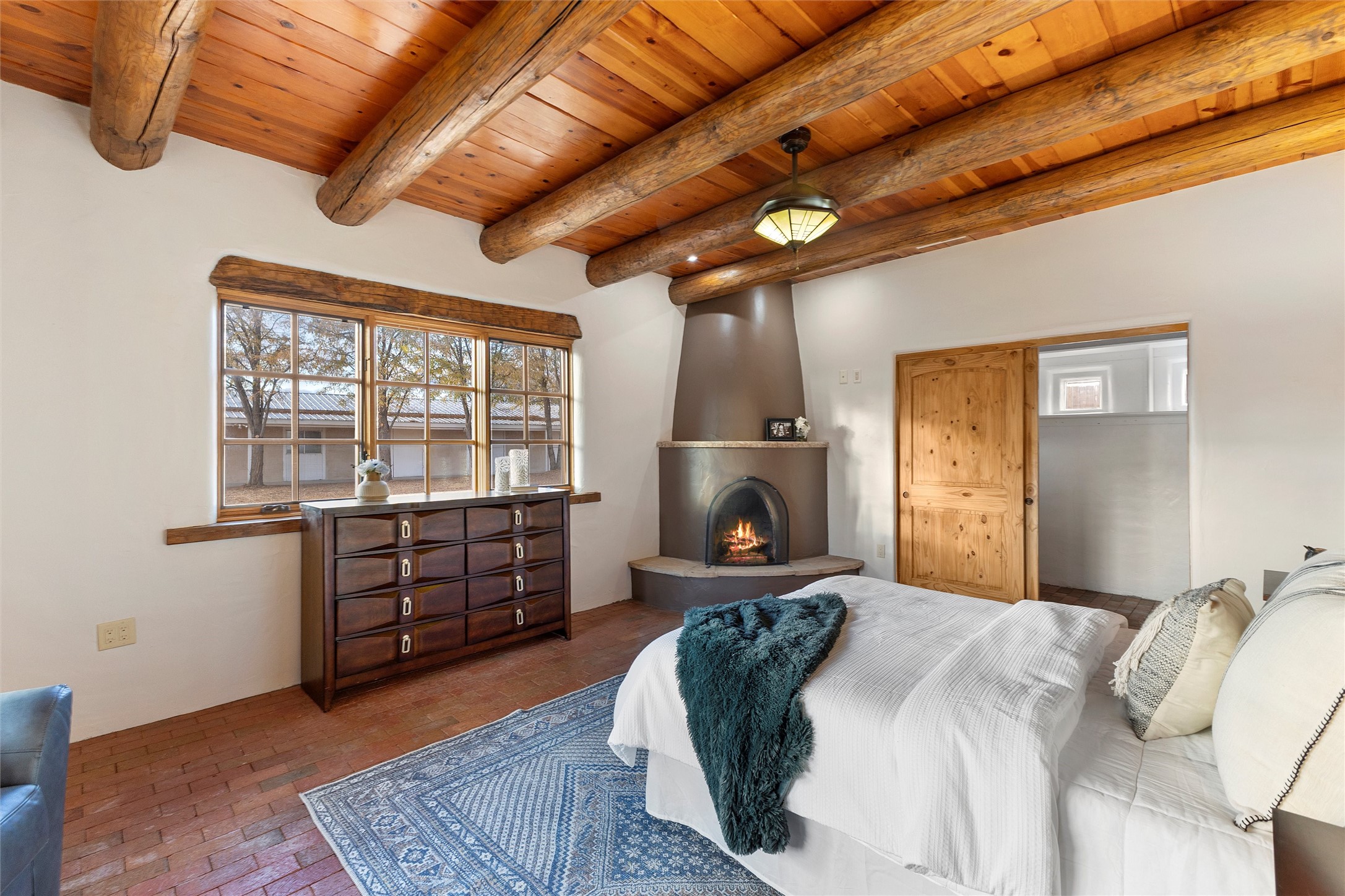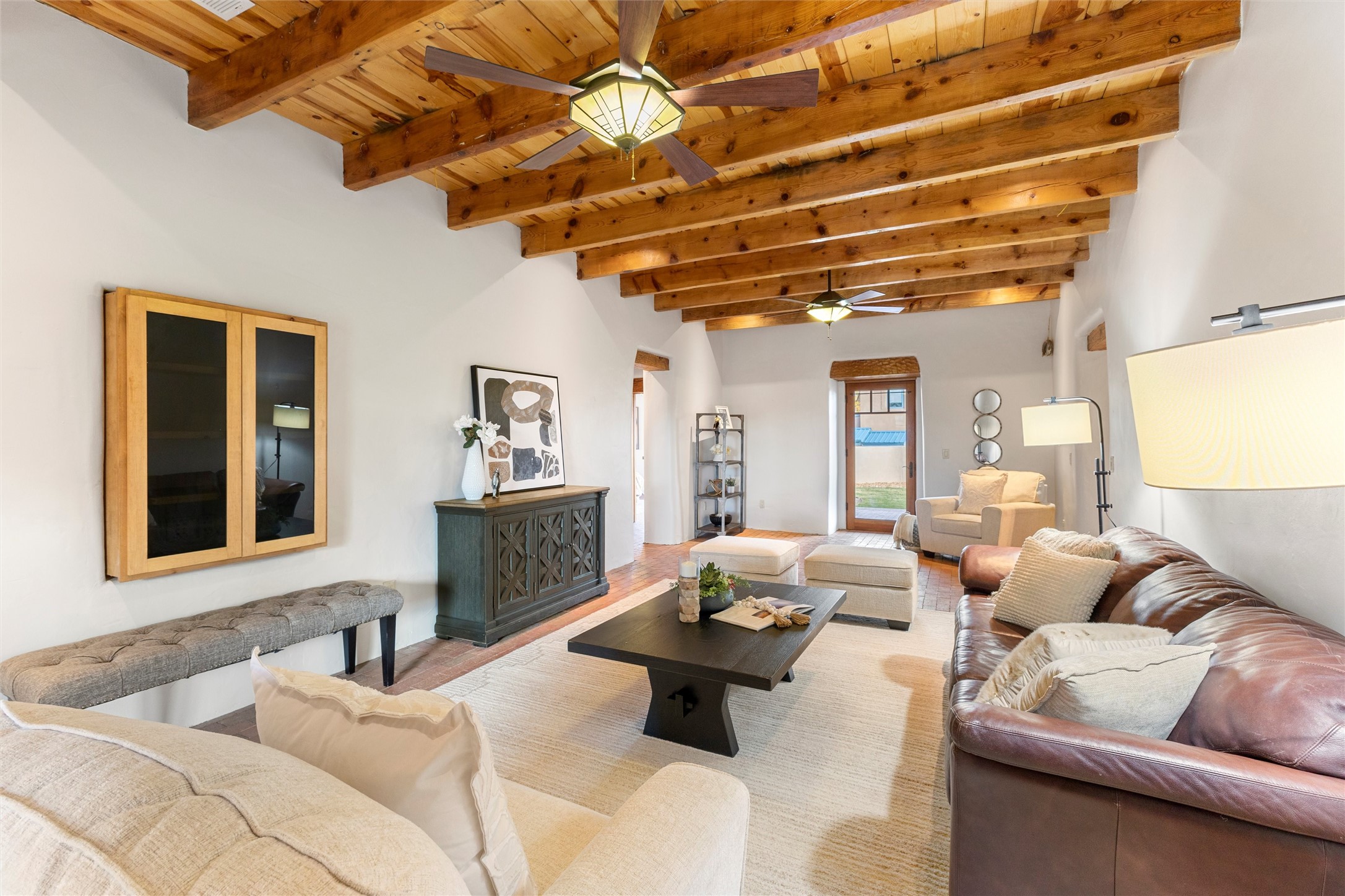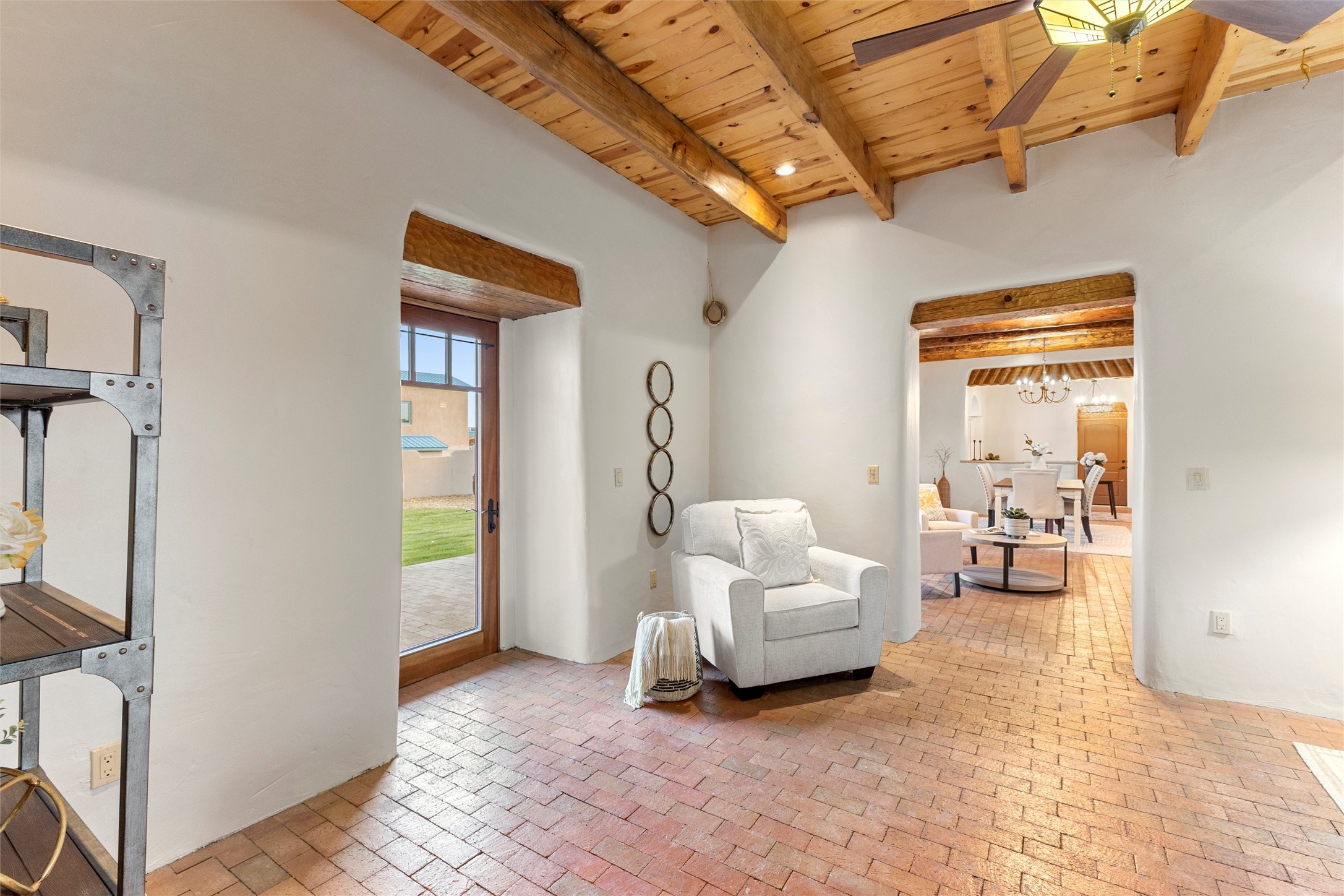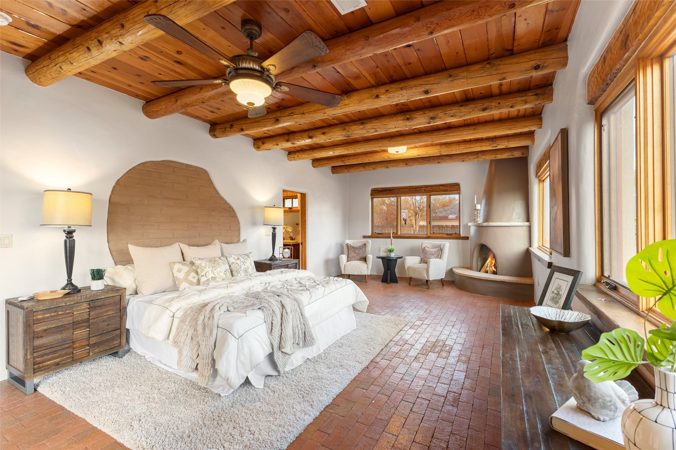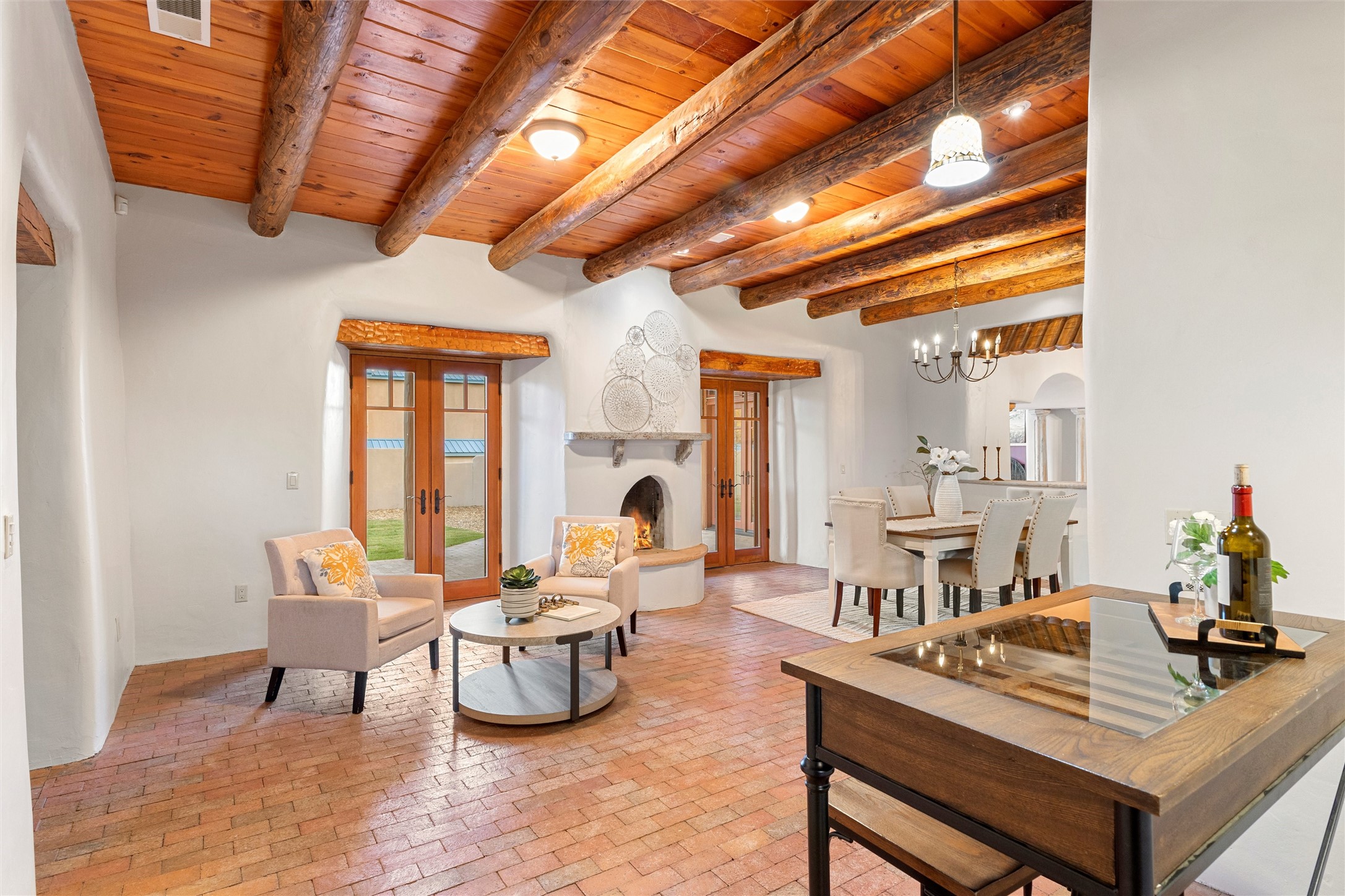 Timeless Corrales, New Mexico living with room to breathe. This expansive 6,491 sq ft, quintessential Santa Fe-style estate marries the soul of an original 150-year-old farmhouse--thick adobe walls, hand-hewn vigas, and soaring ceilings--with a thoughtful 2009 renovation that brings modern comfort and reliability. Tucked on a quiet lane, the home rests on 1.69 serene, level acres that frame lovely Sandia Mountain views and invite an easy rural lifestyle--plenty of usable space for horses, gardens, or future additions. Inside, light-washed halls and artful nichos create gallery-like display walls for sculpture and canvases. Multiple living and gathering areas open effortlessly to two lush, grassy courtyards--perfect for coffee at sunrise, al-fresco dinners at dusk, or relaxed weekend play. An updated kitchen and baths blend warm Southwestern finishes with contemporary function, while long, shaded portals extend everyday living outdoors. Generous bedrooms and flexible rooms accommodate quiet work, fitness, media, or guest needs; host a crowd or savor a private retreat with equal ease. With historic character preserved, modern conveniences in place, and a setting that feels both pastoral and connected, this is a rare convergence of history, scale, privacy, and natural beauty--right in the heart of Corrales.