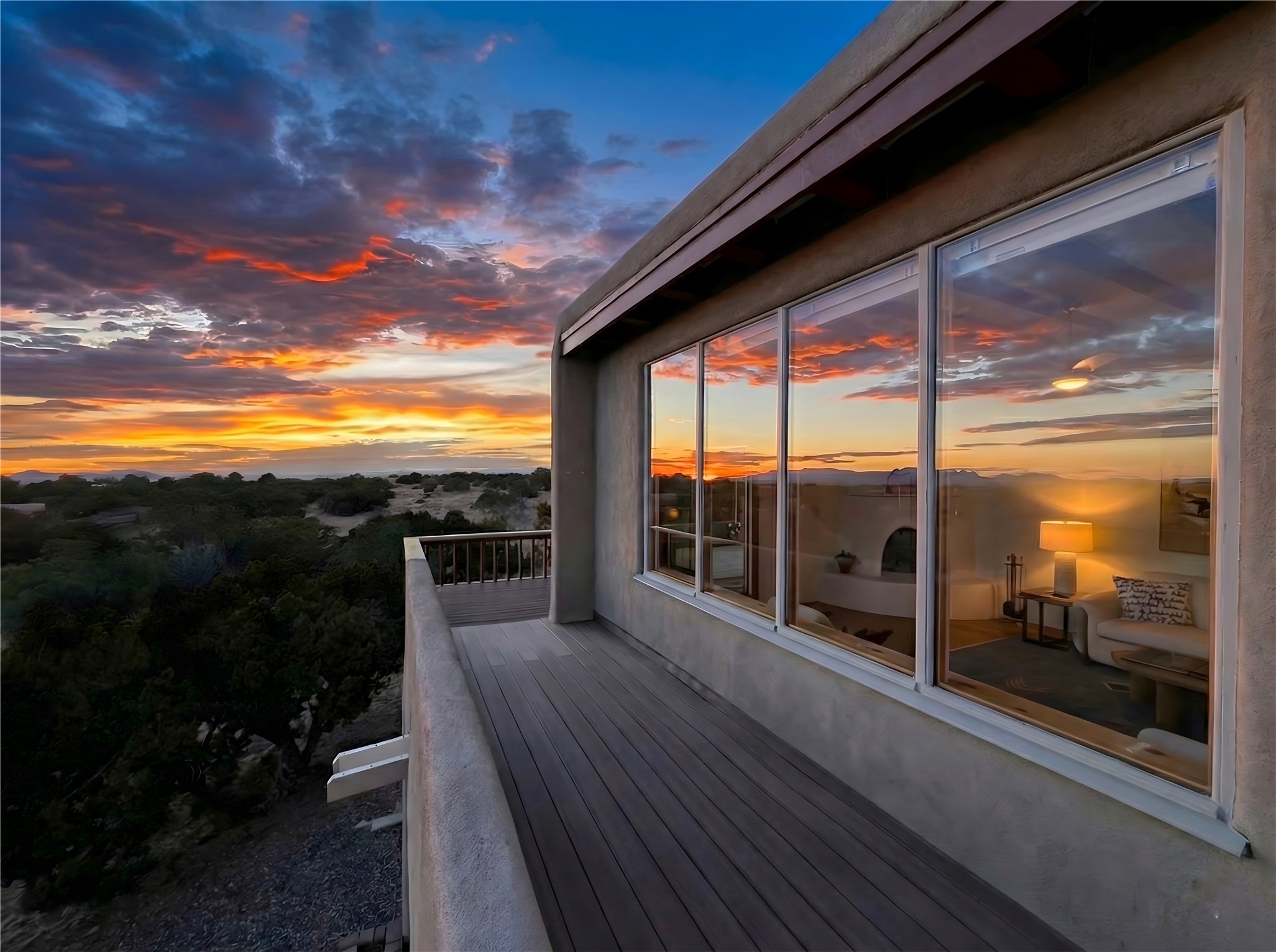 Privately located on a quiet cul-de-sac down a paved driveway, this wonderful passive-solar two-story home offers three bedrooms, 2 baths, and abundant natural light. The upper level features a spacious open living area with wood ceiling beams, a new corner kiva fireplace, clean modern lines, and a beautifully updated design. The separate dining area and an breakfast nook create flexible living spaces. Sliding doors lead to a stunning Trex-style deck with a built-in banco--perfect for enjoying the spectacular Jemez and Ortiz mountain views and western sunsets.The bedrooms are located downstairs, each with its own outdoor entrance and access to the covered patio and fully enclosed yard. The 2.24-acre lot provides generous outdoor space, including a new portal with latilla fencing surrounding the backyard.Additional features include mini-splits for efficient heating and cooling, an alarm system, and an attached 2-car garage. Hiking trails and the Rail Trail are just outside the backyard, and the home is conveniently located near all Eldorado amenities and the Eldorado Community School. Come take a look!