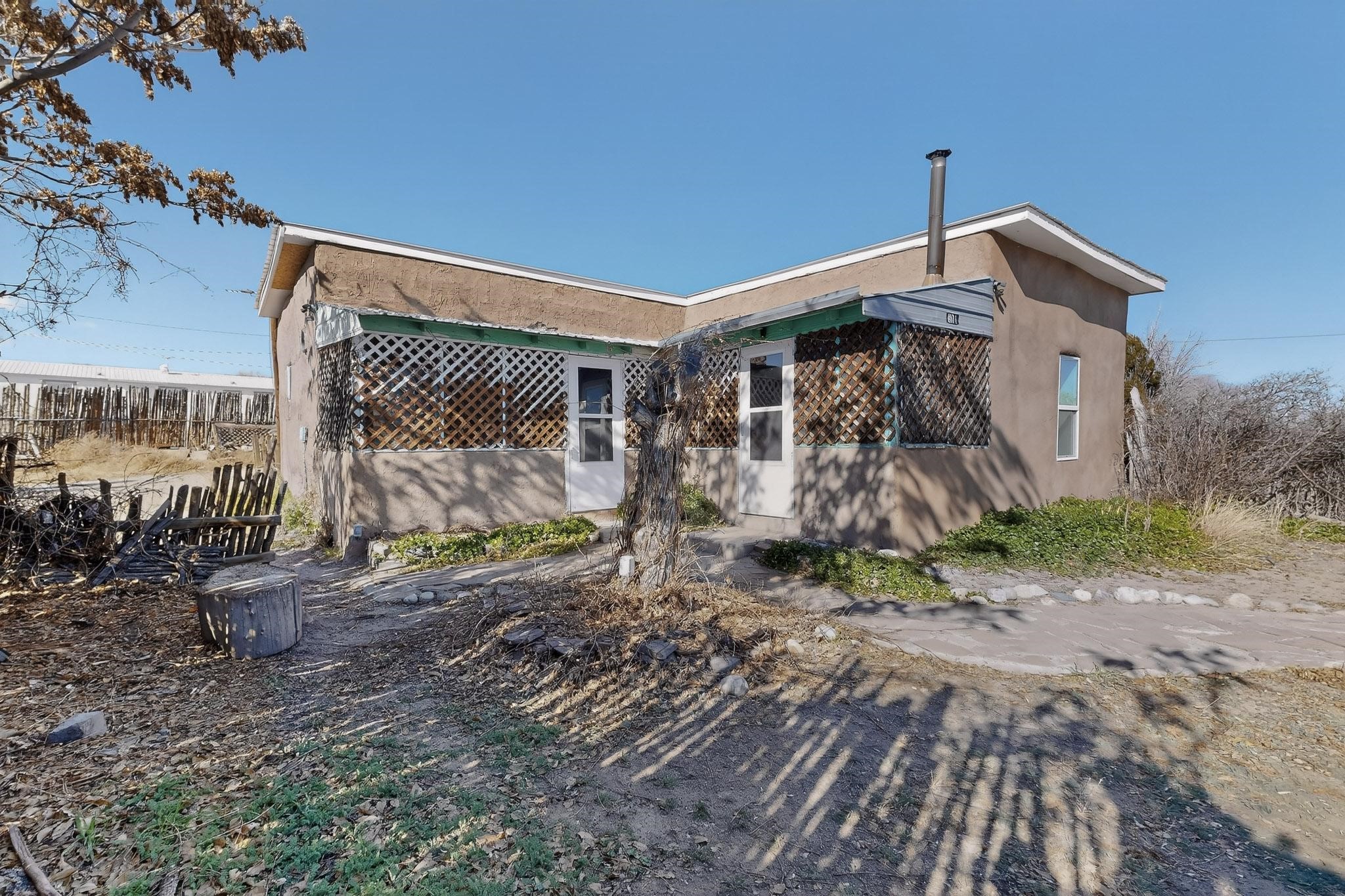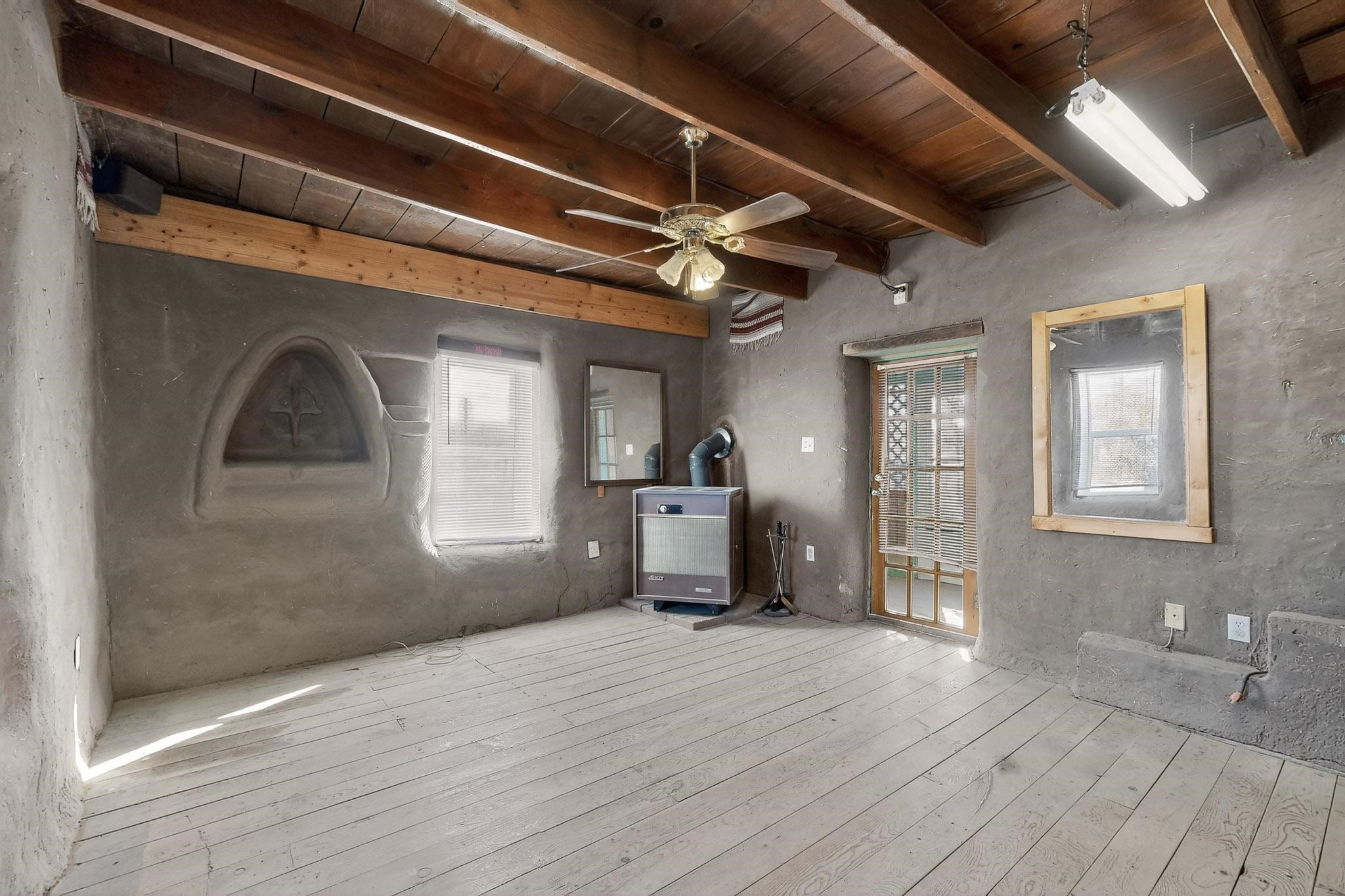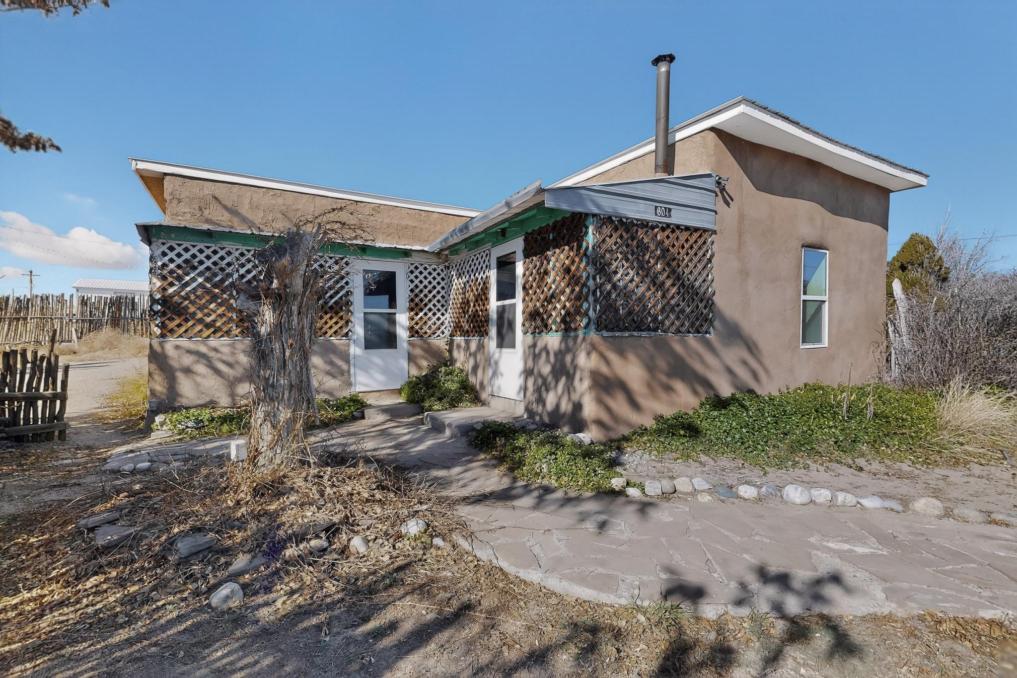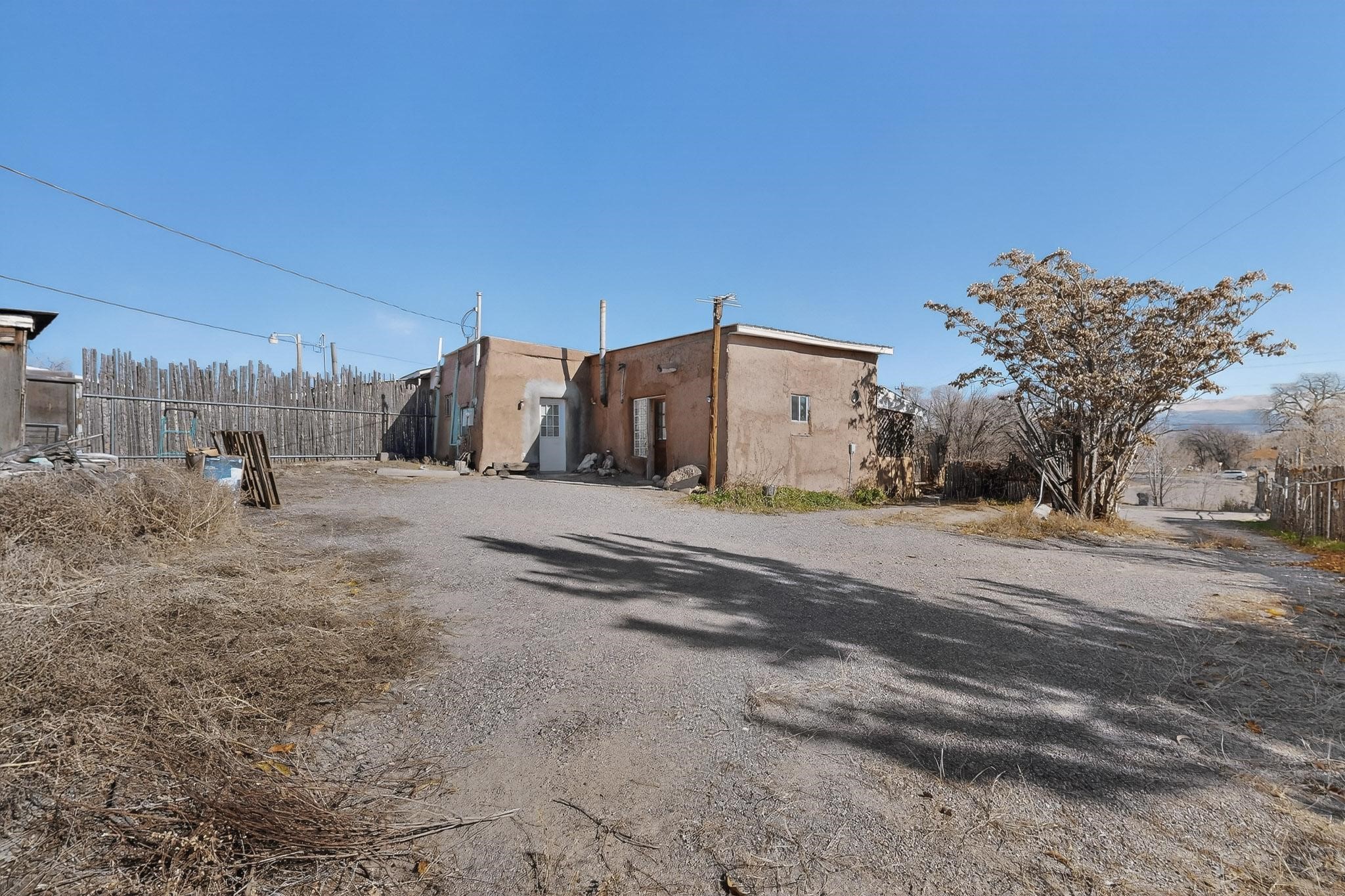 A truly unique adobe town home, perched on a small hill in Espaola, offers breathtaking views of the valley and the Sangre de Cristo Mountains. This property presents an exciting opportunity for a visionary buyer to transform it into an incredible home. Previously used as a beauty salon and massage parlor, the structure itself is remarkable. Its appeal lies in the semi-exposed adobe walls, beautiful plank flooring, and artistic walls, all awaiting a creative touch to make it a showcase residence. The original home was previously divided by a false wall, and into two separate units, each with its own front and back door. Removing this wall would easily restore the property to its original single-family configuration. The property currently features two bathrooms, one of which has been recently remodeled. Guests are welcomed by a charming porch bordered by small gardens. The front yard offers parking with a graveled pathway leading to the gardens and porch. The private backyard provides additional parking and ample secluded outdoor space. This is not a home for just anyone, but it is the perfect canvas for someone with vision.