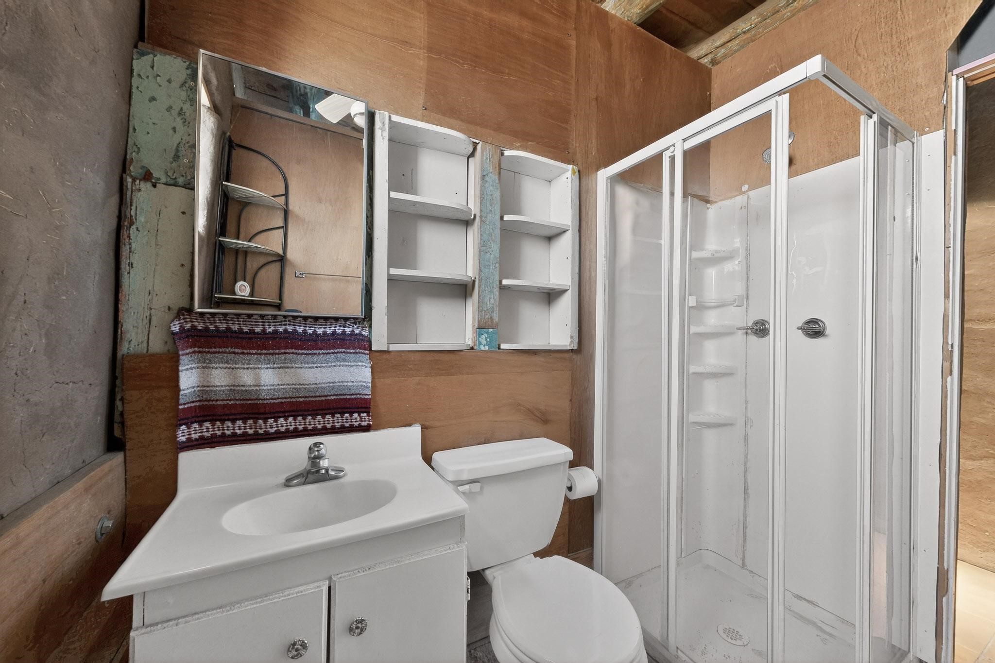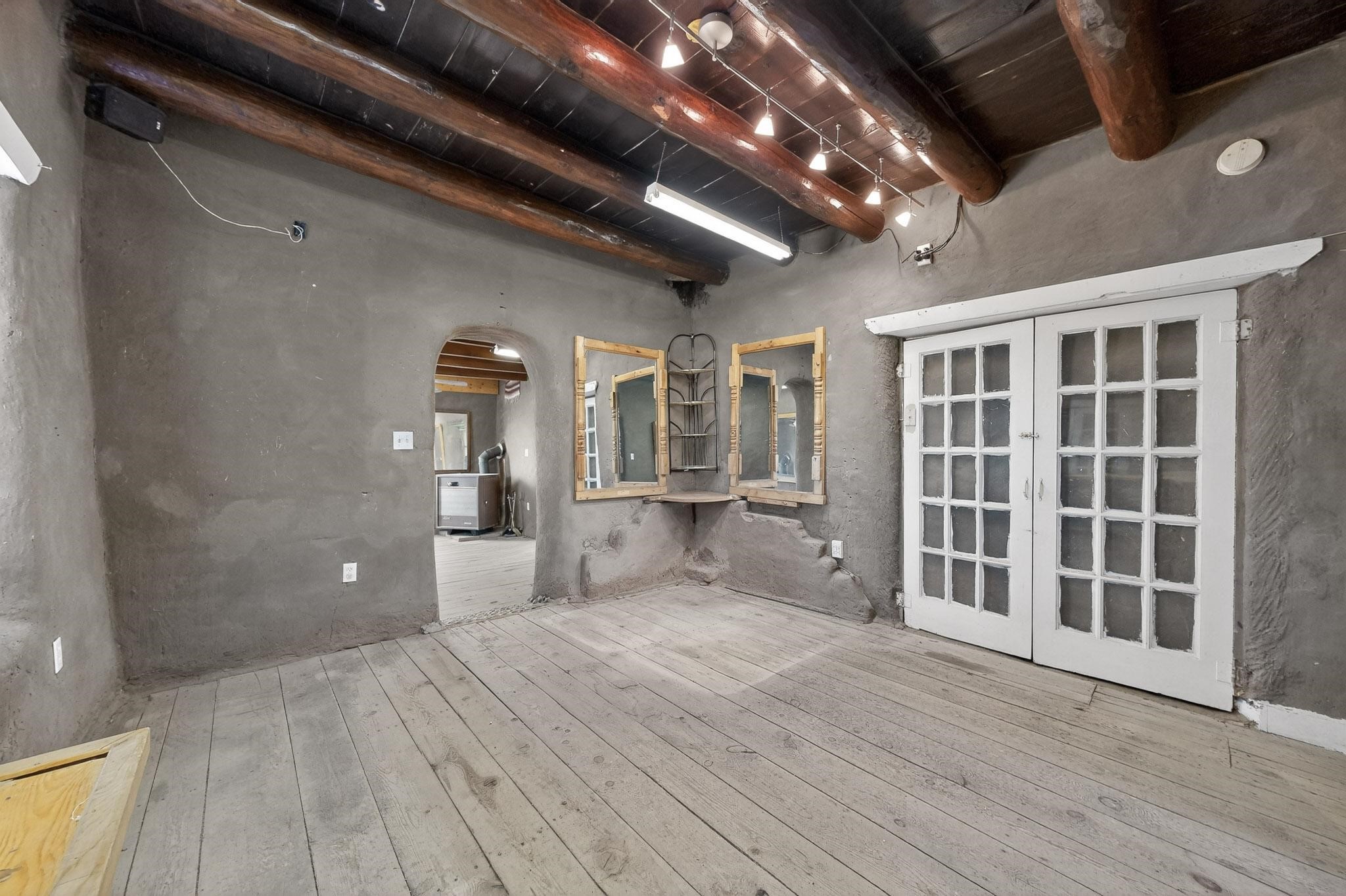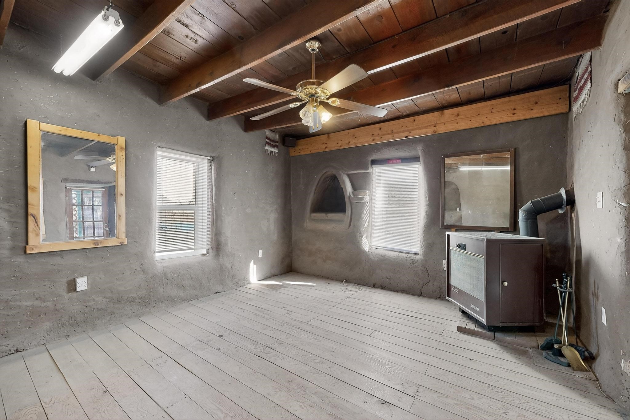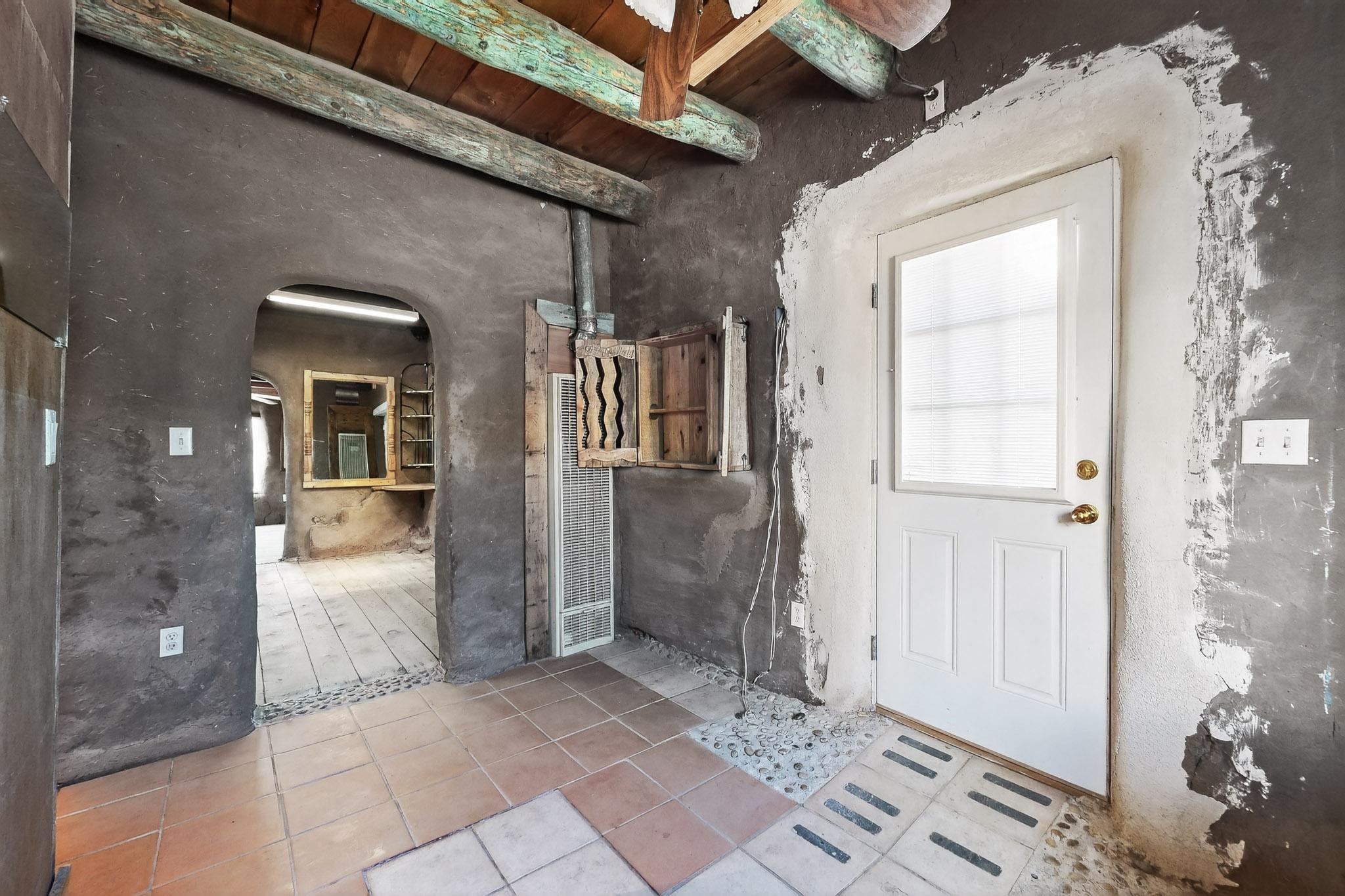 A truly unique adobe town home, perched on a small hill in Espaola, offers breathtaking views of the valley and the Sangre de Cristo Mountains. This property presents an exciting opportunity for a visionary buyer to transform it into an incredible home. Previously used as a beauty salon and massage parlor, the structure itself is remarkable. Its appeal lies in the semi-exposed adobe walls, beautiful plank flooring, and artistic walls, all awaiting a creative touch to make it a showcase residence. The original home was previously divided by a false wall, and into two separate units, each with its own front and back door. Removing this wall would easily restore the property to its original single-family configuration. The property currently features two bathrooms, one of which has been recently remodeled. Guests are welcomed by a charming porch bordered by small gardens. The front yard offers parking with a graveled pathway leading to the gardens and porch. The private backyard provides additional parking and ample secluded outdoor space. This is not a home for just anyone, but it is the perfect canvas for someone with vision.