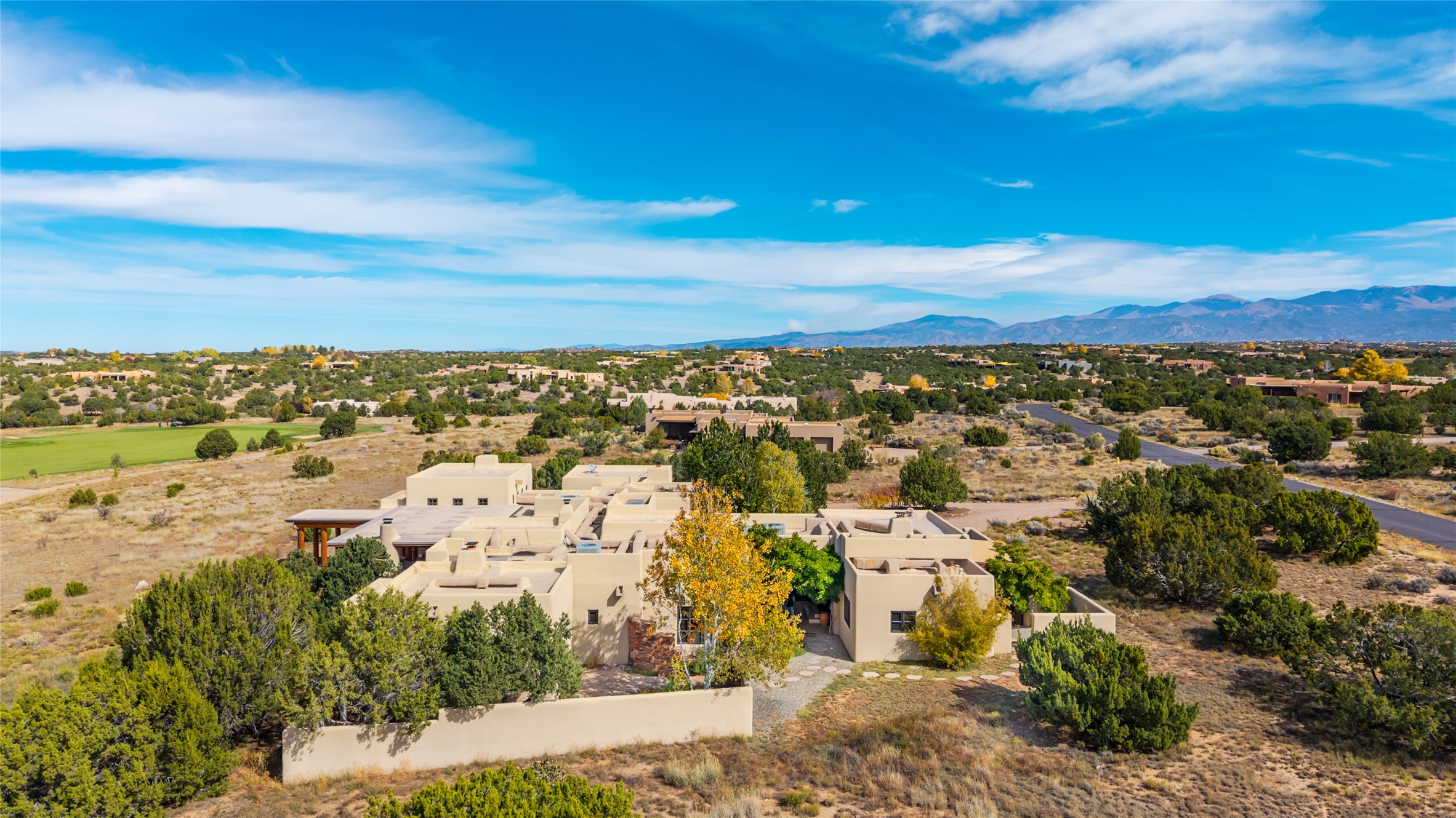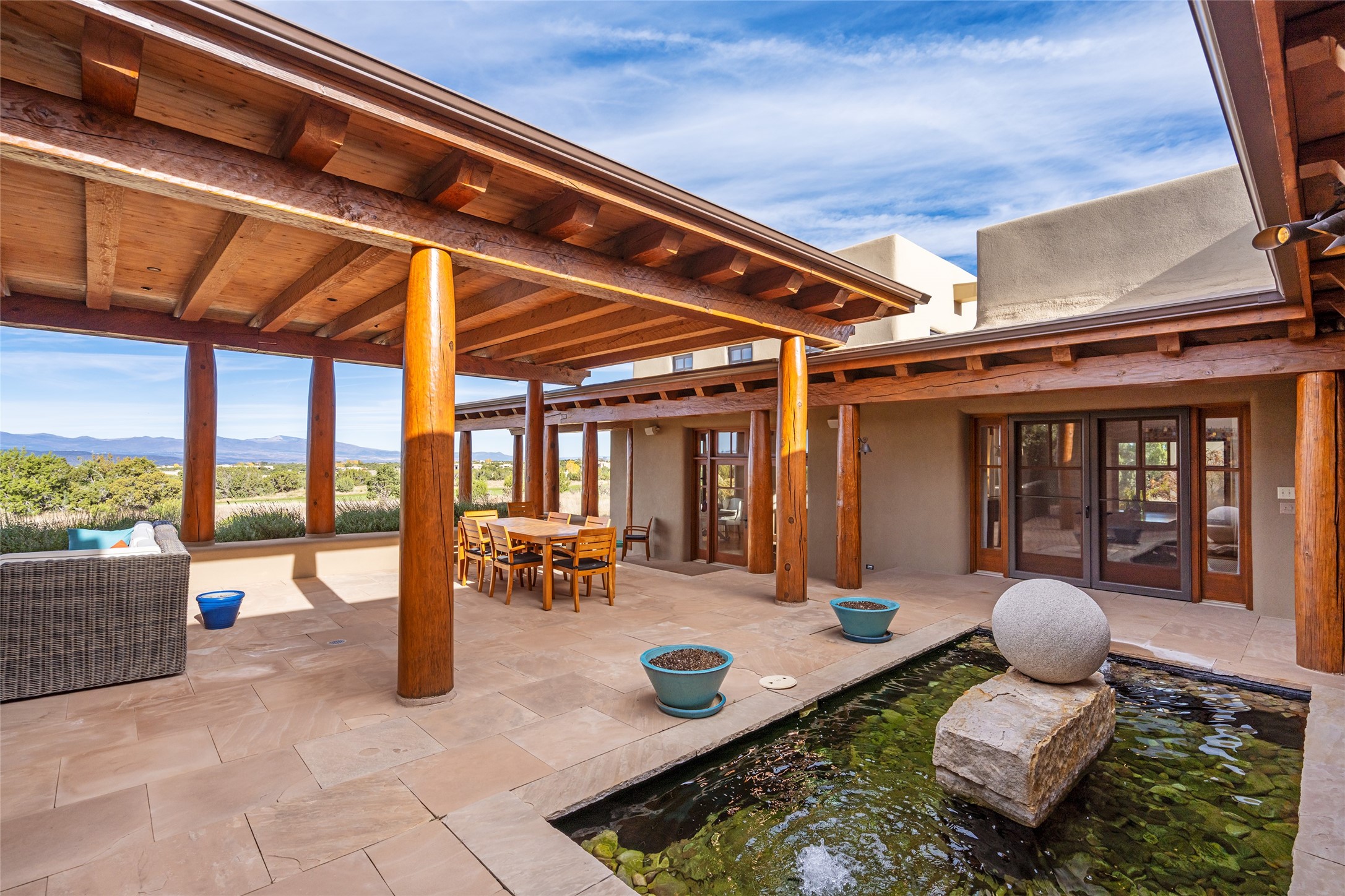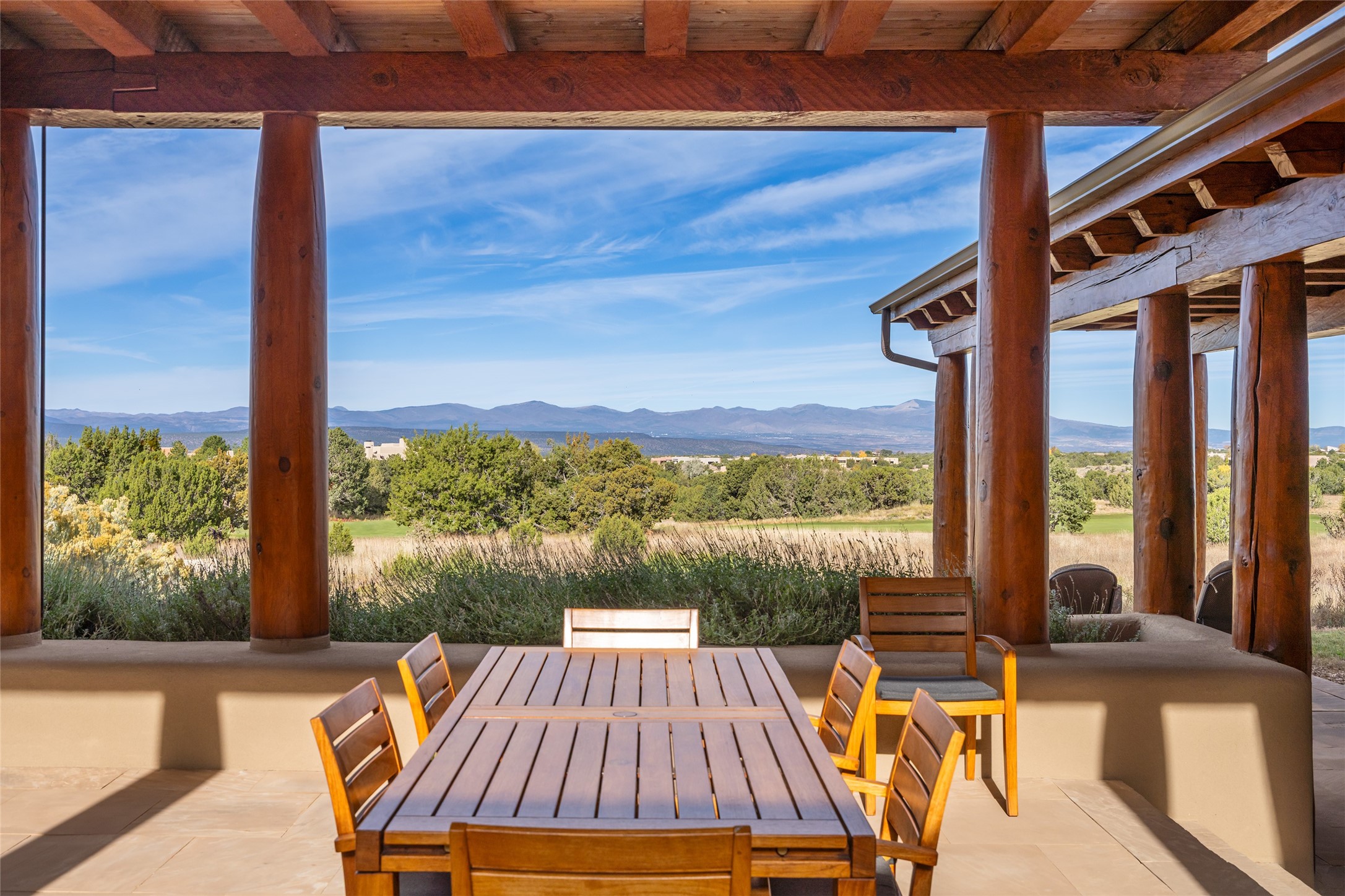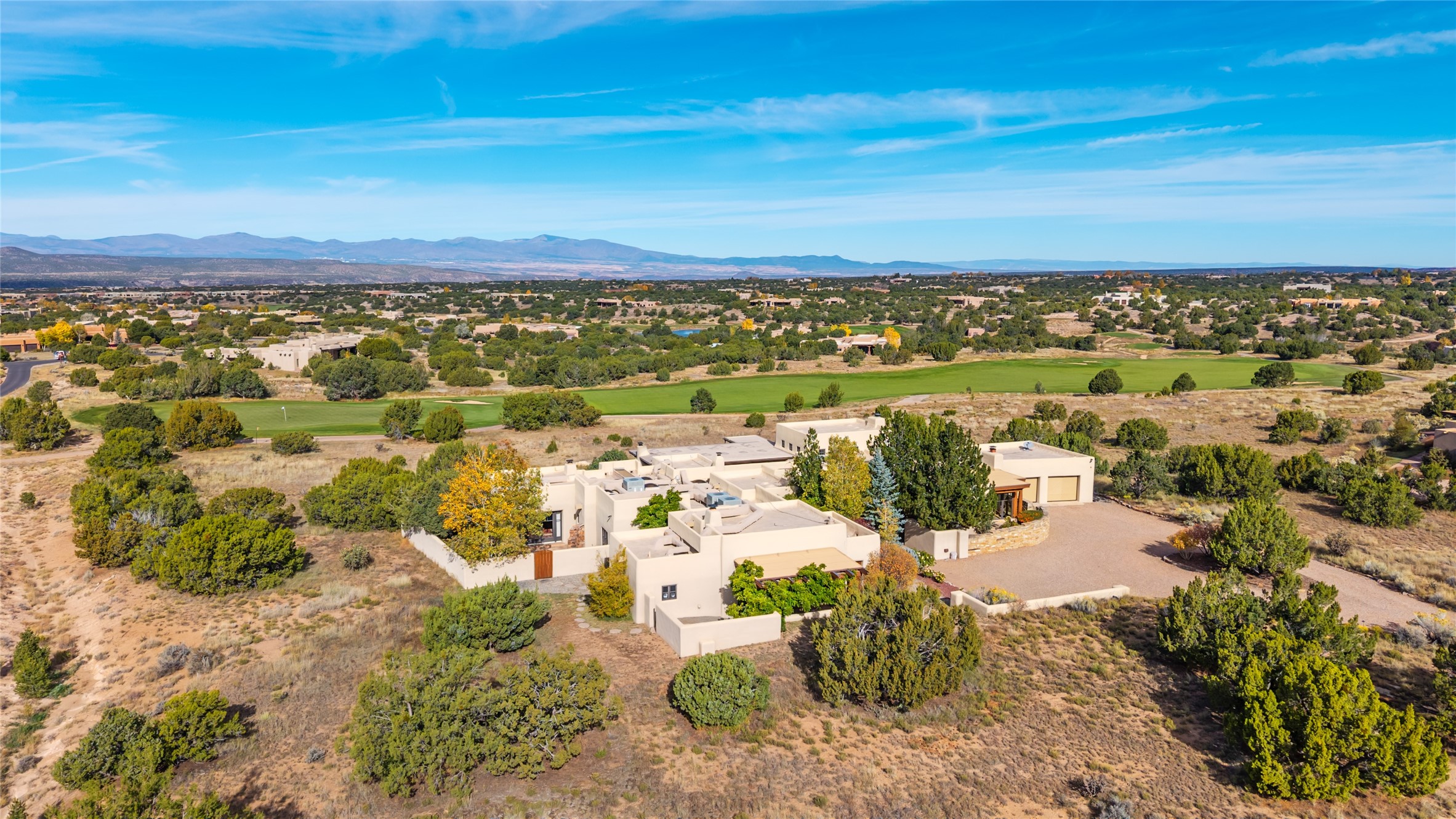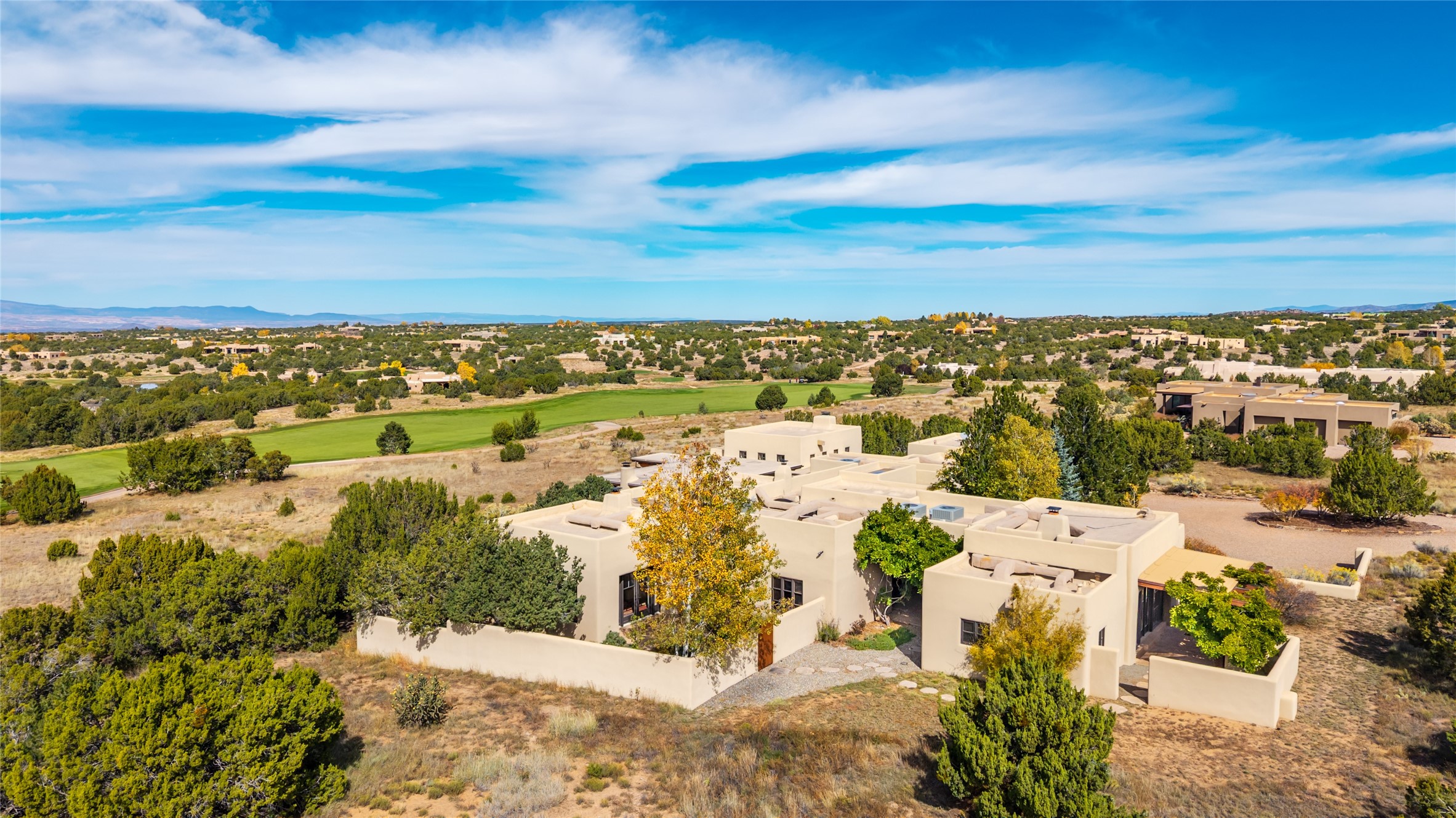 Overlooking the 5th hole of the Sunrise Course in coveted Las Campanas, this exceptional residence--with a beautifully appointed stand-alone guesthouse--was thoughtfully sited to embrace the sweeping views that define Santa Fe luxury living. Constructed of Pumice-Crete for enduring quality, the home blends authentic Pueblo architecture with a subtle Eastern influence, creating a timeless aesthetic marked by walls of windows framed in rich wood, graceful flagstone floors, and exquisite ceilings crafted with hand-hewn beams and refined woodwork. Every room feels anchored and intentional, capturing dramatic vistas while maintaining an intimate, welcoming warmth. The grand living room features tall beamed ceilings, a classic fireplace, and wood floors, setting the tone for effortless elegance. The adjacent family room off the well-appointed chef's kitchen offers another stunning vantage point to the Sangre de Cristo mountains--perfect for relaxed mornings or quiet evenings. The primary suite is a serene sanctuary, complete with its own private courtyard and inspiring views. Two additional spacious ensuite bedrooms and a dedicated office offer ideal flexibility in the main home. The separate guesthouse--with living room and full kitchen--provides exceptional comfort for long-term guests or multigenerational living. Outdoor living here is truly enchanting. A generous portal with fireplace and water feature creates a magical setting for gatherings, all while overlooking some of the finest golf course and mountain views in Santa Fe. Timeless in design and built with uncompromising materials, this remarkable offering stands as a rare haven in Las Campanas--beautiful, enduring, and genuinely unique. A full golf membership is being offered with the sale, and the property can be conveyed nearly turnkey.
