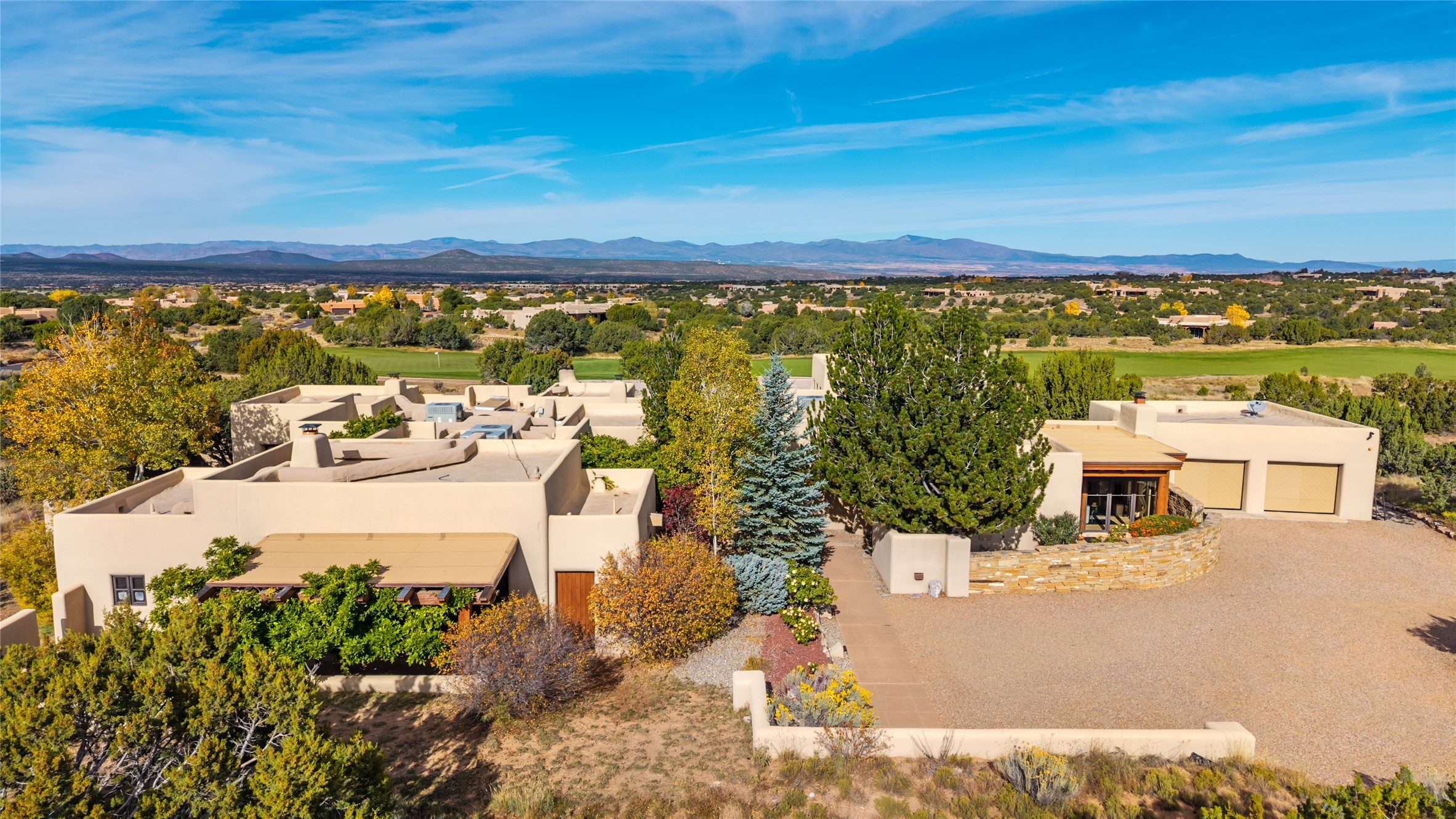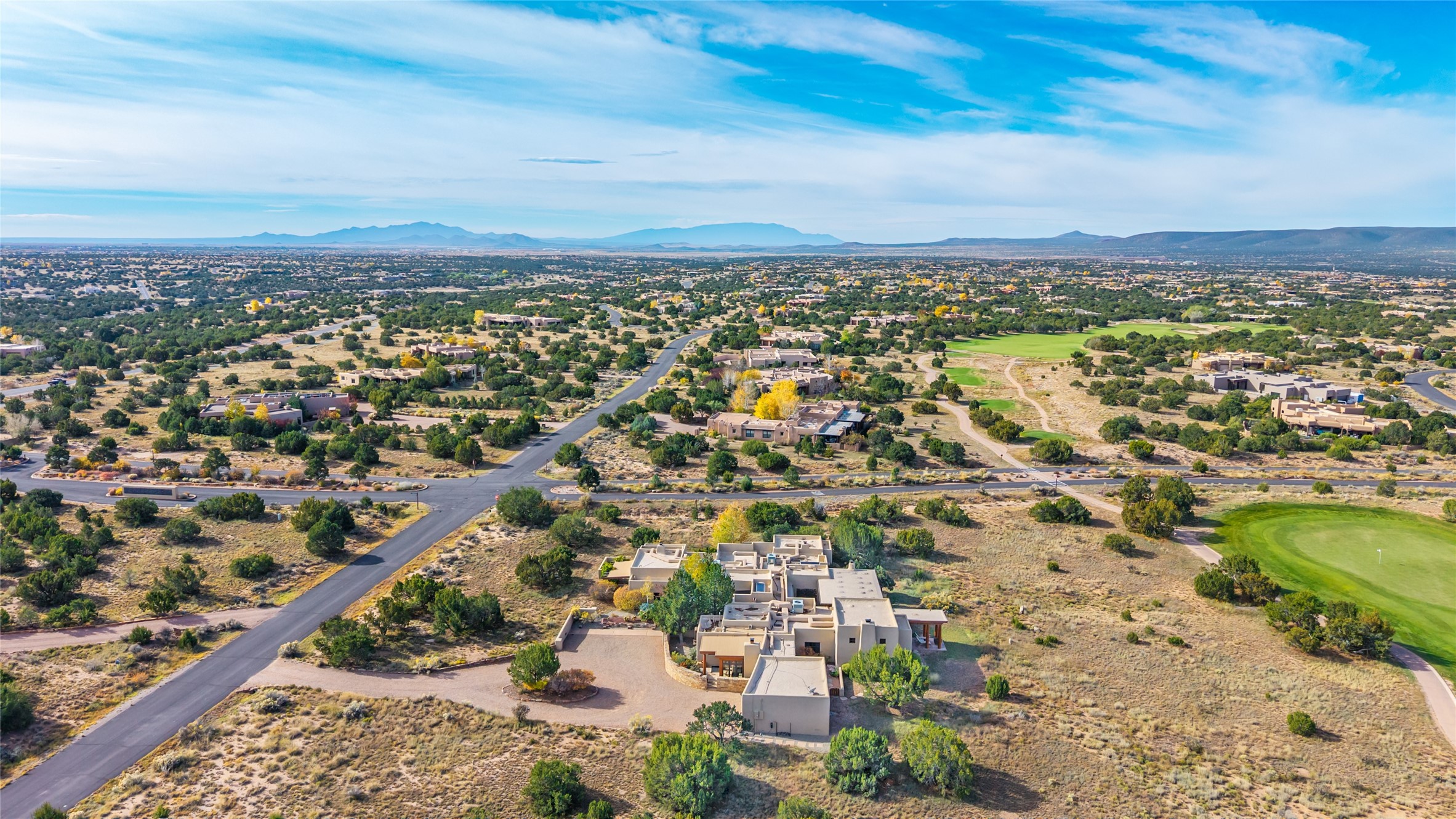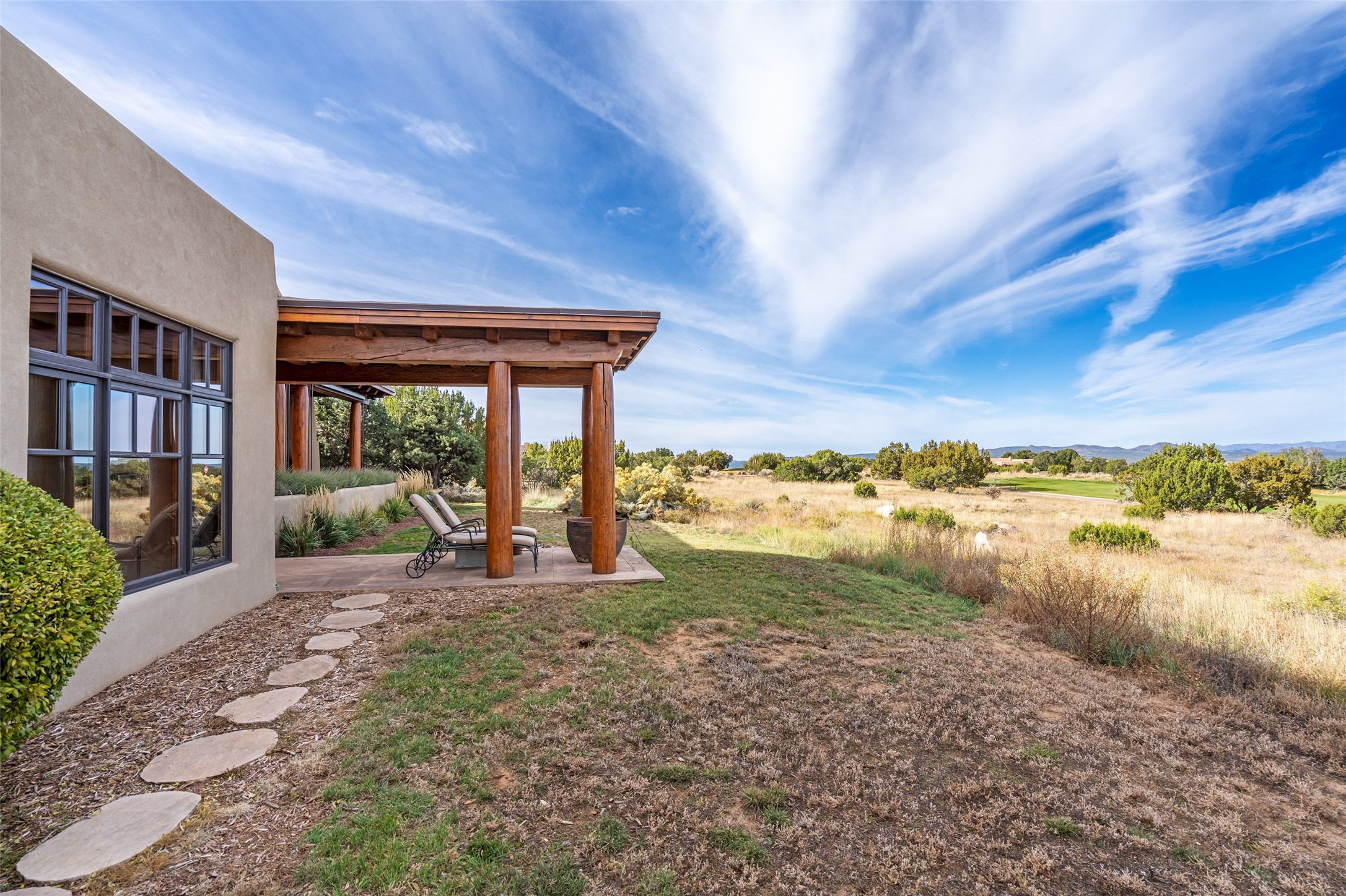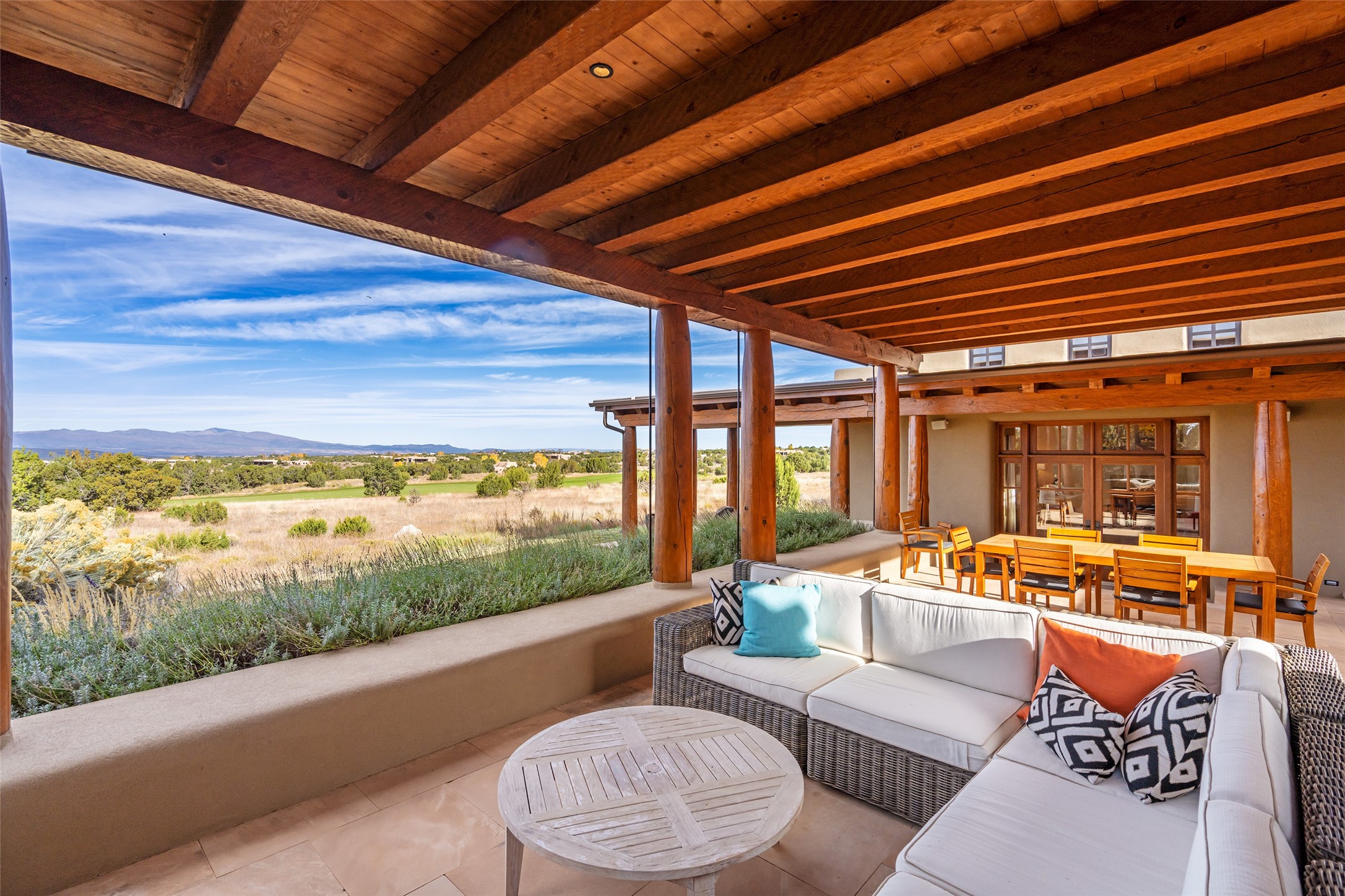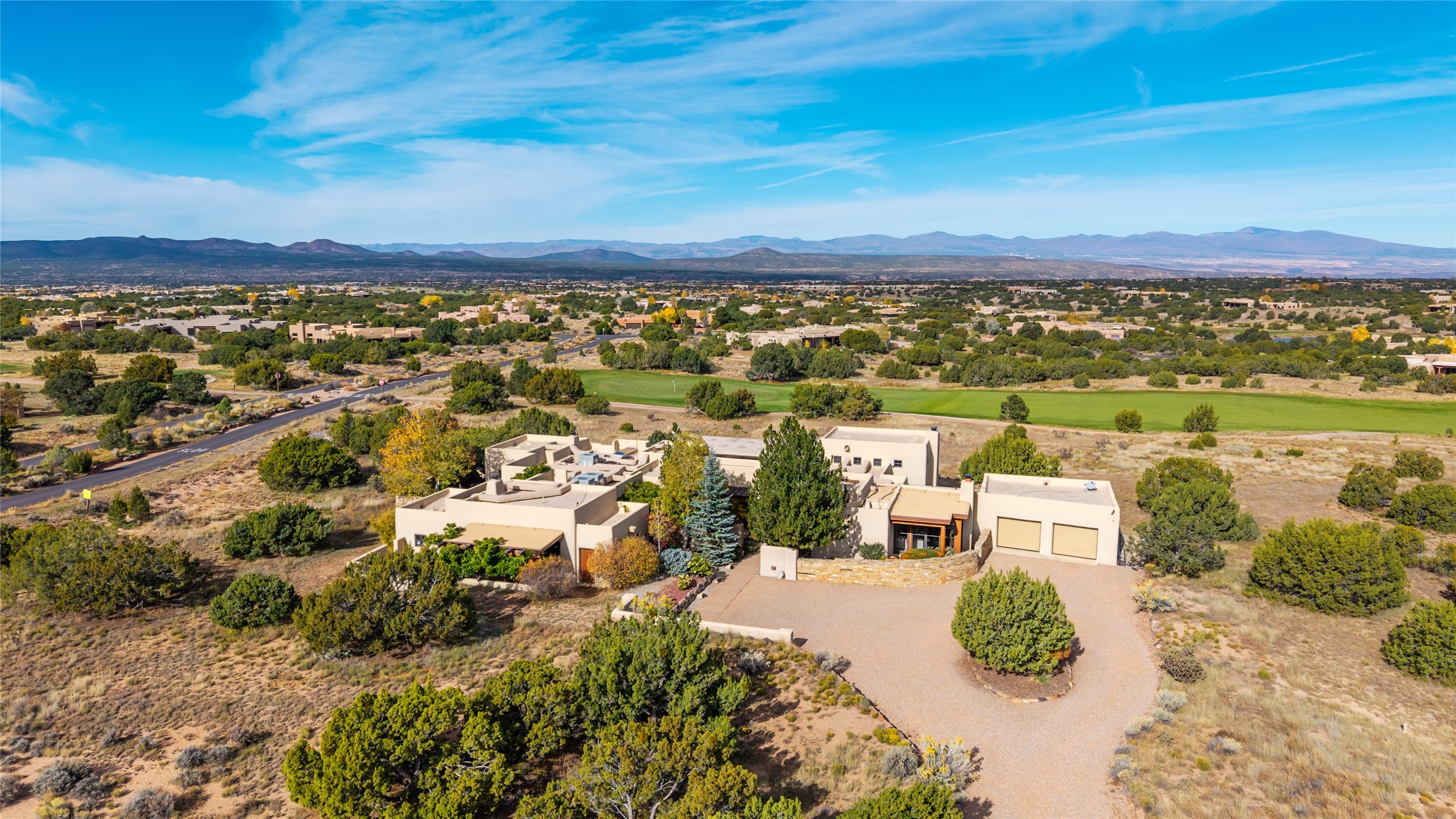 Overlooking the 5th hole of the Sunrise Course in coveted Las Campanas, this exceptional residence--with a beautifully appointed stand-alone guesthouse--was thoughtfully sited to embrace the sweeping views that define Santa Fe luxury living. Constructed of Pumice-Crete for enduring quality, the home blends authentic Pueblo architecture with a subtle Eastern influence, creating a timeless aesthetic marked by walls of windows framed in rich wood, graceful flagstone floors, and exquisite ceilings crafted with hand-hewn beams and refined woodwork. Every room feels anchored and intentional, capturing dramatic vistas while maintaining an intimate, welcoming warmth. The grand living room features tall beamed ceilings, a classic fireplace, and wood floors, setting the tone for effortless elegance. The adjacent family room off the well-appointed chef's kitchen offers another stunning vantage point to the Sangre de Cristo mountains--perfect for relaxed mornings or quiet evenings. The primary suite is a serene sanctuary, complete with its own private courtyard and inspiring views. Two additional spacious ensuite bedrooms and a dedicated office offer ideal flexibility in the main home. The separate guesthouse--with living room and full kitchen--provides exceptional comfort for long-term guests or multigenerational living. Outdoor living here is truly enchanting. A generous portal with fireplace and water feature creates a magical setting for gatherings, all while overlooking some of the finest golf course and mountain views in Santa Fe. Timeless in design and built with uncompromising materials, this remarkable offering stands as a rare haven in Las Campanas--beautiful, enduring, and genuinely unique. A full golf membership is being offered with the sale, and the property can be conveyed nearly turnkey.