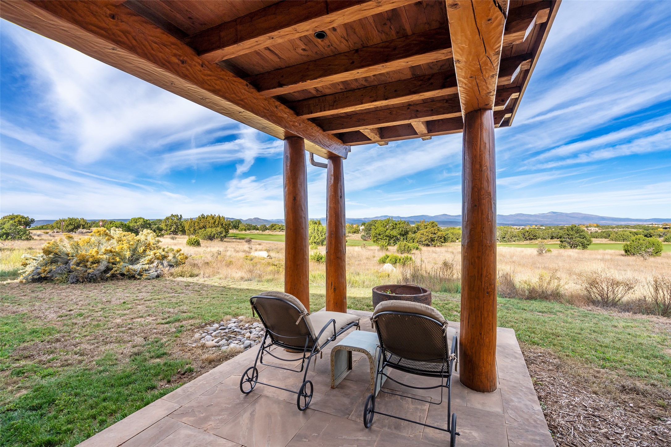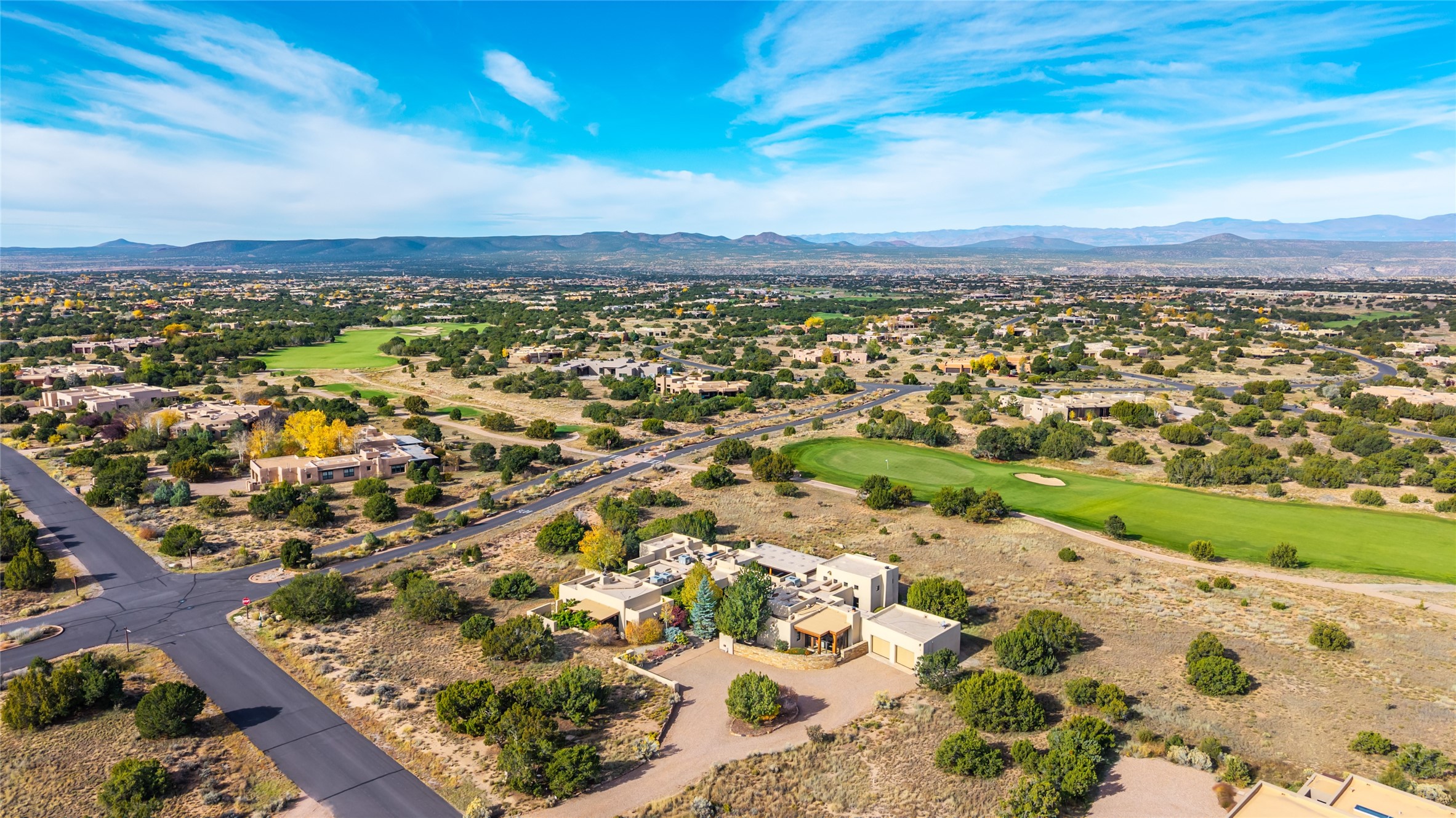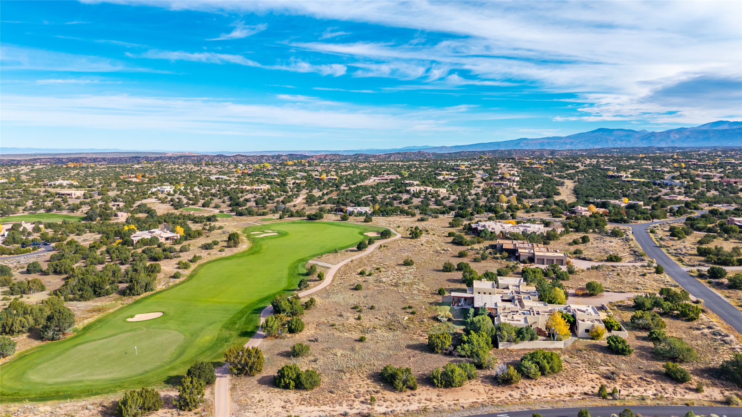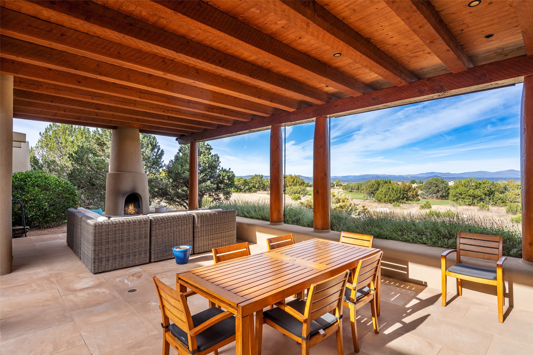 Overlooking the 5th hole of the Sunrise Course in coveted Las Campanas, this exceptional residence--with a beautifully appointed stand-alone guesthouse--was thoughtfully sited to embrace the sweeping views that define Santa Fe luxury living. Constructed of Pumice-Crete for enduring quality, the home blends authentic Pueblo architecture with a subtle Eastern influence, creating a timeless aesthetic marked by walls of windows framed in rich wood, graceful flagstone floors, and exquisite ceilings crafted with hand-hewn beams and refined woodwork. Every room feels anchored and intentional, capturing dramatic vistas while maintaining an intimate, welcoming warmth. The grand living room features tall beamed ceilings, a classic fireplace, and wood floors, setting the tone for effortless elegance. The adjacent family room off the well-appointed chef's kitchen offers another stunning vantage point to the Sangre de Cristo mountains--perfect for relaxed mornings or quiet evenings. The primary suite is a serene sanctuary, complete with its own private courtyard and inspiring views. Two additional spacious ensuite bedrooms and a dedicated office offer ideal flexibility in the main home. The separate guesthouse--with living room and full kitchen--provides exceptional comfort for long-term guests or multigenerational living. Outdoor living here is truly enchanting. A generous portal with fireplace and water feature creates a magical setting for gatherings, all while overlooking some of the finest golf course and mountain views in Santa Fe. Timeless in design and built with uncompromising materials, this remarkable offering stands as a rare haven in Las Campanas--beautiful, enduring, and genuinely unique. A full golf membership is being offered with the sale, and the property can be conveyed nearly turnkey.