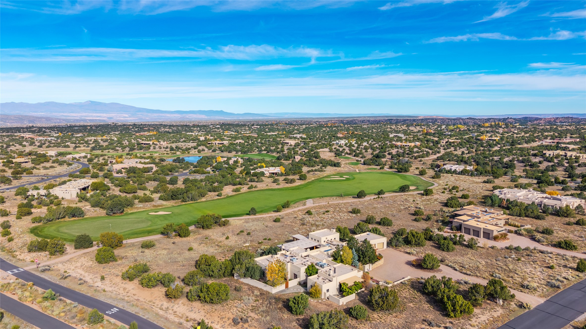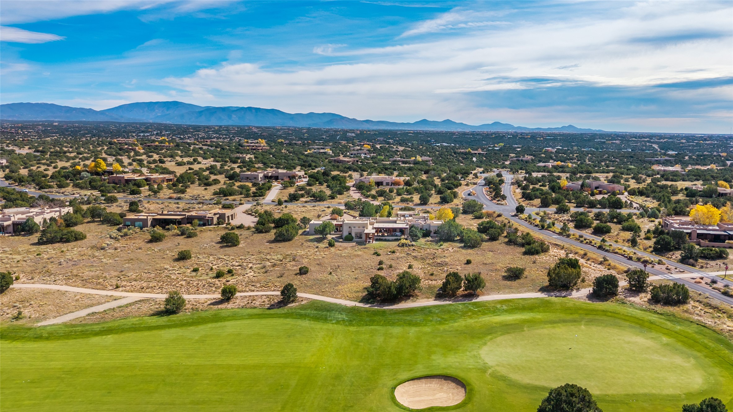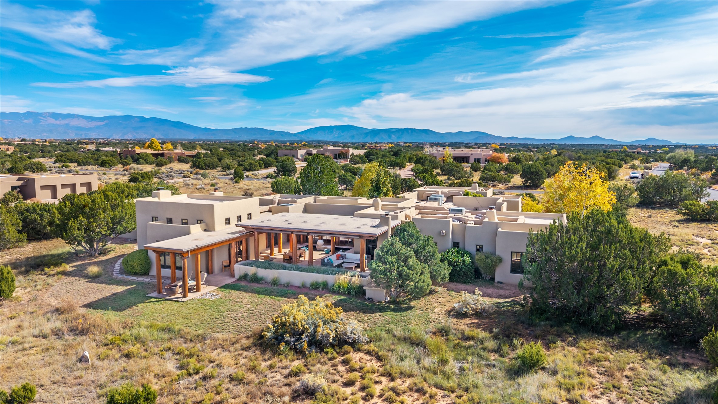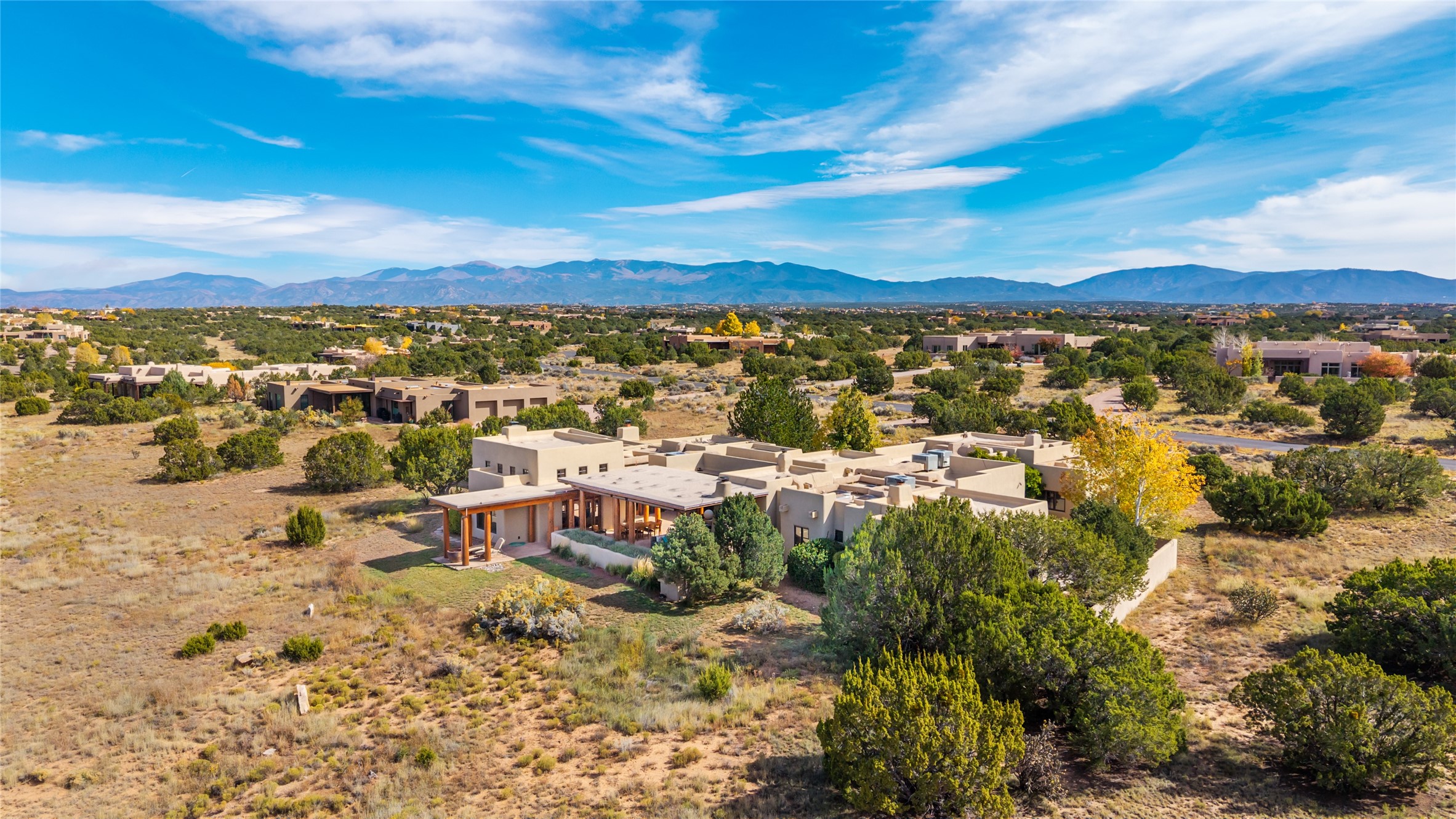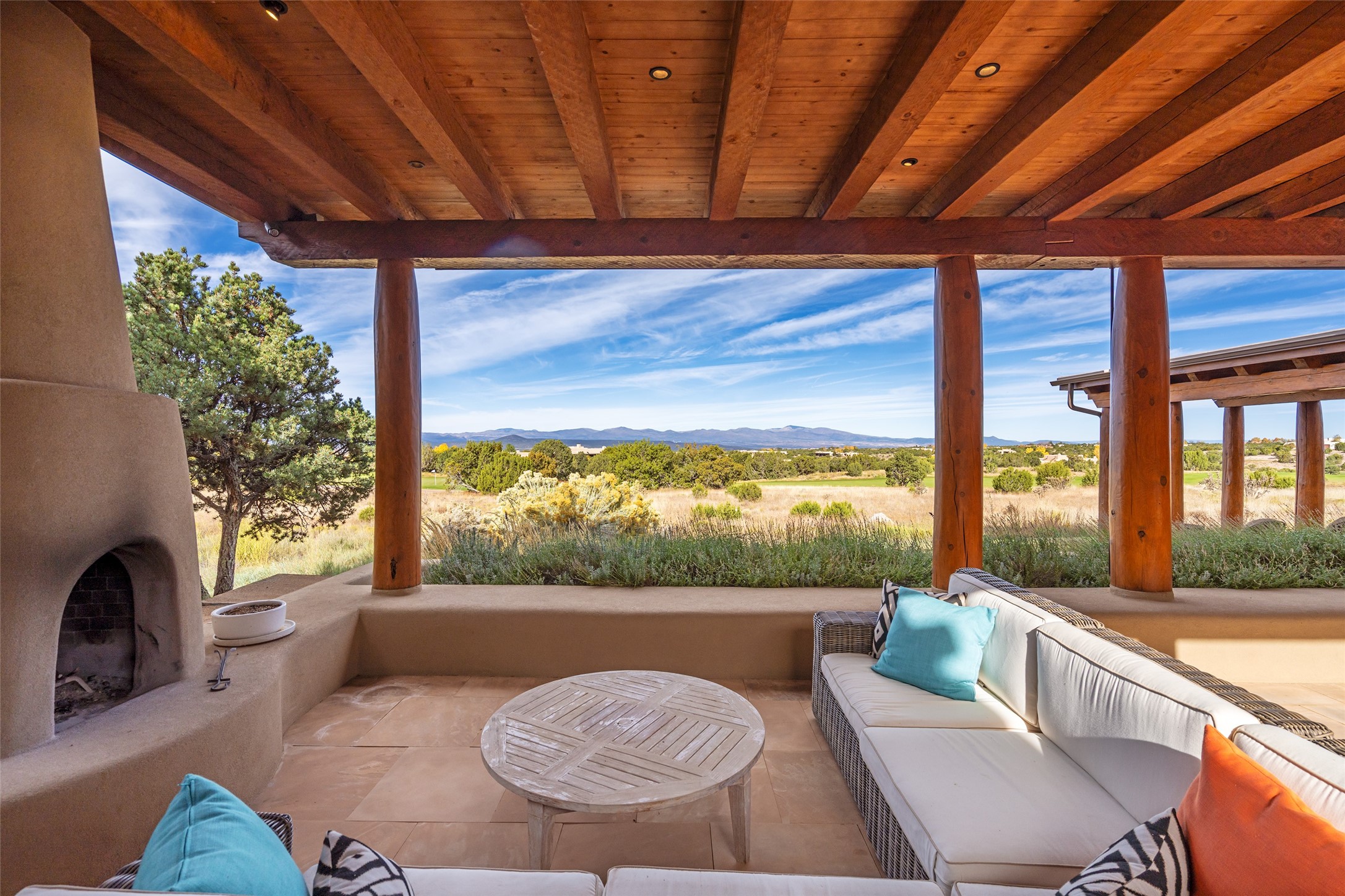 Overlooking the 5th hole of the Sunrise Course in coveted Las Campanas, this exceptional residence--with a beautifully appointed stand-alone guesthouse--was thoughtfully sited to embrace the sweeping views that define Santa Fe luxury living. Constructed of Pumice-Crete for enduring quality, the home blends authentic Pueblo architecture with a subtle Eastern influence, creating a timeless aesthetic marked by walls of windows framed in rich wood, graceful flagstone floors, and exquisite ceilings crafted with hand-hewn beams and refined woodwork. Every room feels anchored and intentional, capturing dramatic vistas while maintaining an intimate, welcoming warmth. The grand living room features tall beamed ceilings, a classic fireplace, and wood floors, setting the tone for effortless elegance. The adjacent family room off the well-appointed chef's kitchen offers another stunning vantage point to the Sangre de Cristo mountains--perfect for relaxed mornings or quiet evenings. The primary suite is a serene sanctuary, complete with its own private courtyard and inspiring views. Two additional spacious ensuite bedrooms and a dedicated office offer ideal flexibility in the main home. The separate guesthouse--with living room and full kitchen--provides exceptional comfort for long-term guests or multigenerational living. Outdoor living here is truly enchanting. A generous portal with fireplace and water feature creates a magical setting for gatherings, all while overlooking some of the finest golf course and mountain views in Santa Fe. Timeless in design and built with uncompromising materials, this remarkable offering stands as a rare haven in Las Campanas--beautiful, enduring, and genuinely unique. A full golf membership is being offered with the sale, and the property can be conveyed nearly turnkey.