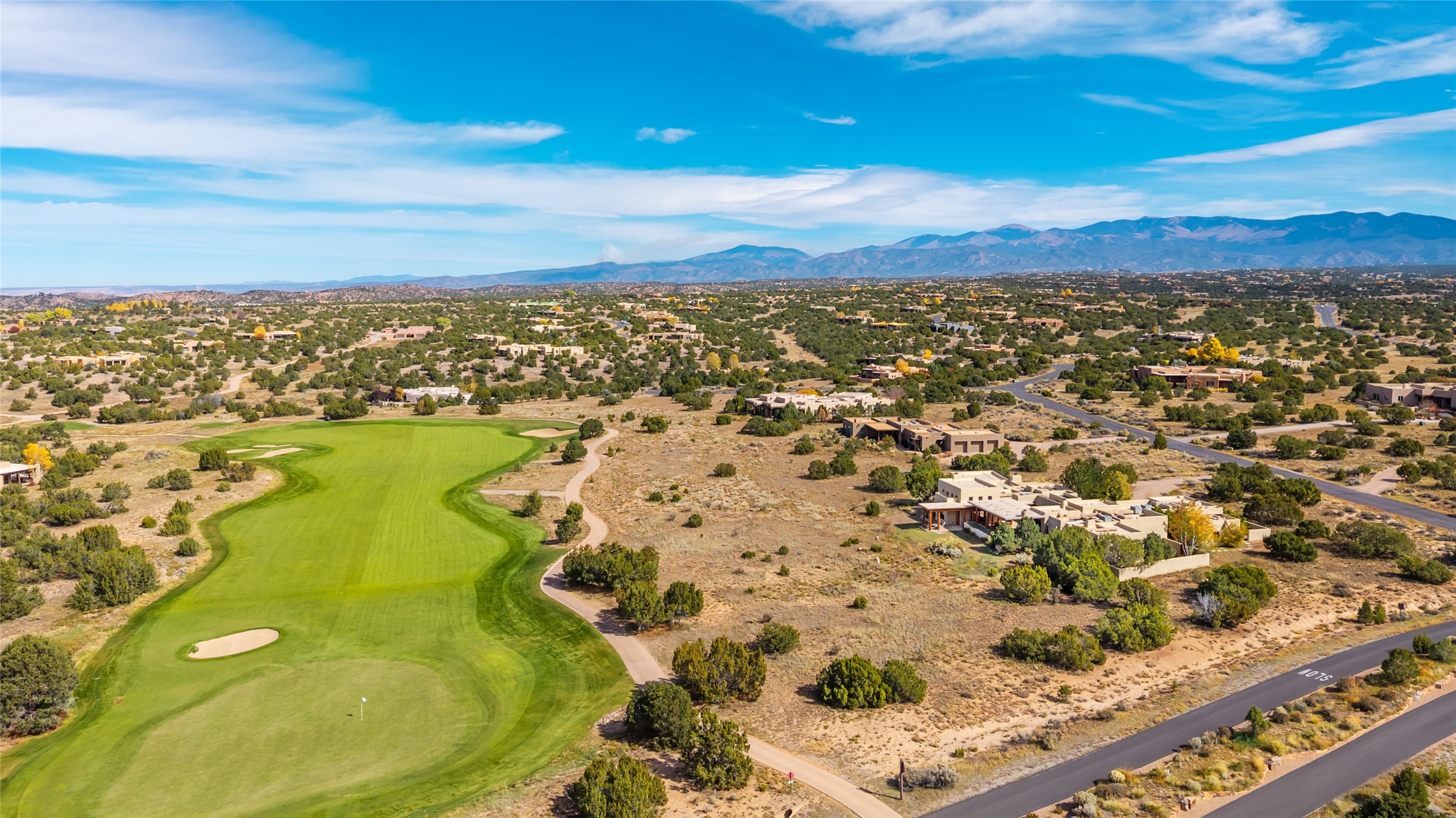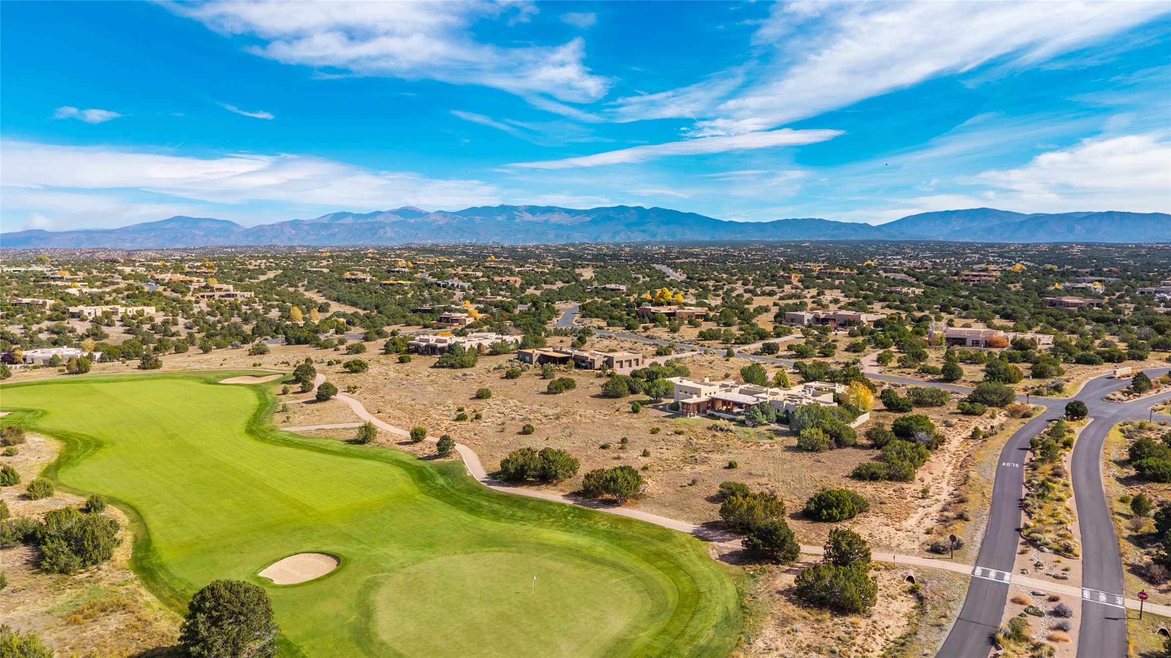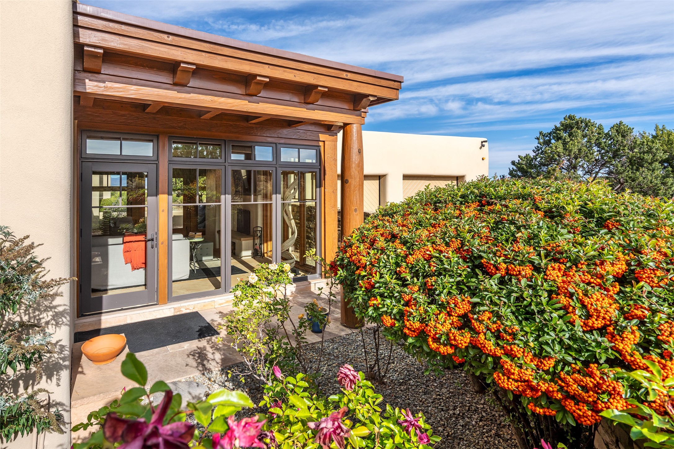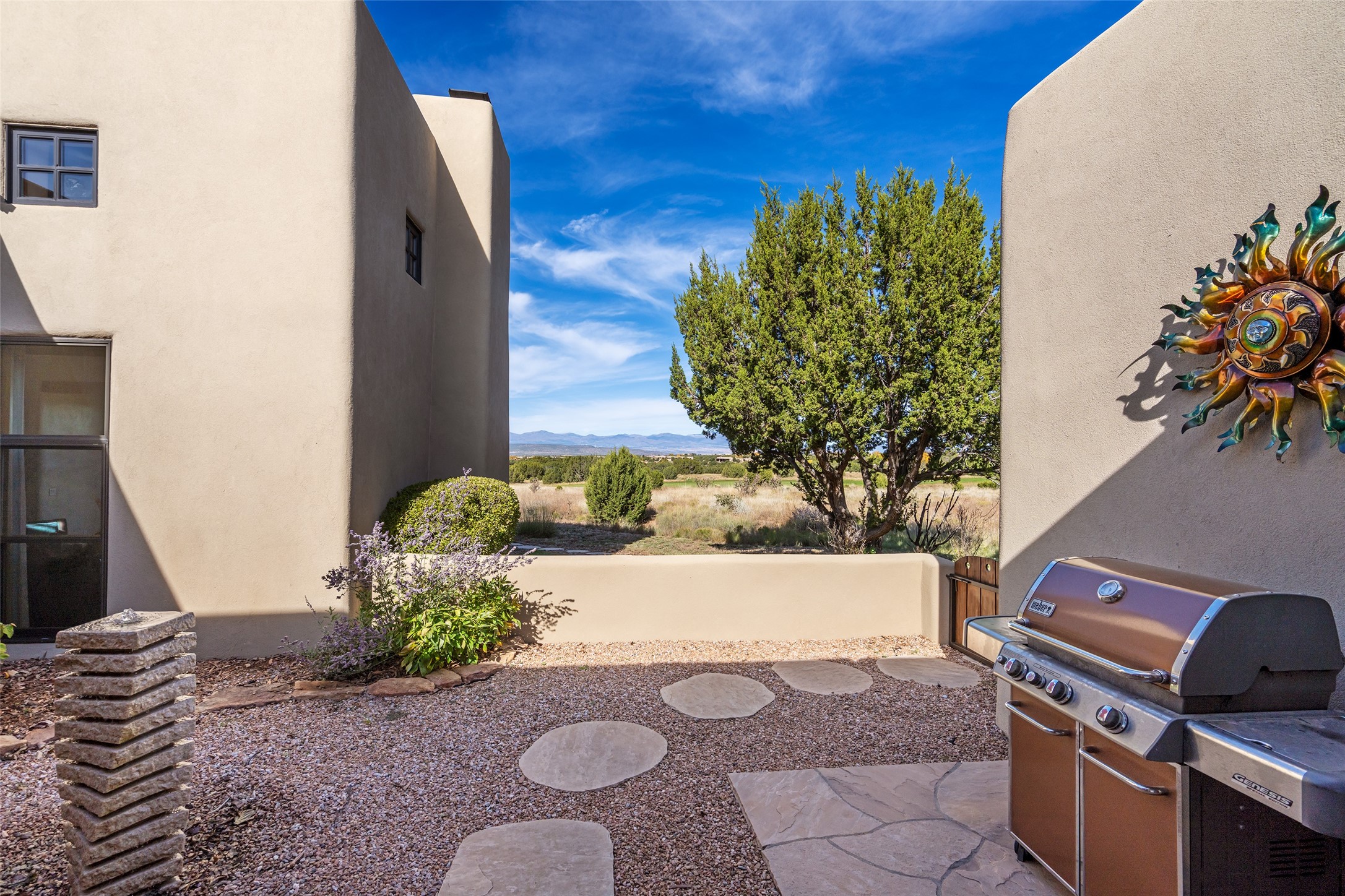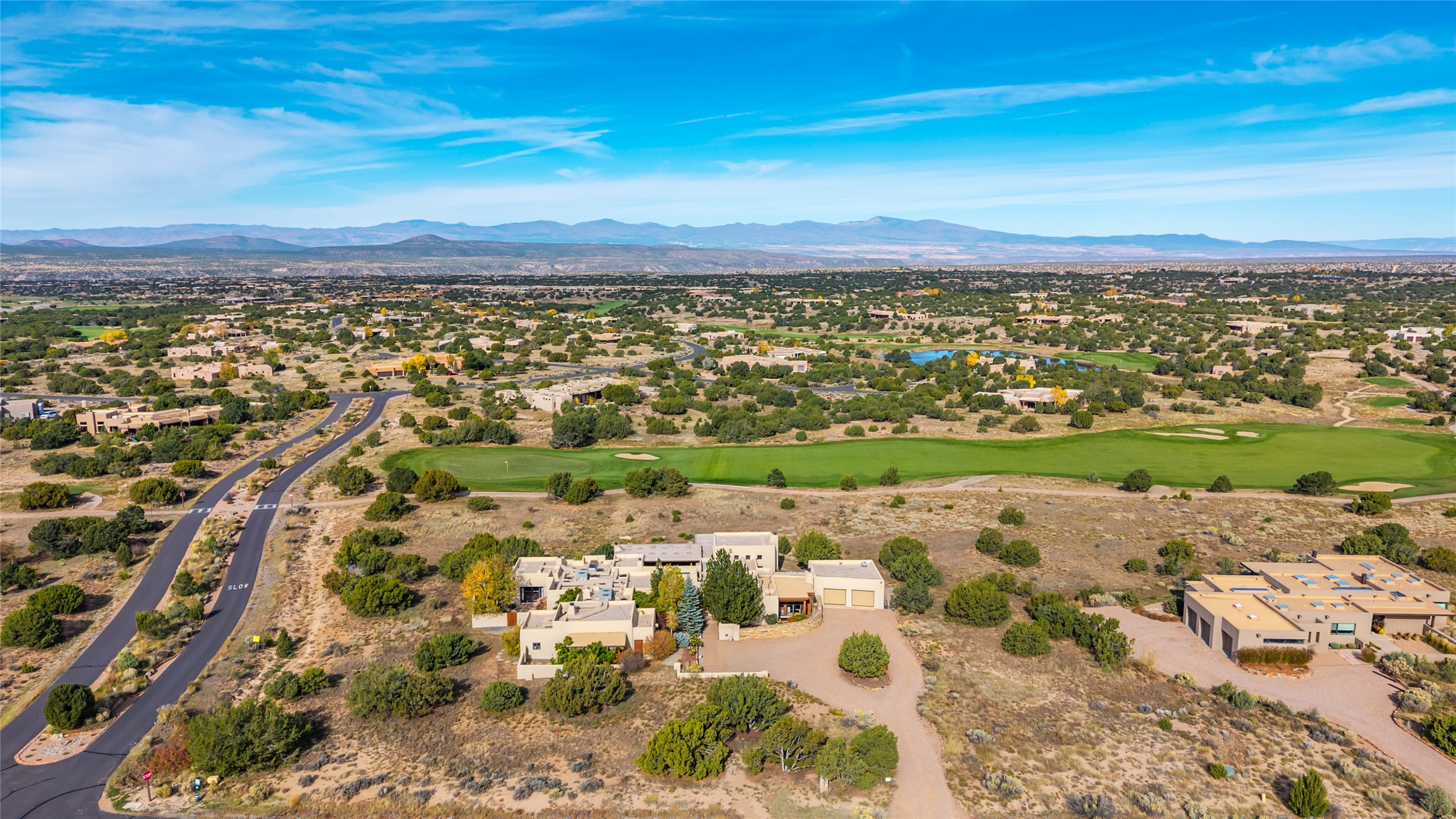 Overlooking the 5th hole of the Sunrise Course in coveted Las Campanas, this exceptional residence--with a beautifully appointed stand-alone guesthouse--was thoughtfully sited to embrace the sweeping views that define Santa Fe luxury living. Constructed of Pumice-Crete for enduring quality, the home blends authentic Pueblo architecture with a subtle Eastern influence, creating a timeless aesthetic marked by walls of windows framed in rich wood, graceful flagstone floors, and exquisite ceilings crafted with hand-hewn beams and refined woodwork. Every room feels anchored and intentional, capturing dramatic vistas while maintaining an intimate, welcoming warmth. The grand living room features tall beamed ceilings, a classic fireplace, and wood floors, setting the tone for effortless elegance. The adjacent family room off the well-appointed chef's kitchen offers another stunning vantage point to the Sangre de Cristo mountains--perfect for relaxed mornings or quiet evenings. The primary suite is a serene sanctuary, complete with its own private courtyard and inspiring views. Two additional spacious ensuite bedrooms and a dedicated office offer ideal flexibility in the main home. The separate guesthouse--with living room and full kitchen--provides exceptional comfort for long-term guests or multigenerational living. Outdoor living here is truly enchanting. A generous portal with fireplace and water feature creates a magical setting for gatherings, all while overlooking some of the finest golf course and mountain views in Santa Fe. Timeless in design and built with uncompromising materials, this remarkable offering stands as a rare haven in Las Campanas--beautiful, enduring, and genuinely unique. A full golf membership is being offered with the sale, and the property can be conveyed nearly turnkey.