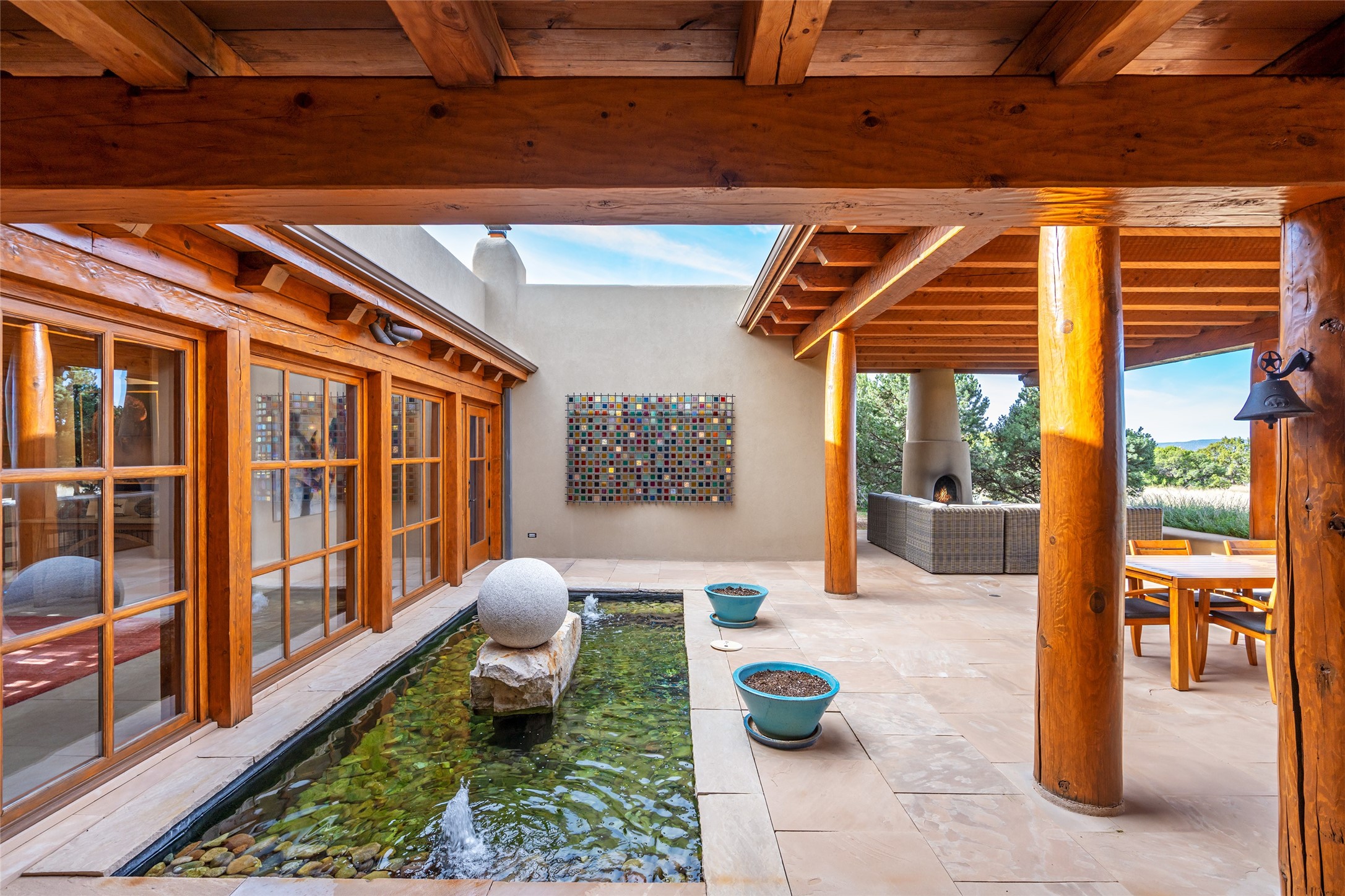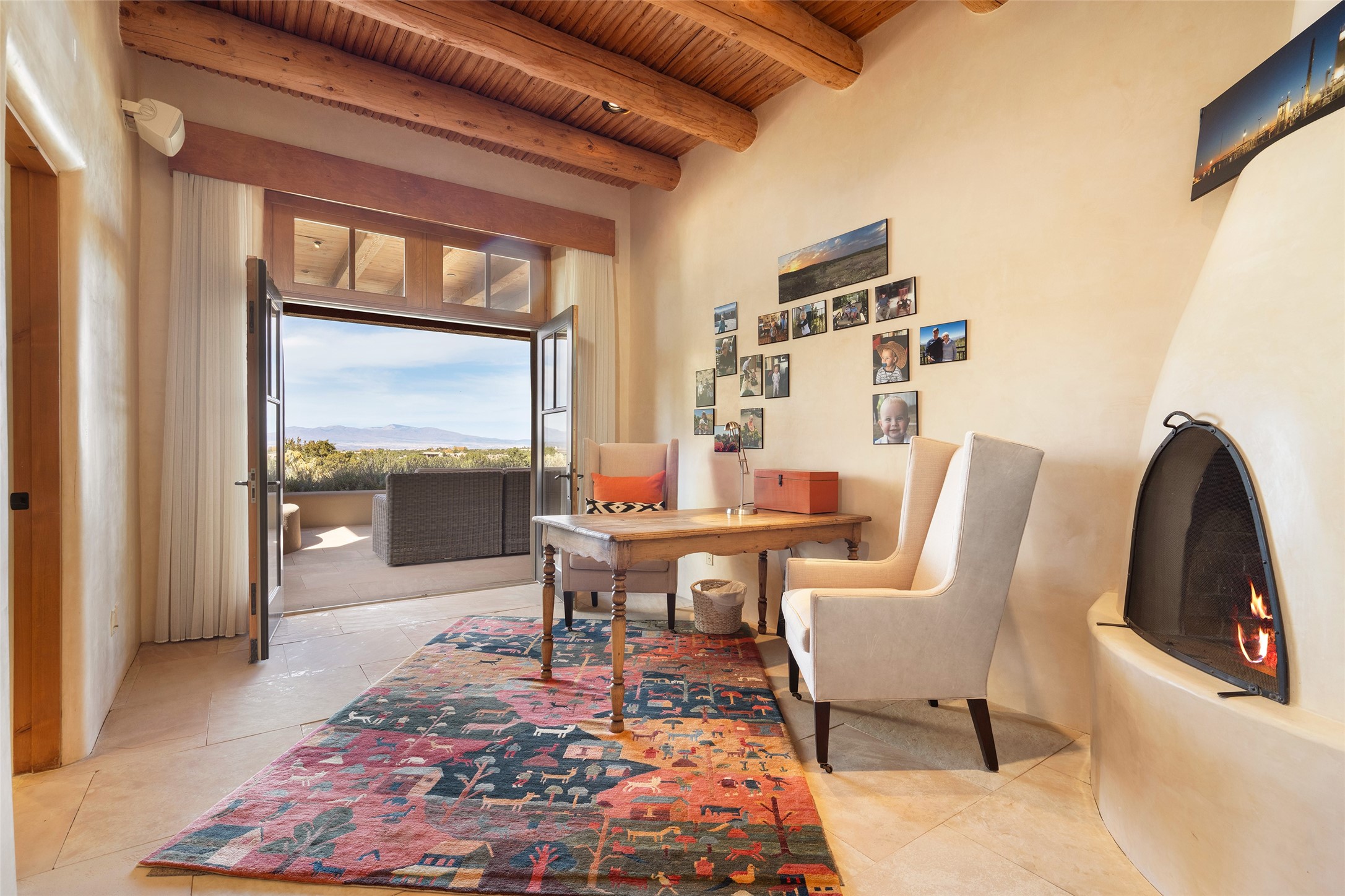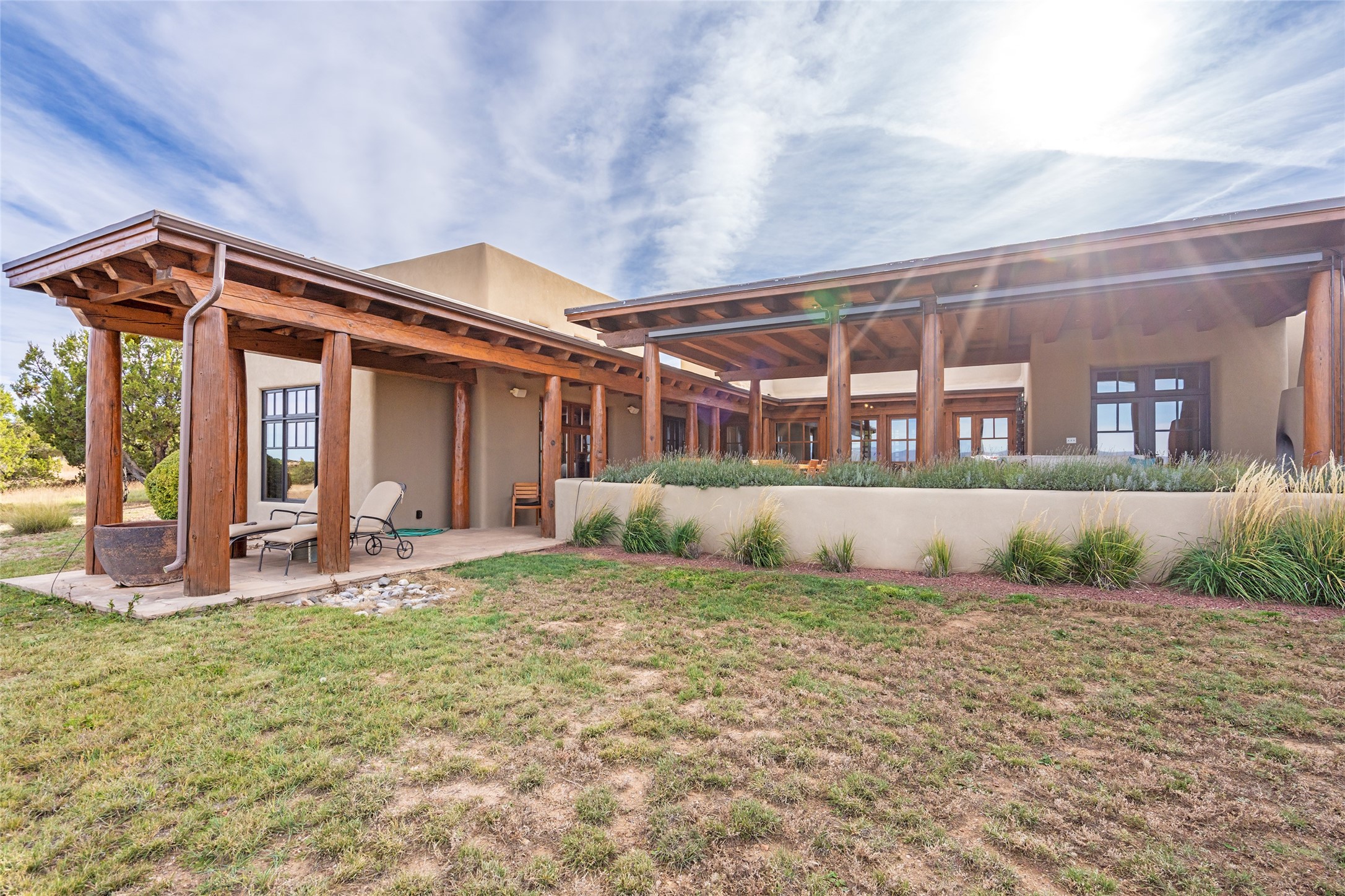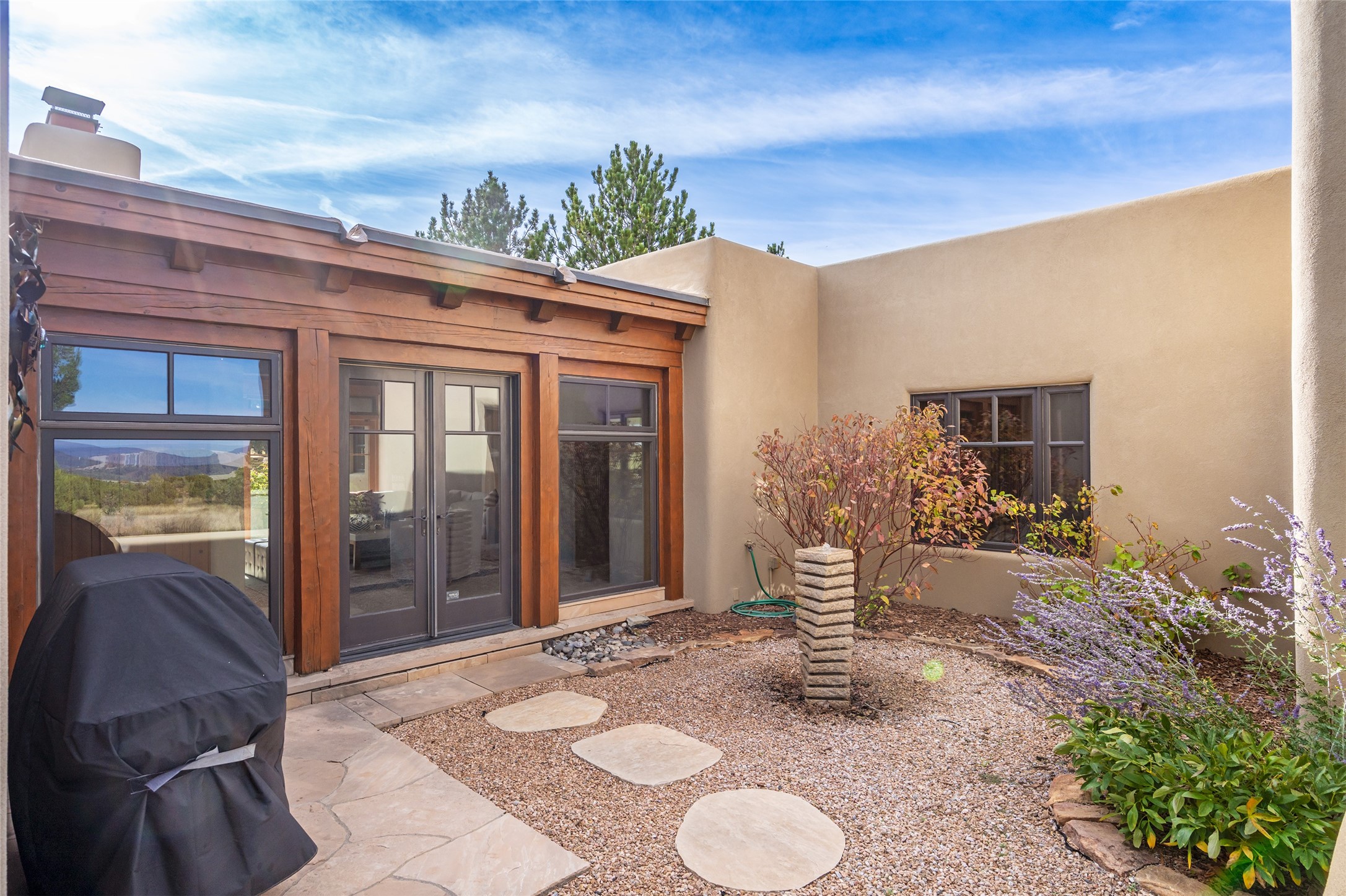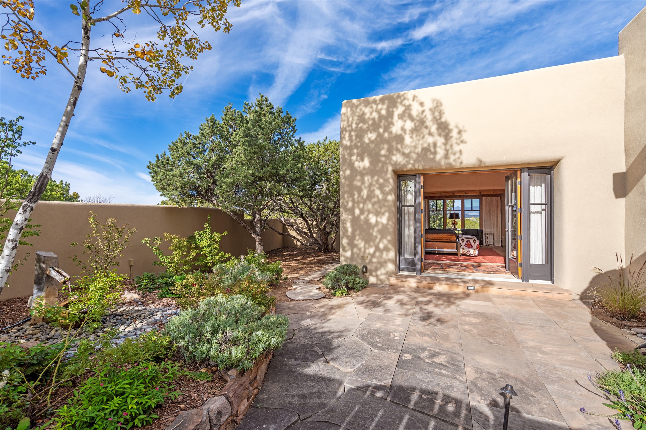 Overlooking the 5th hole of the Sunrise Course in coveted Las Campanas, this exceptional residence--with a beautifully appointed stand-alone guesthouse--was thoughtfully sited to embrace the sweeping views that define Santa Fe luxury living. Constructed of Pumice-Crete for enduring quality, the home blends authentic Pueblo architecture with a subtle Eastern influence, creating a timeless aesthetic marked by walls of windows framed in rich wood, graceful flagstone floors, and exquisite ceilings crafted with hand-hewn beams and refined woodwork. Every room feels anchored and intentional, capturing dramatic vistas while maintaining an intimate, welcoming warmth. The grand living room features tall beamed ceilings, a classic fireplace, and wood floors, setting the tone for effortless elegance. The adjacent family room off the well-appointed chef's kitchen offers another stunning vantage point to the Sangre de Cristo mountains--perfect for relaxed mornings or quiet evenings. The primary suite is a serene sanctuary, complete with its own private courtyard and inspiring views. Two additional spacious ensuite bedrooms and a dedicated office offer ideal flexibility in the main home. The separate guesthouse--with living room and full kitchen--provides exceptional comfort for long-term guests or multigenerational living. Outdoor living here is truly enchanting. A generous portal with fireplace and water feature creates a magical setting for gatherings, all while overlooking some of the finest golf course and mountain views in Santa Fe. Timeless in design and built with uncompromising materials, this remarkable offering stands as a rare haven in Las Campanas--beautiful, enduring, and genuinely unique. A full golf membership is being offered with the sale, and the property can be conveyed nearly turnkey.
