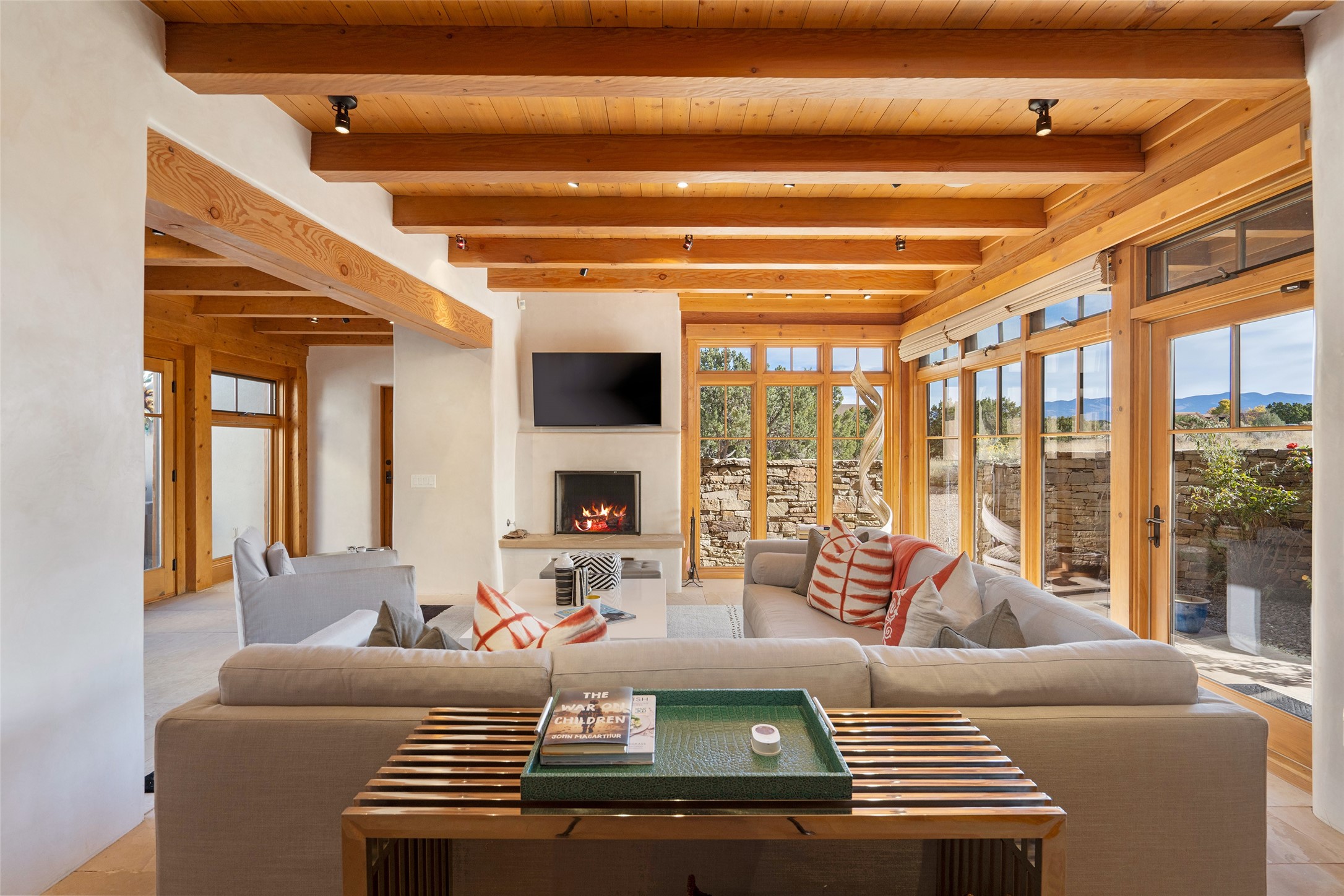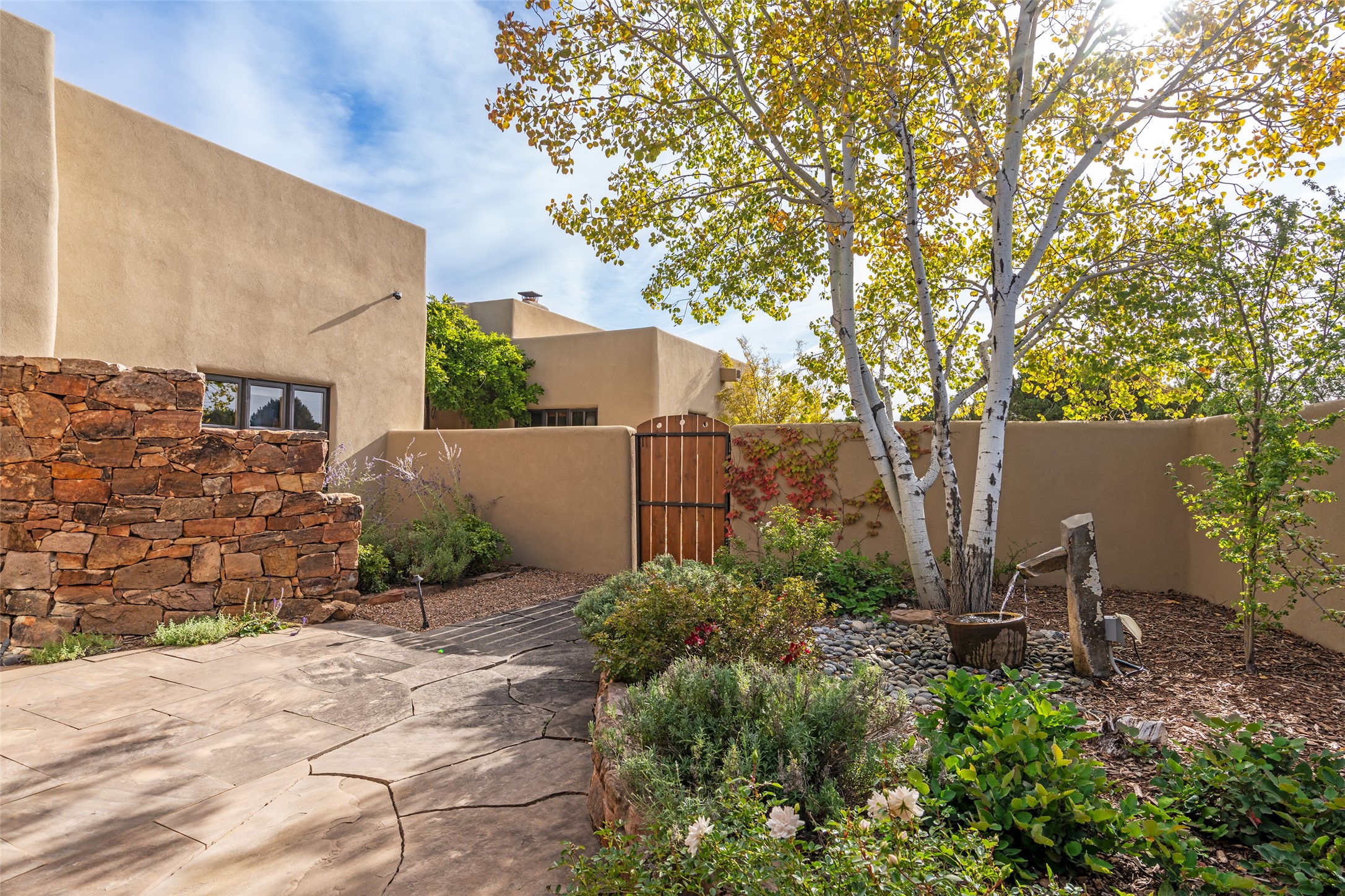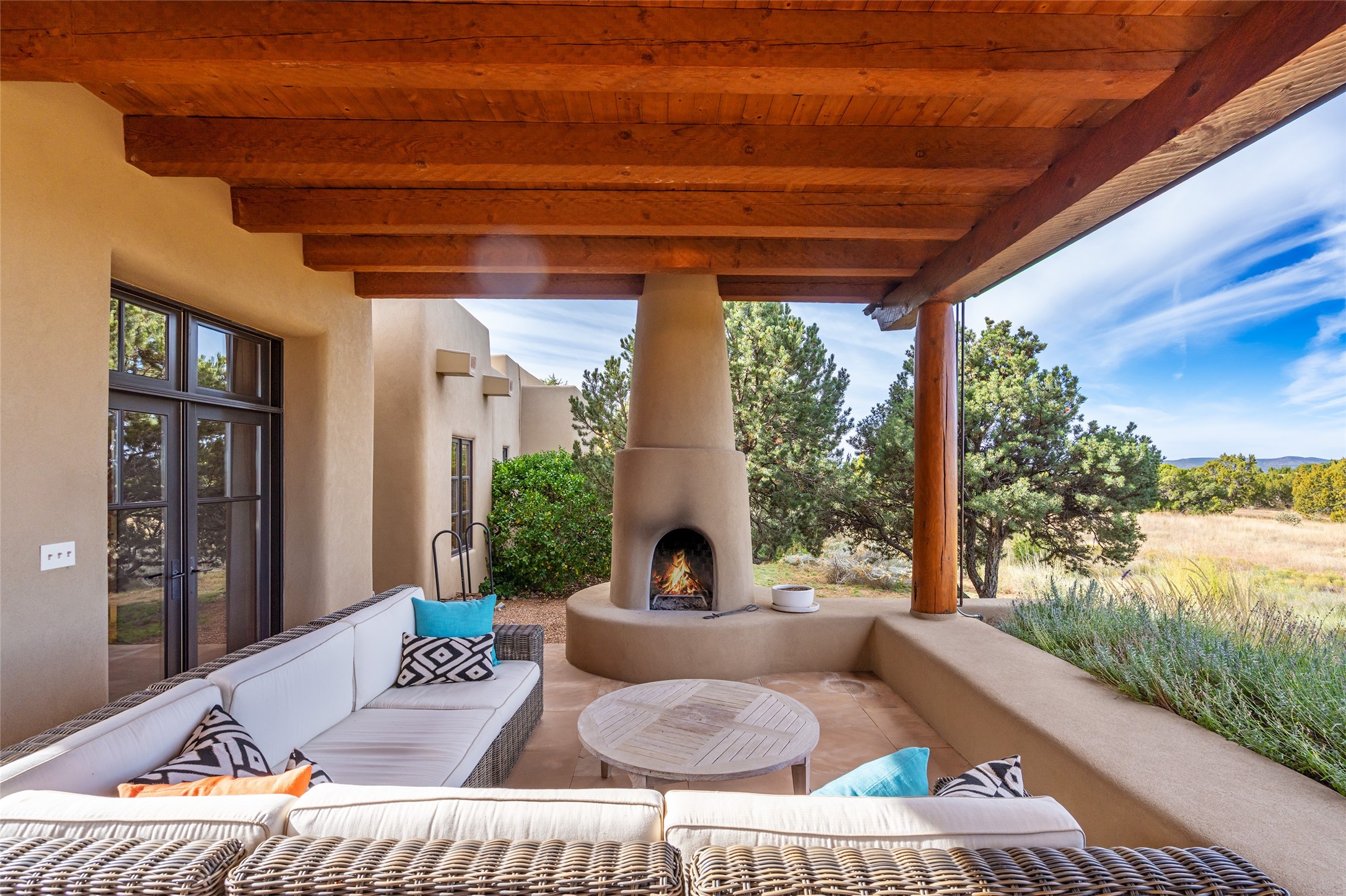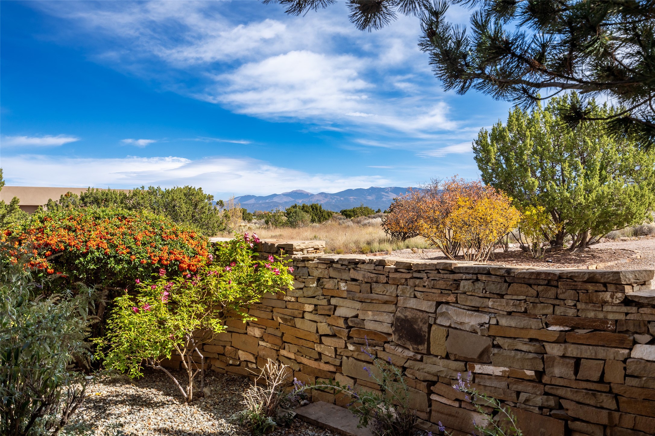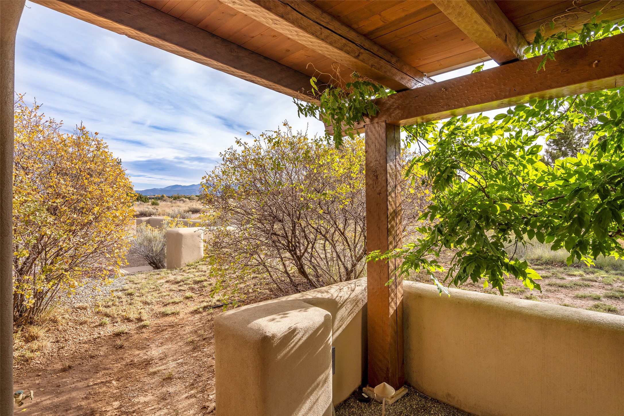 Overlooking the 5th hole of the Sunrise Course in coveted Las Campanas, this exceptional residence--with a beautifully appointed stand-alone guesthouse--was thoughtfully sited to embrace the sweeping views that define Santa Fe luxury living. Constructed of Pumice-Crete for enduring quality, the home blends authentic Pueblo architecture with a subtle Eastern influence, creating a timeless aesthetic marked by walls of windows framed in rich wood, graceful flagstone floors, and exquisite ceilings crafted with hand-hewn beams and refined woodwork. Every room feels anchored and intentional, capturing dramatic vistas while maintaining an intimate, welcoming warmth. The grand living room features tall beamed ceilings, a classic fireplace, and wood floors, setting the tone for effortless elegance. The adjacent family room off the well-appointed chef's kitchen offers another stunning vantage point to the Sangre de Cristo mountains--perfect for relaxed mornings or quiet evenings. The primary suite is a serene sanctuary, complete with its own private courtyard and inspiring views. Two additional spacious ensuite bedrooms and a dedicated office offer ideal flexibility in the main home. The separate guesthouse--with living room and full kitchen--provides exceptional comfort for long-term guests or multigenerational living. Outdoor living here is truly enchanting. A generous portal with fireplace and water feature creates a magical setting for gatherings, all while overlooking some of the finest golf course and mountain views in Santa Fe. Timeless in design and built with uncompromising materials, this remarkable offering stands as a rare haven in Las Campanas--beautiful, enduring, and genuinely unique. A full golf membership is being offered with the sale, and the property can be conveyed nearly turnkey.