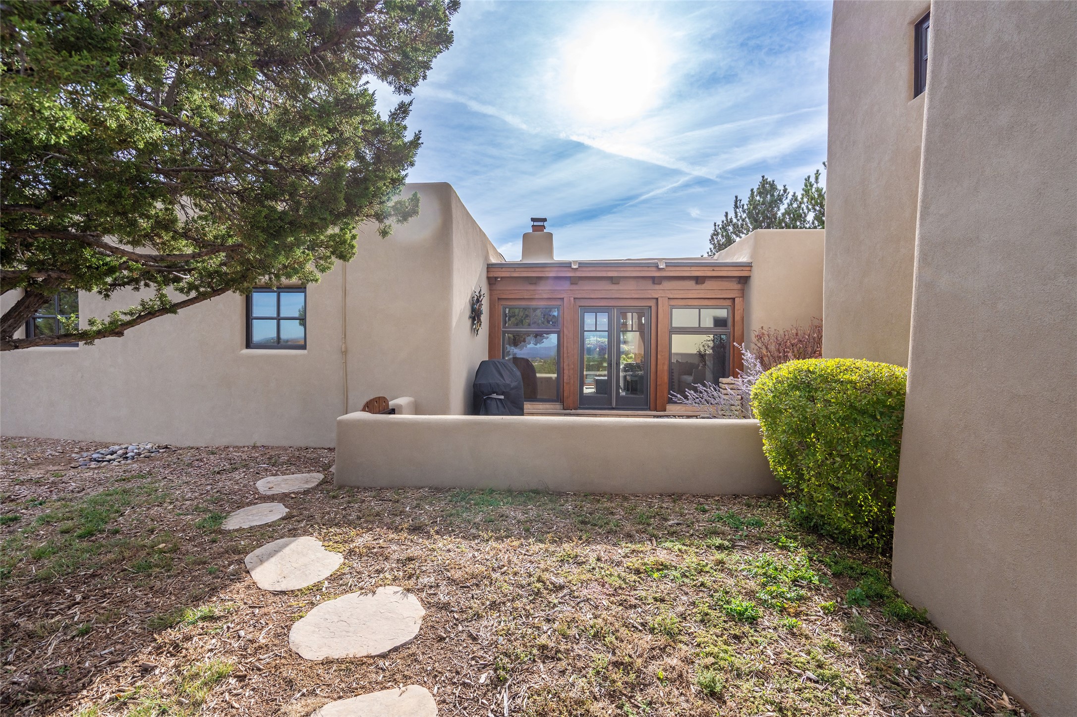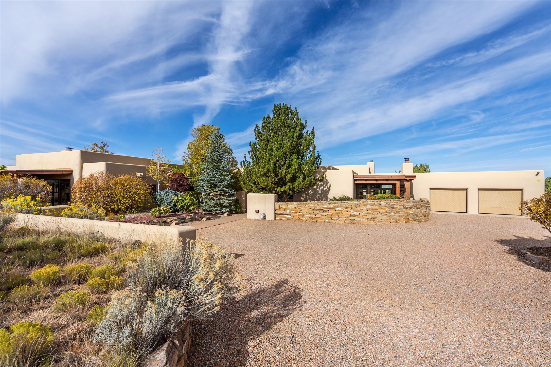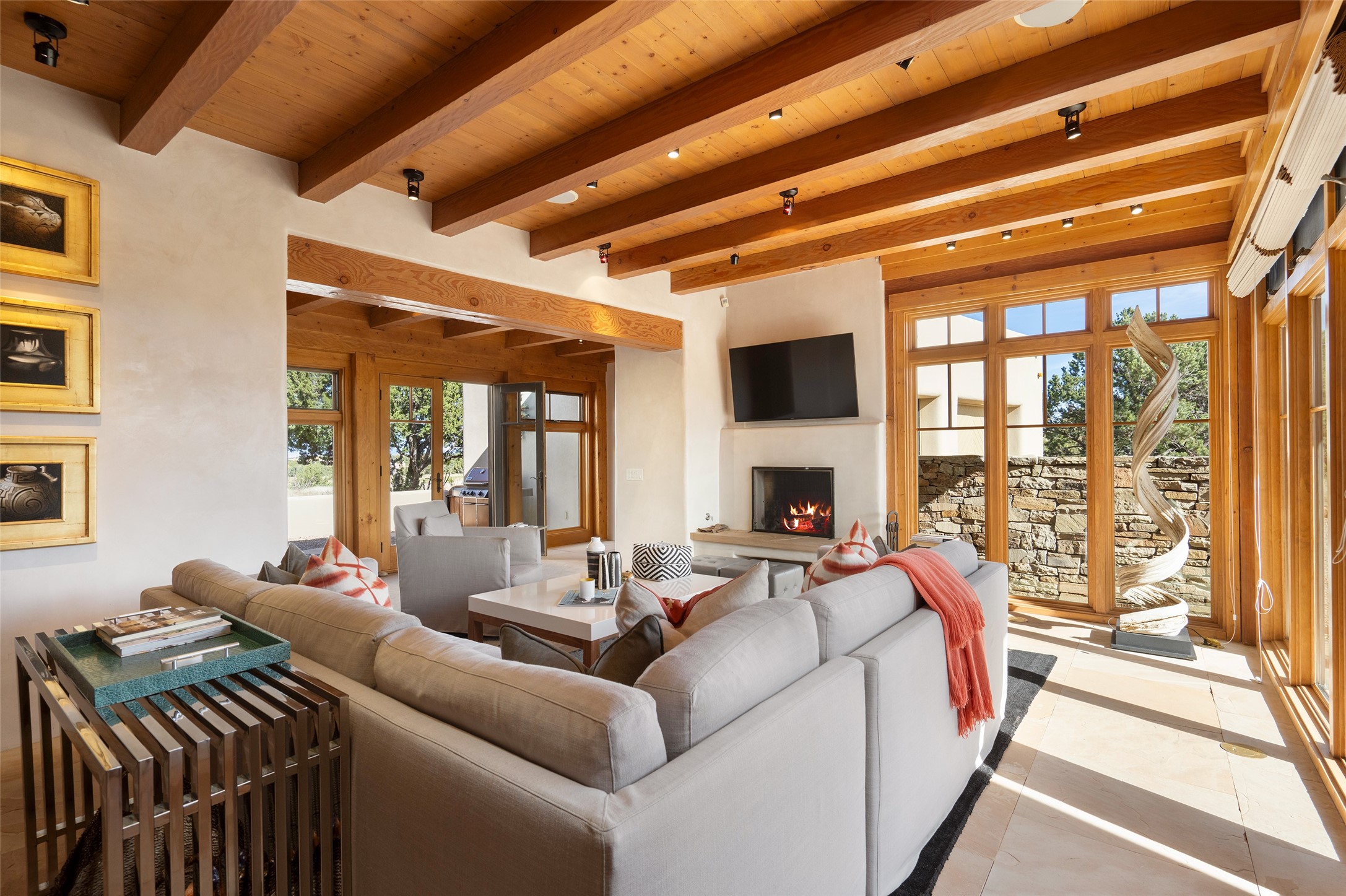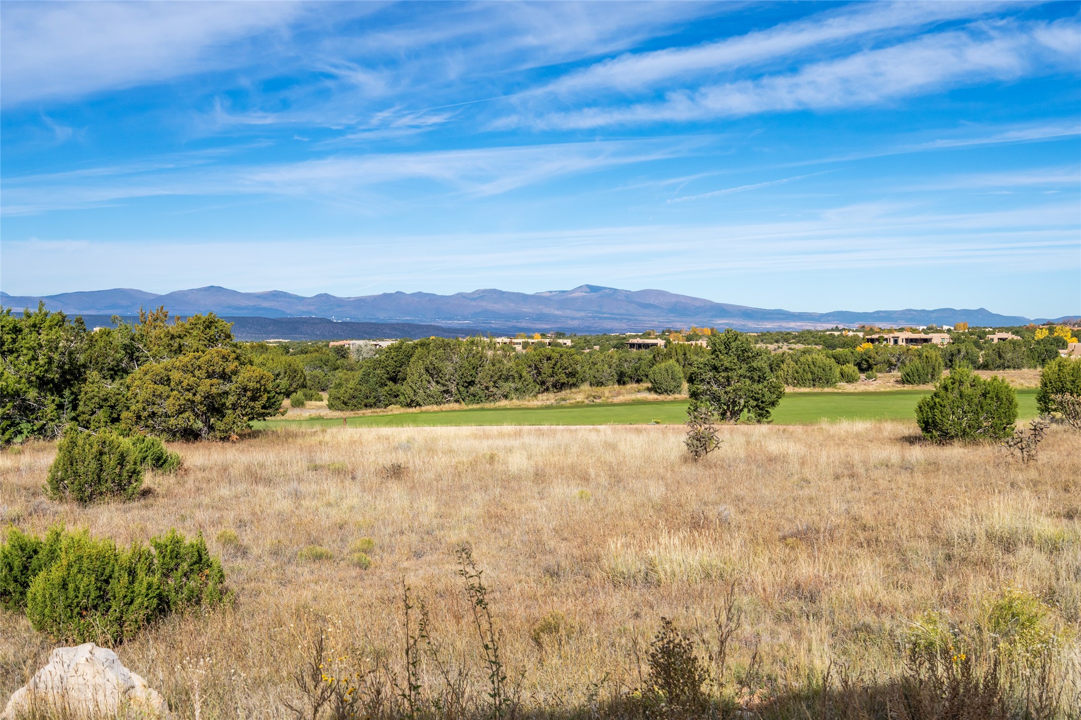 Overlooking the 5th hole of the Sunrise Course in coveted Las Campanas, this exceptional residence--with a beautifully appointed stand-alone guesthouse--was thoughtfully sited to embrace the sweeping views that define Santa Fe luxury living. Constructed of Pumice-Crete for enduring quality, the home blends authentic Pueblo architecture with a subtle Eastern influence, creating a timeless aesthetic marked by walls of windows framed in rich wood, graceful flagstone floors, and exquisite ceilings crafted with hand-hewn beams and refined woodwork. Every room feels anchored and intentional, capturing dramatic vistas while maintaining an intimate, welcoming warmth. The grand living room features tall beamed ceilings, a classic fireplace, and wood floors, setting the tone for effortless elegance. The adjacent family room off the well-appointed chef's kitchen offers another stunning vantage point to the Sangre de Cristo mountains--perfect for relaxed mornings or quiet evenings. The primary suite is a serene sanctuary, complete with its own private courtyard and inspiring views. Two additional spacious ensuite bedrooms and a dedicated office offer ideal flexibility in the main home. The separate guesthouse--with living room and full kitchen--provides exceptional comfort for long-term guests or multigenerational living. Outdoor living here is truly enchanting. A generous portal with fireplace and water feature creates a magical setting for gatherings, all while overlooking some of the finest golf course and mountain views in Santa Fe. Timeless in design and built with uncompromising materials, this remarkable offering stands as a rare haven in Las Campanas--beautiful, enduring, and genuinely unique. A full golf membership is being offered with the sale, and the property can be conveyed nearly turnkey.