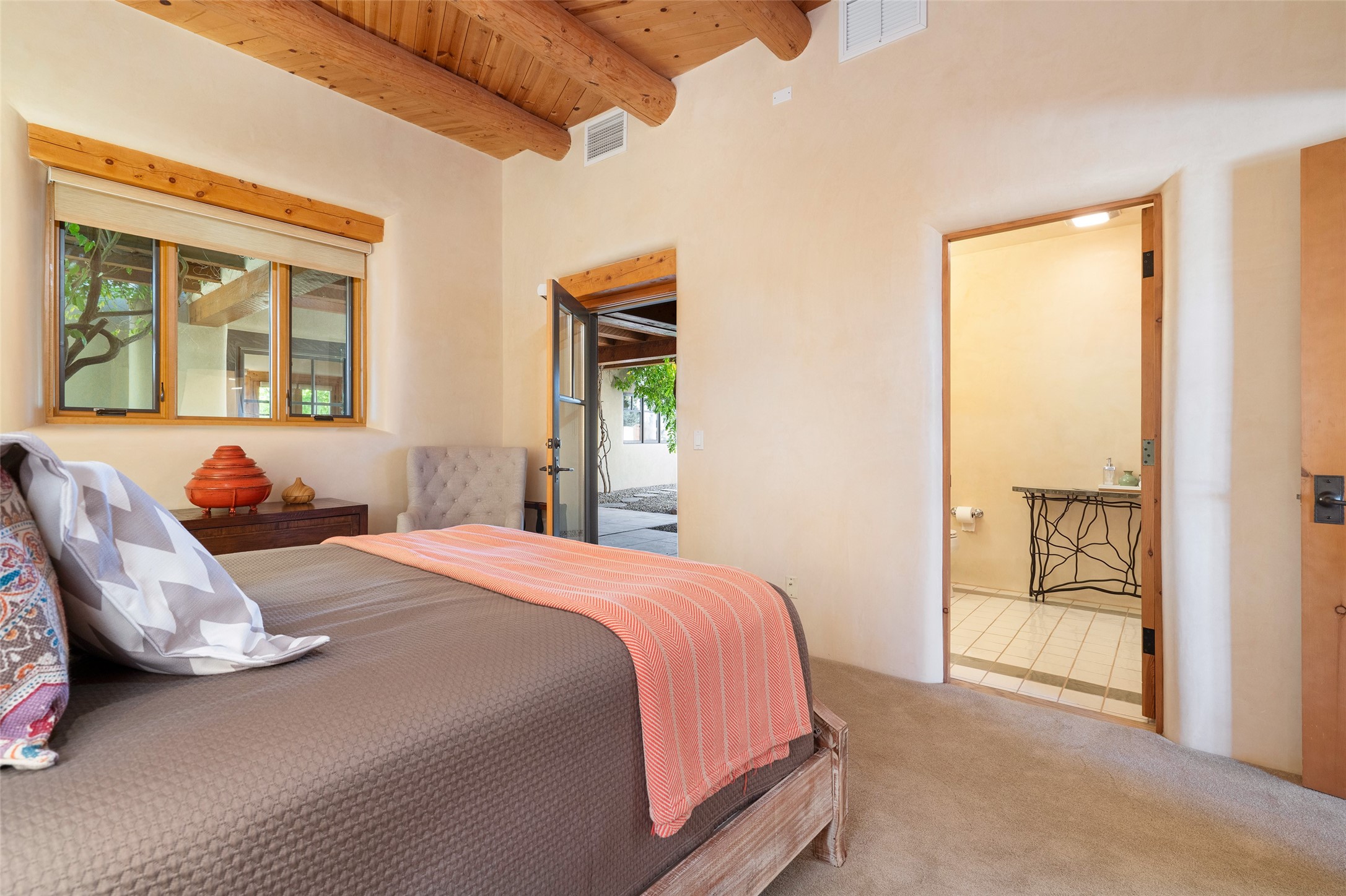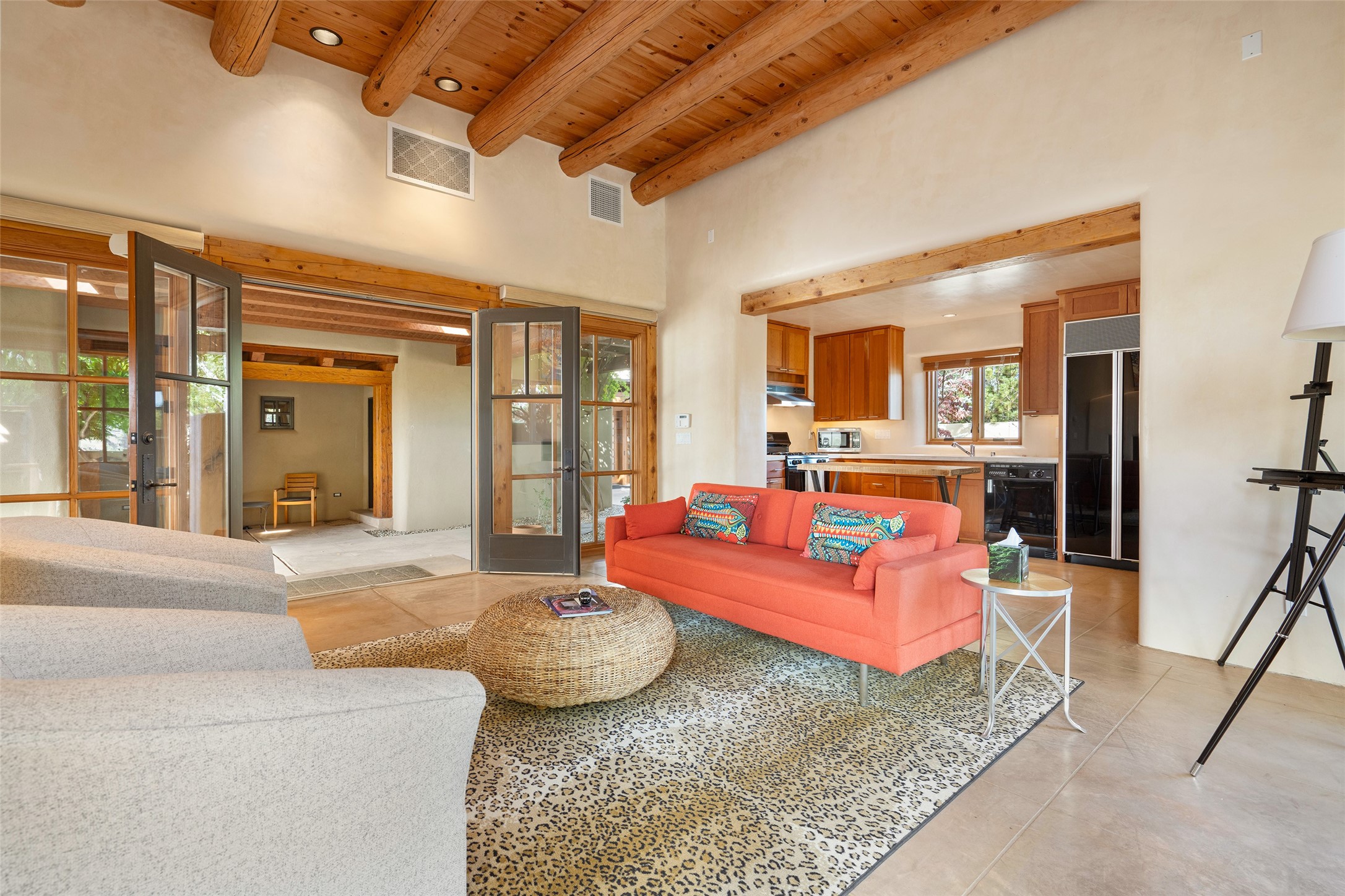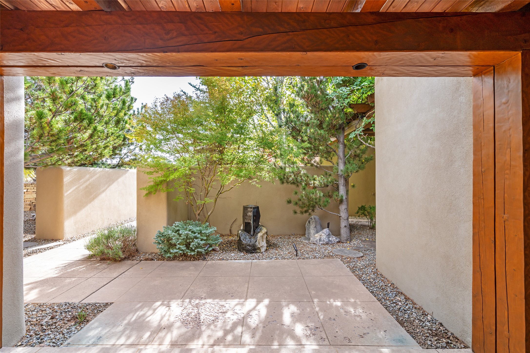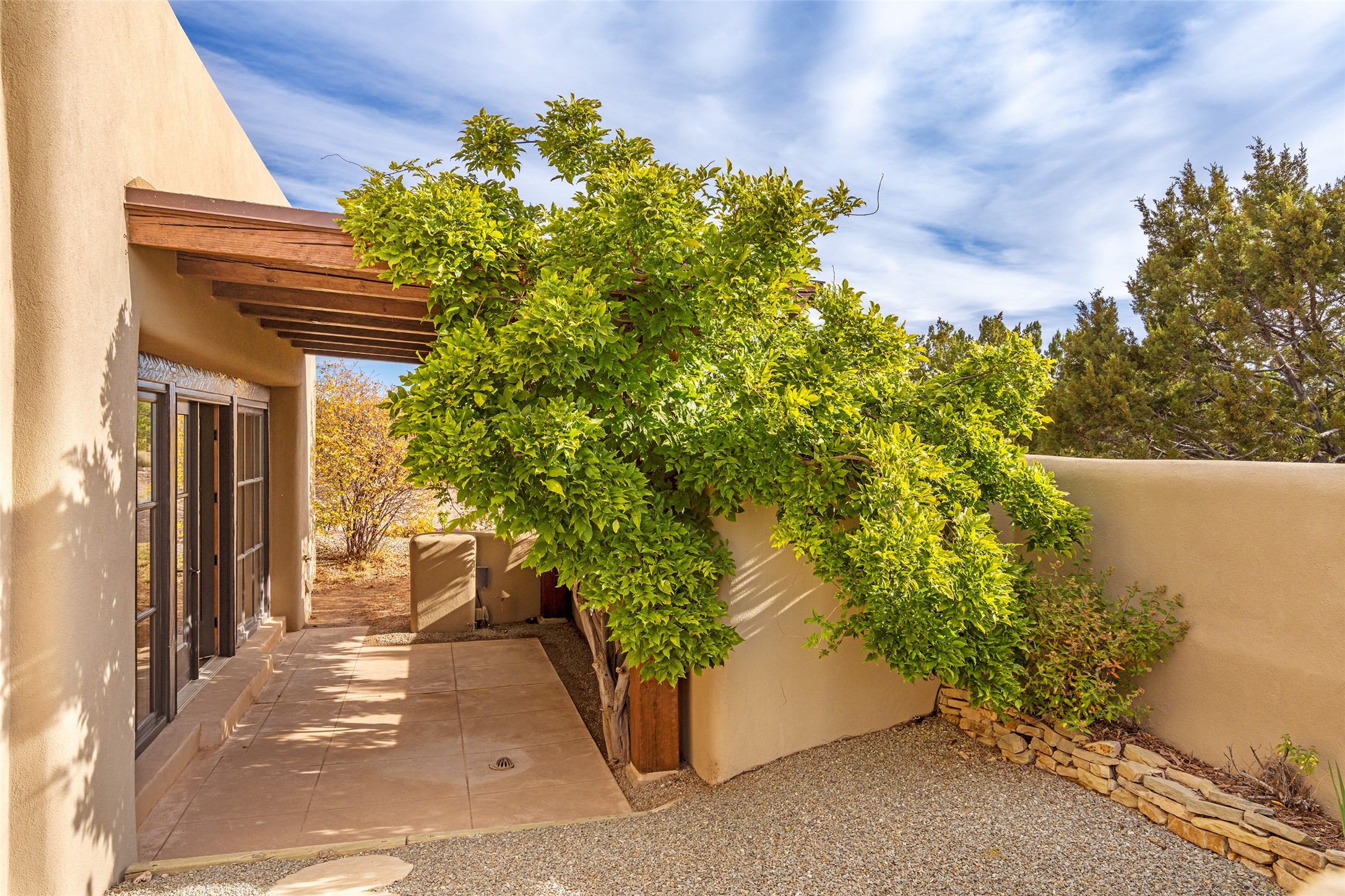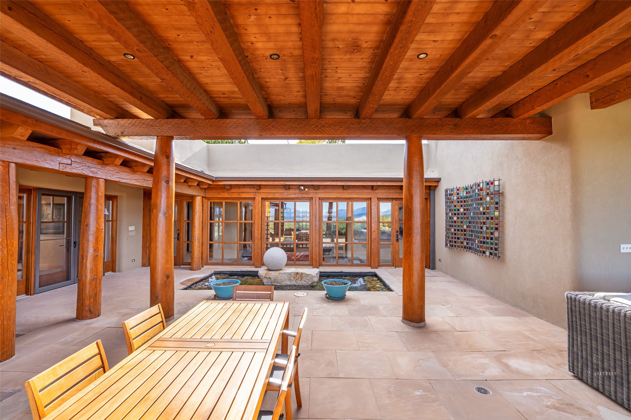 Overlooking the 5th hole of the Sunrise Course in coveted Las Campanas, this exceptional residence--with a beautifully appointed stand-alone guesthouse--was thoughtfully sited to embrace the sweeping views that define Santa Fe luxury living. Constructed of Pumice-Crete for enduring quality, the home blends authentic Pueblo architecture with a subtle Eastern influence, creating a timeless aesthetic marked by walls of windows framed in rich wood, graceful flagstone floors, and exquisite ceilings crafted with hand-hewn beams and refined woodwork. Every room feels anchored and intentional, capturing dramatic vistas while maintaining an intimate, welcoming warmth. The grand living room features tall beamed ceilings, a classic fireplace, and wood floors, setting the tone for effortless elegance. The adjacent family room off the well-appointed chef's kitchen offers another stunning vantage point to the Sangre de Cristo mountains--perfect for relaxed mornings or quiet evenings. The primary suite is a serene sanctuary, complete with its own private courtyard and inspiring views. Two additional spacious ensuite bedrooms and a dedicated office offer ideal flexibility in the main home. The separate guesthouse--with living room and full kitchen--provides exceptional comfort for long-term guests or multigenerational living. Outdoor living here is truly enchanting. A generous portal with fireplace and water feature creates a magical setting for gatherings, all while overlooking some of the finest golf course and mountain views in Santa Fe. Timeless in design and built with uncompromising materials, this remarkable offering stands as a rare haven in Las Campanas--beautiful, enduring, and genuinely unique. A full golf membership is being offered with the sale, and the property can be conveyed nearly turnkey.