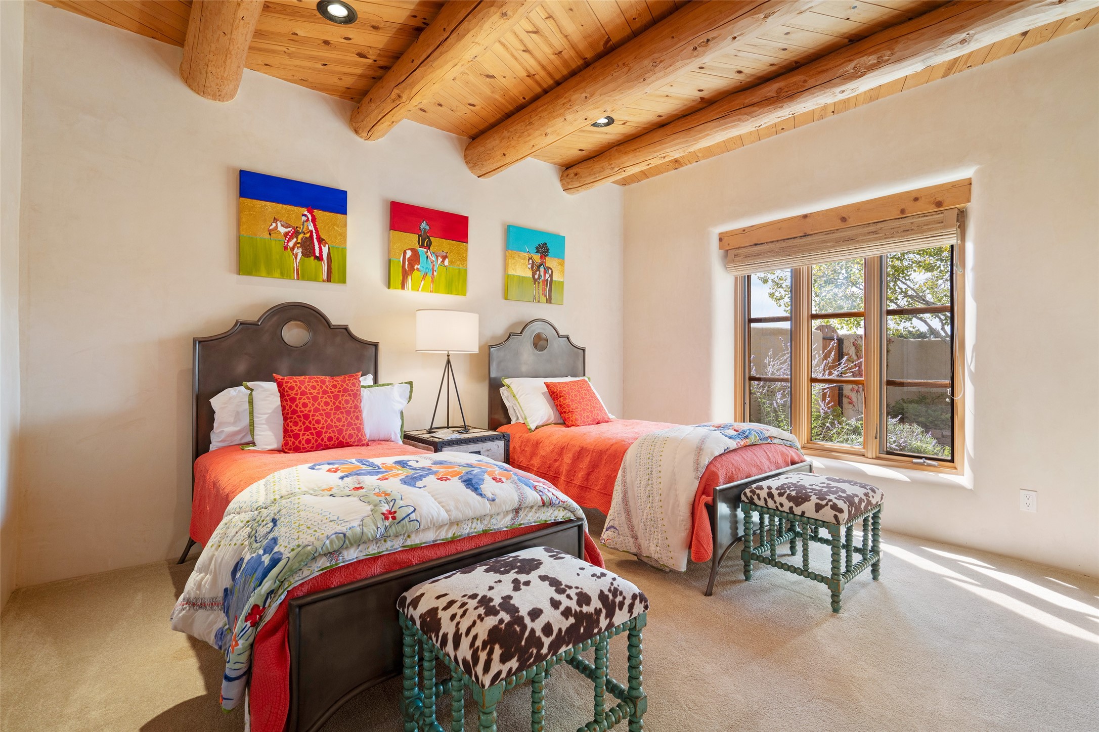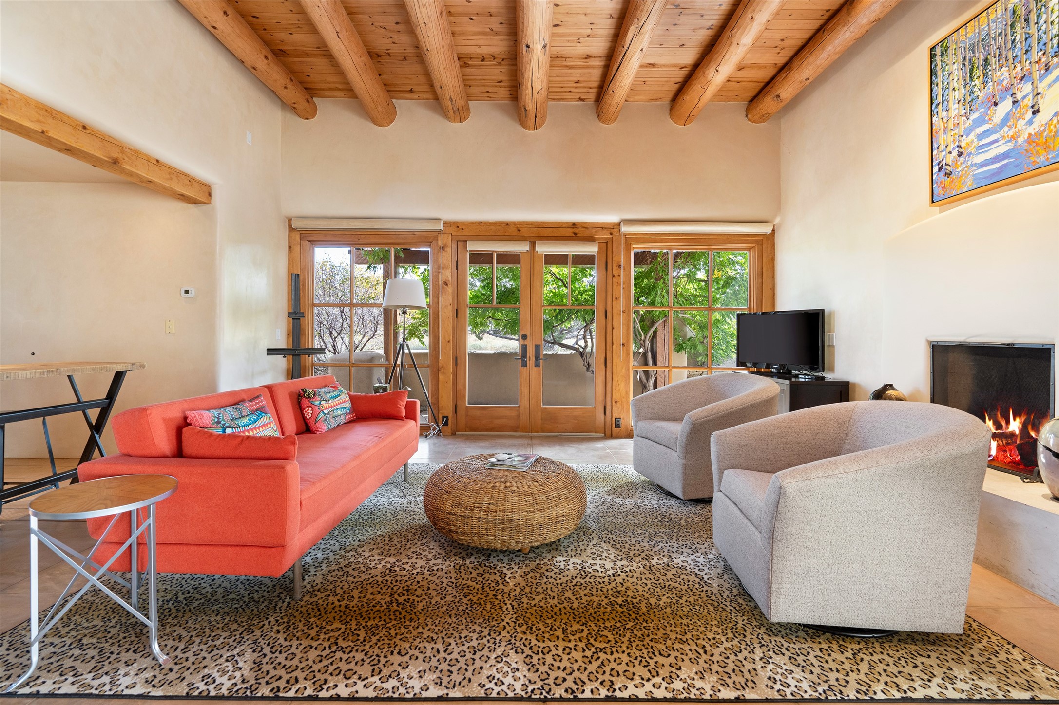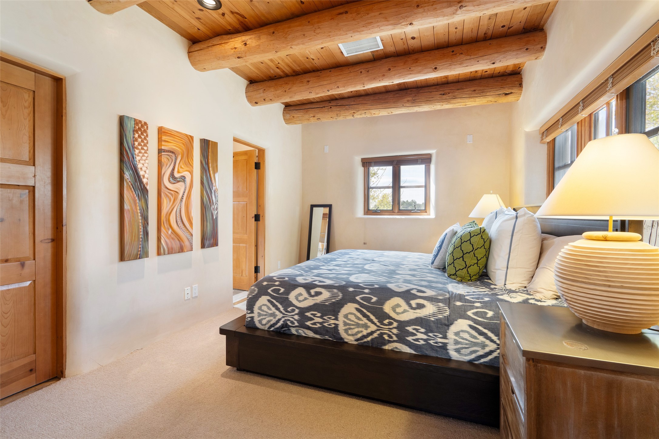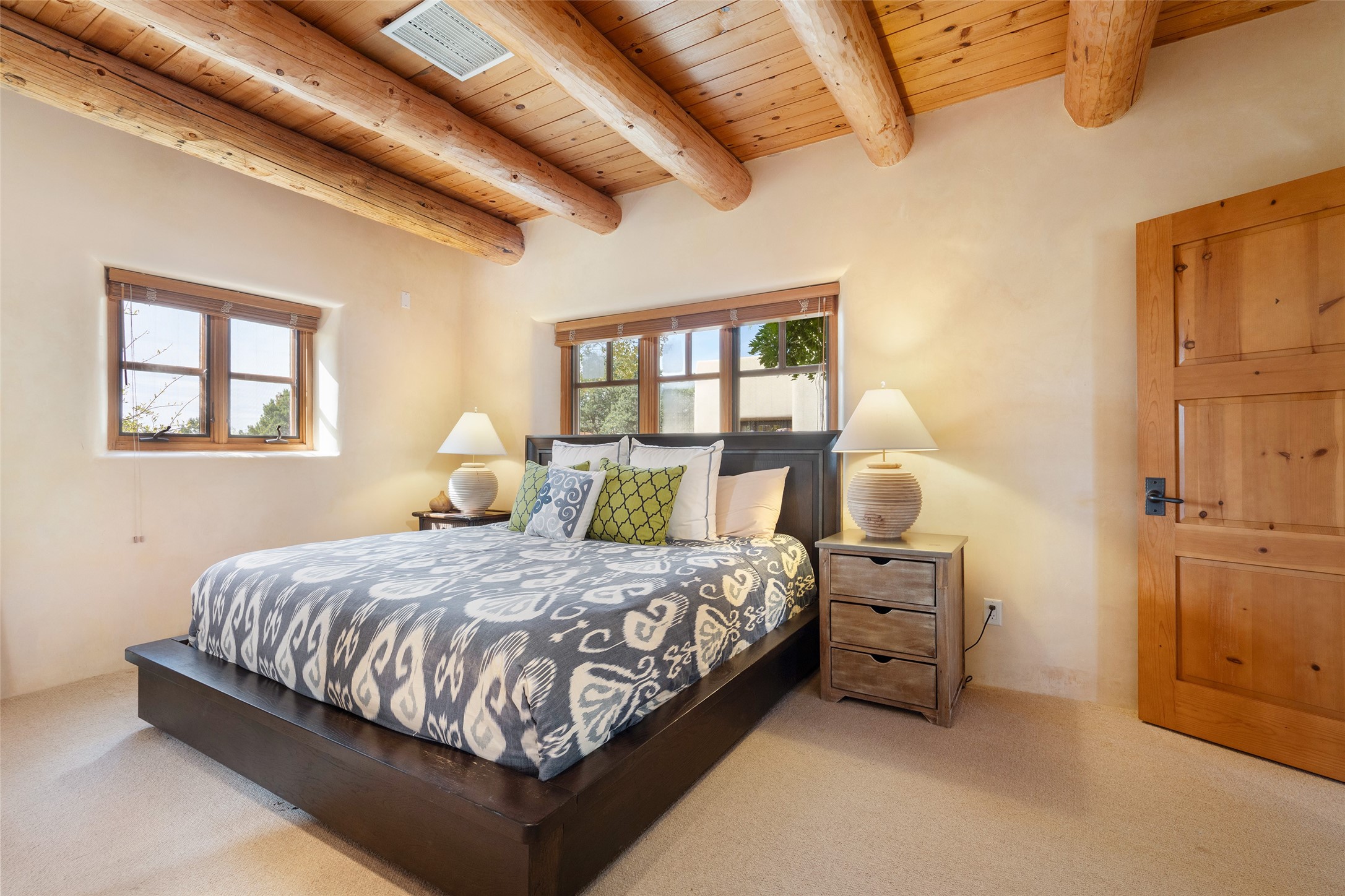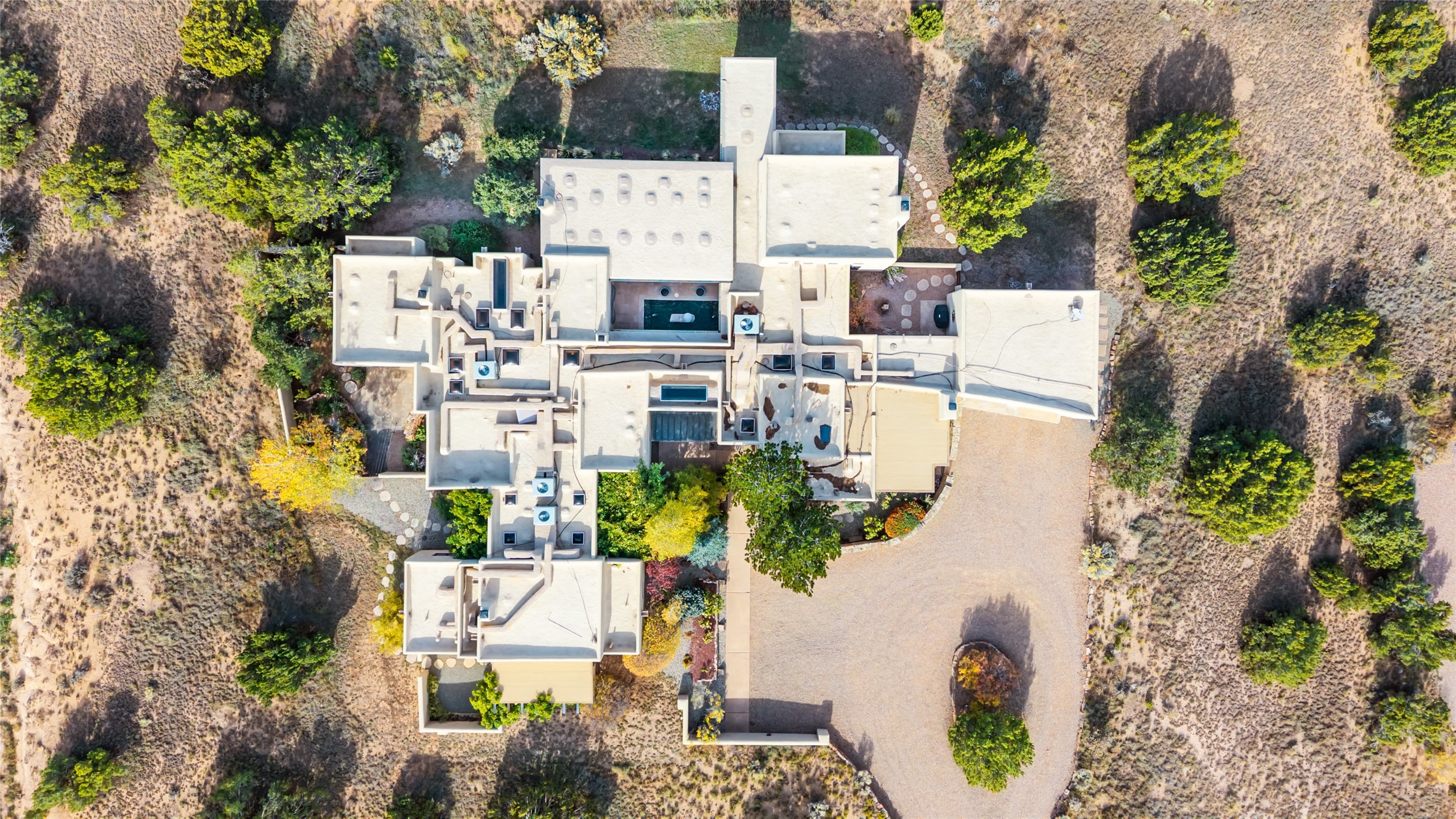 Overlooking the 5th hole of the Sunrise Course in coveted Las Campanas, this exceptional residence--with a beautifully appointed stand-alone guesthouse--was thoughtfully sited to embrace the sweeping views that define Santa Fe luxury living. Constructed of Pumice-Crete for enduring quality, the home blends authentic Pueblo architecture with a subtle Eastern influence, creating a timeless aesthetic marked by walls of windows framed in rich wood, graceful flagstone floors, and exquisite ceilings crafted with hand-hewn beams and refined woodwork. Every room feels anchored and intentional, capturing dramatic vistas while maintaining an intimate, welcoming warmth. The grand living room features tall beamed ceilings, a classic fireplace, and wood floors, setting the tone for effortless elegance. The adjacent family room off the well-appointed chef's kitchen offers another stunning vantage point to the Sangre de Cristo mountains--perfect for relaxed mornings or quiet evenings. The primary suite is a serene sanctuary, complete with its own private courtyard and inspiring views. Two additional spacious ensuite bedrooms and a dedicated office offer ideal flexibility in the main home. The separate guesthouse--with living room and full kitchen--provides exceptional comfort for long-term guests or multigenerational living. Outdoor living here is truly enchanting. A generous portal with fireplace and water feature creates a magical setting for gatherings, all while overlooking some of the finest golf course and mountain views in Santa Fe. Timeless in design and built with uncompromising materials, this remarkable offering stands as a rare haven in Las Campanas--beautiful, enduring, and genuinely unique. A full golf membership is being offered with the sale, and the property can be conveyed nearly turnkey.