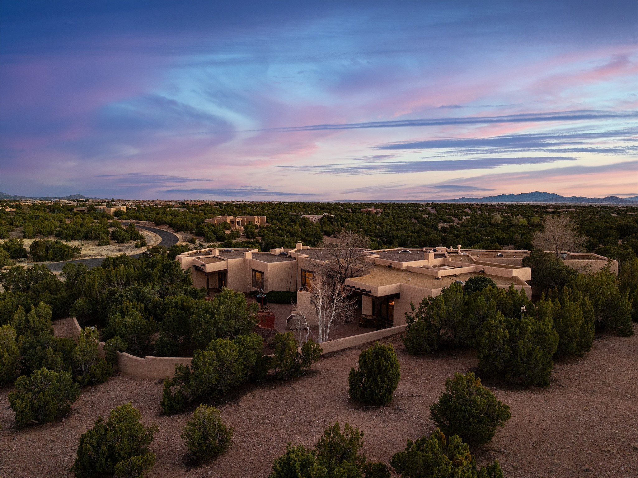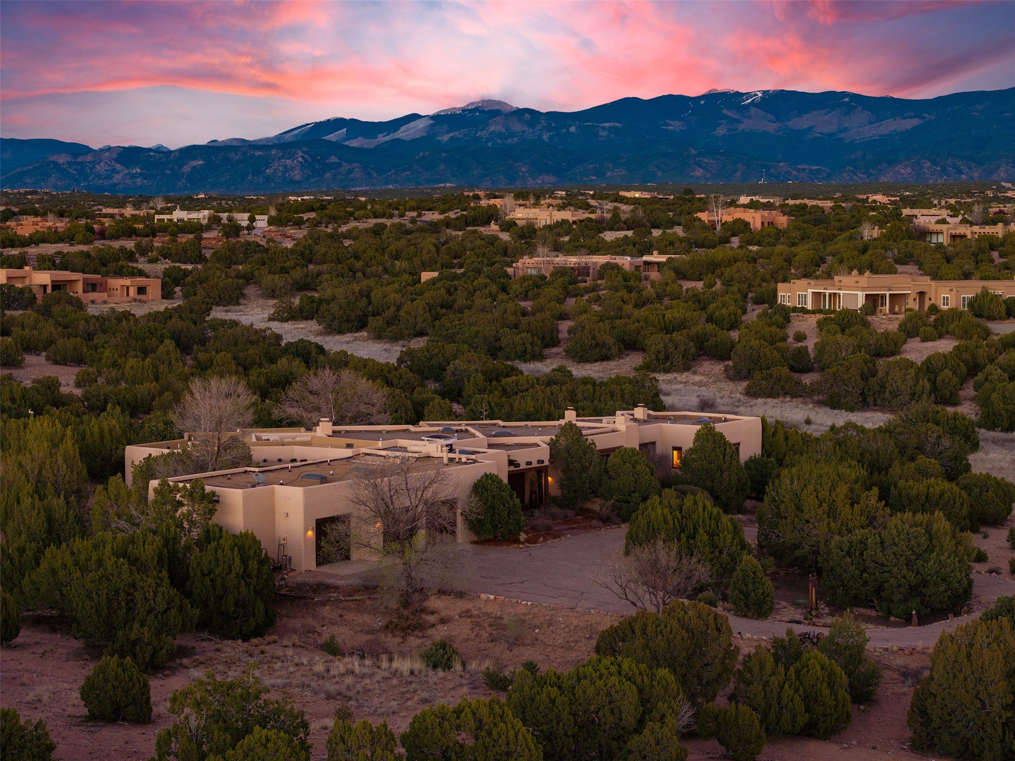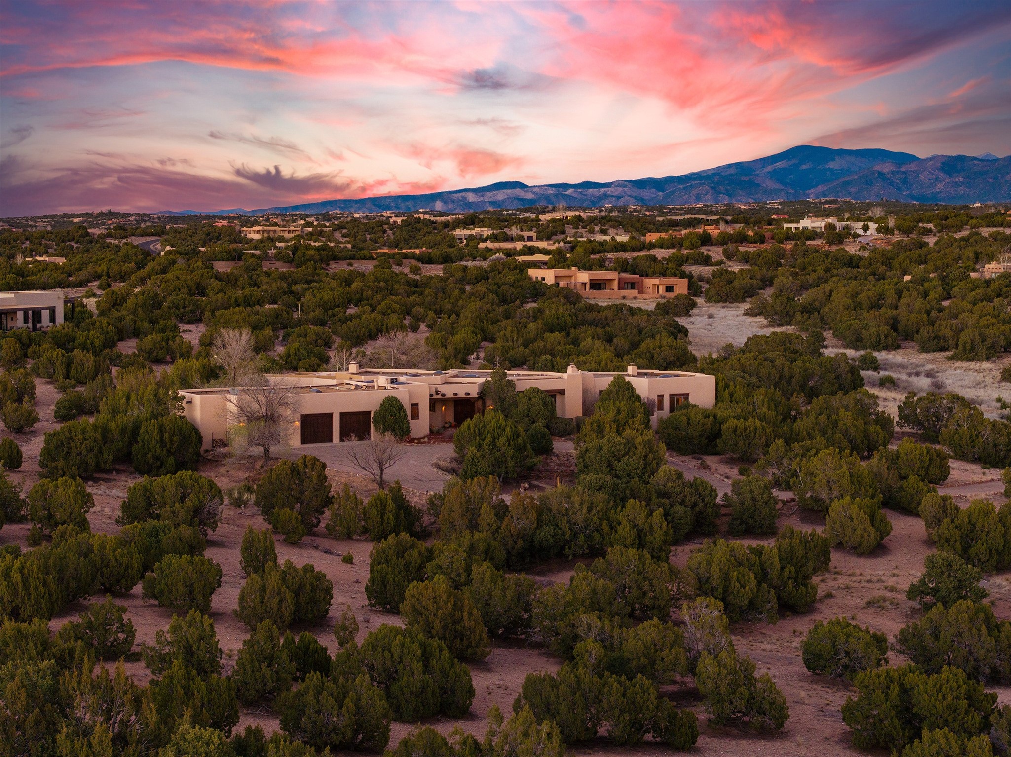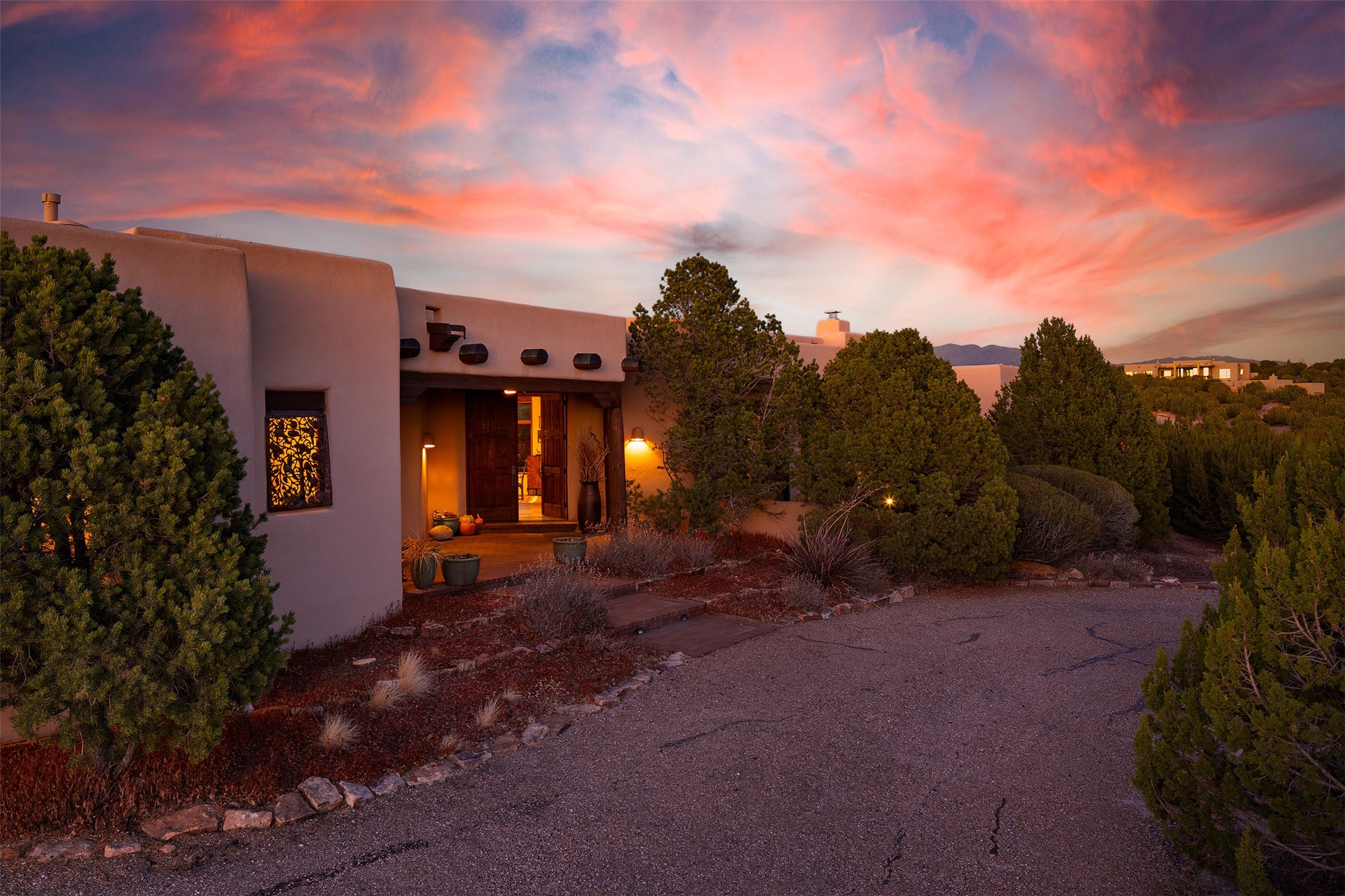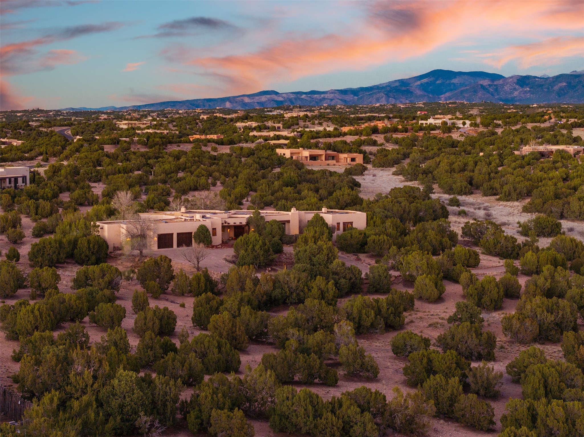 Las Campanas- Beautiful Classic Santa Fe Style on an elevated homesite with Sangre de Cristo & Sandia mountain views! Plenty of room in the developable area to add a casita with easy access from the circle driveway. Approximately 4235 sq ft & an oversized 3 car garage w/ a lot of extra storage. Throughout the home find beautiful hard plastered walls, traditional treatments with vigas, latillas, & coved ceilings, wood & travertine stone floors. Primary suite with an exquisite bath w/ timeless Talivera Tile, 2 water closets, 2 vanities, a large tub and separate shower and 2 walk-in closets. Guest bedrooms are spacious, en-suite, all with doors to the outside courtyards. Handsome office with Kiva FP & built-in bookshelves. Expansive Great Room with a large fireplace and dining area, awash in natural light, flowing to the inviting kitchen w/ bar area & connected family room w/ FP & French doors opening to the back portal-sure to become one of your favorite spots-with Sangre mountain views & outdoor fireplace. Radiant in-floor heat & central forced air AC. This home has a prime location in Estate 2- close to the Santa Fe Plaza & shopping. Membership to the Club at Las Campanas is optional, it is an additional investment, by invitation, & handled through The Club. Amenities are numerous & World Class. Come see this blend of privacy, grace, and beauty! 24hr security & paramedics. Look at video!