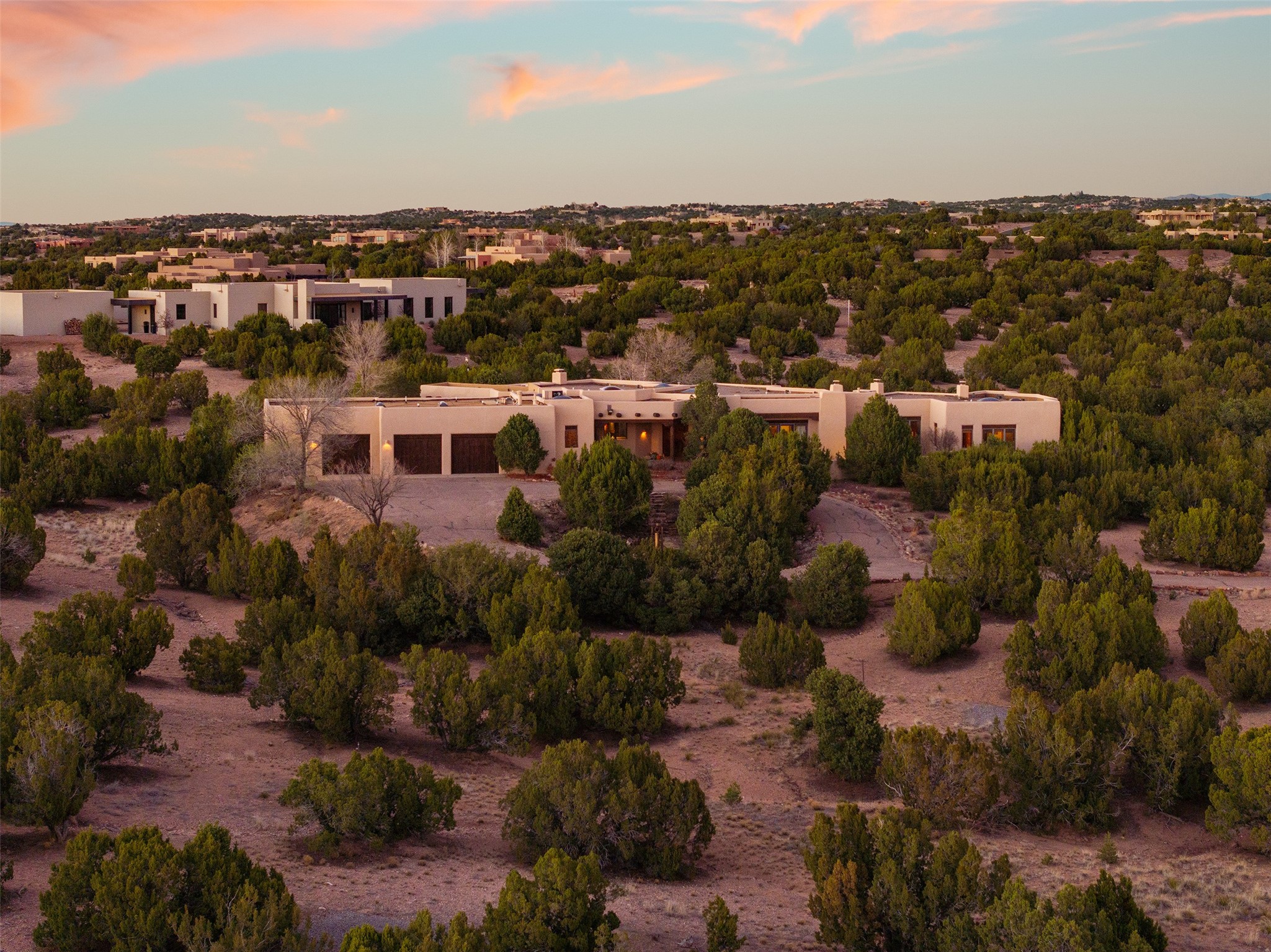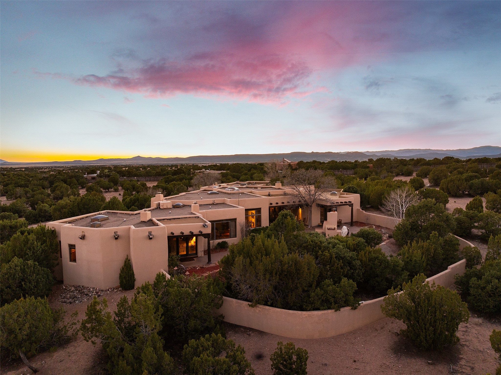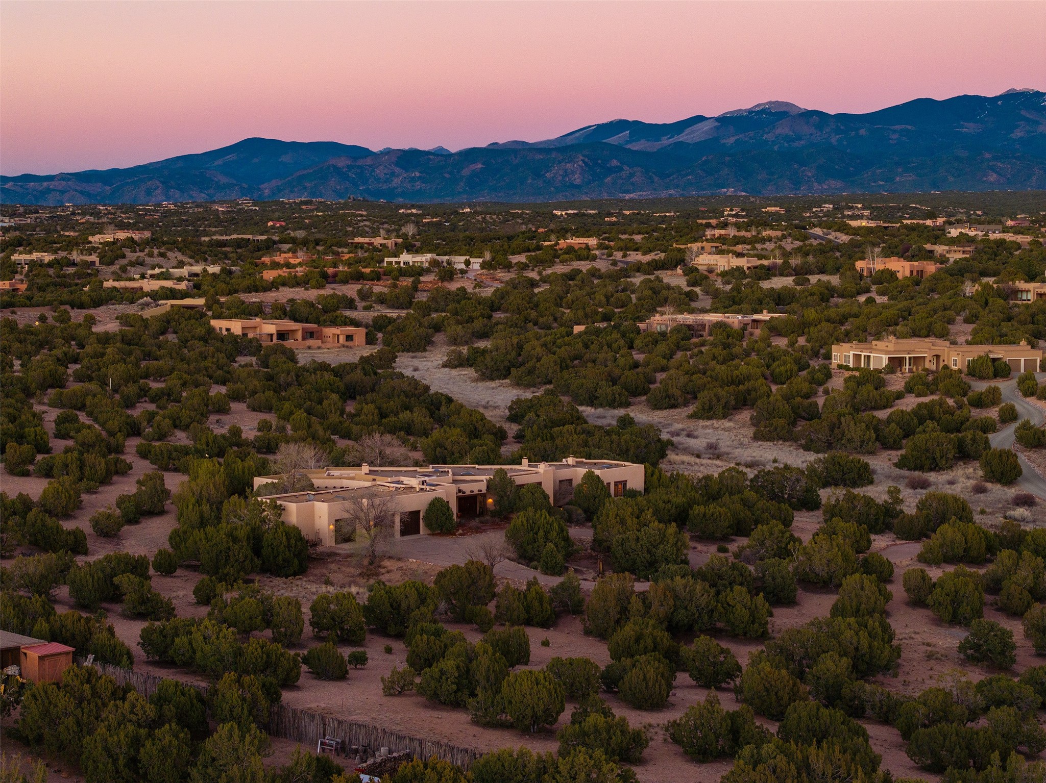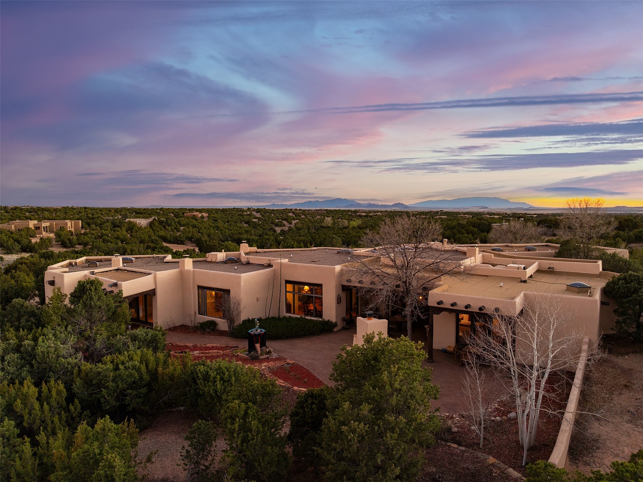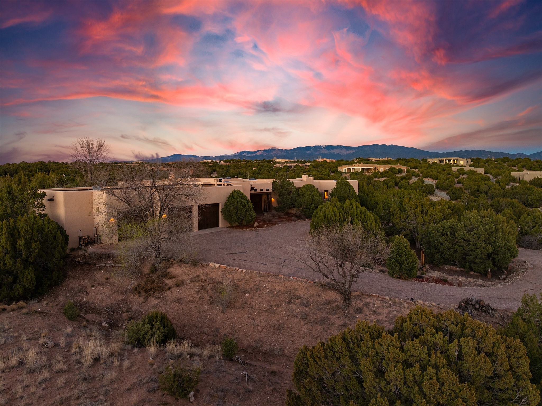 Las Campanas- Beautiful Classic Santa Fe Style on an elevated homesite with Sangre de Cristo & Sandia mountain views! Plenty of room in the developable area to add a casita with easy access from the circle driveway. Approximately 4235 sq ft & an oversized 3 car garage w/ a lot of extra storage. Throughout the home find beautiful hard plastered walls, traditional treatments with vigas, latillas, & coved ceilings, wood & travertine stone floors. Primary suite with an exquisite bath w/ timeless Talivera Tile, 2 water closets, 2 vanities, a large tub and separate shower and 2 walk-in closets. Guest bedrooms are spacious, en-suite, all with doors to the outside courtyards. Handsome office with Kiva FP & built-in bookshelves. Expansive Great Room with a large fireplace and dining area, awash in natural light, flowing to the inviting kitchen w/ bar area & connected family room w/ FP & French doors opening to the back portal-sure to become one of your favorite spots-with Sangre mountain views & outdoor fireplace. Radiant in-floor heat & central forced air AC. This home has a prime location in Estate 2- close to the Santa Fe Plaza & shopping. Membership to the Club at Las Campanas is optional, it is an additional investment, by invitation, & handled through The Club. Amenities are numerous & World Class. Come see this blend of privacy, grace, and beauty! 24hr security & paramedics. Look at video!