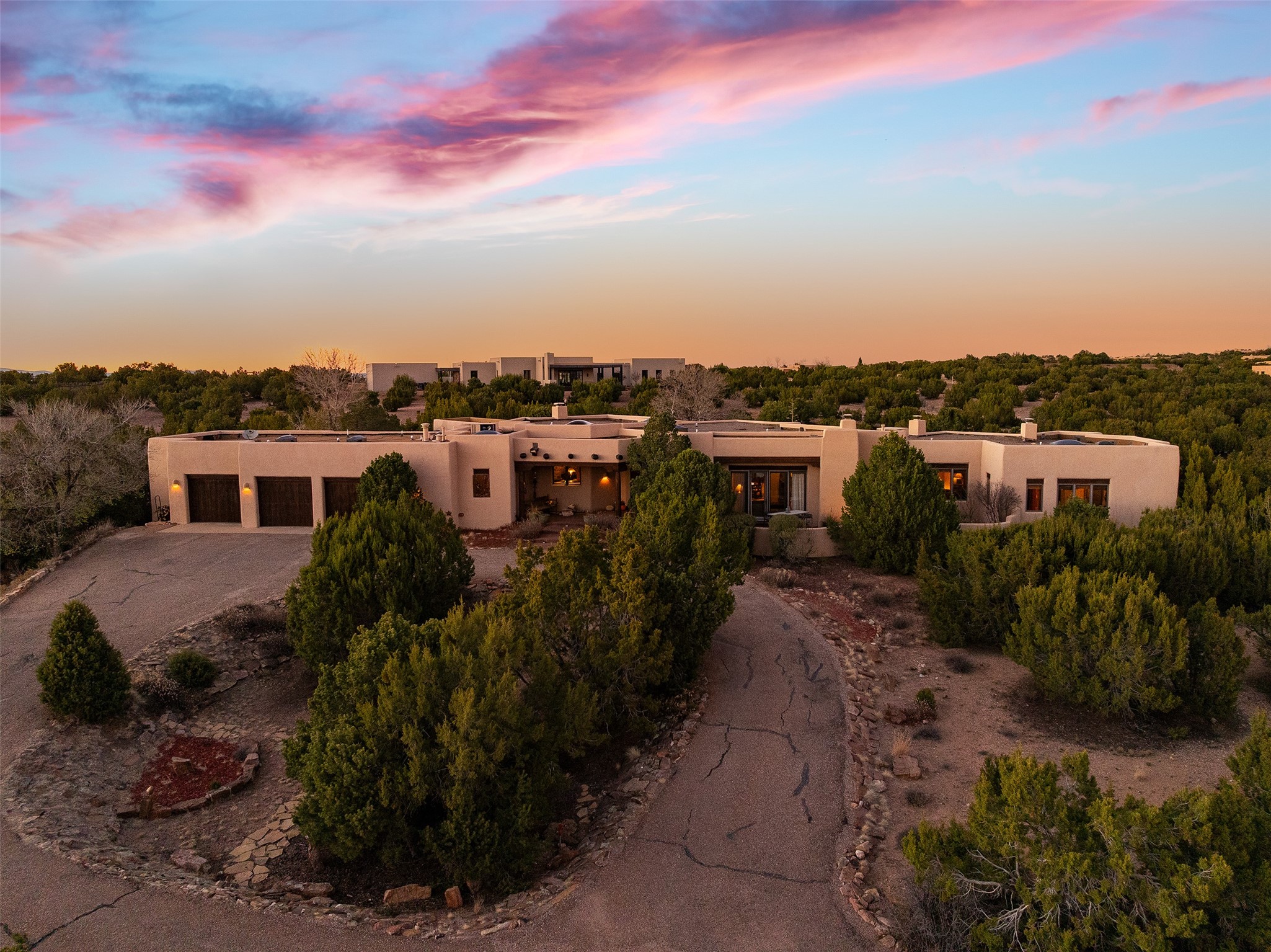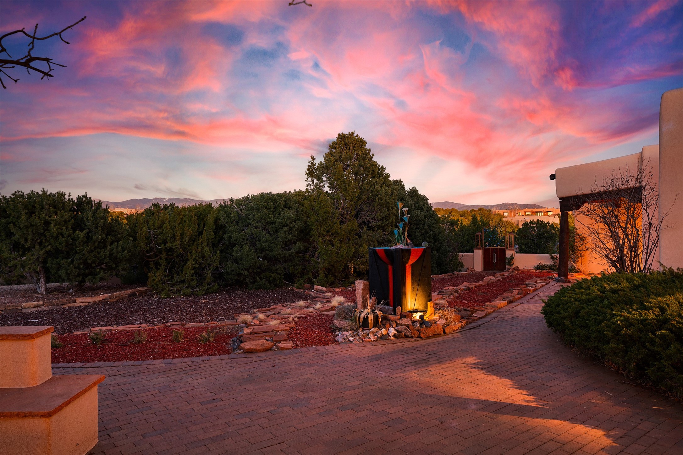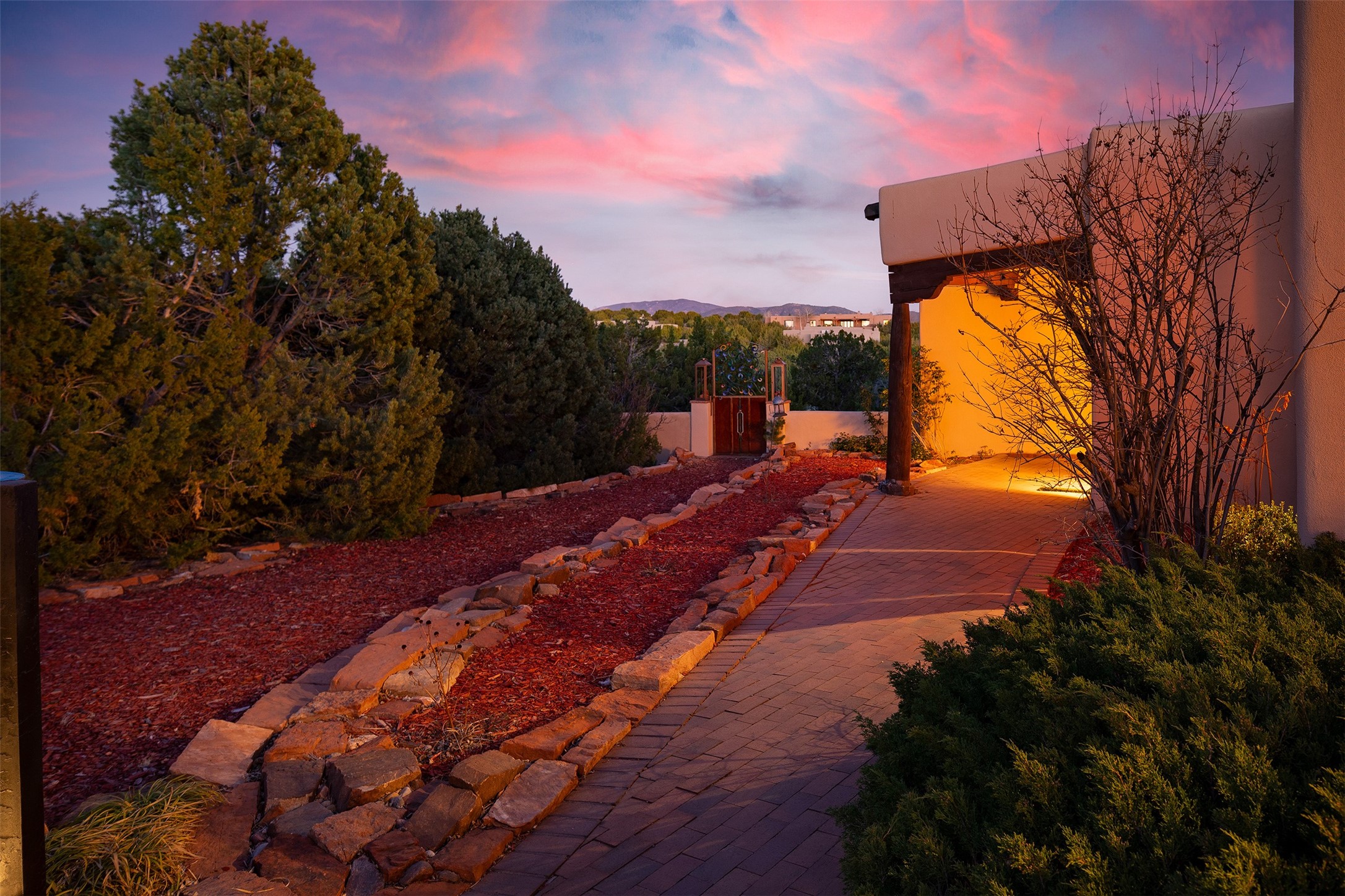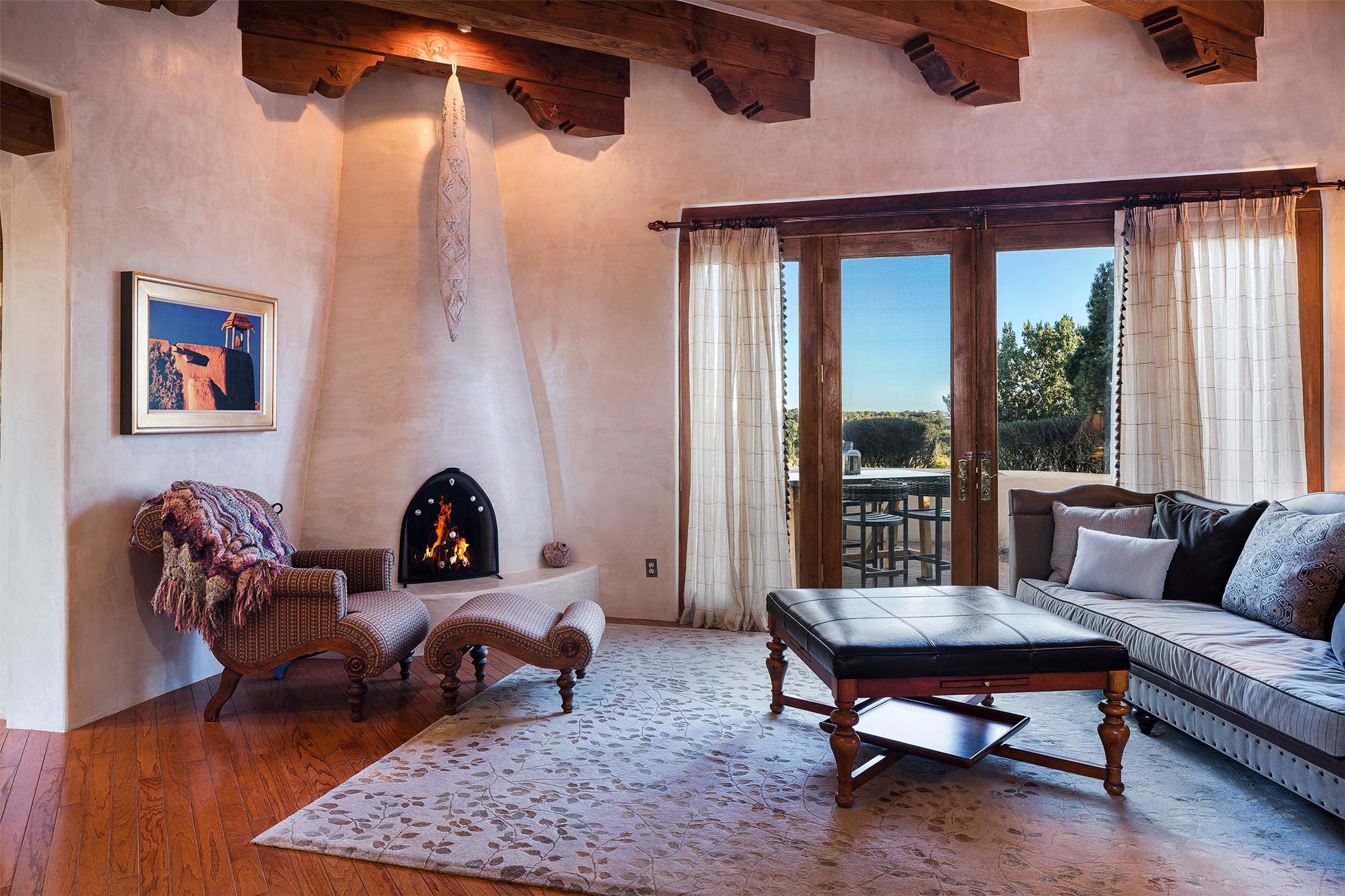 Las Campanas- Beautiful Classic Santa Fe Style on an elevated homesite with Sangre de Cristo & Sandia mountain views! Plenty of room in the developable area to add a casita with easy access from the circle driveway. Approximately 4235 sq ft & an oversized 3 car garage w/ a lot of extra storage. Throughout the home find beautiful hard plastered walls, traditional treatments with vigas, latillas, & coved ceilings, wood & travertine stone floors. Primary suite with an exquisite bath w/ timeless Talivera Tile, 2 water closets, 2 vanities, a large tub and separate shower and 2 walk-in closets. Guest bedrooms are spacious, en-suite, all with doors to the outside courtyards. Handsome office with Kiva FP & built-in bookshelves. Expansive Great Room with a large fireplace and dining area, awash in natural light, flowing to the inviting kitchen w/ bar area & connected family room w/ FP & French doors opening to the back portal-sure to become one of your favorite spots-with Sangre mountain views & outdoor fireplace. Radiant in-floor heat & central forced air AC. This home has a prime location in Estate 2- close to the Santa Fe Plaza & shopping. Membership to the Club at Las Campanas is optional, it is an additional investment, by invitation, & handled through The Club. Amenities are numerous & World Class. Come see this blend of privacy, grace, and beauty! 24hr security & paramedics. Look at video!