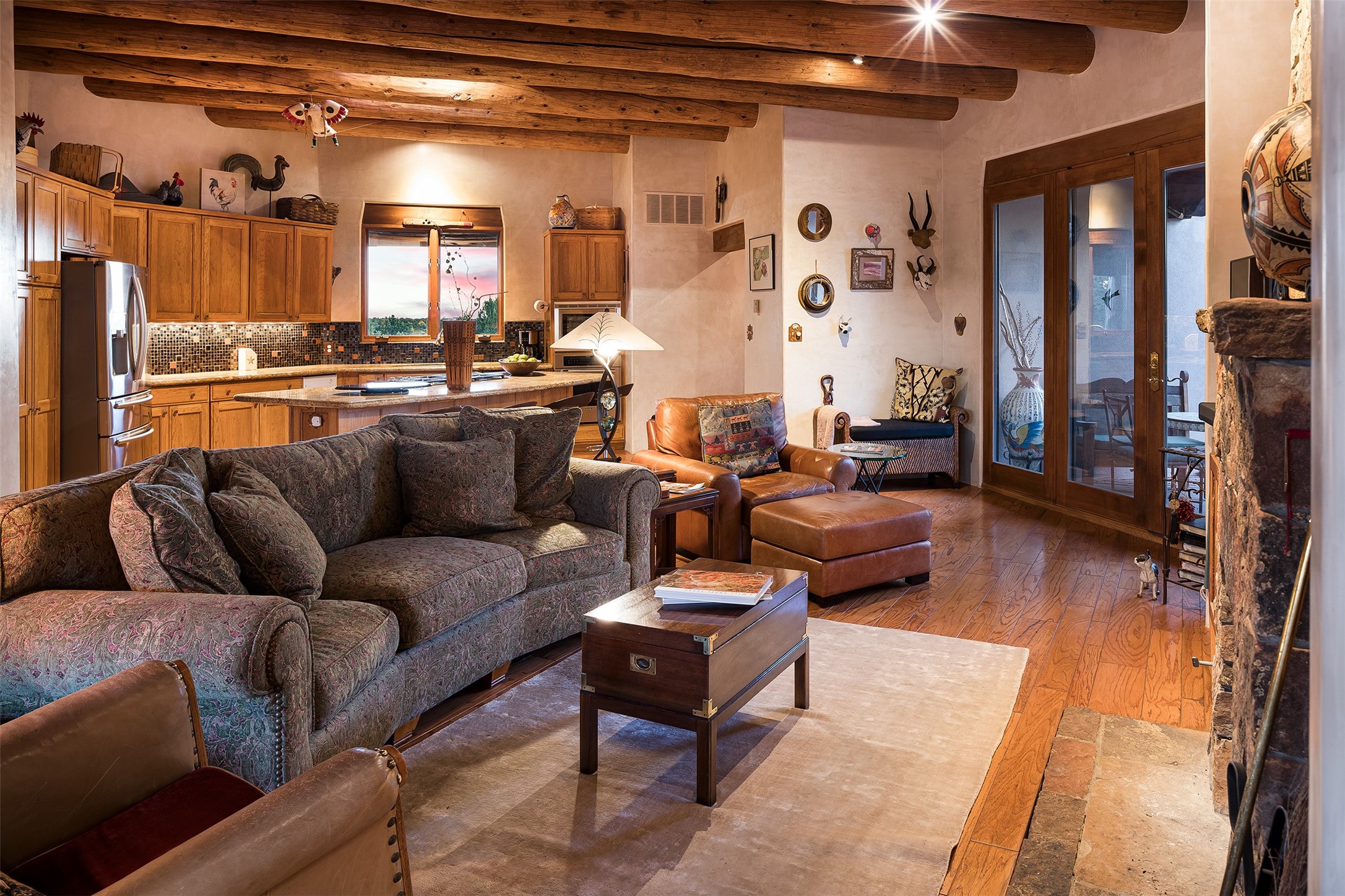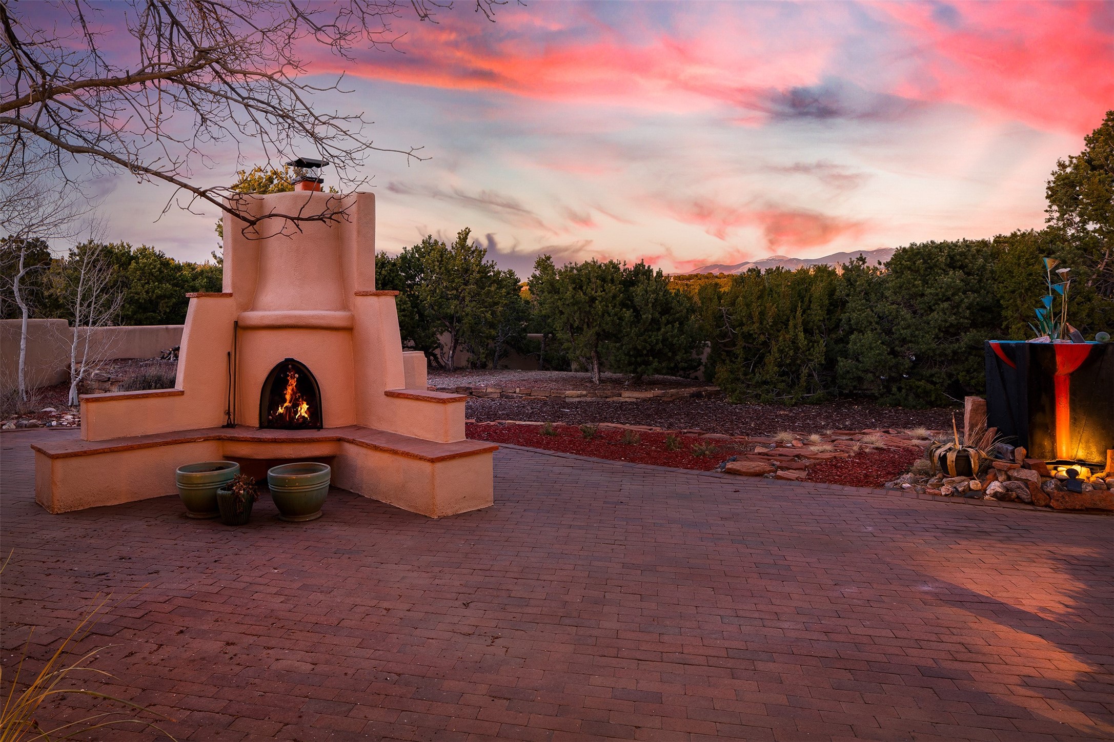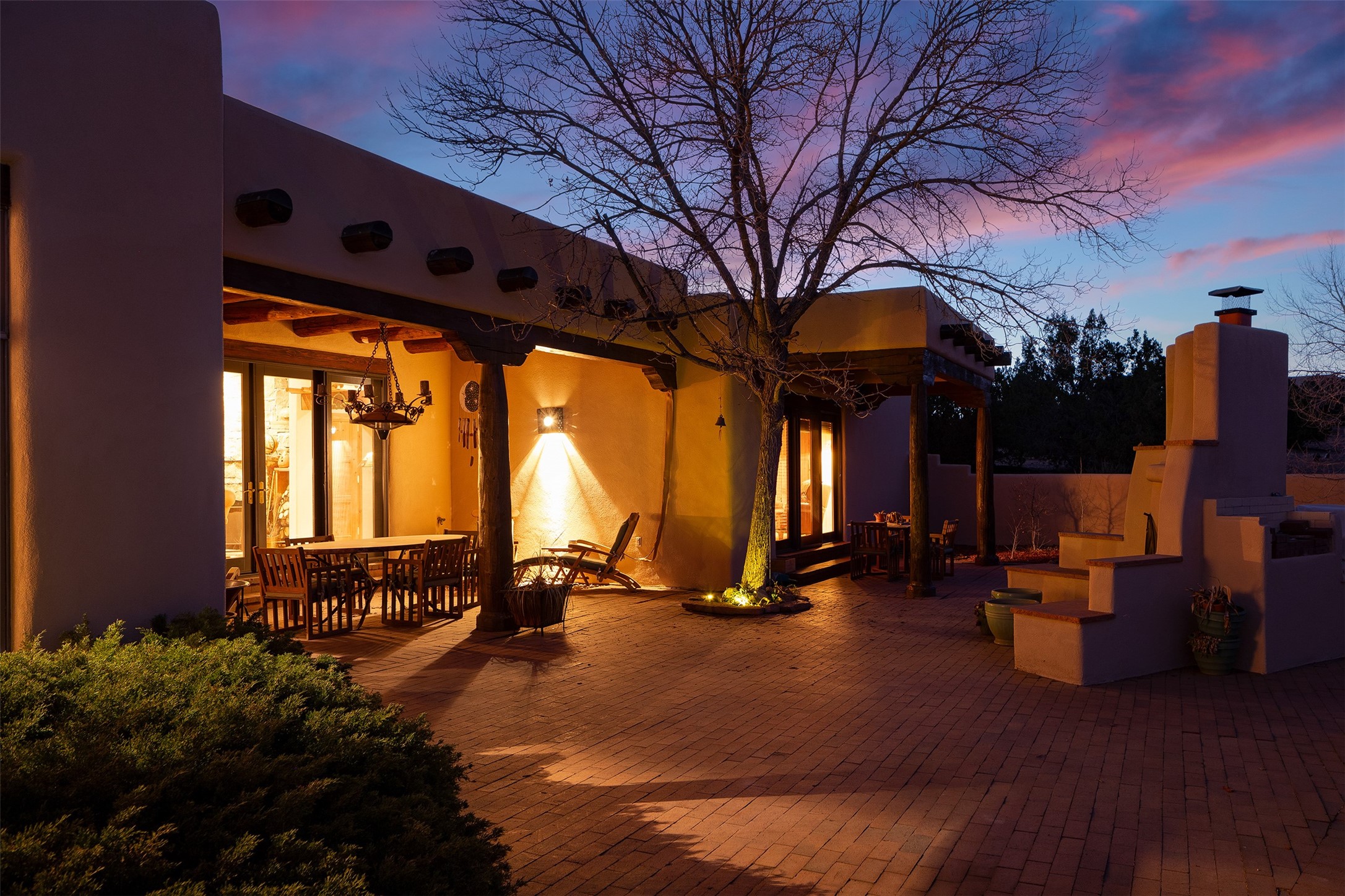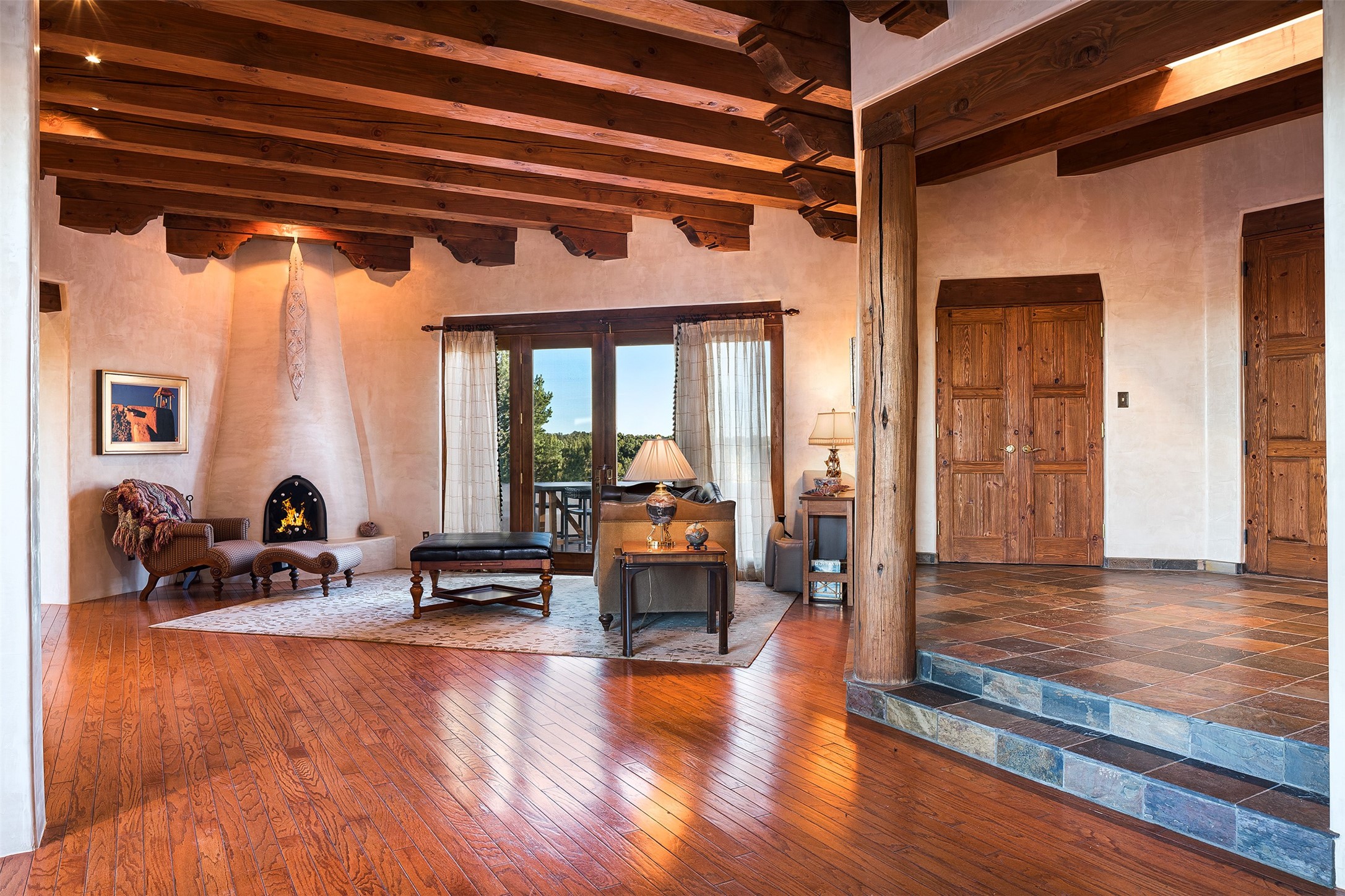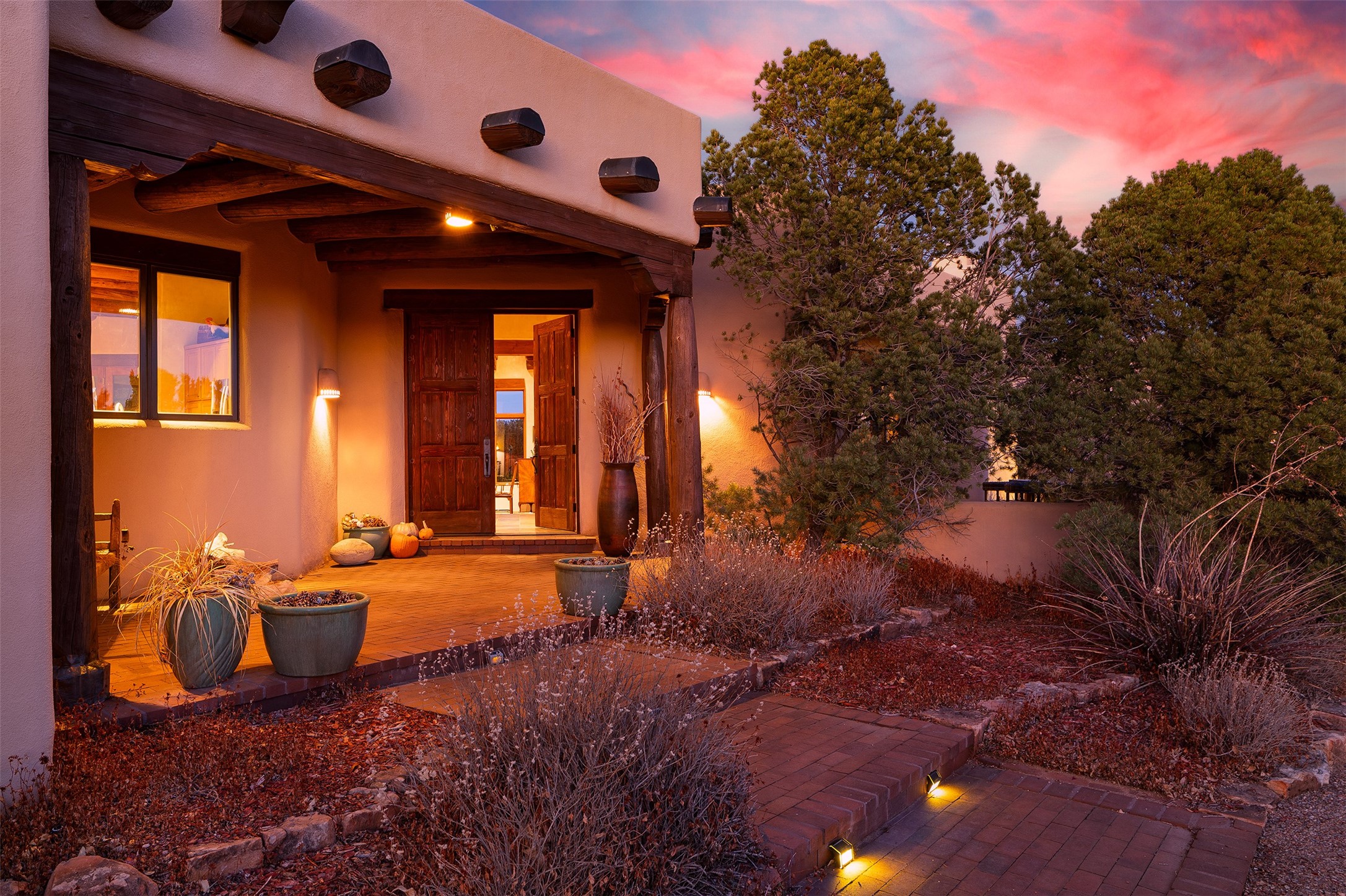 Las Campanas- Beautiful Classic Santa Fe Style on an elevated homesite with Sangre de Cristo & Sandia mountain views! Plenty of room in the developable area to add a casita with easy access from the circle driveway. Approximately 4235 sq ft & an oversized 3 car garage w/ a lot of extra storage. Throughout the home find beautiful hard plastered walls, traditional treatments with vigas, latillas, & coved ceilings, wood & travertine stone floors. Primary suite with an exquisite bath w/ timeless Talivera Tile, 2 water closets, 2 vanities, a large tub and separate shower and 2 walk-in closets. Guest bedrooms are spacious, en-suite, all with doors to the outside courtyards. Handsome office with Kiva FP & built-in bookshelves. Expansive Great Room with a large fireplace and dining area, awash in natural light, flowing to the inviting kitchen w/ bar area & connected family room w/ FP & French doors opening to the back portal-sure to become one of your favorite spots-with Sangre mountain views & outdoor fireplace. Radiant in-floor heat & central forced air AC. This home has a prime location in Estate 2- close to the Santa Fe Plaza & shopping. Membership to the Club at Las Campanas is optional, it is an additional investment, by invitation, & handled through The Club. Amenities are numerous & World Class. Come see this blend of privacy, grace, and beauty! 24hr security & paramedics. Look at video!