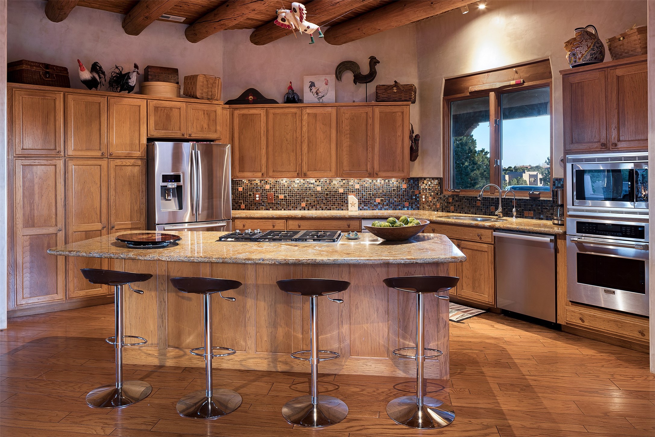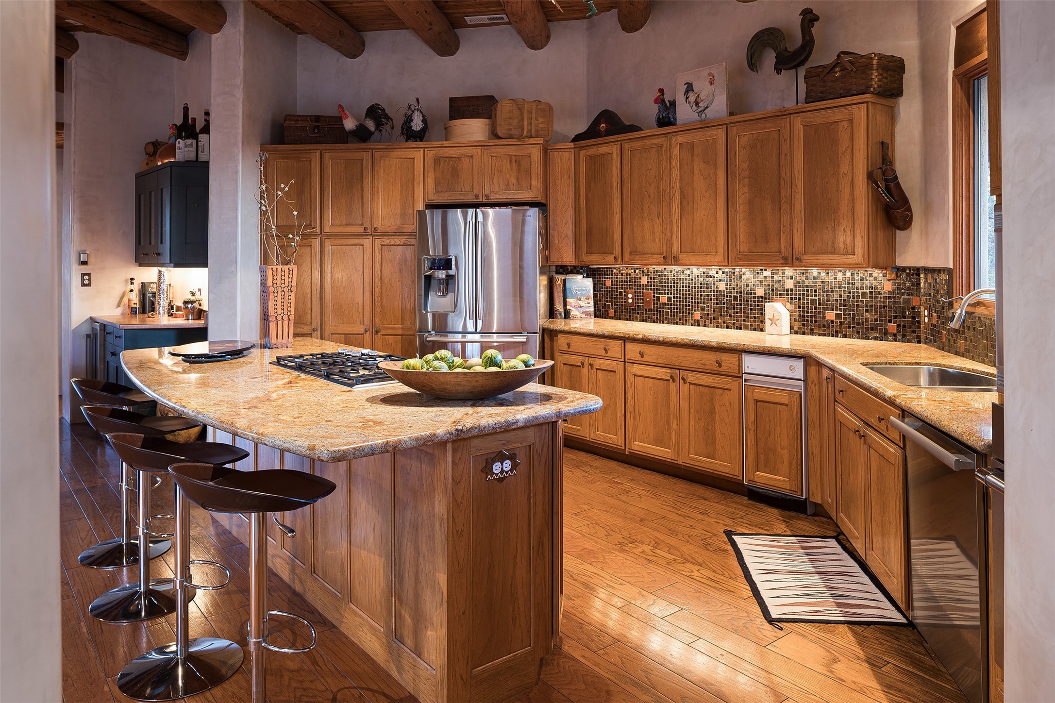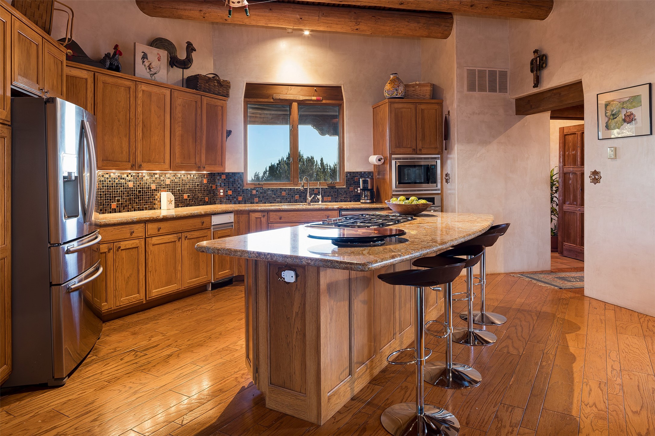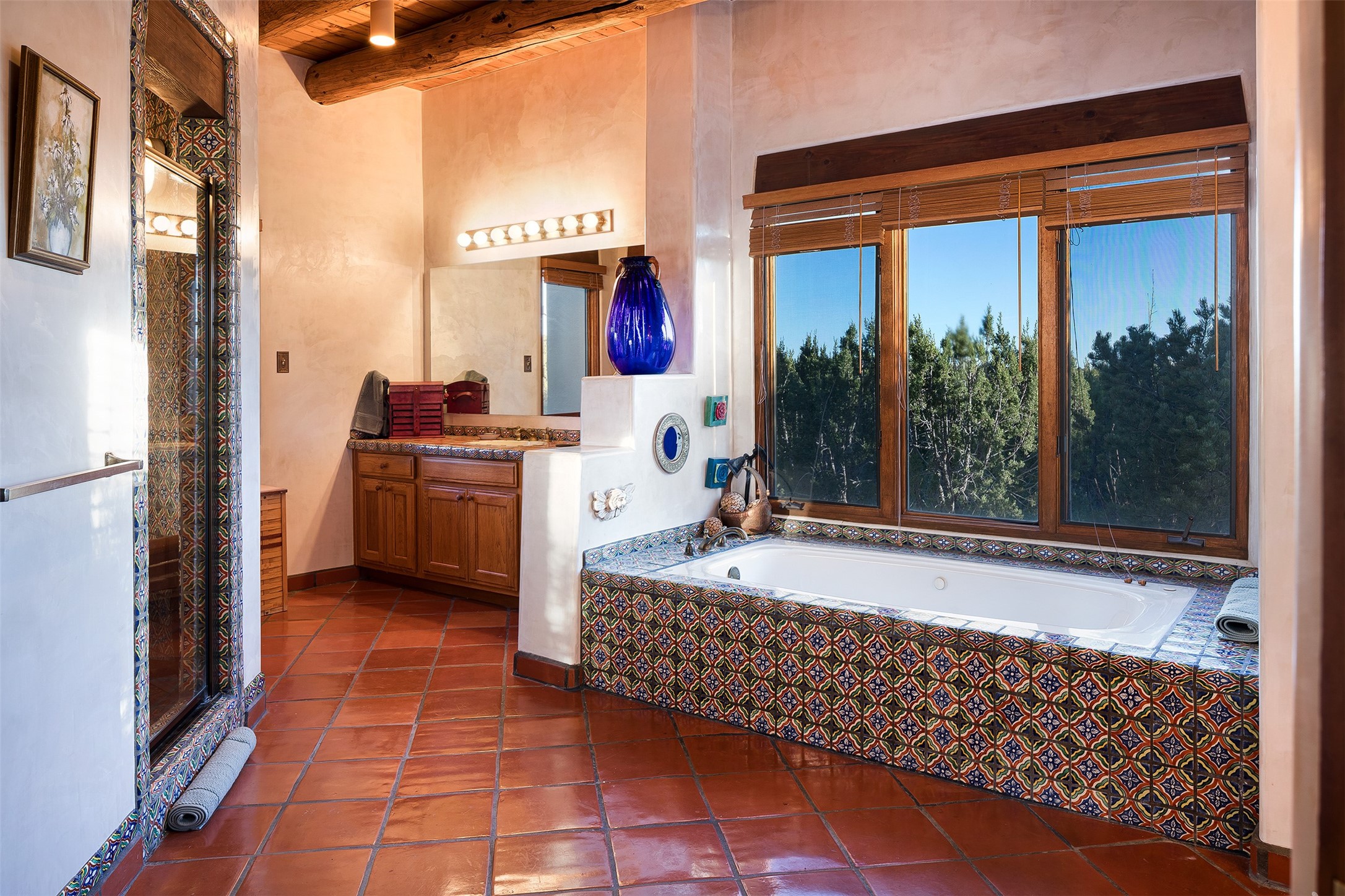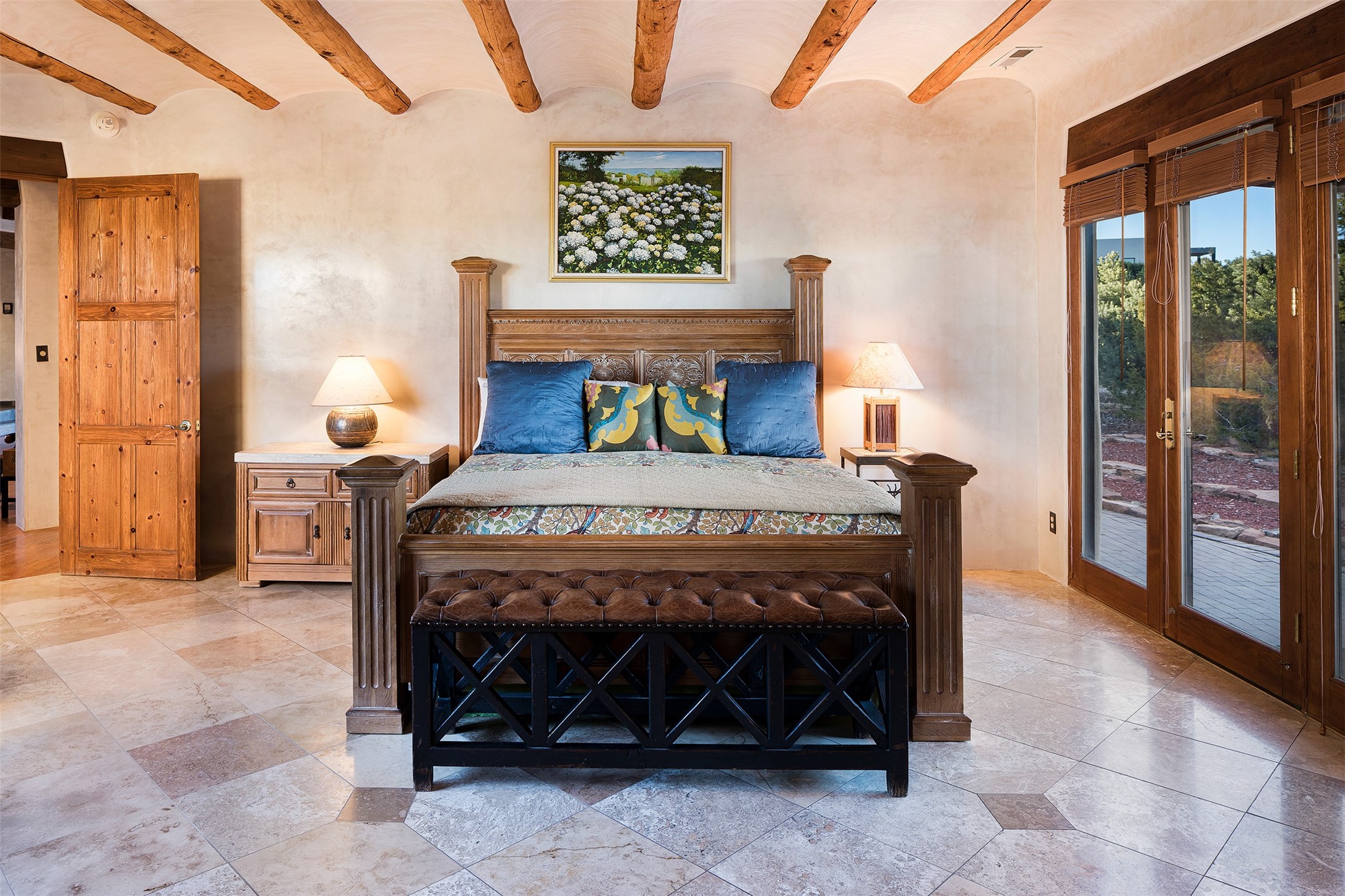 Las Campanas- Beautiful Classic Santa Fe Style on an elevated homesite with Sangre de Cristo & Sandia mountain views! Plenty of room in the developable area to add a casita with easy access from the circle driveway. Approximately 4235 sq ft & an oversized 3 car garage w/ a lot of extra storage. Throughout the home find beautiful hard plastered walls, traditional treatments with vigas, latillas, & coved ceilings, wood & travertine stone floors. Primary suite with an exquisite bath w/ timeless Talivera Tile, 2 water closets, 2 vanities, a large tub and separate shower and 2 walk-in closets. Guest bedrooms are spacious, en-suite, all with doors to the outside courtyards. Handsome office with Kiva FP & built-in bookshelves. Expansive Great Room with a large fireplace and dining area, awash in natural light, flowing to the inviting kitchen w/ bar area & connected family room w/ FP & French doors opening to the back portal-sure to become one of your favorite spots-with Sangre mountain views & outdoor fireplace. Radiant in-floor heat & central forced air AC. This home has a prime location in Estate 2- close to the Santa Fe Plaza & shopping. Membership to the Club at Las Campanas is optional, it is an additional investment, by invitation, & handled through The Club. Amenities are numerous & World Class. Come see this blend of privacy, grace, and beauty! 24hr security & paramedics. Look at video!