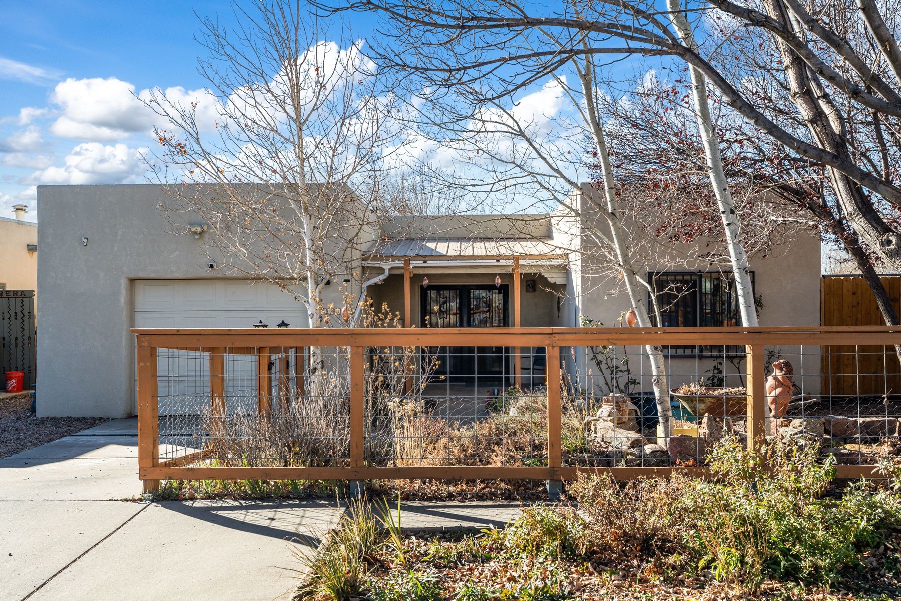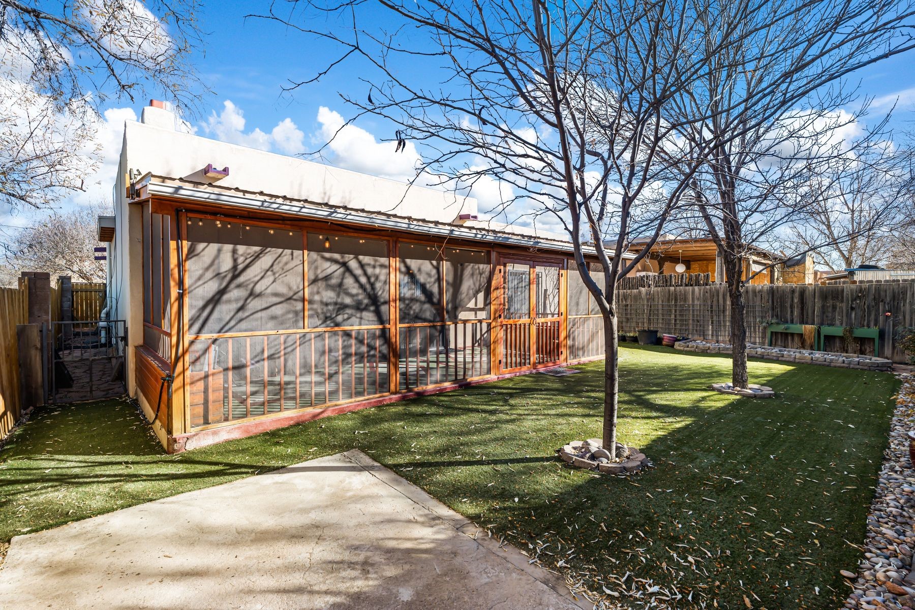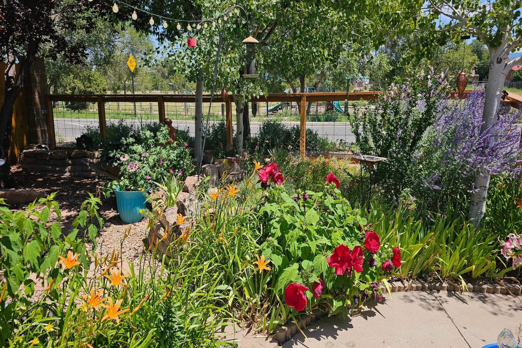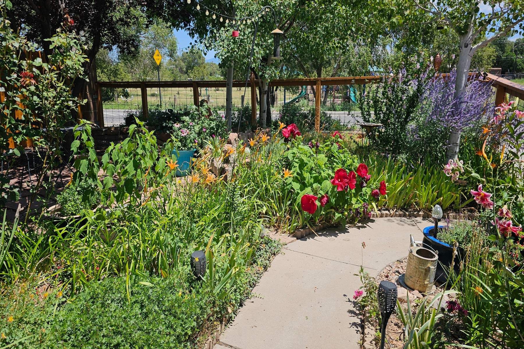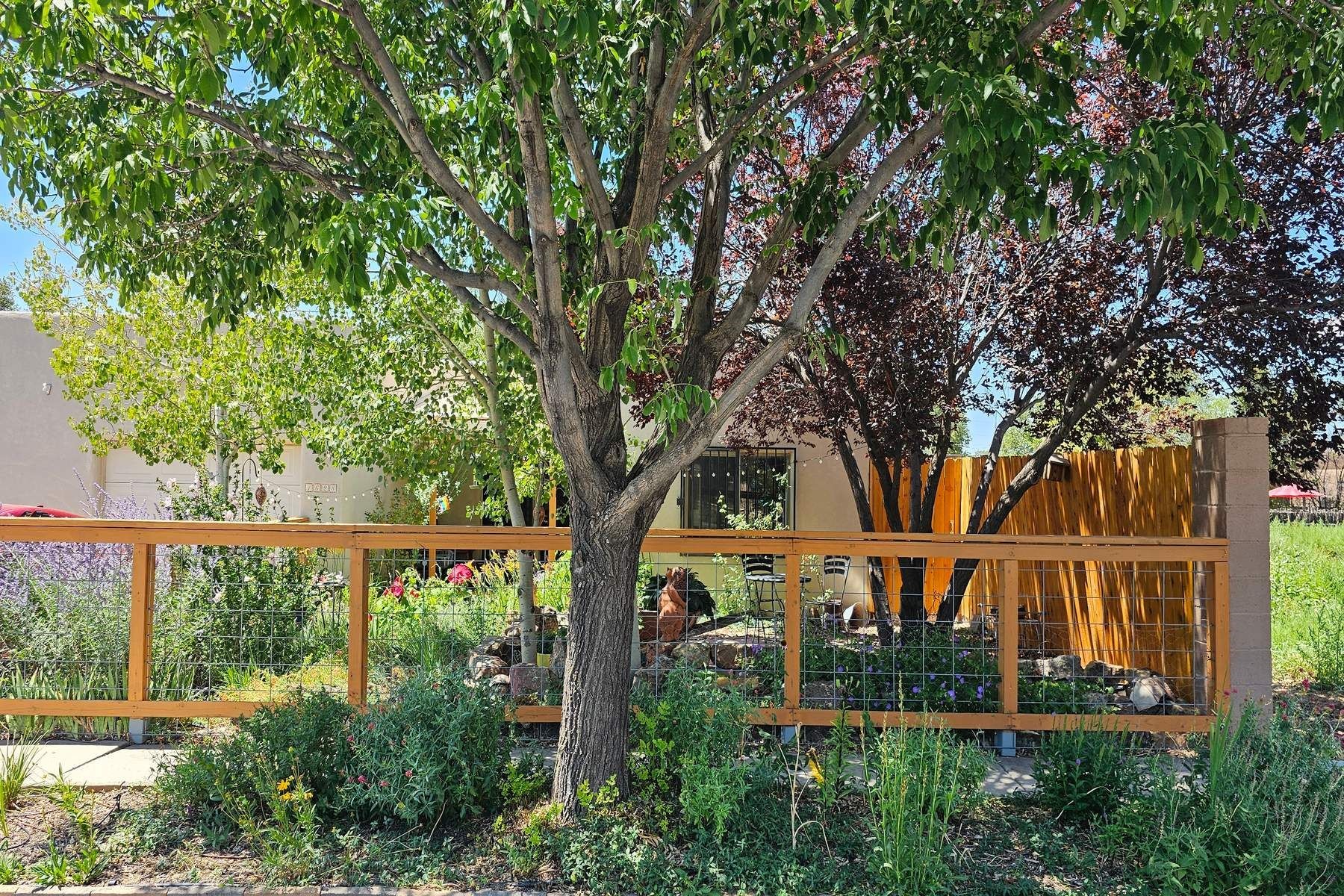 Discover this charming home in a quiet midtown location across from Los Hermanos Rodriguez Park and bordering undeveloped common area on one side for added privacy. This single-level, no-steps home offers abundant natural light and excellent separation between the primary suite and two guest bedrooms. The inviting living room features tile flooring and a wood-burning kiva fireplace, while the kitchen and dining area offer easy flow for everyday living. A standout feature is the screened-in portal, providing additional outdoor living space and direct access to the fully fenced rear yard. The backyard includes low-maintenance landscaping, mature shade trees, turf, river rock accents, and room for gardening or pets. The front garden is a lush seasonal oasis with blooming perennials and established plantings that enhance curb appeal. The home includes laminate and tile flooring throughout (no carpet), in-floor radiant heat, and evaporative cooling for year-round comfort. The extra-wide one-car garage provides valuable storage or workspace. Recent updates include a new dishwasher (2023), new microwave (2024), new tankless boiler, and rainwater management improvements (2025). A radon mitigation system is already in place. This thoughtfully maintained home offers privacy, comfort, and easy indoor-outdoor living in a central Santa Fe location. With park access just across the street and shopping, restaurants, and amenities only 10 minutes away, this home combines quiet neighborhood living with excellent convenience.
