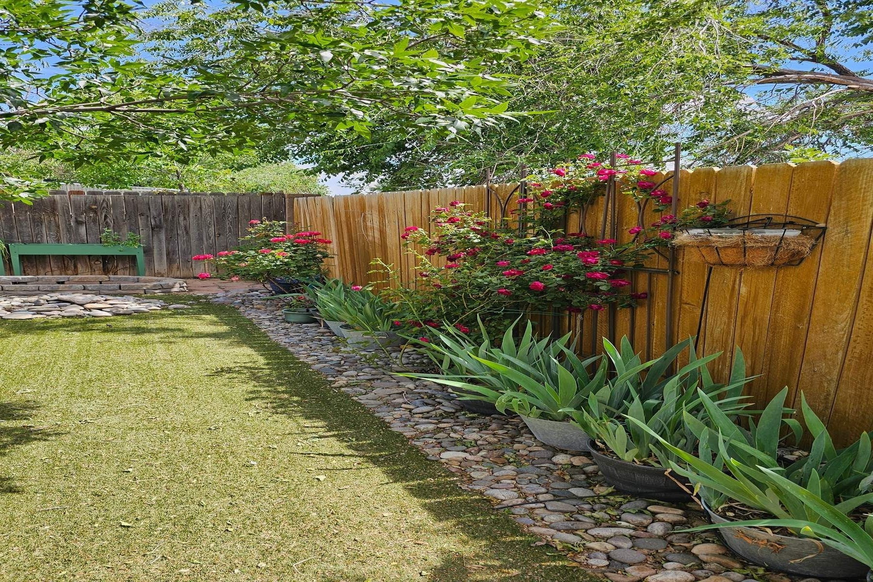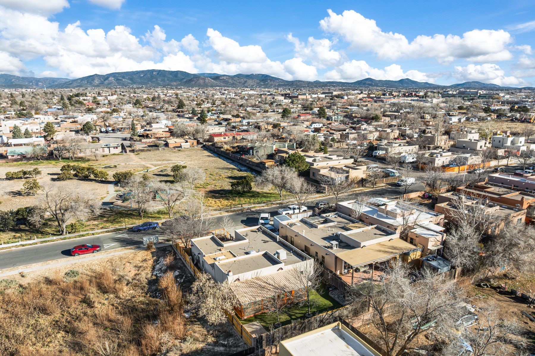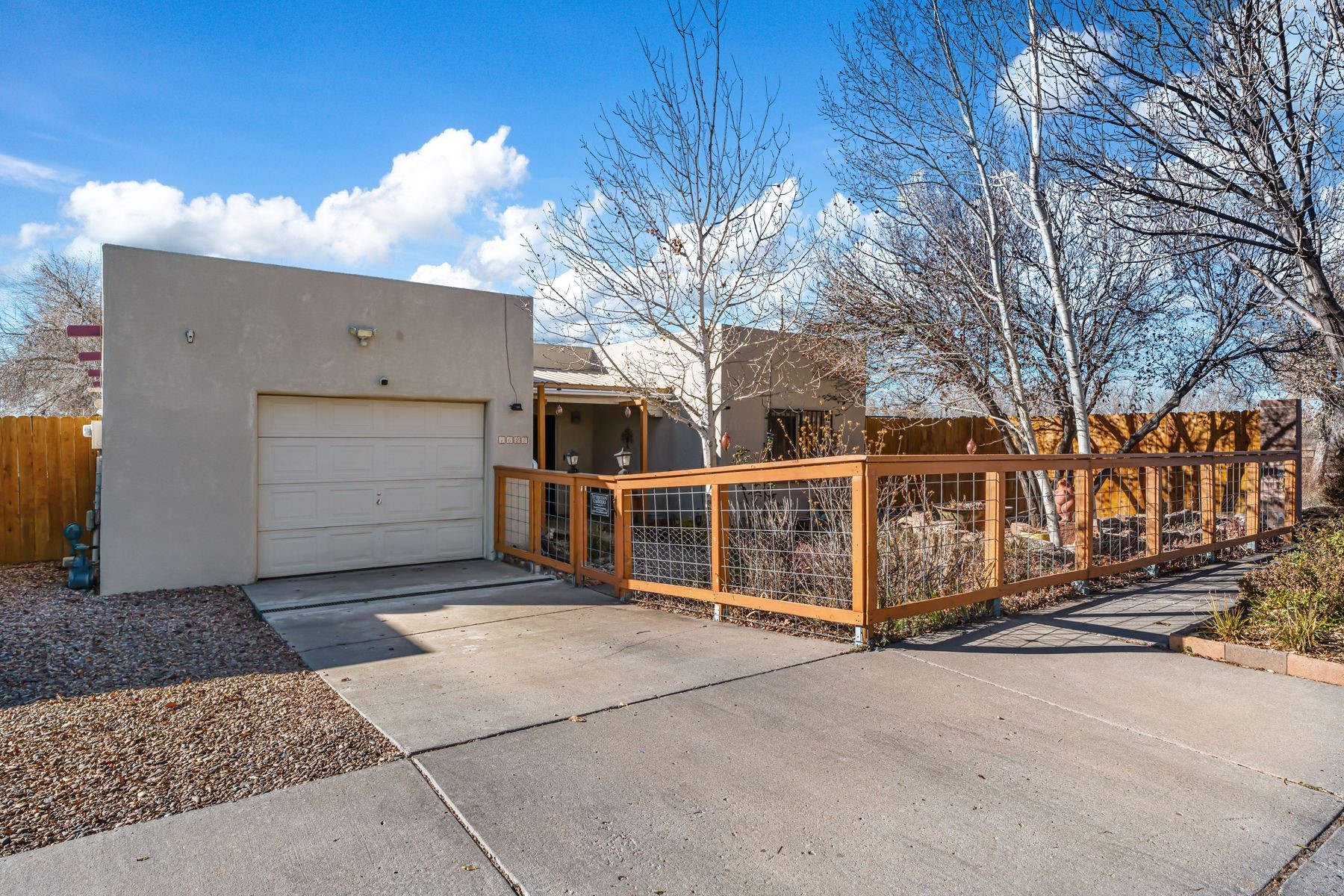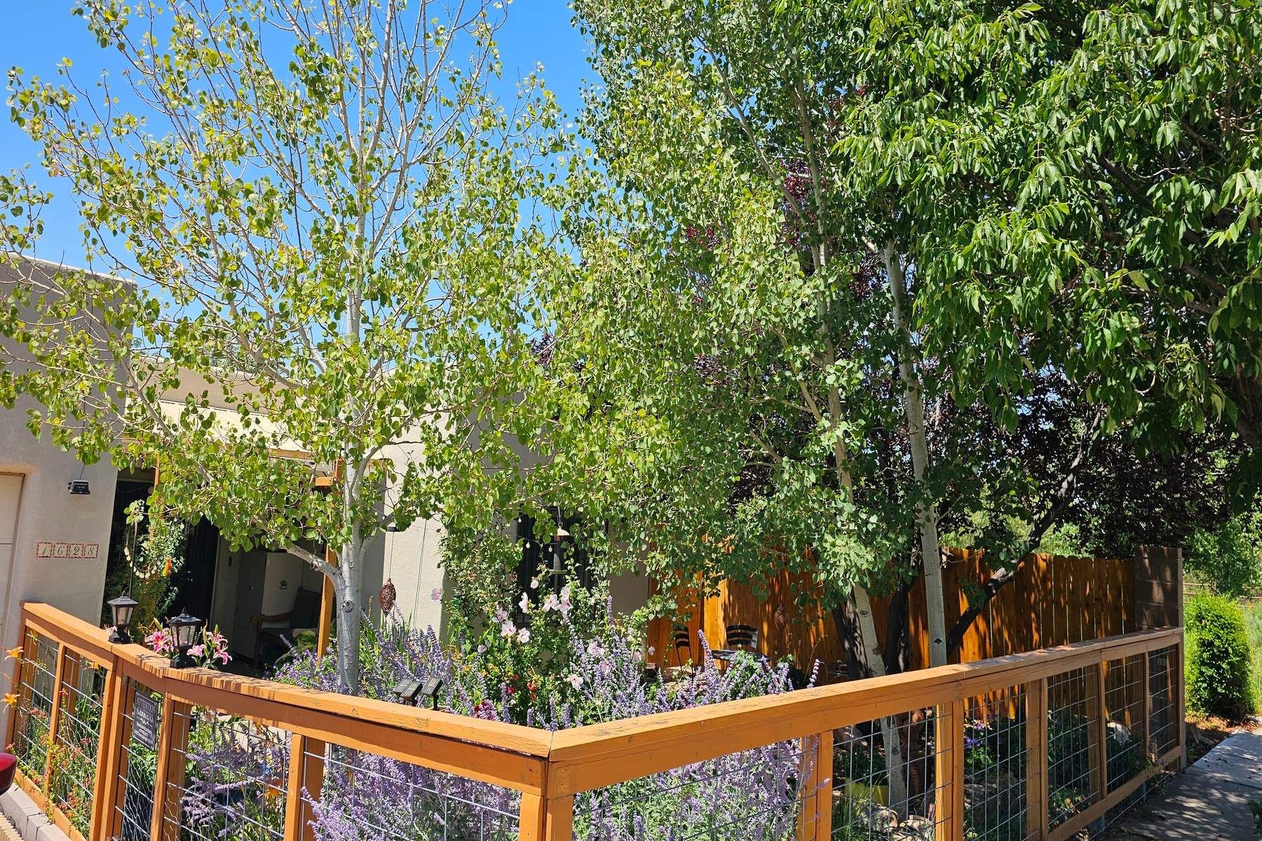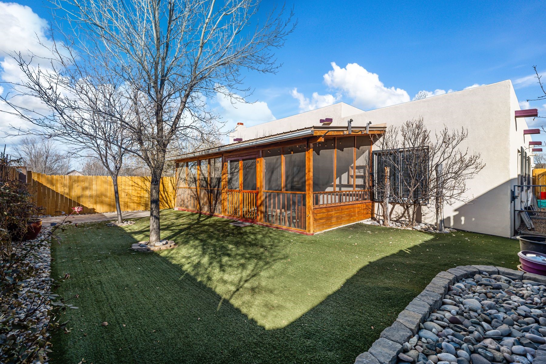 Discover this charming home in a quiet midtown location across from Los Hermanos Rodriguez Park and bordering undeveloped common area on one side for added privacy. This single-level, no-steps home offers abundant natural light and excellent separation between the primary suite and two guest bedrooms. The inviting living room features tile flooring and a wood-burning kiva fireplace, while the kitchen and dining area offer easy flow for everyday living. A standout feature is the screened-in portal, providing additional outdoor living space and direct access to the fully fenced rear yard. The backyard includes low-maintenance landscaping, mature shade trees, turf, river rock accents, and room for gardening or pets. The front garden is a lush seasonal oasis with blooming perennials and established plantings that enhance curb appeal. The home includes laminate and tile flooring throughout (no carpet), in-floor radiant heat, and evaporative cooling for year-round comfort. The extra-wide one-car garage provides valuable storage or workspace. Recent updates include a new dishwasher (2023), new microwave (2024), new tankless boiler, and rainwater management improvements (2025). A radon mitigation system is already in place. This thoughtfully maintained home offers privacy, comfort, and easy indoor-outdoor living in a central Santa Fe location. With park access just across the street and shopping, restaurants, and amenities only 10 minutes away, this home combines quiet neighborhood living with excellent convenience.