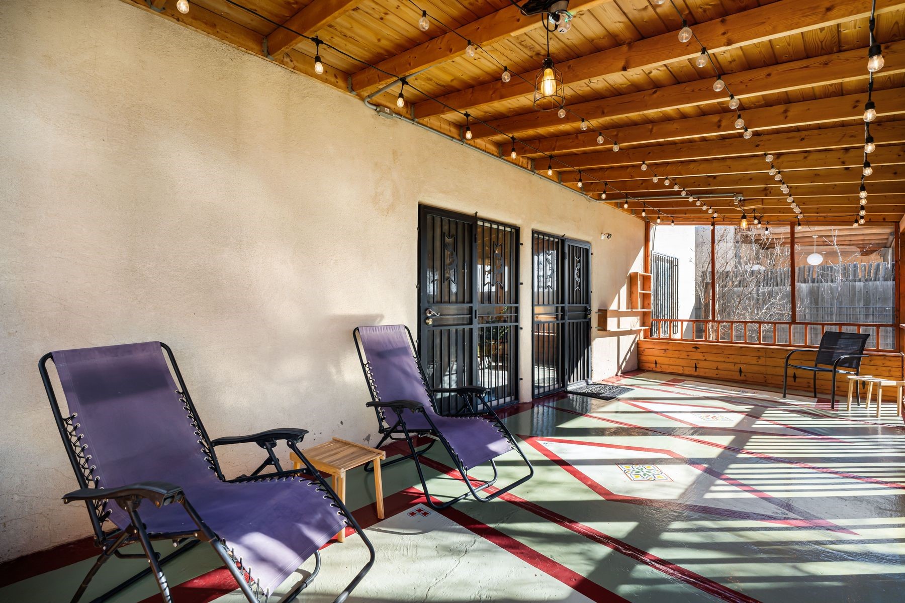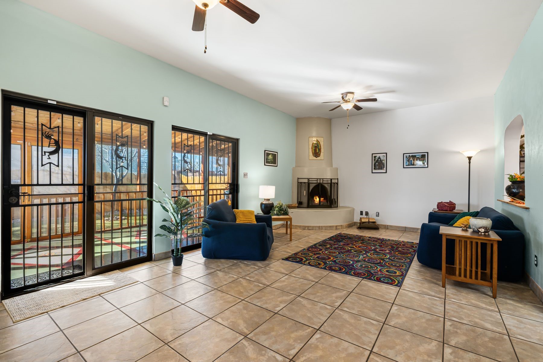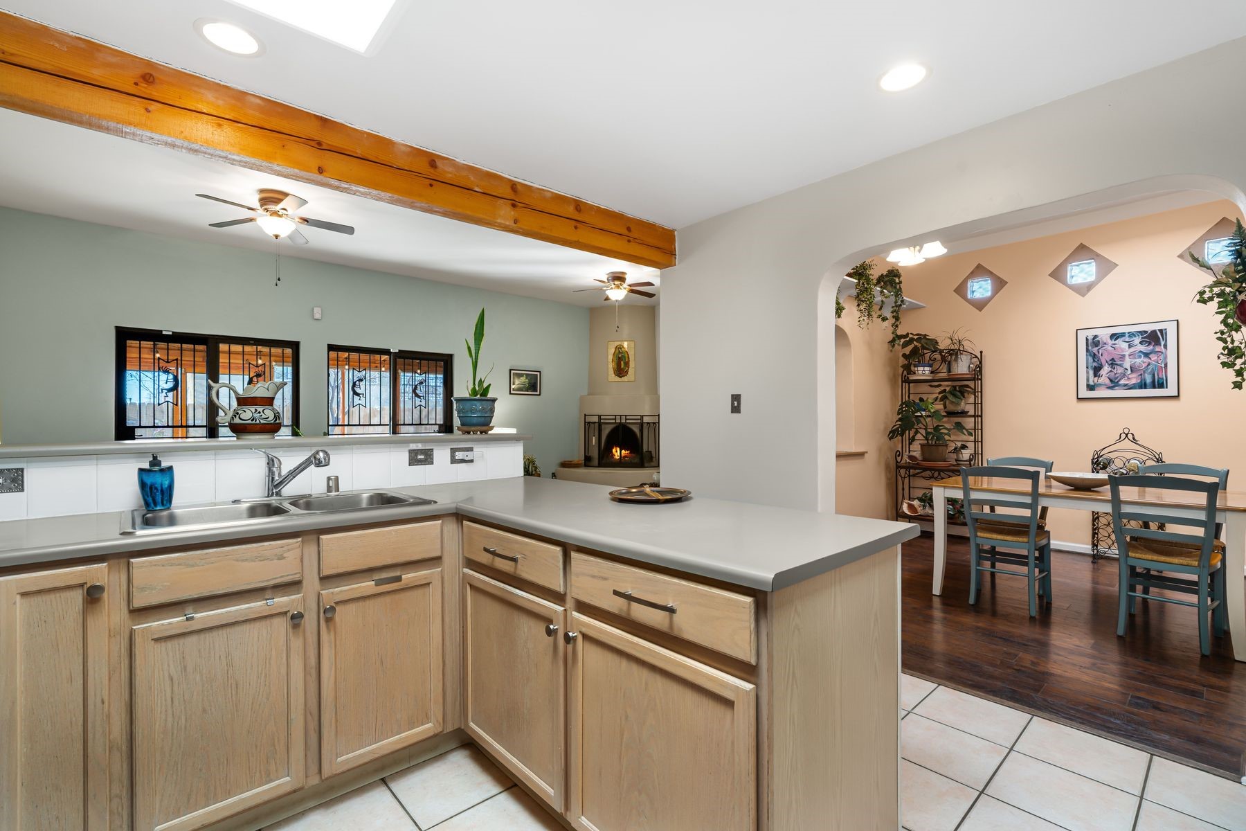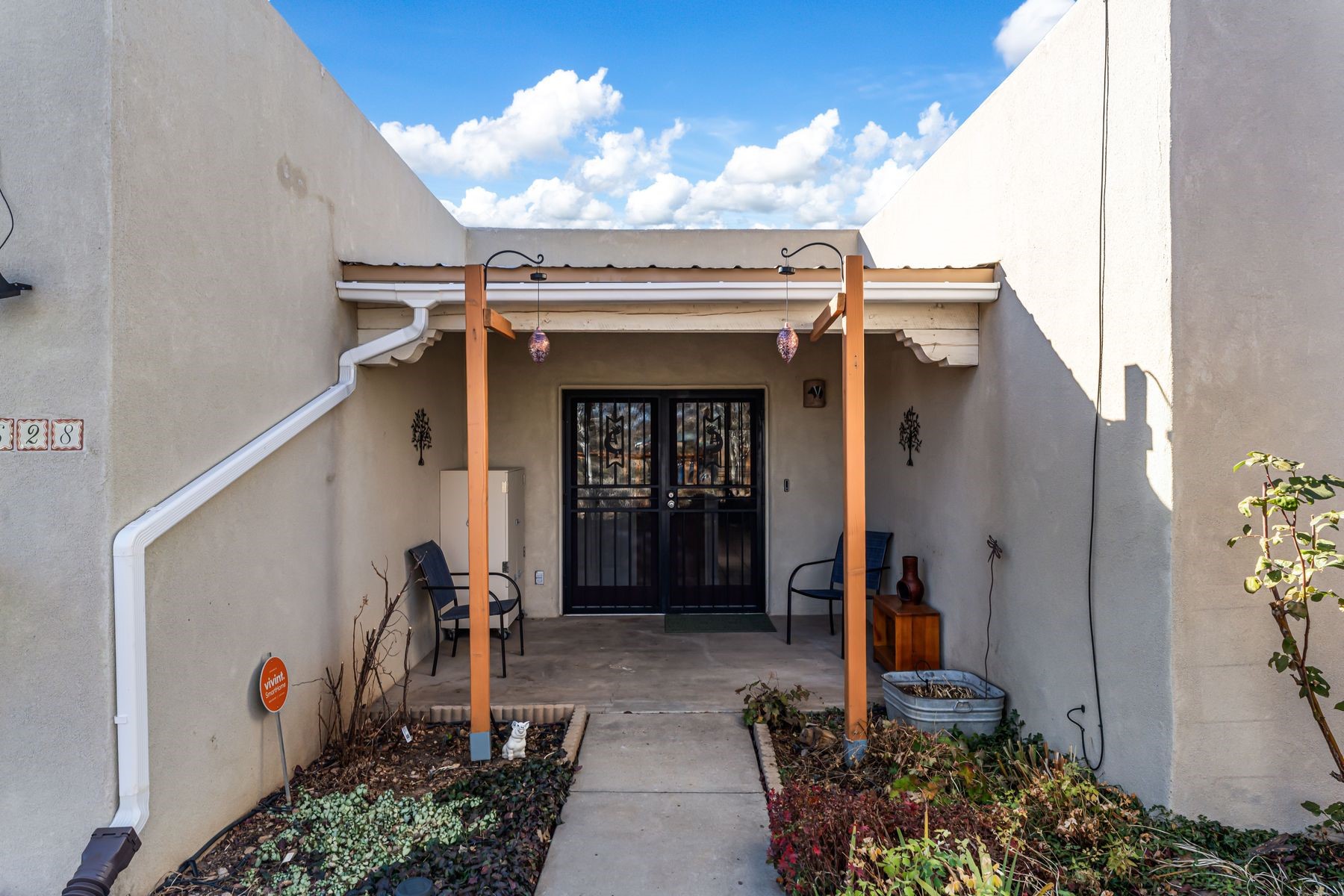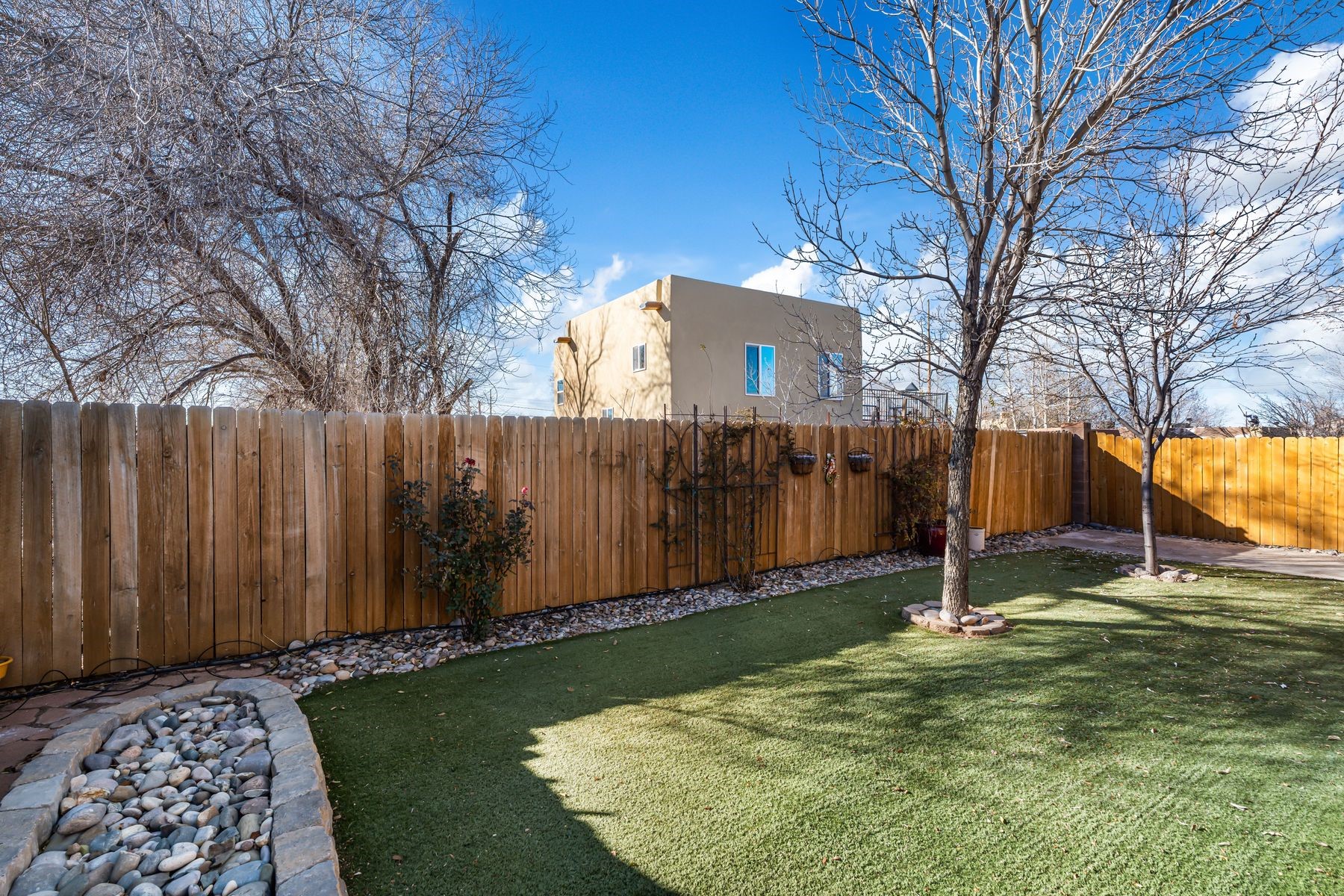 Discover this charming home in a quiet midtown location across from Los Hermanos Rodriguez Park and bordering undeveloped common area on one side for added privacy. This single-level, no-steps home offers abundant natural light and excellent separation between the primary suite and two guest bedrooms. The inviting living room features tile flooring and a wood-burning kiva fireplace, while the kitchen and dining area offer easy flow for everyday living. A standout feature is the screened-in portal, providing additional outdoor living space and direct access to the fully fenced rear yard. The backyard includes low-maintenance landscaping, mature shade trees, turf, river rock accents, and room for gardening or pets. The front garden is a lush seasonal oasis with blooming perennials and established plantings that enhance curb appeal. The home includes laminate and tile flooring throughout (no carpet), in-floor radiant heat, and evaporative cooling for year-round comfort. The extra-wide one-car garage provides valuable storage or workspace. Recent updates include a new dishwasher (2023), new microwave (2024), new tankless boiler, and rainwater management improvements (2025). A radon mitigation system is already in place. This thoughtfully maintained home offers privacy, comfort, and easy indoor-outdoor living in a central Santa Fe location. With park access just across the street and shopping, restaurants, and amenities only 10 minutes away, this home combines quiet neighborhood living with excellent convenience.