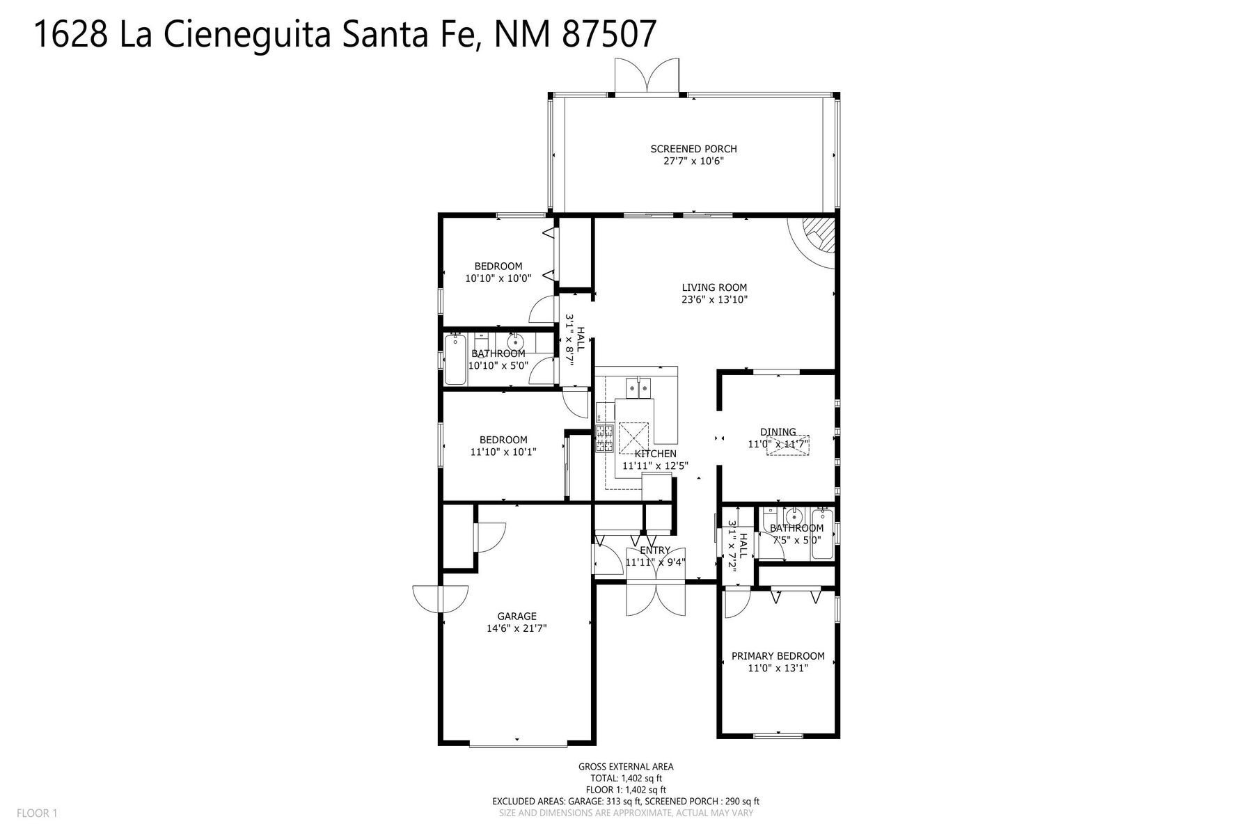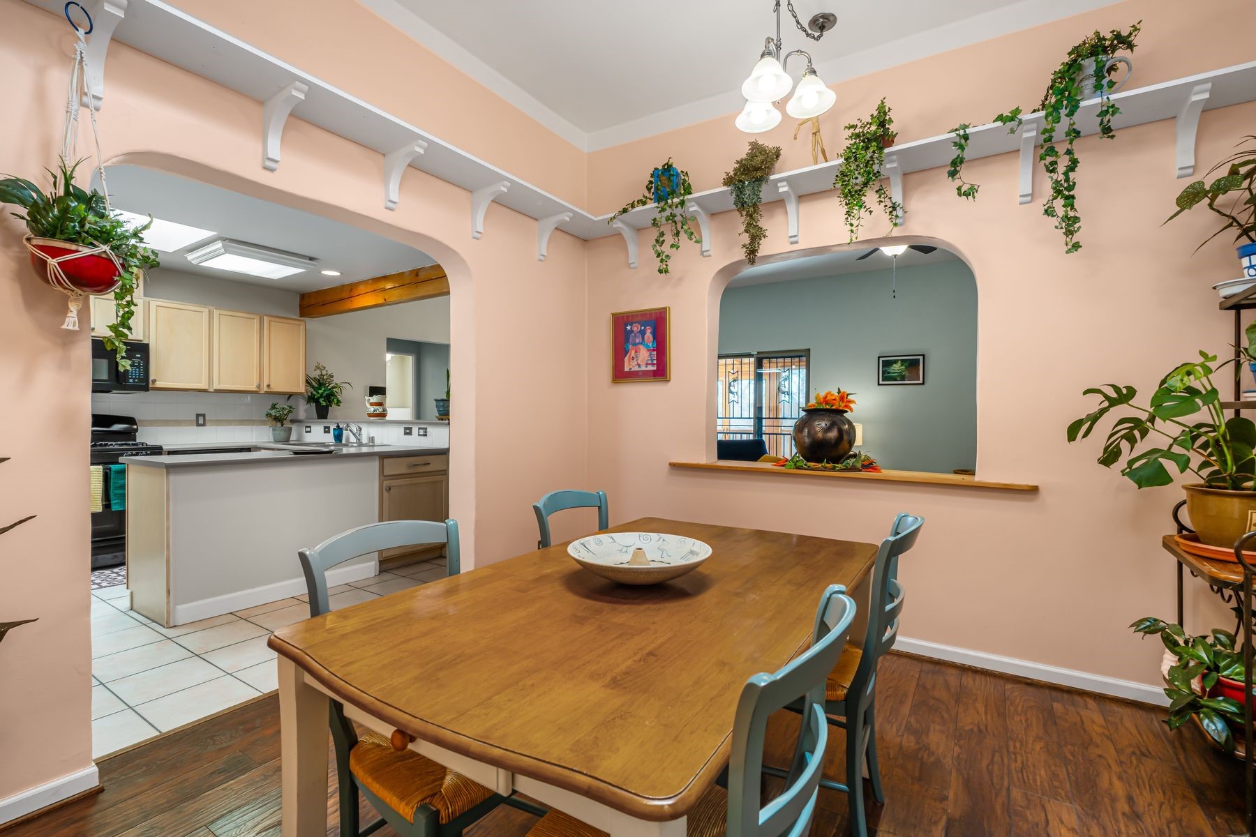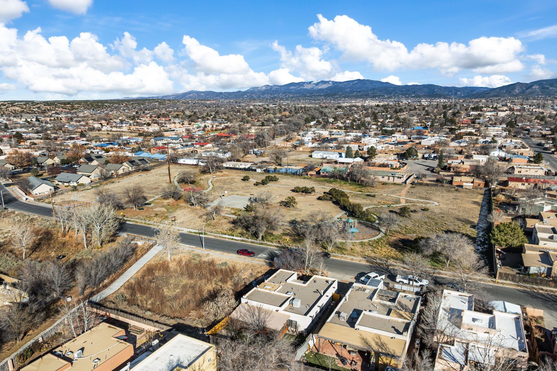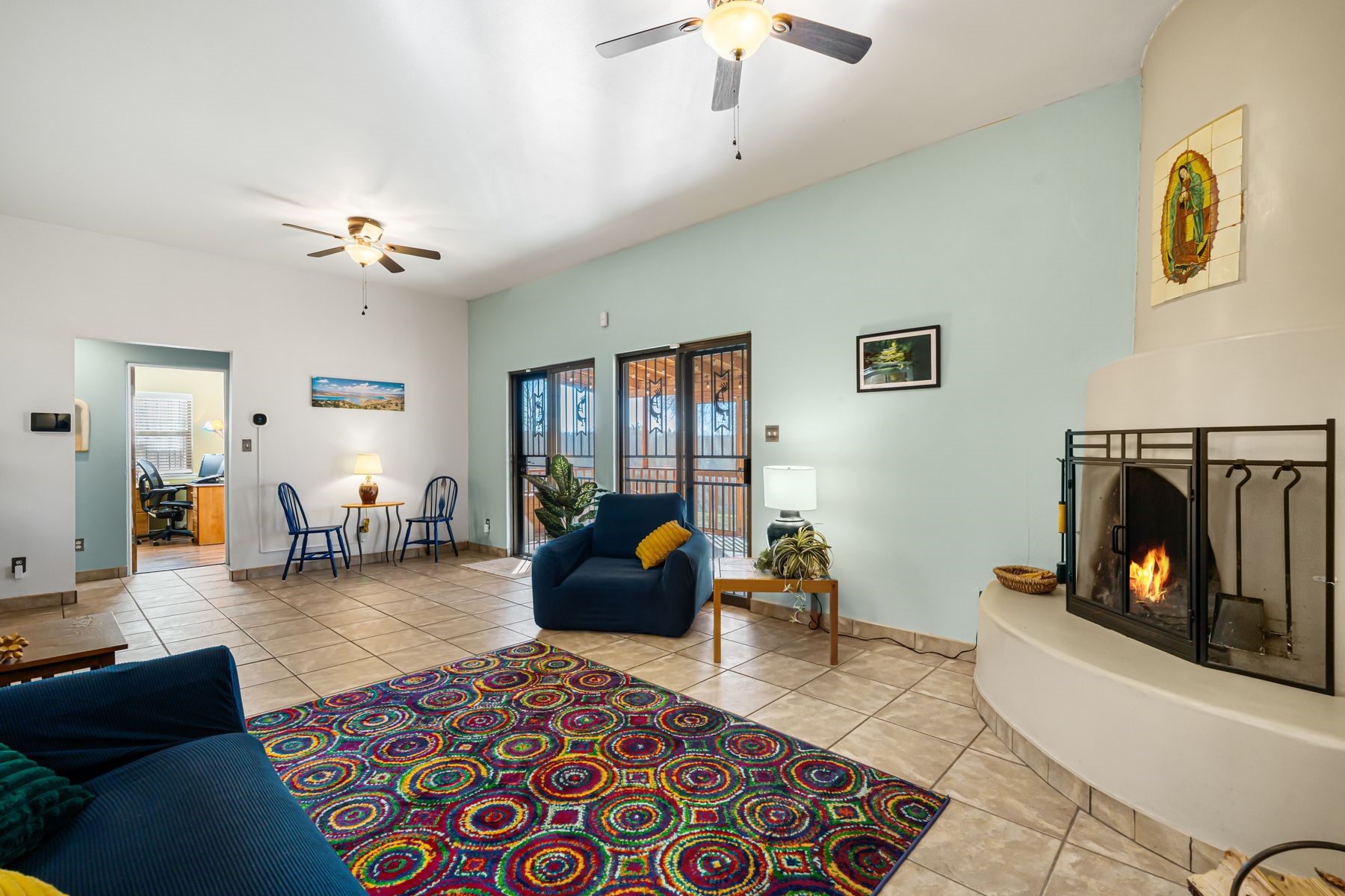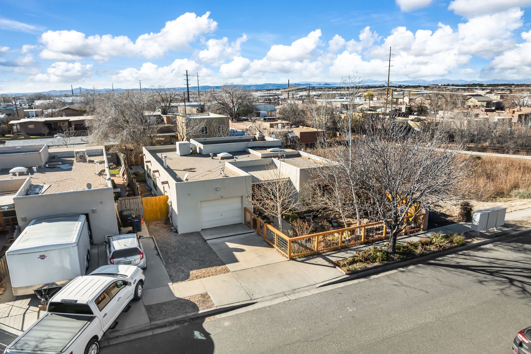 Discover this charming home in a quiet midtown location across from Los Hermanos Rodriguez Park and bordering undeveloped common area on one side for added privacy. This single-level, no-steps home offers abundant natural light and excellent separation between the primary suite and two guest bedrooms. The inviting living room features tile flooring and a wood-burning kiva fireplace, while the kitchen and dining area offer easy flow for everyday living. A standout feature is the screened-in portal, providing additional outdoor living space and direct access to the fully fenced rear yard. The backyard includes low-maintenance landscaping, mature shade trees, turf, river rock accents, and room for gardening or pets. The front garden is a lush seasonal oasis with blooming perennials and established plantings that enhance curb appeal. The home includes laminate and tile flooring throughout (no carpet), in-floor radiant heat, and evaporative cooling for year-round comfort. The extra-wide one-car garage provides valuable storage or workspace. Recent updates include a new dishwasher (2023), new microwave (2024), new tankless boiler, and rainwater management improvements (2025). A radon mitigation system is already in place. This thoughtfully maintained home offers privacy, comfort, and easy indoor-outdoor living in a central Santa Fe location. With park access just across the street and shopping, restaurants, and amenities only 10 minutes away, this home combines quiet neighborhood living with excellent convenience.