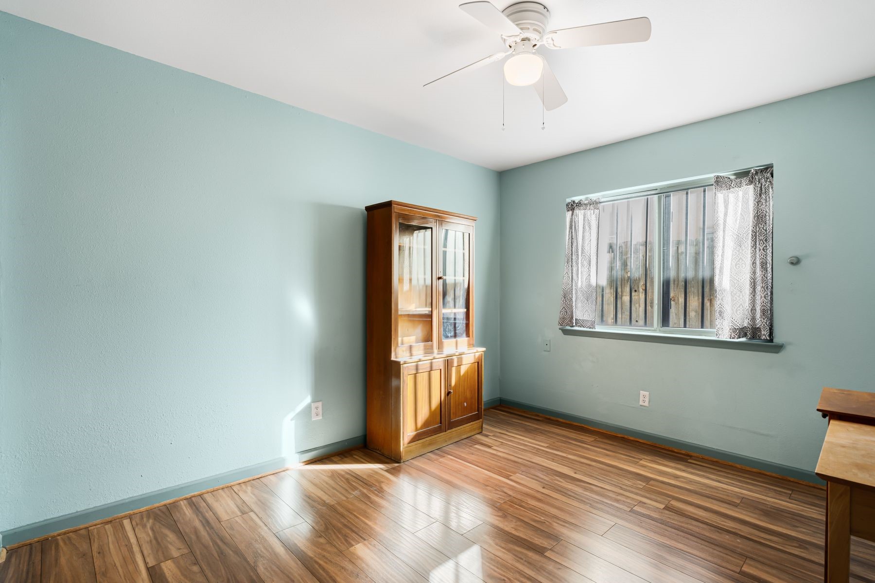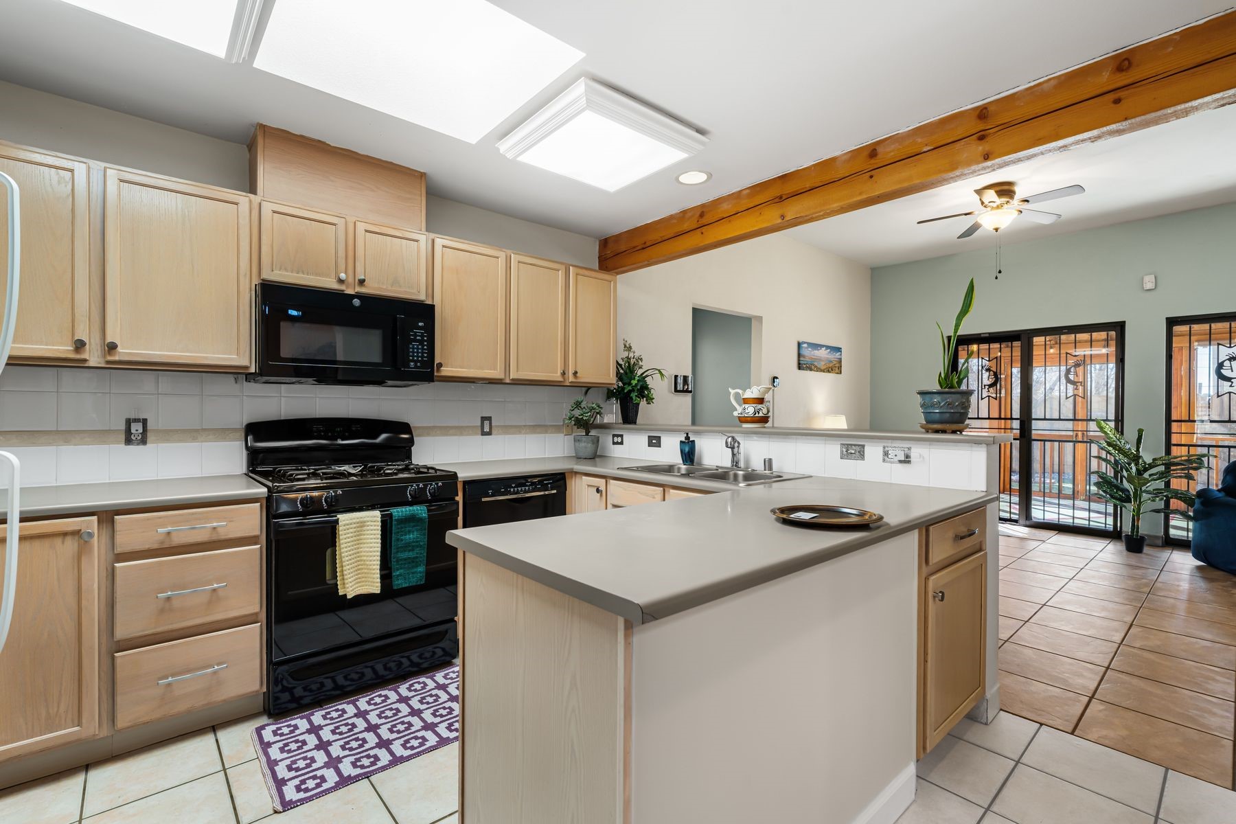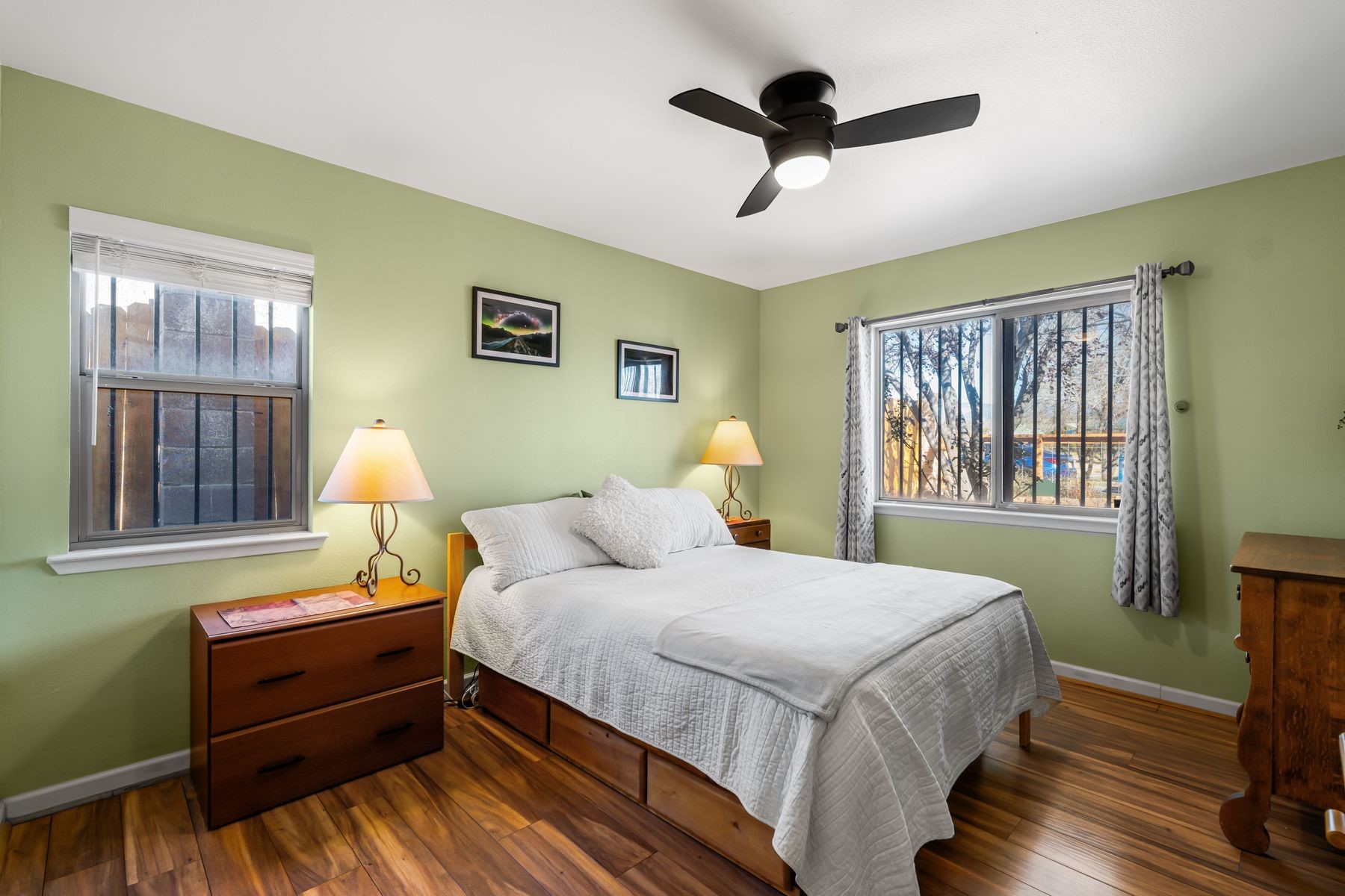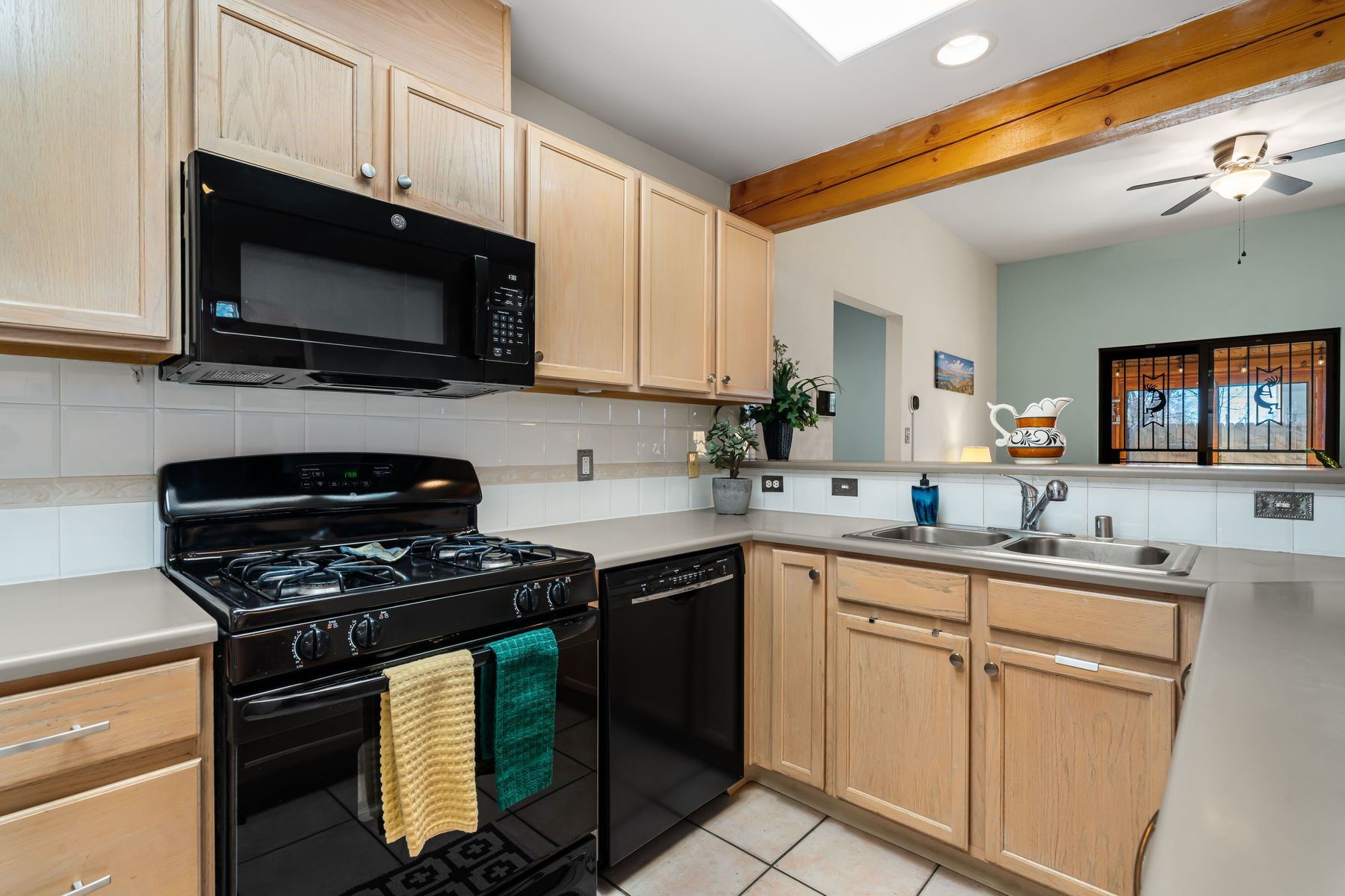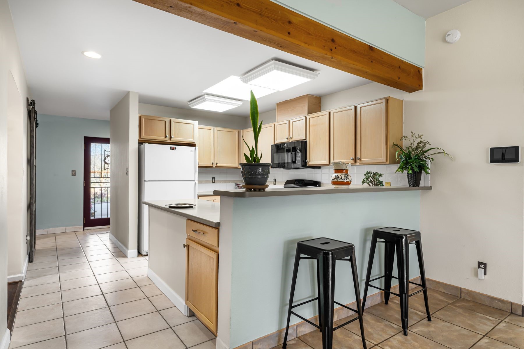 Discover this charming home in a quiet midtown location across from Los Hermanos Rodriguez Park and bordering undeveloped common area on one side for added privacy. This single-level, no-steps home offers abundant natural light and excellent separation between the primary suite and two guest bedrooms. The inviting living room features tile flooring and a wood-burning kiva fireplace, while the kitchen and dining area offer easy flow for everyday living. A standout feature is the screened-in portal, providing additional outdoor living space and direct access to the fully fenced rear yard. The backyard includes low-maintenance landscaping, mature shade trees, turf, river rock accents, and room for gardening or pets. The front garden is a lush seasonal oasis with blooming perennials and established plantings that enhance curb appeal. The home includes laminate and tile flooring throughout (no carpet), in-floor radiant heat, and evaporative cooling for year-round comfort. The extra-wide one-car garage provides valuable storage or workspace. Recent updates include a new dishwasher (2023), new microwave (2024), new tankless boiler, and rainwater management improvements (2025). A radon mitigation system is already in place. This thoughtfully maintained home offers privacy, comfort, and easy indoor-outdoor living in a central Santa Fe location. With park access just across the street and shopping, restaurants, and amenities only 10 minutes away, this home combines quiet neighborhood living with excellent convenience.