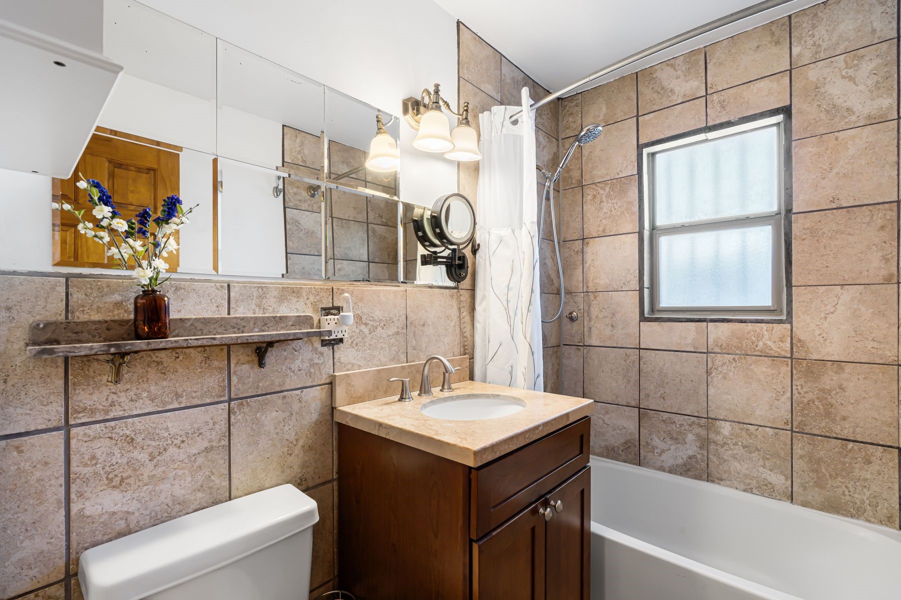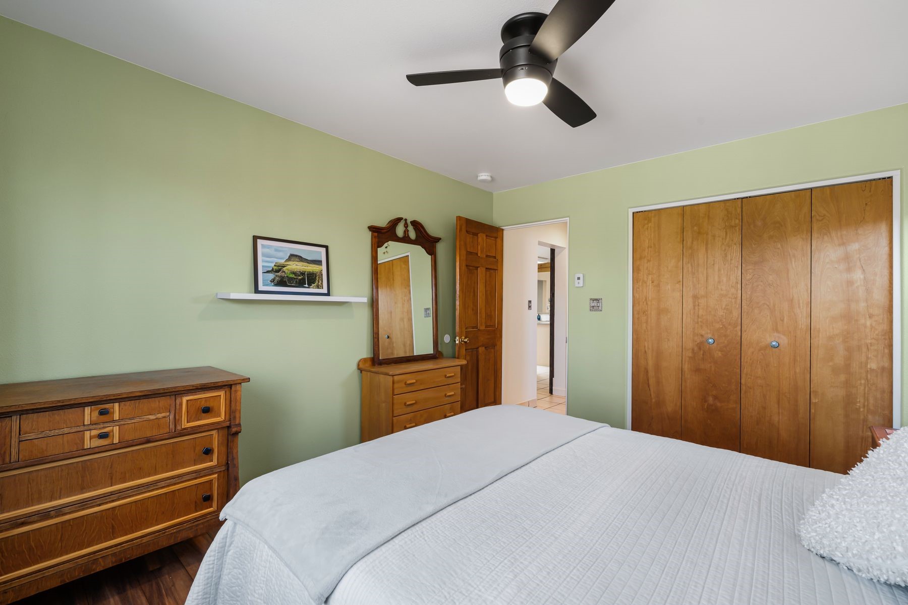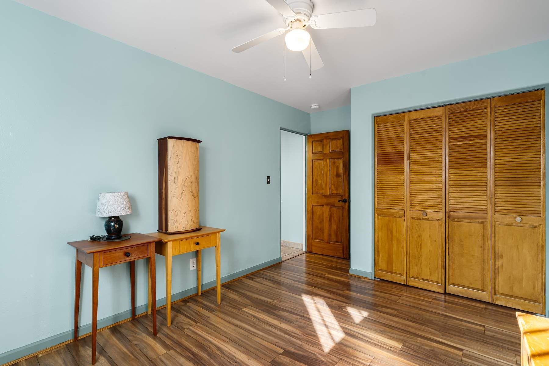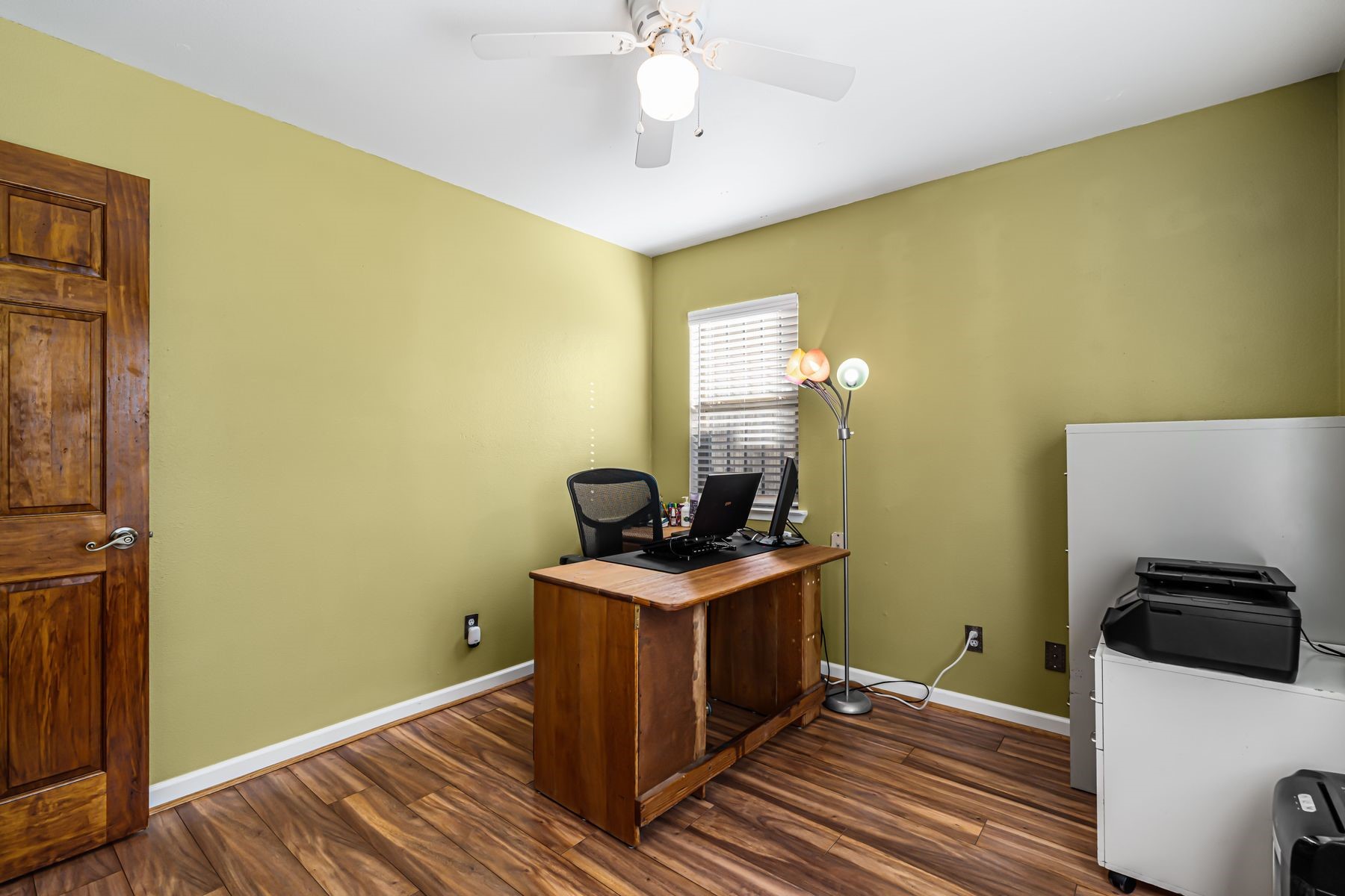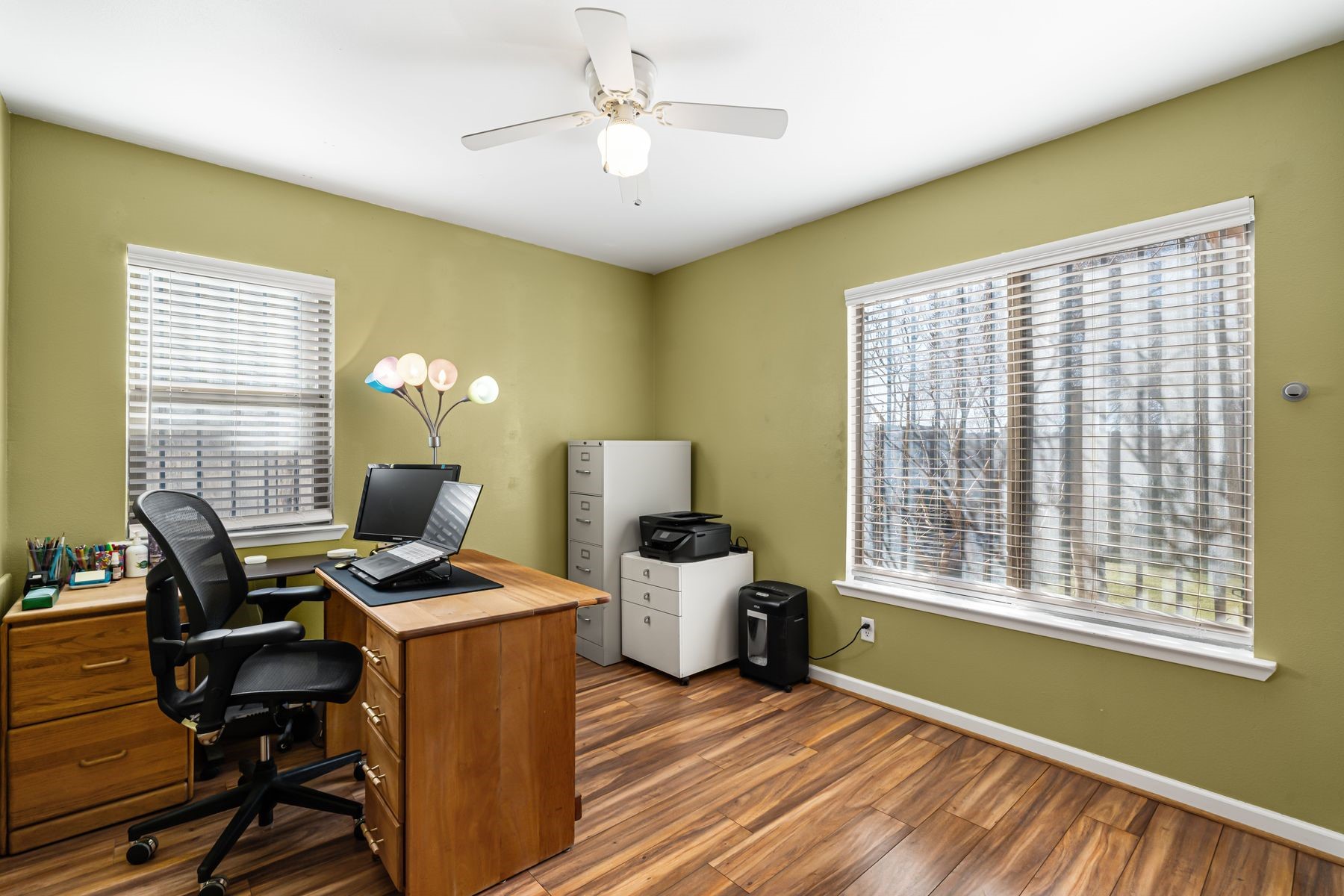 Discover this charming home in a quiet midtown location across from Los Hermanos Rodriguez Park and bordering undeveloped common area on one side for added privacy. This single-level, no-steps home offers abundant natural light and excellent separation between the primary suite and two guest bedrooms. The inviting living room features tile flooring and a wood-burning kiva fireplace, while the kitchen and dining area offer easy flow for everyday living. A standout feature is the screened-in portal, providing additional outdoor living space and direct access to the fully fenced rear yard. The backyard includes low-maintenance landscaping, mature shade trees, turf, river rock accents, and room for gardening or pets. The front garden is a lush seasonal oasis with blooming perennials and established plantings that enhance curb appeal. The home includes laminate and tile flooring throughout (no carpet), in-floor radiant heat, and evaporative cooling for year-round comfort. The extra-wide one-car garage provides valuable storage or workspace. Recent updates include a new dishwasher (2023), new microwave (2024), new tankless boiler, and rainwater management improvements (2025). A radon mitigation system is already in place. This thoughtfully maintained home offers privacy, comfort, and easy indoor-outdoor living in a central Santa Fe location. With park access just across the street and shopping, restaurants, and amenities only 10 minutes away, this home combines quiet neighborhood living with excellent convenience.
