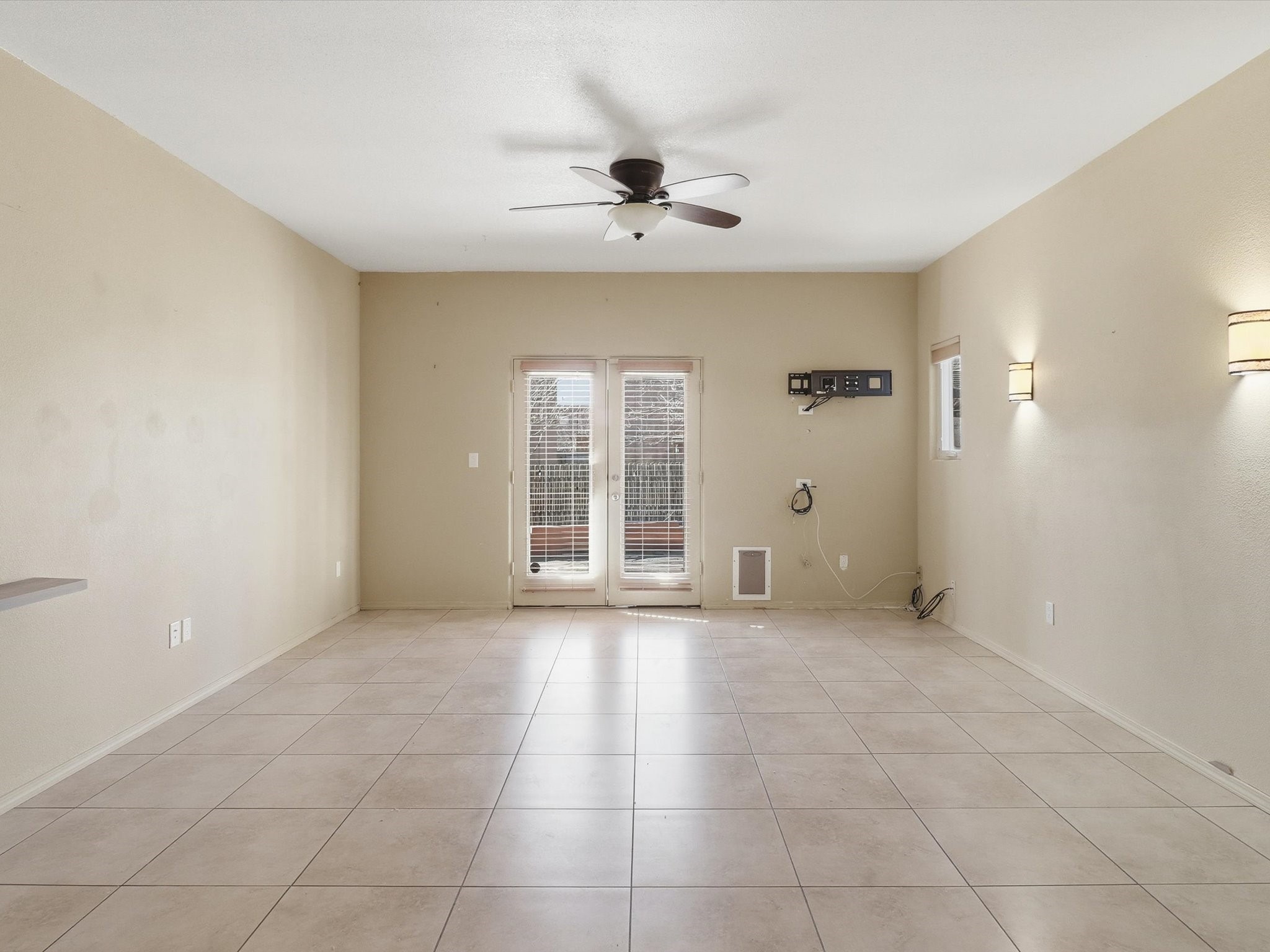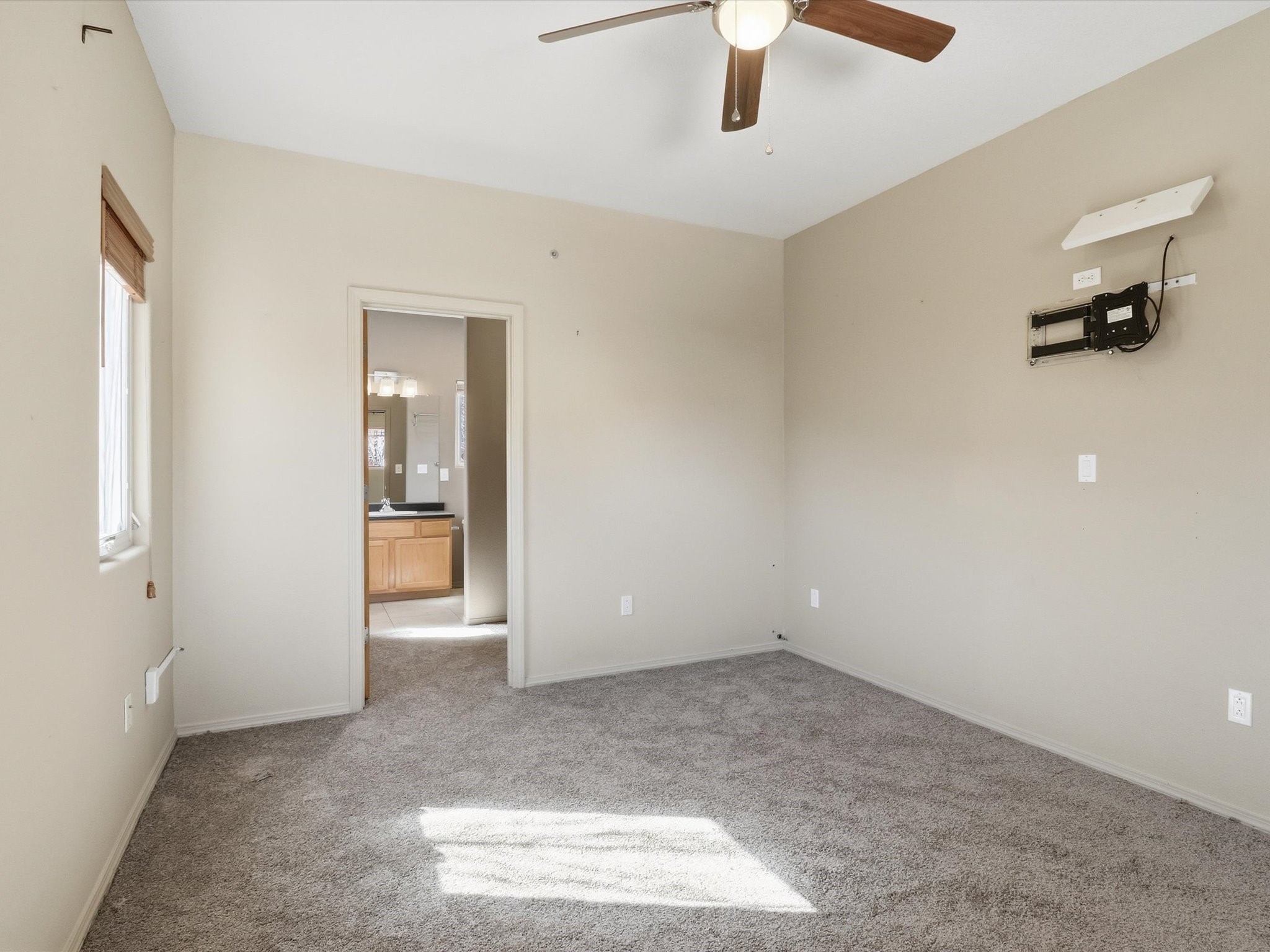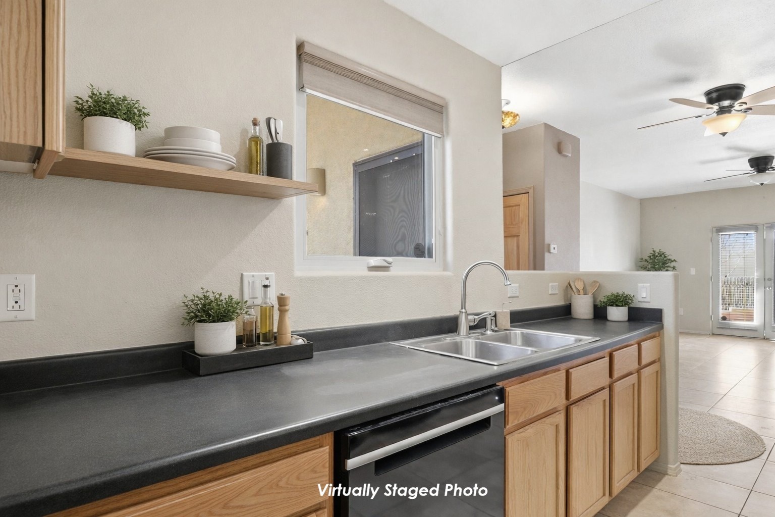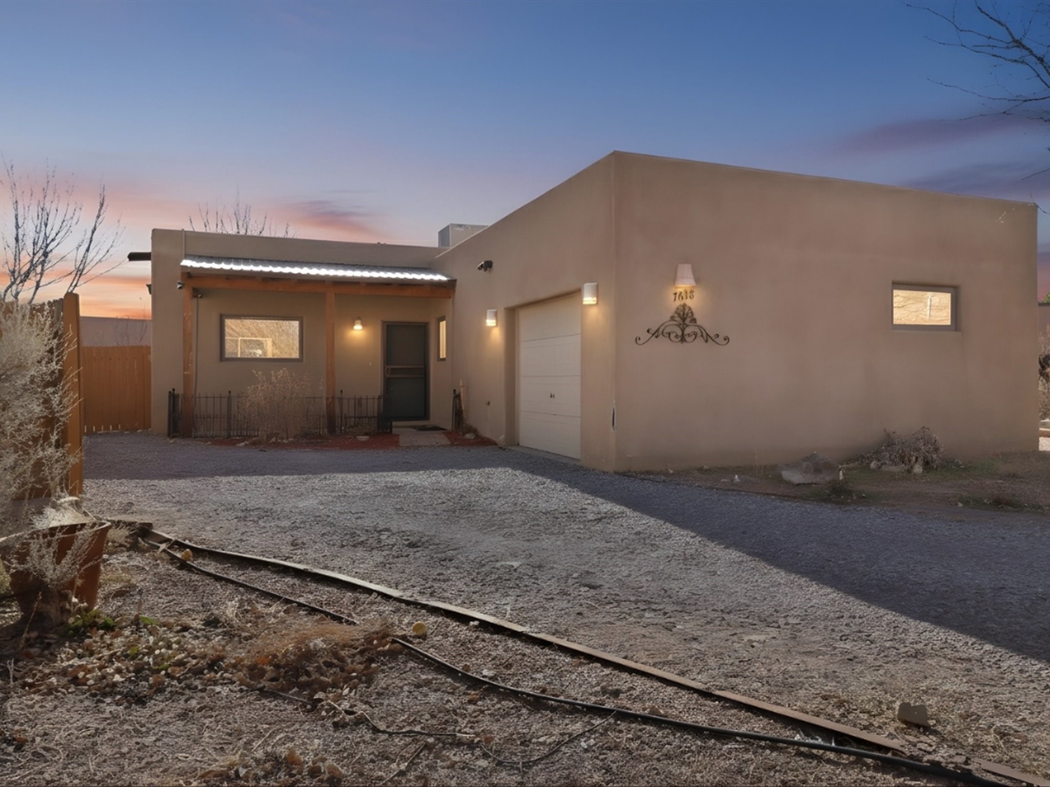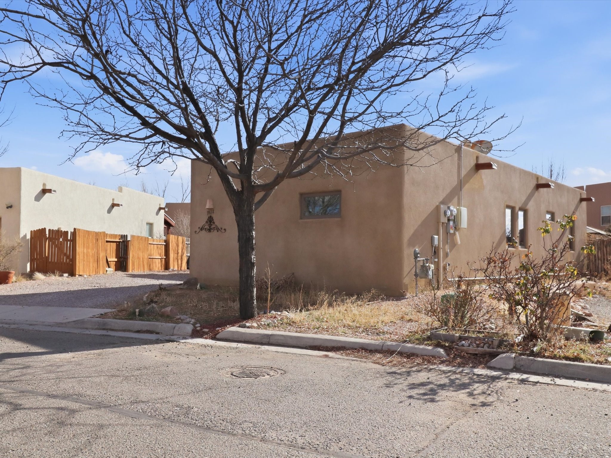 Not far from Santa Fe Country Club, this home offers a blend of comfort, style, renewable energy and Affordability. The practical open floor concept seamlessly connects the kitchen, living room, and dining area, allowing natural light to fill the space and creating a warm, inviting atmosphere.From the main entrance, you're greeted with thoughtful flow--to your right, a private kitchen area featuring ample cabinets for storage, a dishwasher, gas stove, and fridge, and direct access to the laundry room, making daily chores effortless. From the kitchen, step straight into the living space, which opens through a small, covered portal to the backyard with a flagstone patio and pergola, ideal for outdoor gatherings or peaceful afternoons in the garden. The home's two wings provide privacy and functionality: Primary suite: A serene retreat with an attached bathroom and open walk-in closet, offering comfort and style in equal measure. Second wing: A hallway leading to two additional bedrooms and a full bathroom with direct access from the second bedroom, perfect for family or guests. Additional highlights include radiant heating to keep you cozy during chilly winters, tile flooring to keep feet cool in summer, and an attached garage accessible via the kitchen through the pantry/washroom for easy grocery unloading. Located close to Highway 599 for convenient commuting to Santa Fe downtown, Los Alamos, Albuquerque and airport access, this home is a true Santa Fe gem, combining indoor-outdoor living, natural light, and thoughtful design in a tranquil neighborhood setting.