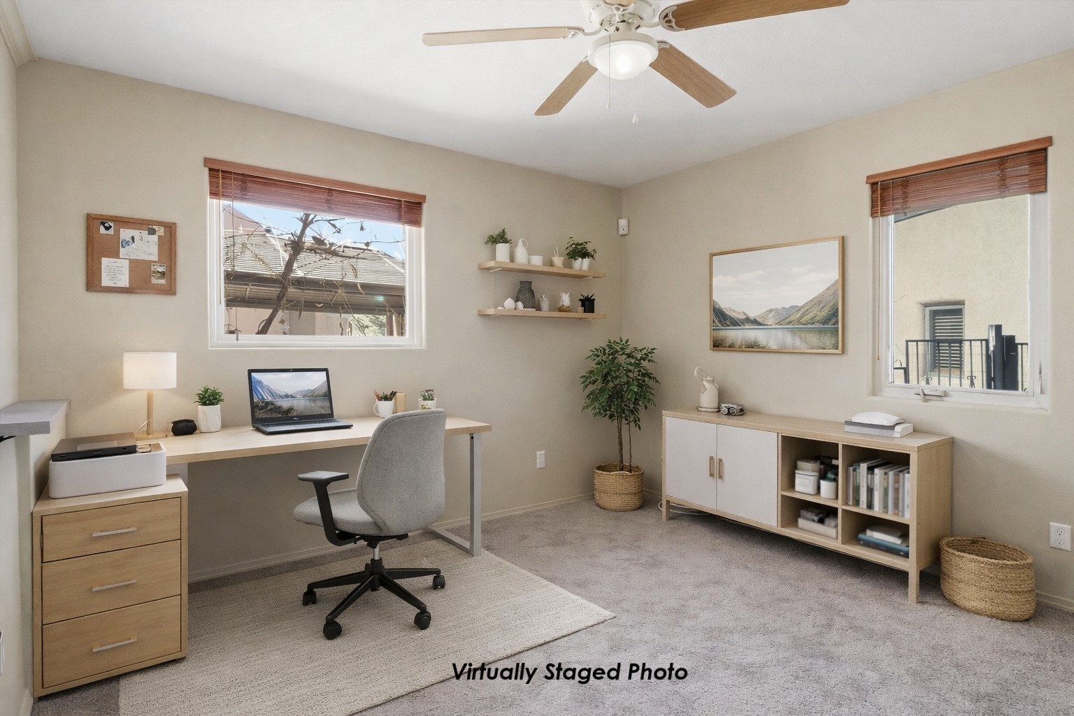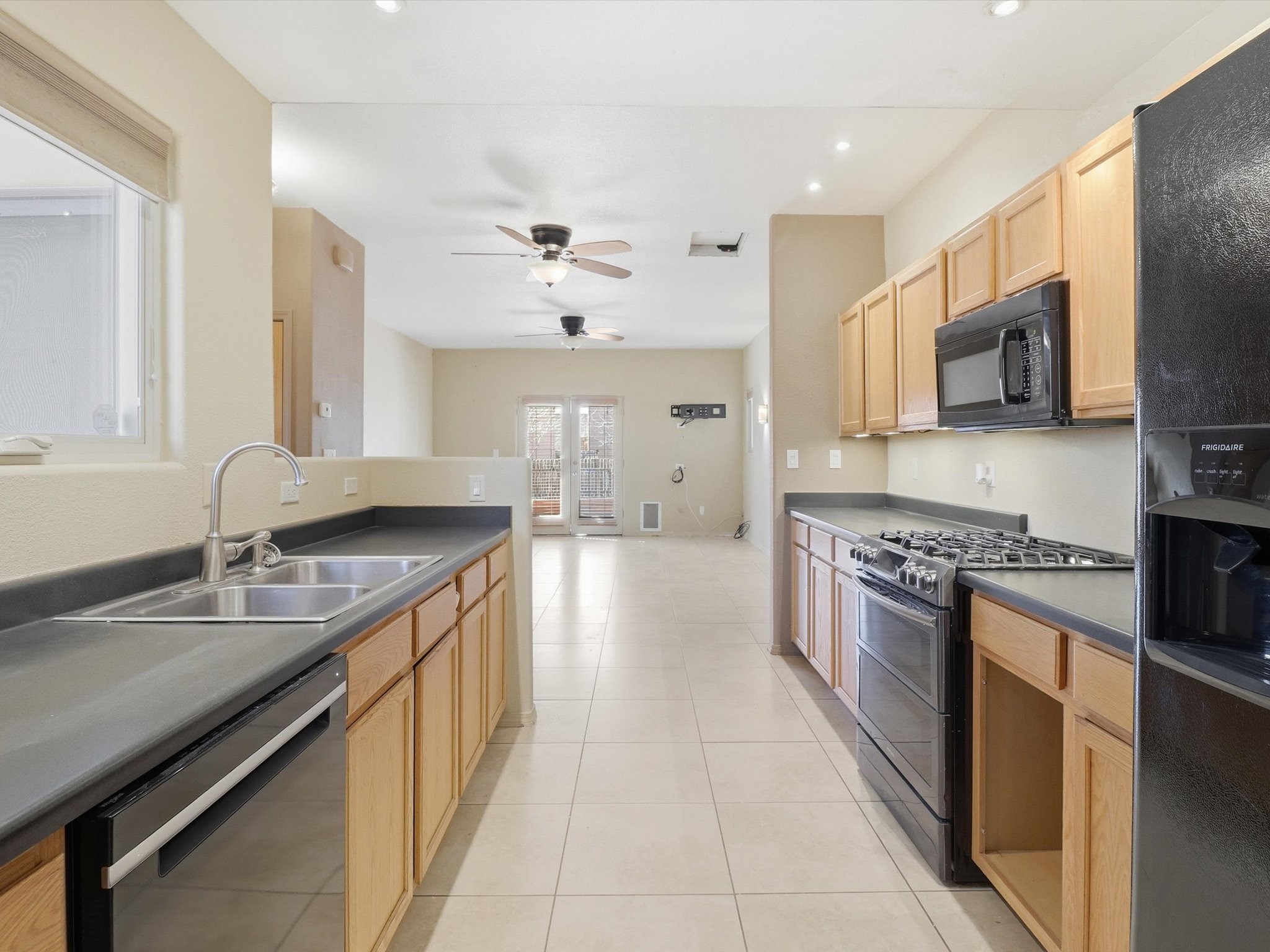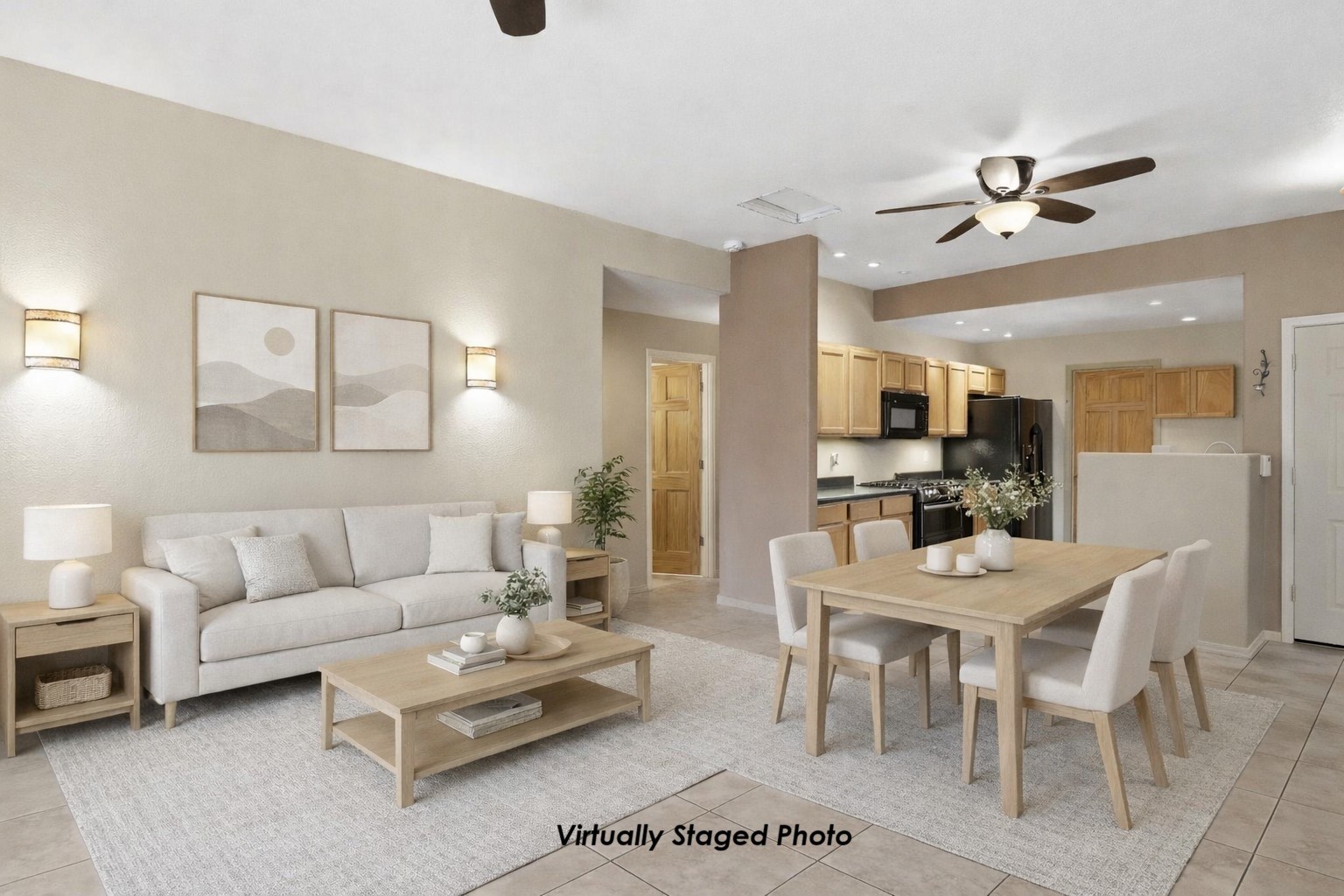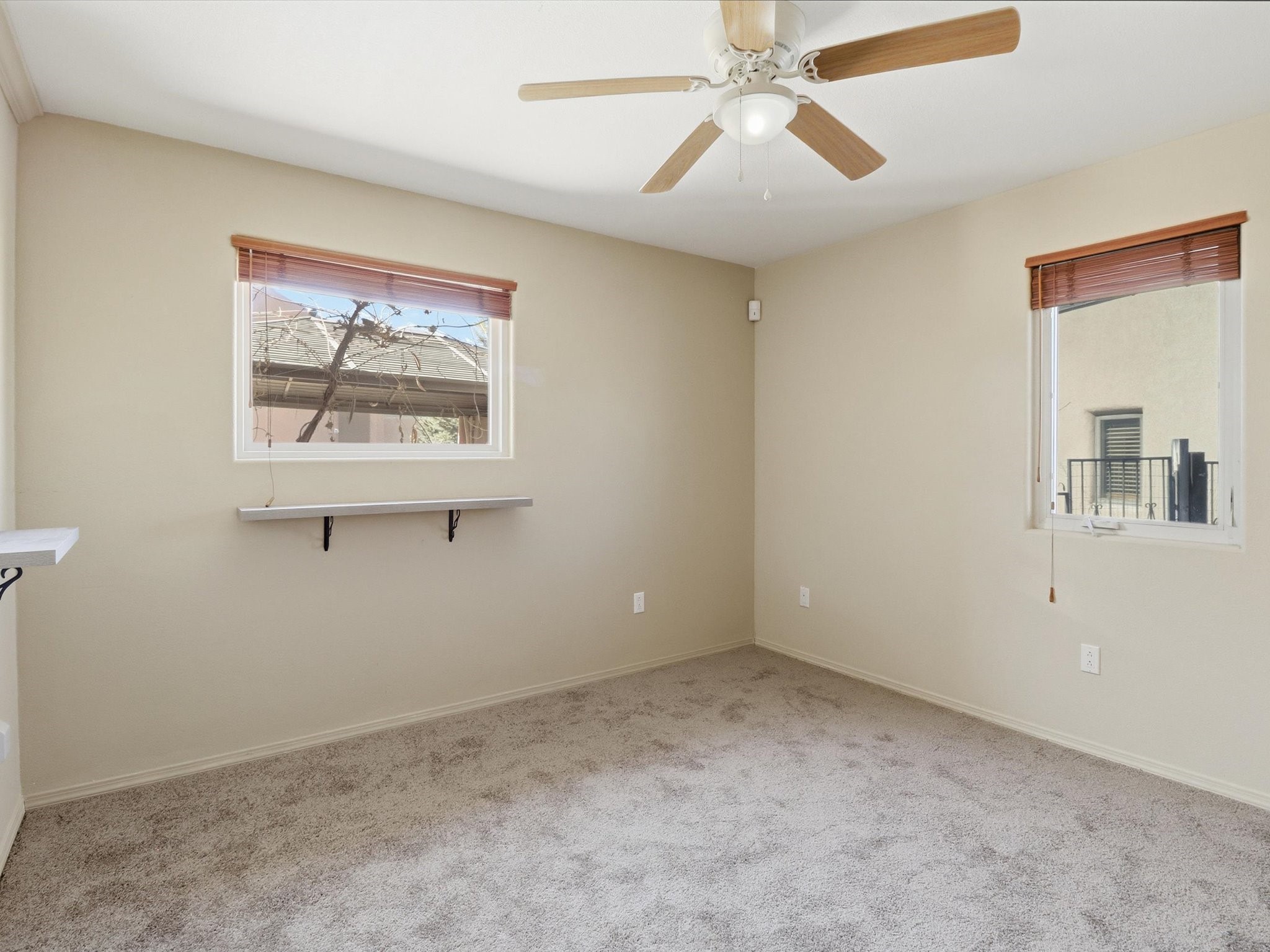 Not far from Santa Fe Country Club, this home offers a blend of comfort, style, renewable energy and Affordability. The practical open floor concept seamlessly connects the kitchen, living room, and dining area, allowing natural light to fill the space and creating a warm, inviting atmosphere.From the main entrance, you're greeted with thoughtful flow--to your right, a private kitchen area featuring ample cabinets for storage, a dishwasher, gas stove, and fridge, and direct access to the laundry room, making daily chores effortless. From the kitchen, step straight into the living space, which opens through a small, covered portal to the backyard with a flagstone patio and pergola, ideal for outdoor gatherings or peaceful afternoons in the garden. The home's two wings provide privacy and functionality: Primary suite: A serene retreat with an attached bathroom and open walk-in closet, offering comfort and style in equal measure. Second wing: A hallway leading to two additional bedrooms and a full bathroom with direct access from the second bedroom, perfect for family or guests. Additional highlights include radiant heating to keep you cozy during chilly winters, tile flooring to keep feet cool in summer, and an attached garage accessible via the kitchen through the pantry/washroom for easy grocery unloading. Located close to Highway 599 for convenient commuting to Santa Fe downtown, Los Alamos, Albuquerque and airport access, this home is a true Santa Fe gem, combining indoor-outdoor living, natural light, and thoughtful design in a tranquil neighborhood setting.