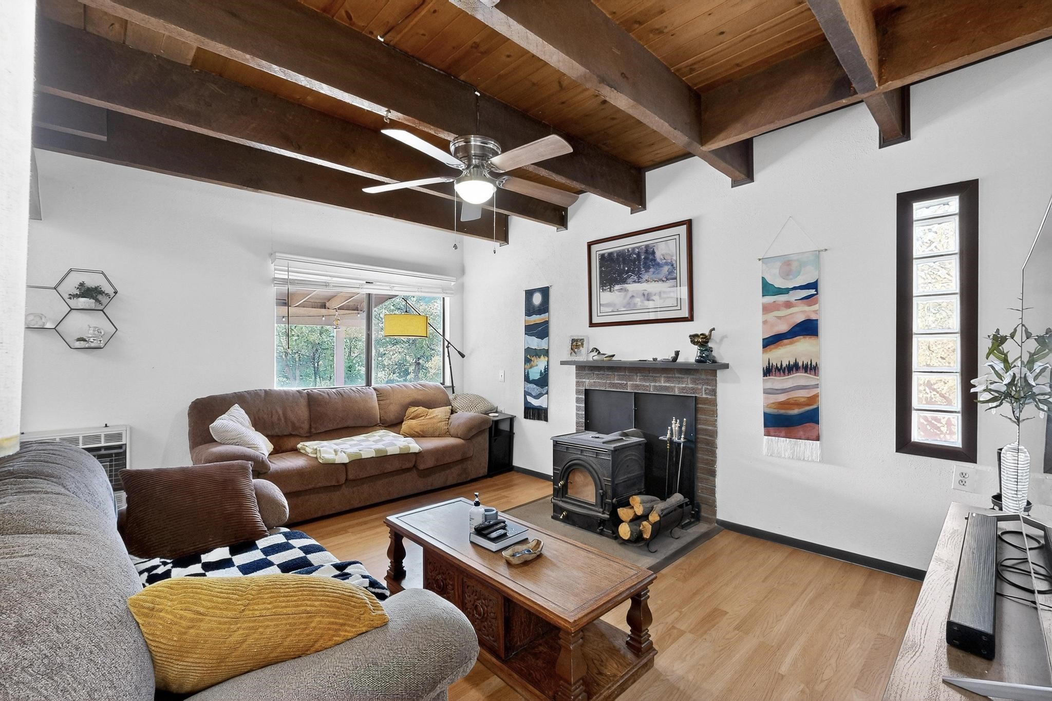 Nature lovers' dream home alert! Escape from the hustle and bustle in this clean, cozy mountain retreat with spectacular unobstructed views of the majestic Jemez Valley. Nestled in the pines, this hard-to-find gem of a home offers modern comforts with the mini-split system, or warm up next to the wood-burning stove, relish the abundant natural light throughout, and sip your morning coffee in the country kitchen or entertain guests in the tucked-away bar/recreation area in the basement. Upstairs you'll find two generously sized bedrooms with perfectly positioned viewing windows. You'll be seeing yourself right on home, soaking up the fresh air on your oversized covered deck, staying busy in your attached 2-car garage/workshop, or taking the short walk to the river! A MUST SEE!