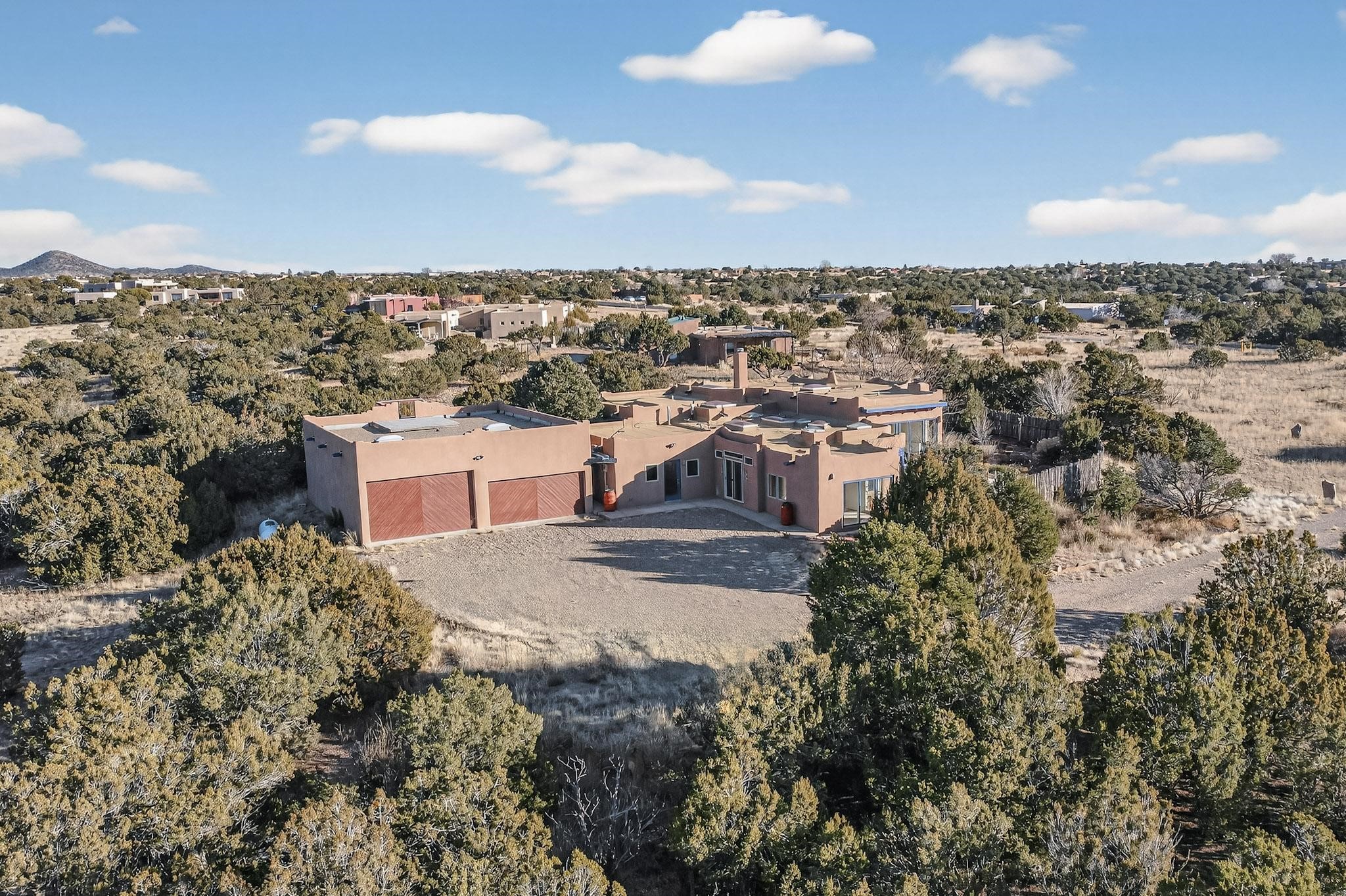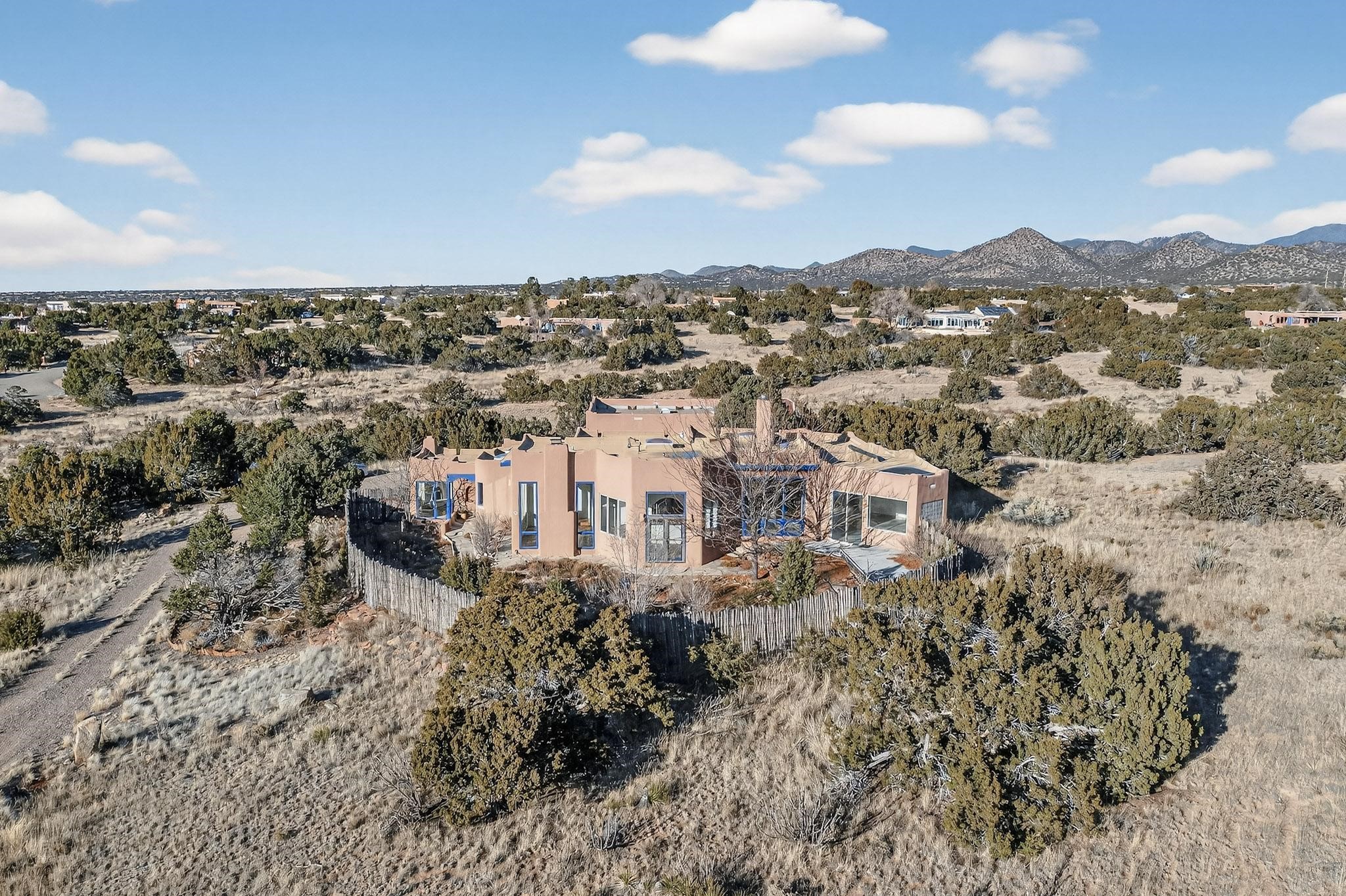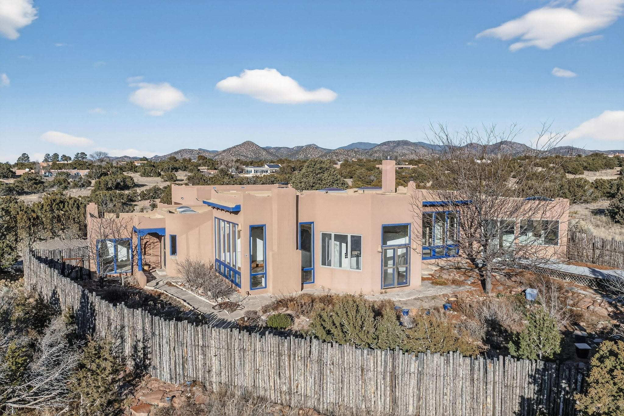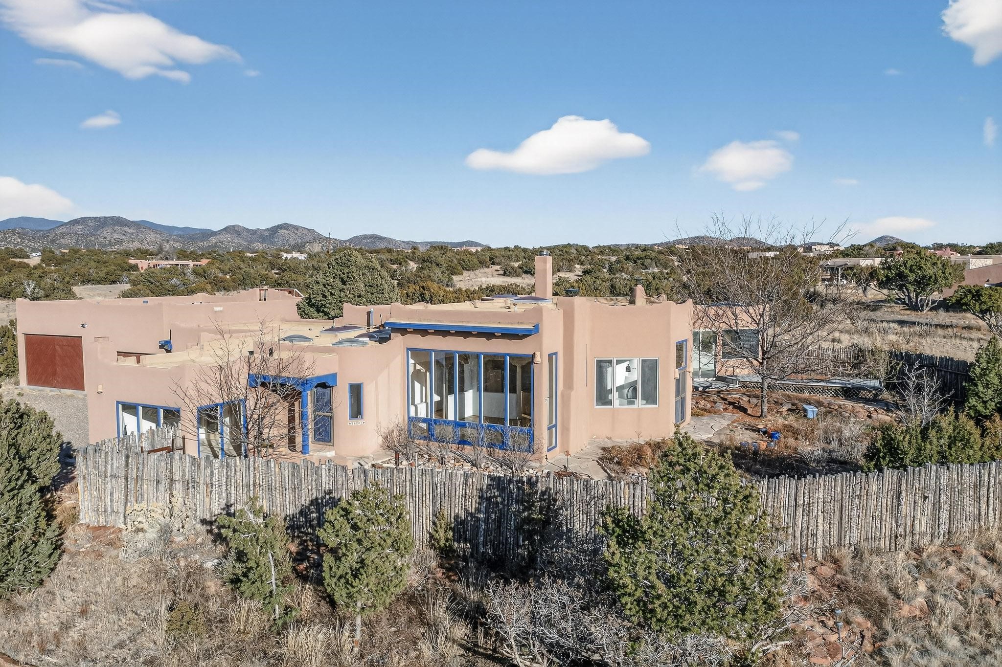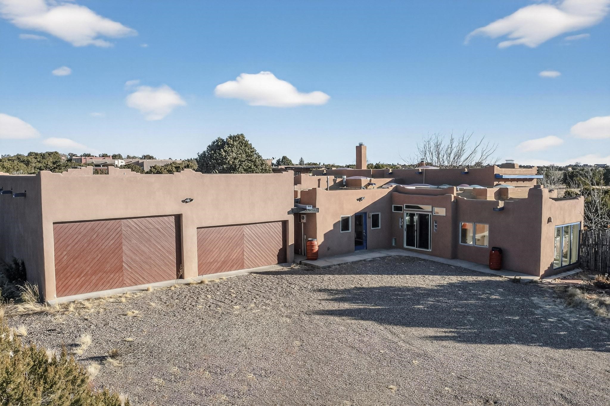 Lovely Eldorado home, situated on an expansive and beautifully landscaped almost 2-acre lot, is filled with natural light and exudes Santa Fe charm. Enjoy panoramic mountain views and amazing sunsets from inside the home and multiple outdoor areas enclosed by coyote fencing and flagstone walk-ways. Offering 2 bedrooms and 2 bathrooms with approximately 2800 square feet, the home features versatile areas perfect for a range of uses. A heated flex space (with gas stove) with appx 390 sqft, separate entrance and direct access to the home provides the ideal setting for a studio, office, workout room, or playroom. Off the spacious primary suite, you'll find a cozy office or sitting room with built-in desk space, as well as a large, light-filled appx 550 sqft unheated room with direct outdoor access--perfect as a work-out room, sitting/TV area, or relaxation space. There is ample storage throughout. The inviting living room boasts soaring ceilings with vigas, a kiva fireplace, and abundant natural light. The owner's suite includes a fireplace and ensuite bath with separate tub and large walk-in show all offering a serene retreat. Car enthusiasts will love the oversized garage (approx. 1,365 sq ft) with room for up to six cars & possibly an RV. Additional highlights include: 4 fireplaces-Abundant skylights-Radiant heat (we have been told not Kitec or Entran II)-Wood doors-Large laundry room with closet & washer/dryer-Saltillo tile floors-Rooftop viewing deck-Vigas in almost every room including bathrooms-Nichos-Banco-Corbels-Archways-Ceiling fans-Newly paved Frasco Rd-Multiple decks and sitting areas and more. This unique property combines Southwestern character with extraordinary versatility and spectacular views.