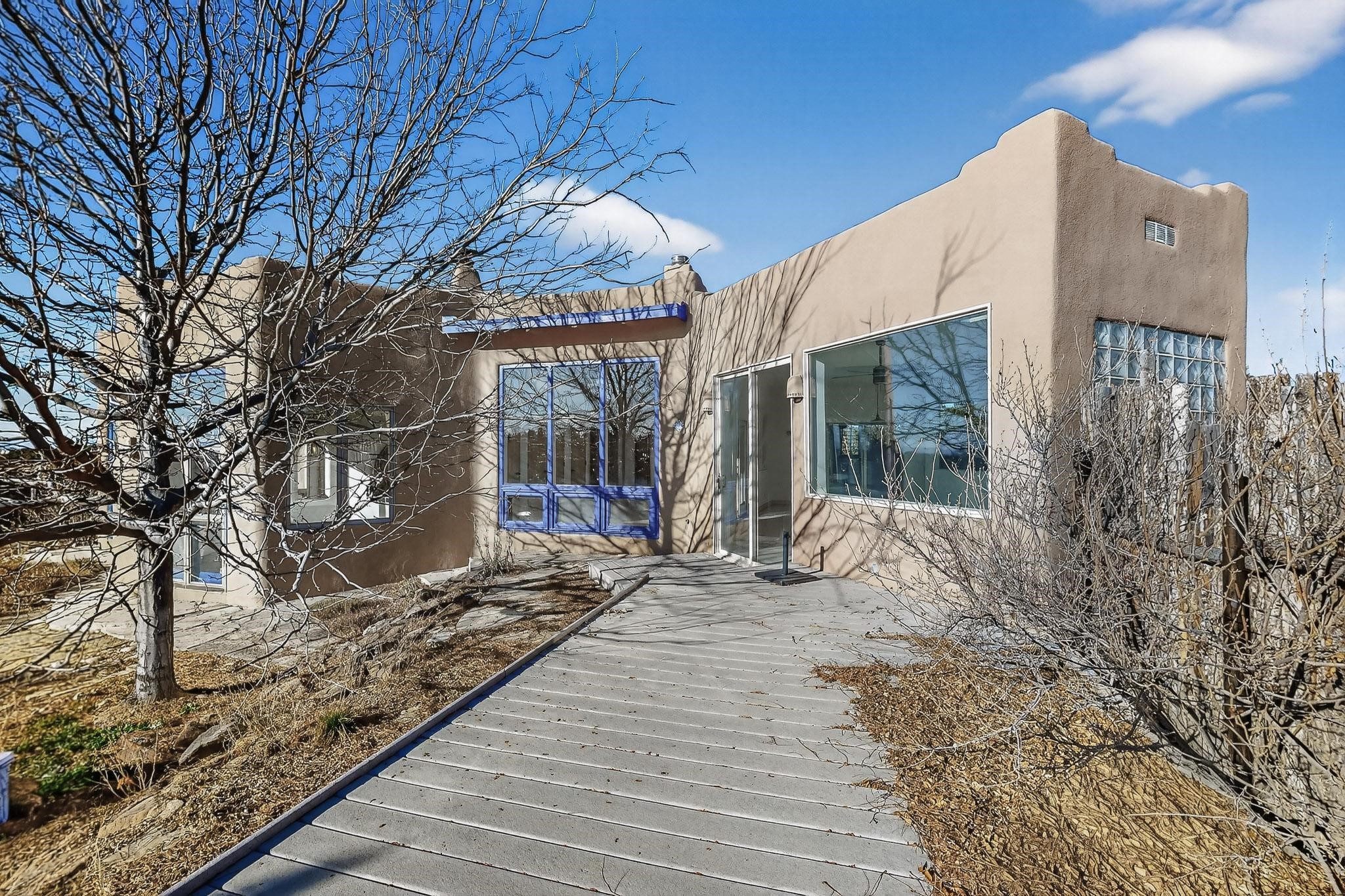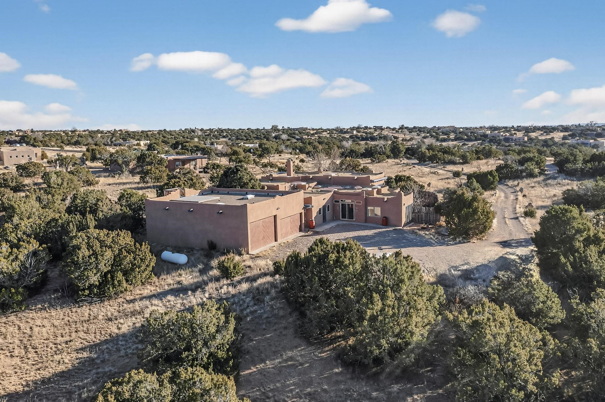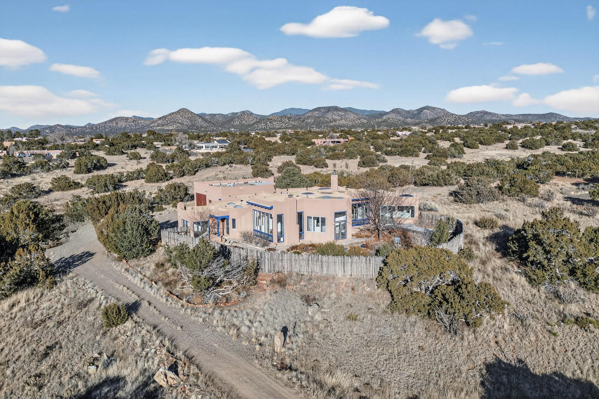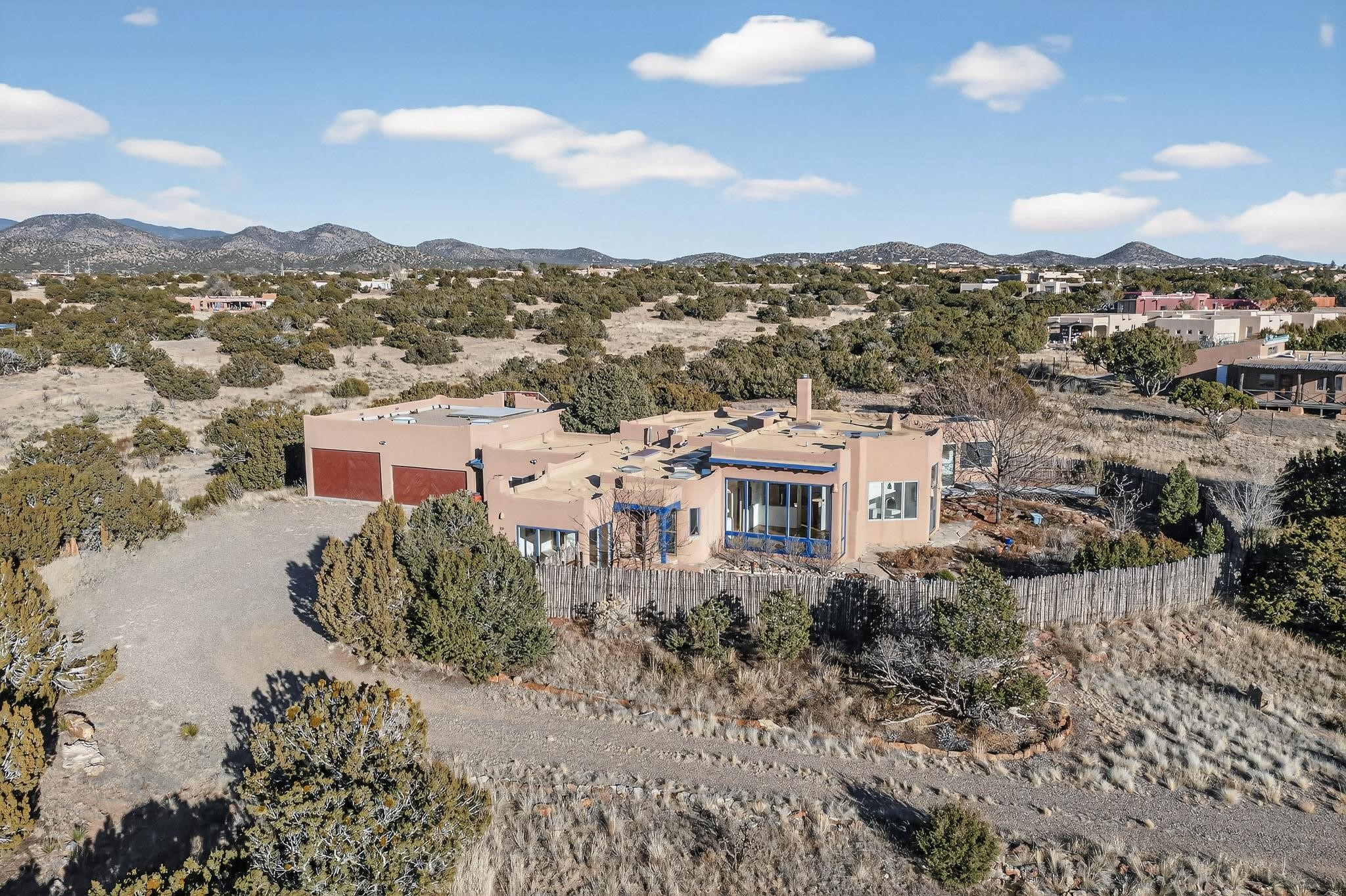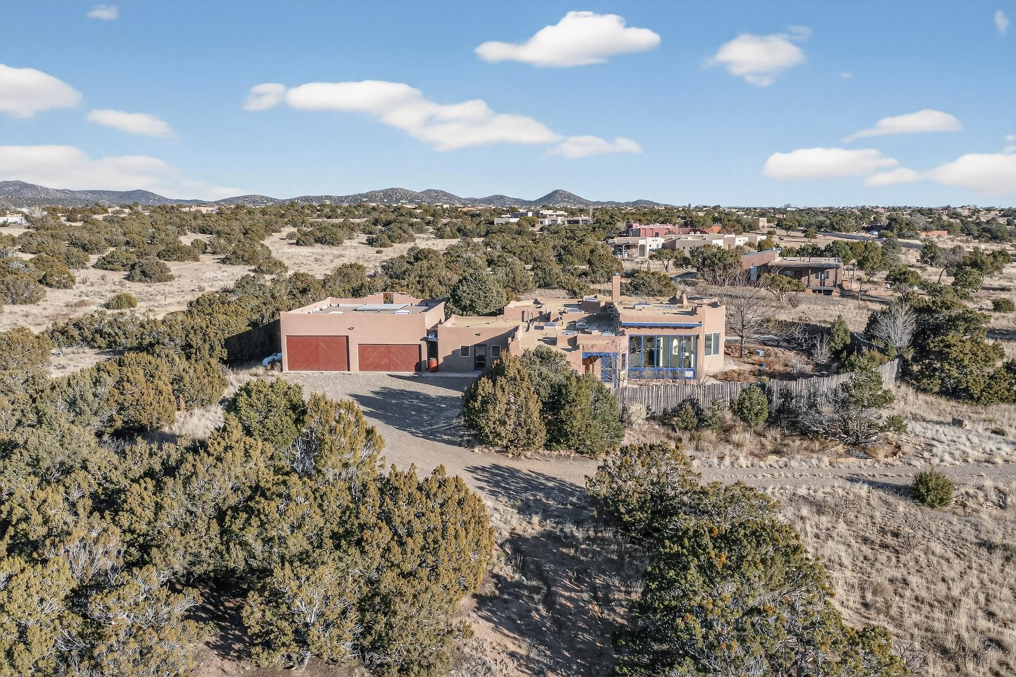 Lovely Eldorado home, situated on an expansive and beautifully landscaped almost 2-acre lot, is filled with natural light and exudes Santa Fe charm. Enjoy panoramic mountain views and amazing sunsets from inside the home and multiple outdoor areas enclosed by coyote fencing and flagstone walk-ways. Offering 2 bedrooms and 2 bathrooms with approximately 2800 square feet, the home features versatile areas perfect for a range of uses. A heated flex space (with gas stove) with appx 390 sqft, separate entrance and direct access to the home provides the ideal setting for a studio, office, workout room, or playroom. Off the spacious primary suite, you'll find a cozy office or sitting room with built-in desk space, as well as a large, light-filled appx 550 sqft unheated room with direct outdoor access--perfect as a work-out room, sitting/TV area, or relaxation space. There is ample storage throughout. The inviting living room boasts soaring ceilings with vigas, a kiva fireplace, and abundant natural light. The owner's suite includes a fireplace and ensuite bath with separate tub and large walk-in show all offering a serene retreat. Car enthusiasts will love the oversized garage (approx. 1,365 sq ft) with room for up to six cars & possibly an RV. Additional highlights include: 4 fireplaces-Abundant skylights-Radiant heat (we have been told not Kitec or Entran II)-Wood doors-Large laundry room with closet & washer/dryer-Saltillo tile floors-Rooftop viewing deck-Vigas in almost every room including bathrooms-Nichos-Banco-Corbels-Archways-Ceiling fans-Newly paved Frasco Rd-Multiple decks and sitting areas and more. This unique property combines Southwestern character with extraordinary versatility and spectacular views.