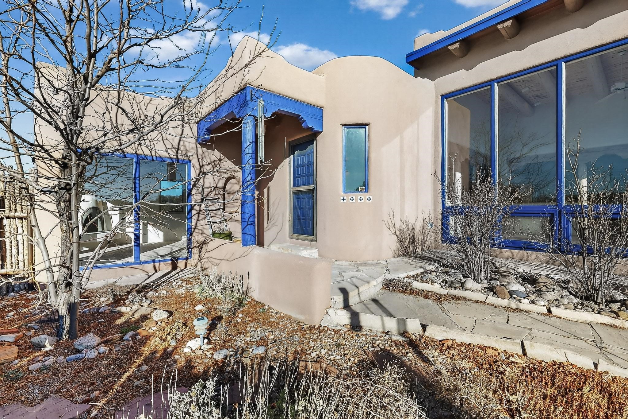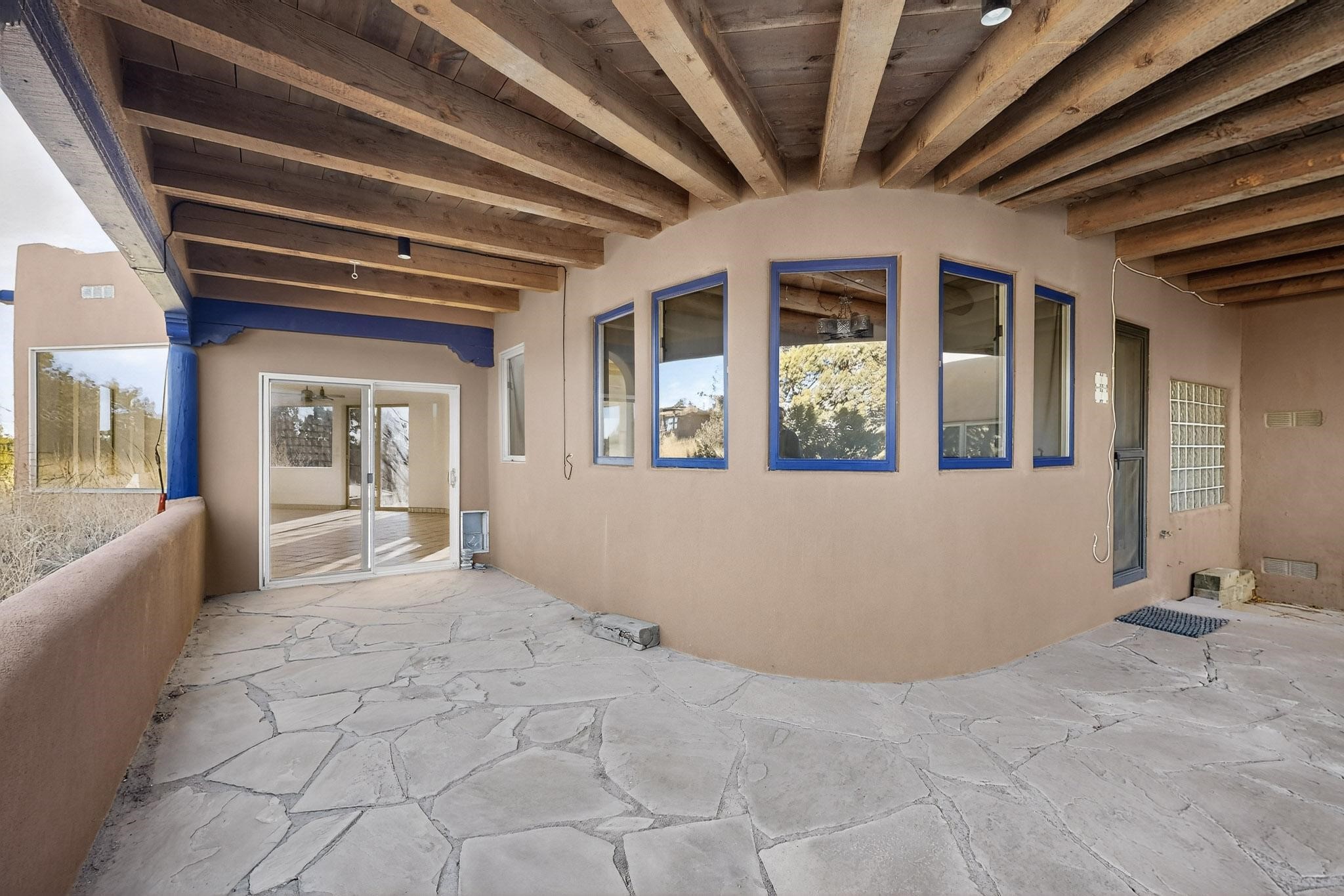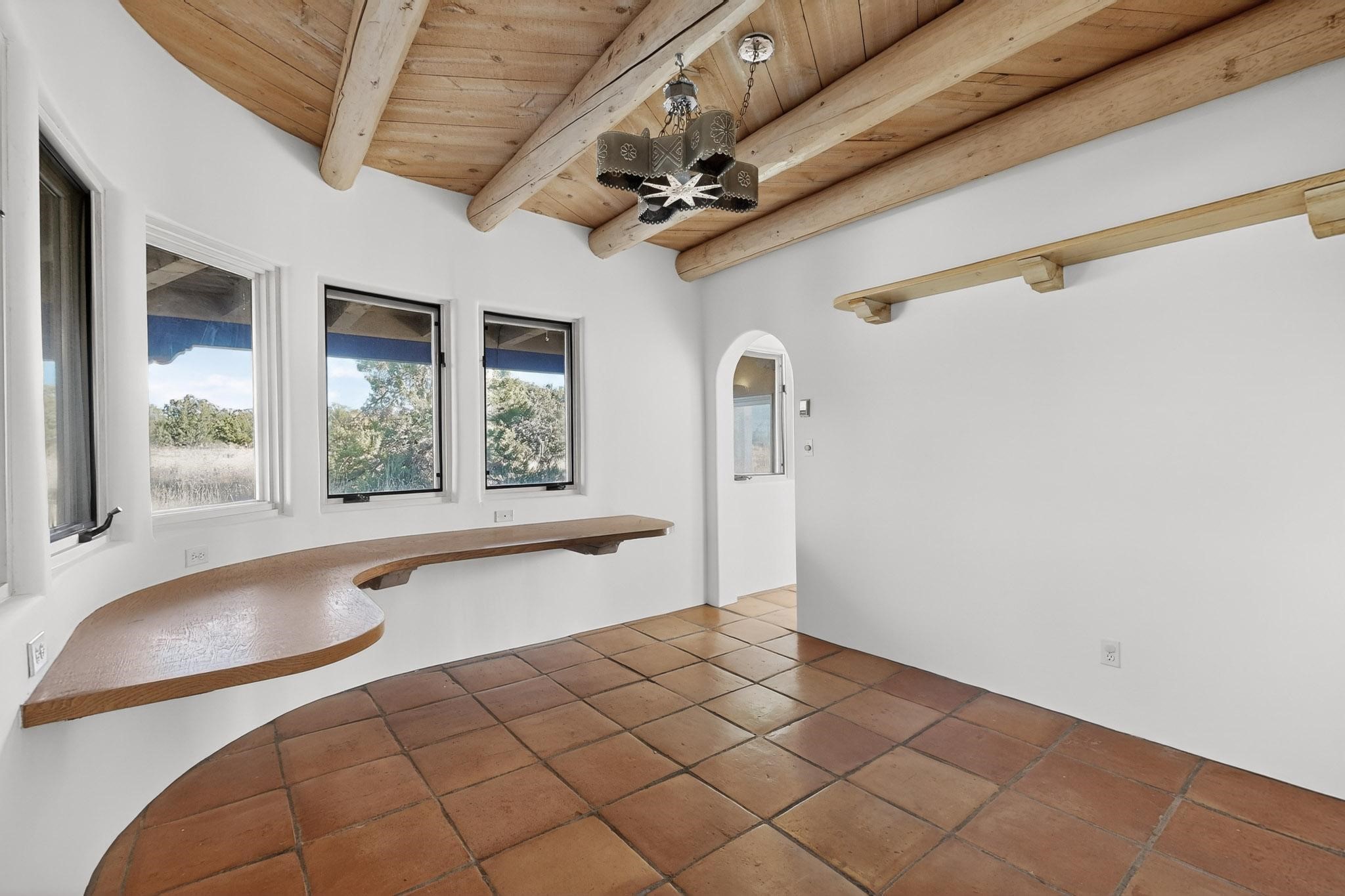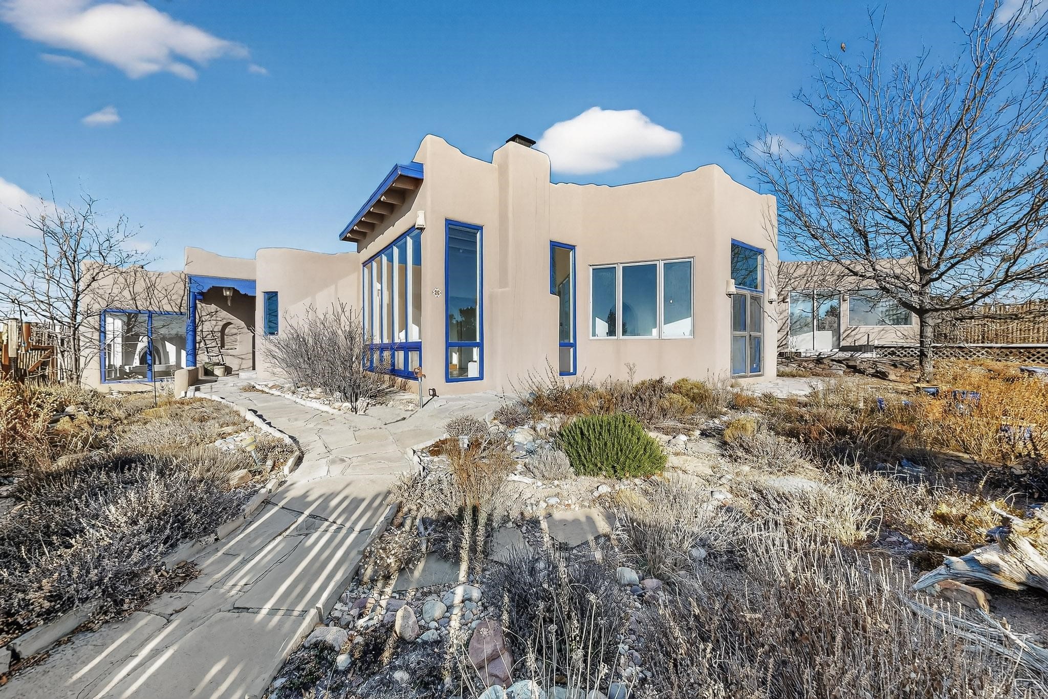 Lovely Eldorado home, situated on an expansive and beautifully landscaped almost 2-acre lot, is filled with natural light and exudes Santa Fe charm. Enjoy panoramic mountain views and amazing sunsets from inside the home and multiple outdoor areas enclosed by coyote fencing and flagstone walk-ways. Offering 2 bedrooms and 2 bathrooms with approximately 2800 square feet, the home features versatile areas perfect for a range of uses. A heated flex space (with gas stove) with appx 390 sqft, separate entrance and direct access to the home provides the ideal setting for a studio, office, workout room, or playroom. Off the spacious primary suite, you'll find a cozy office or sitting room with built-in desk space, as well as a large, light-filled appx 550 sqft unheated room with direct outdoor access--perfect as a work-out room, sitting/TV area, or relaxation space. There is ample storage throughout. The inviting living room boasts soaring ceilings with vigas, a kiva fireplace, and abundant natural light. The owner's suite includes a fireplace and ensuite bath with separate tub and large walk-in show all offering a serene retreat. Car enthusiasts will love the oversized garage (approx. 1,365 sq ft) with room for up to six cars & possibly an RV. Additional highlights include: 4 fireplaces-Abundant skylights-Radiant heat (we have been told not Kitec or Entran II)-Wood doors-Large laundry room with closet & washer/dryer-Saltillo tile floors-Rooftop viewing deck-Vigas in almost every room including bathrooms-Nichos-Banco-Corbels-Archways-Ceiling fans-Newly paved Frasco Rd-Multiple decks and sitting areas and more. This unique property combines Southwestern character with extraordinary versatility and spectacular views.