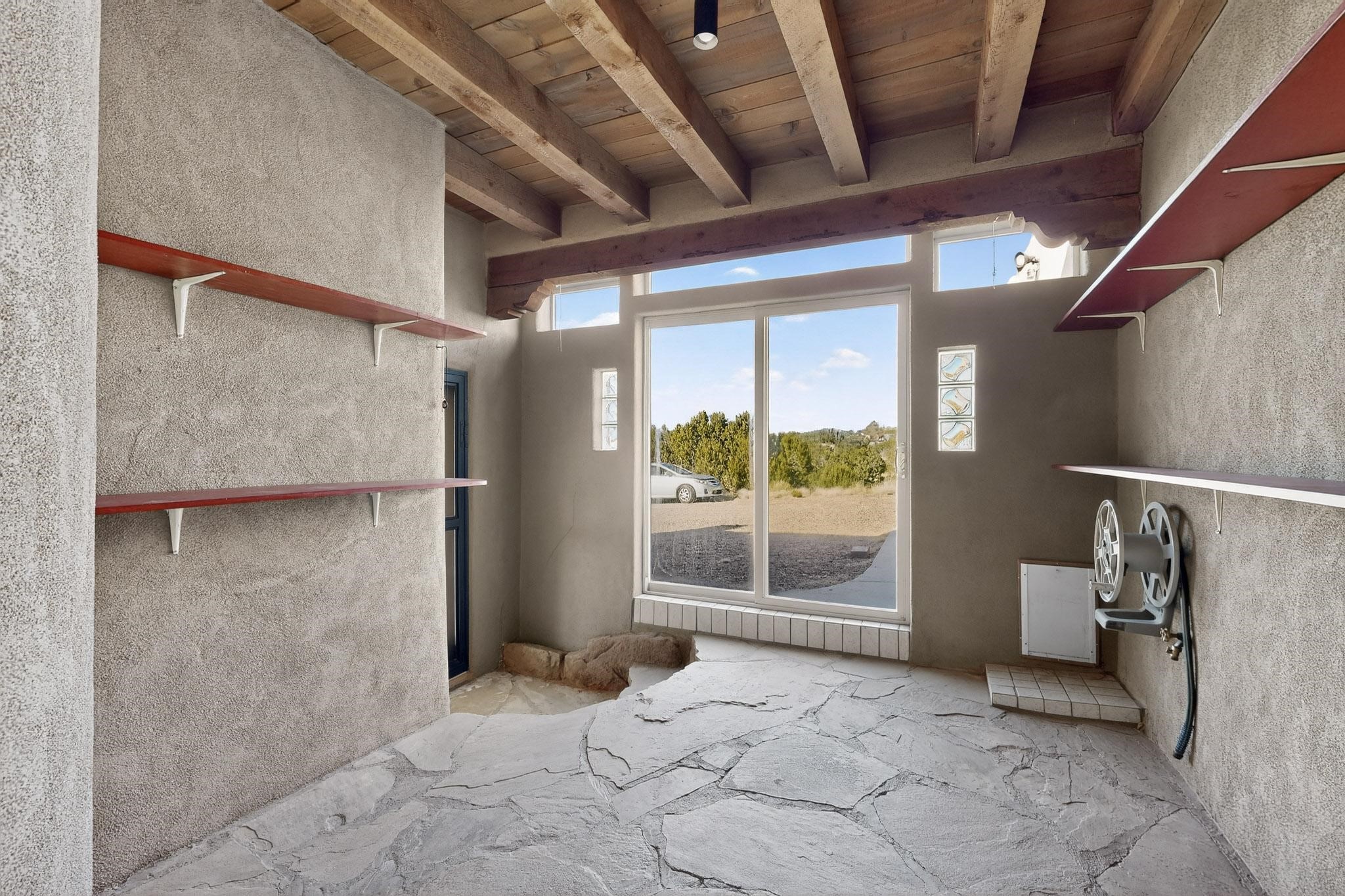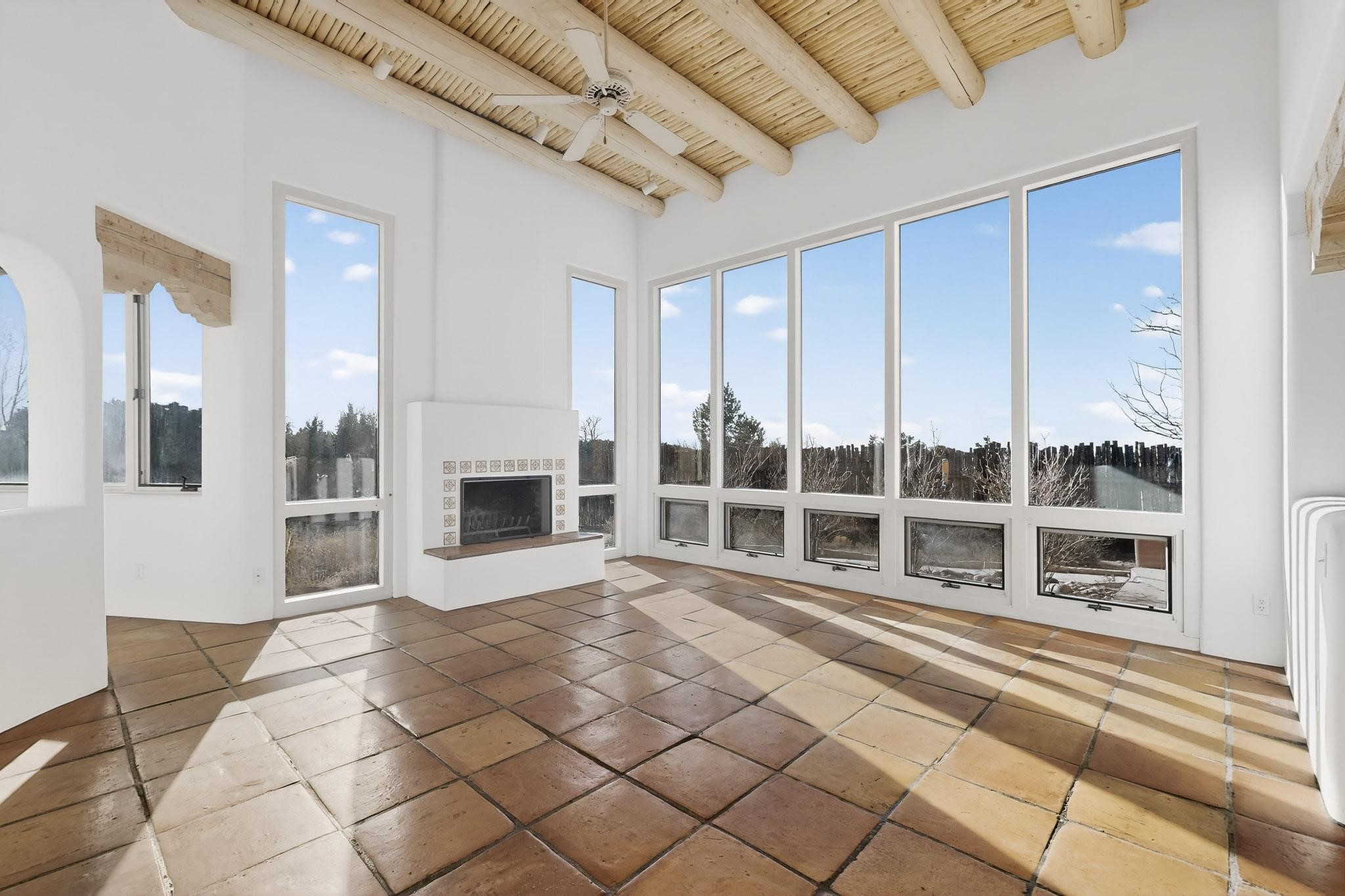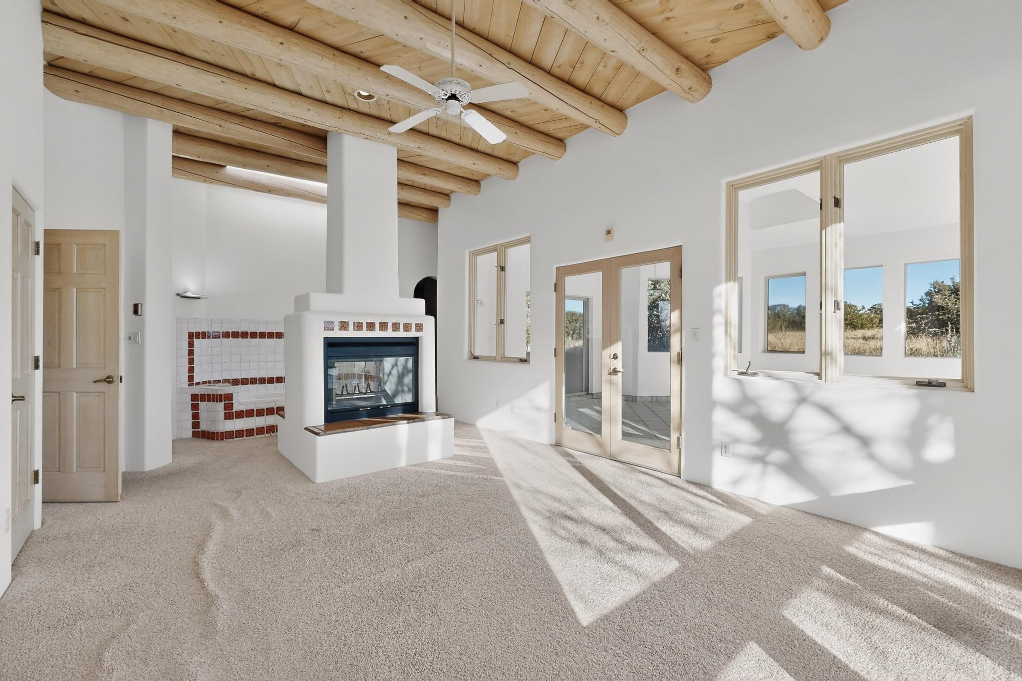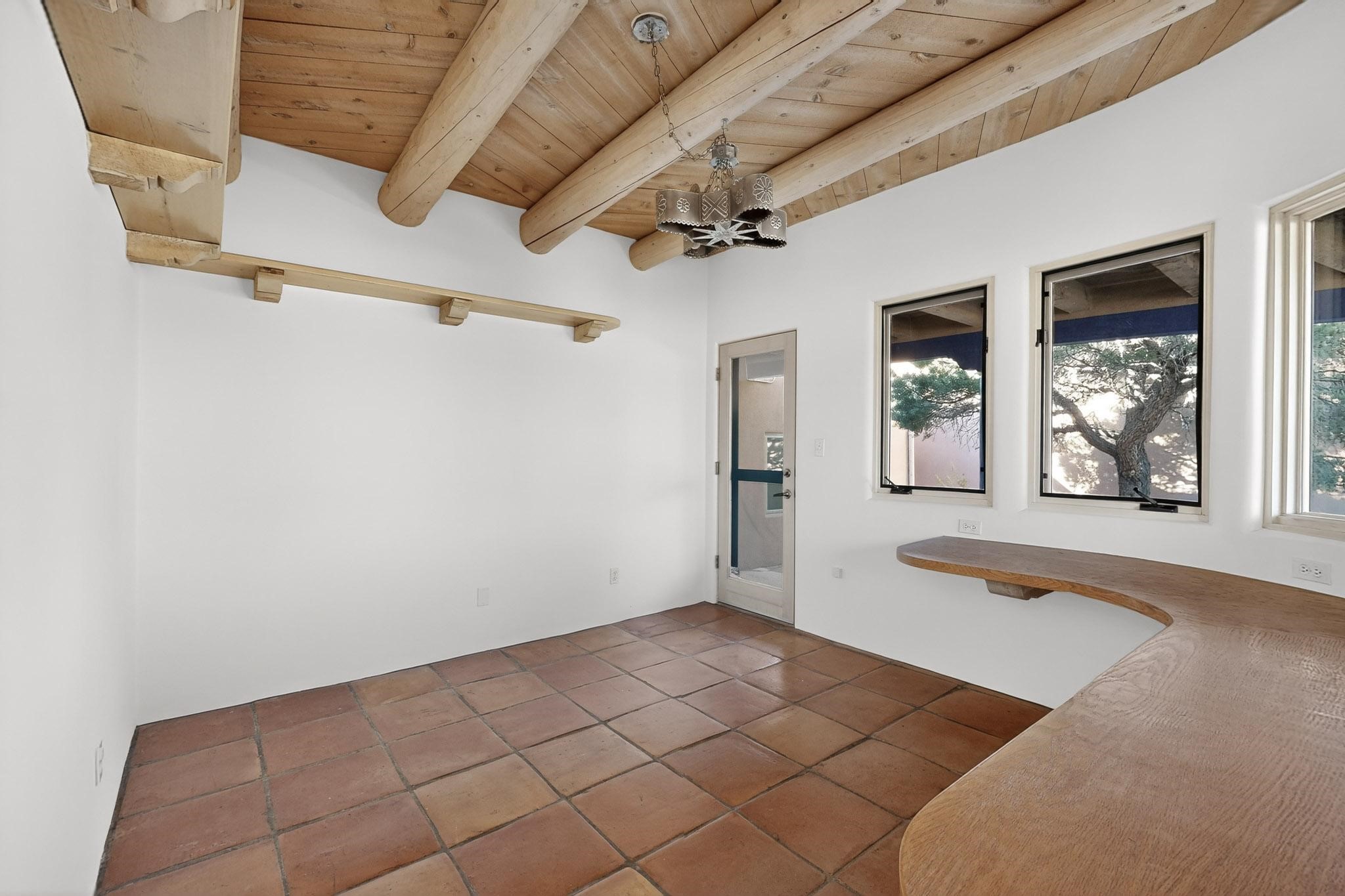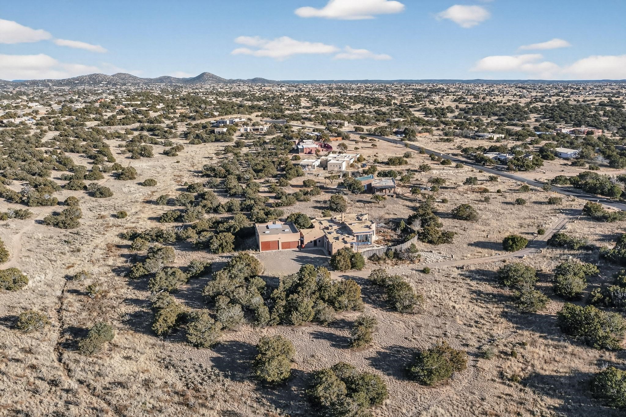 Lovely Eldorado home, situated on an expansive and beautifully landscaped almost 2-acre lot, is filled with natural light and exudes Santa Fe charm. Enjoy panoramic mountain views and amazing sunsets from inside the home and multiple outdoor areas enclosed by coyote fencing and flagstone walk-ways. Offering 2 bedrooms and 2 bathrooms with approximately 2800 square feet, the home features versatile areas perfect for a range of uses. A heated flex space (with gas stove) with appx 390 sqft, separate entrance and direct access to the home provides the ideal setting for a studio, office, workout room, or playroom. Off the spacious primary suite, you'll find a cozy office or sitting room with built-in desk space, as well as a large, light-filled appx 550 sqft unheated room with direct outdoor access--perfect as a work-out room, sitting/TV area, or relaxation space. There is ample storage throughout. The inviting living room boasts soaring ceilings with vigas, a kiva fireplace, and abundant natural light. The owner's suite includes a fireplace and ensuite bath with separate tub and large walk-in show all offering a serene retreat. Car enthusiasts will love the oversized garage (approx. 1,365 sq ft) with room for up to six cars & possibly an RV. Additional highlights include: 4 fireplaces-Abundant skylights-Radiant heat (we have been told not Kitec or Entran II)-Wood doors-Large laundry room with closet & washer/dryer-Saltillo tile floors-Rooftop viewing deck-Vigas in almost every room including bathrooms-Nichos-Banco-Corbels-Archways-Ceiling fans-Newly paved Frasco Rd-Multiple decks and sitting areas and more. This unique property combines Southwestern character with extraordinary versatility and spectacular views.
