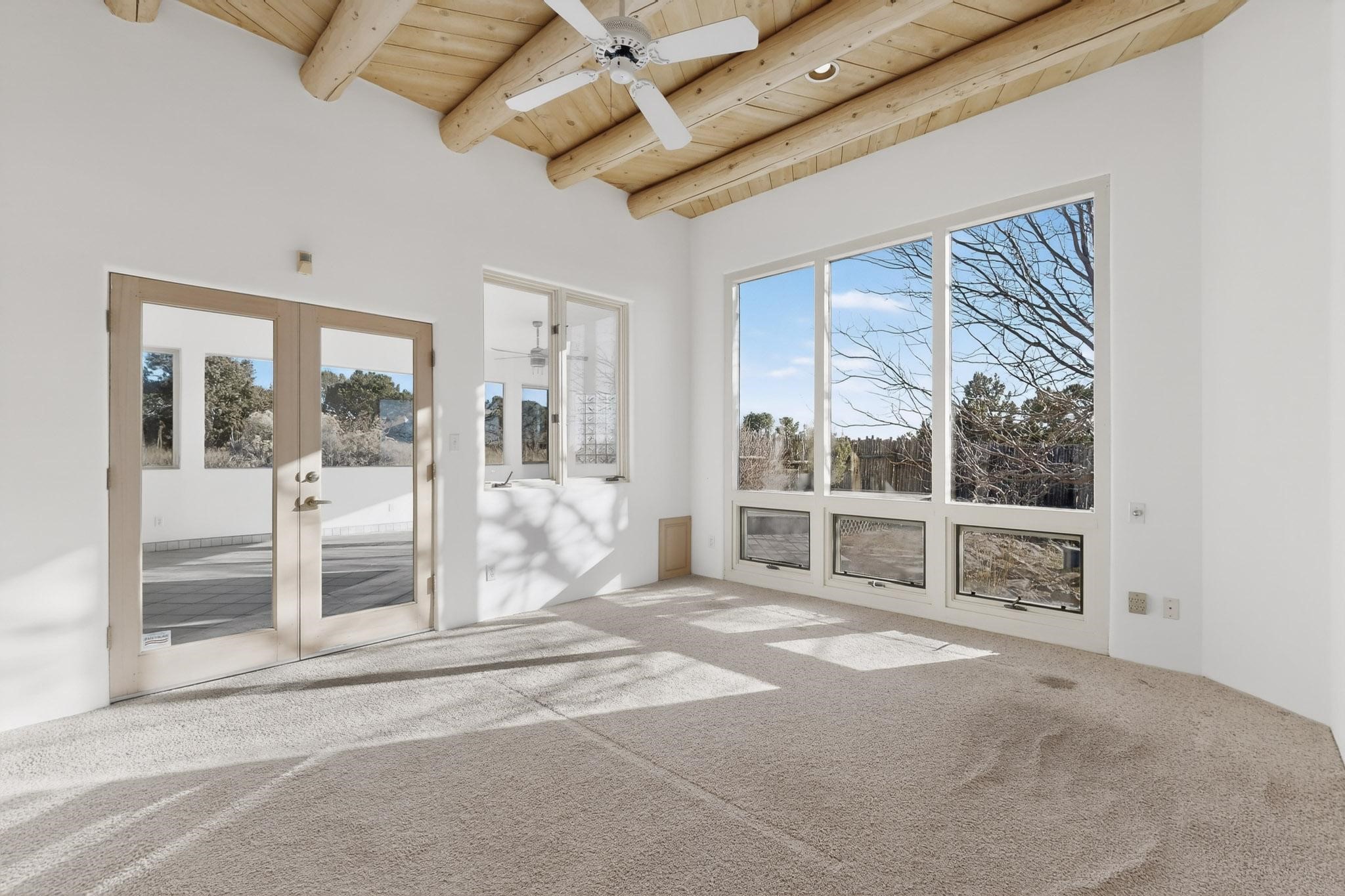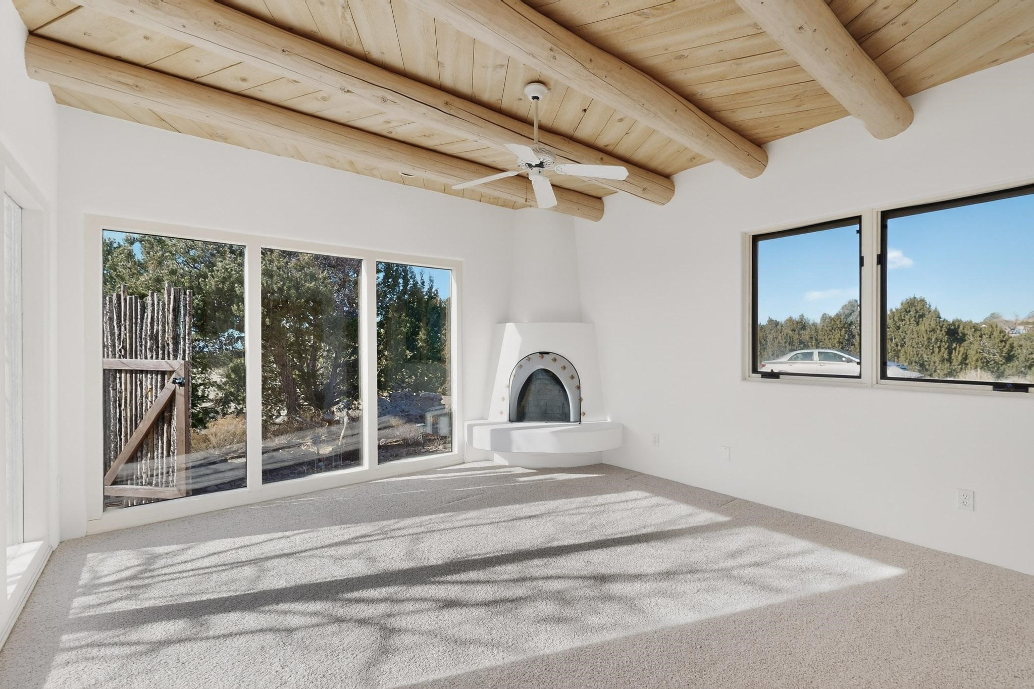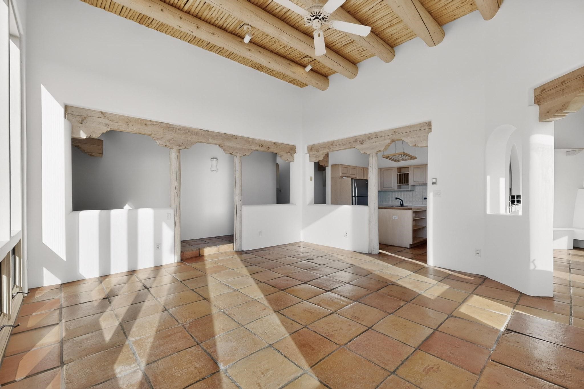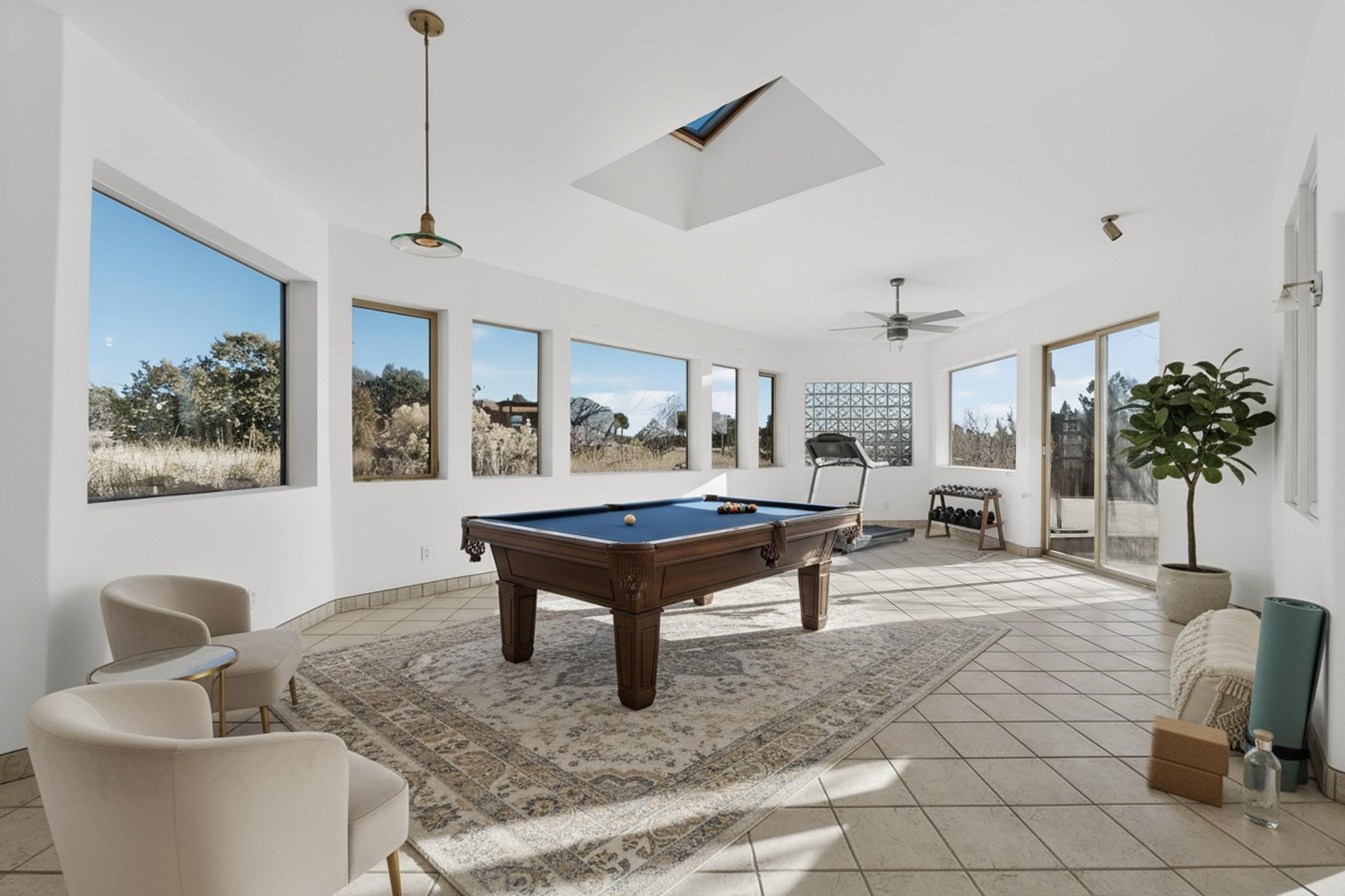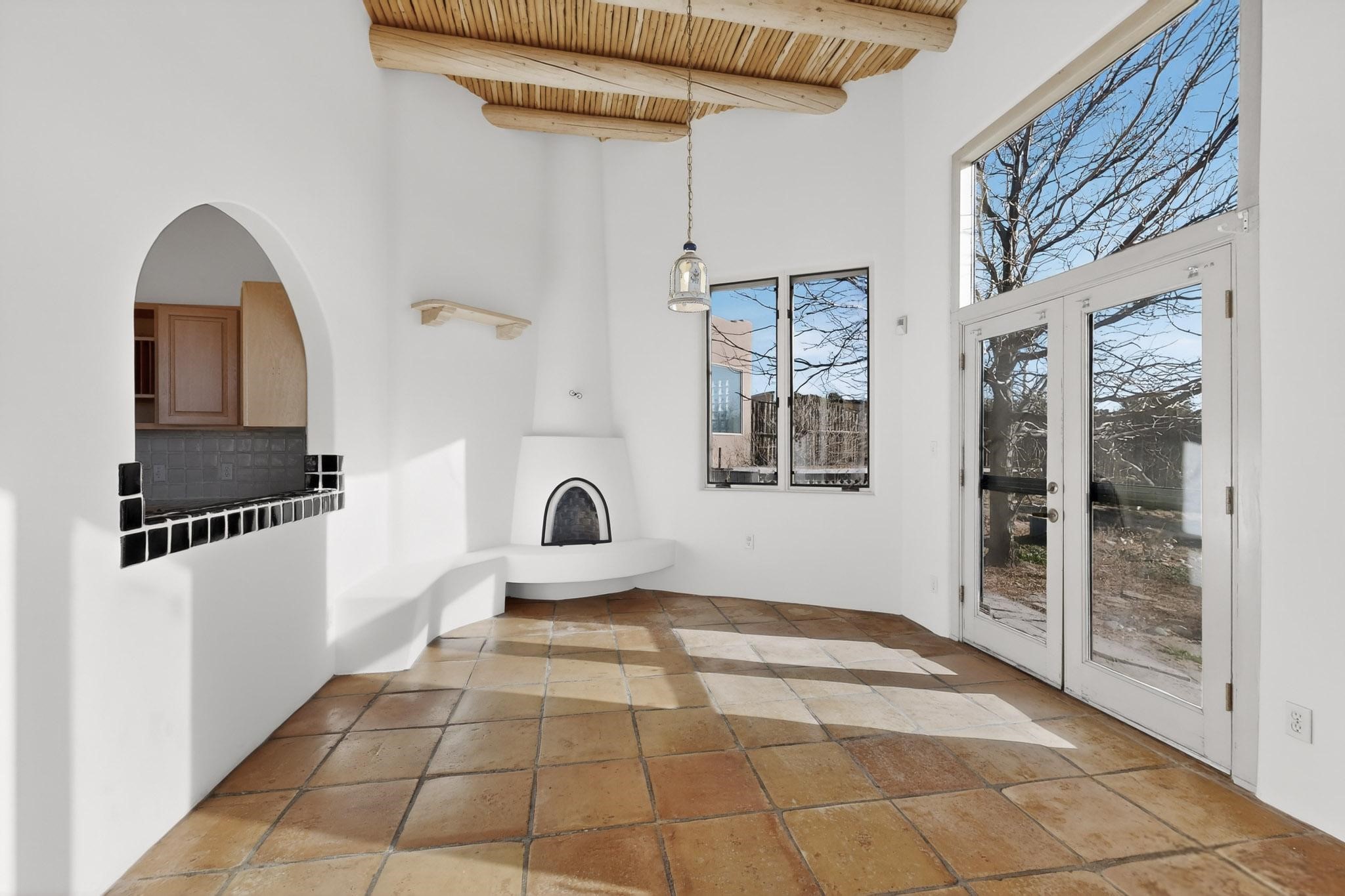 Lovely Eldorado home, situated on an expansive and beautifully landscaped almost 2-acre lot, is filled with natural light and exudes Santa Fe charm. Enjoy panoramic mountain views and amazing sunsets from inside the home and multiple outdoor areas enclosed by coyote fencing and flagstone walk-ways. Offering 2 bedrooms and 2 bathrooms with approximately 2800 square feet, the home features versatile areas perfect for a range of uses. A heated flex space (with gas stove) with appx 390 sqft, separate entrance and direct access to the home provides the ideal setting for a studio, office, workout room, or playroom. Off the spacious primary suite, you'll find a cozy office or sitting room with built-in desk space, as well as a large, light-filled appx 550 sqft unheated room with direct outdoor access--perfect as a work-out room, sitting/TV area, or relaxation space. There is ample storage throughout. The inviting living room boasts soaring ceilings with vigas, a kiva fireplace, and abundant natural light. The owner's suite includes a fireplace and ensuite bath with separate tub and large walk-in show all offering a serene retreat. Car enthusiasts will love the oversized garage (approx. 1,365 sq ft) with room for up to six cars & possibly an RV. Additional highlights include: 4 fireplaces-Abundant skylights-Radiant heat (we have been told not Kitec or Entran II)-Wood doors-Large laundry room with closet & washer/dryer-Saltillo tile floors-Rooftop viewing deck-Vigas in almost every room including bathrooms-Nichos-Banco-Corbels-Archways-Ceiling fans-Newly paved Frasco Rd-Multiple decks and sitting areas and more. This unique property combines Southwestern character with extraordinary versatility and spectacular views.