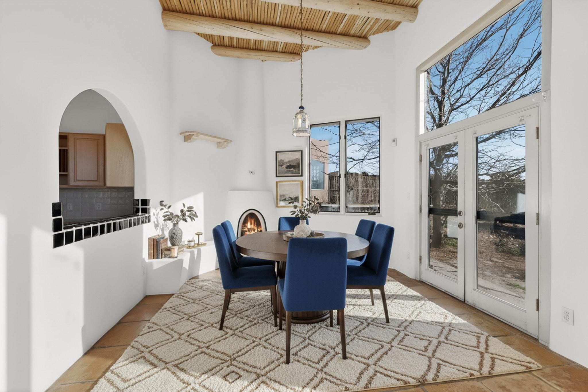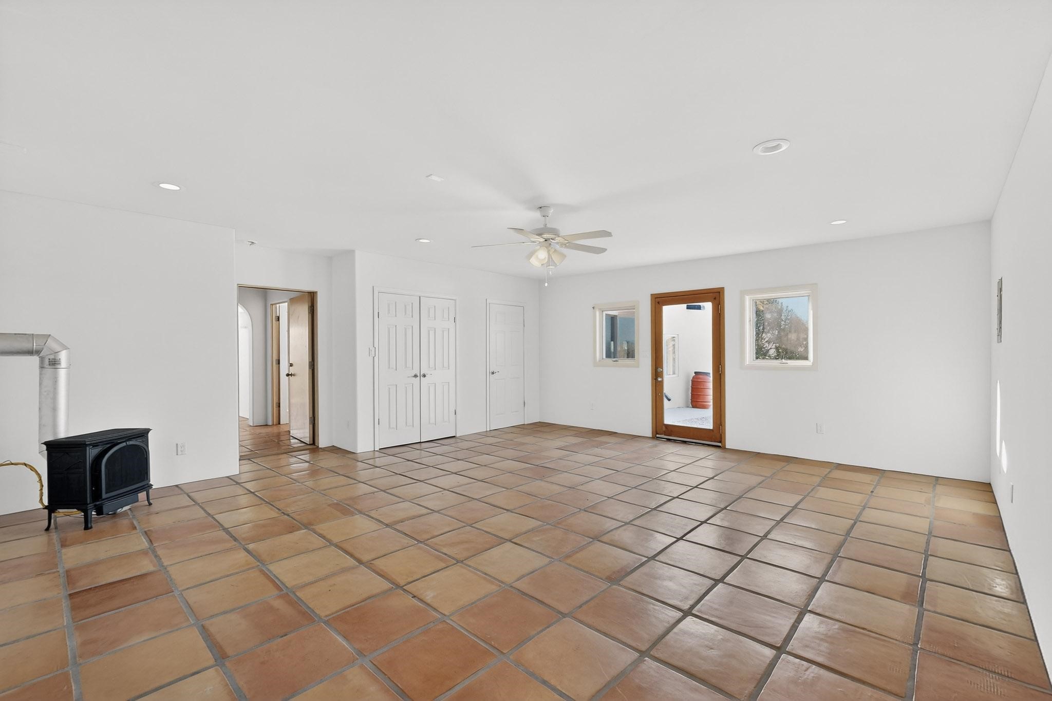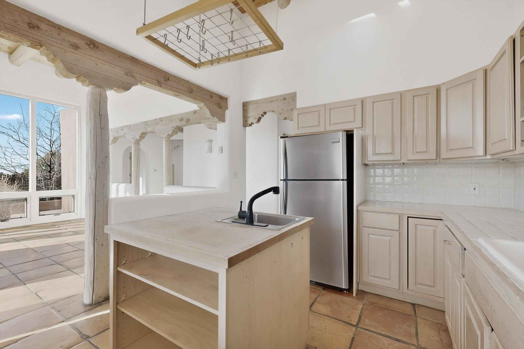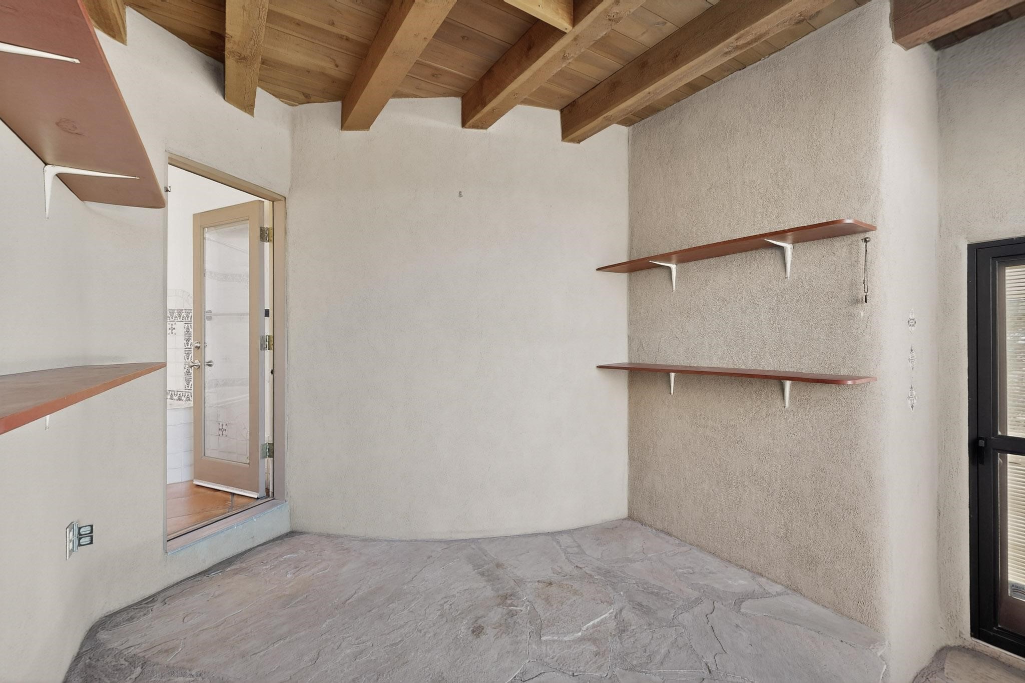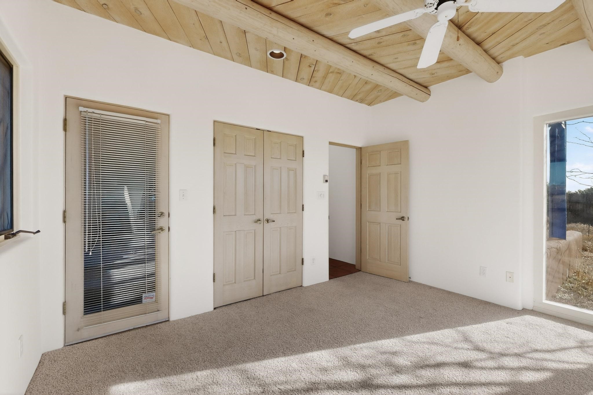 Lovely Eldorado home, situated on an expansive and beautifully landscaped almost 2-acre lot, is filled with natural light and exudes Santa Fe charm. Enjoy panoramic mountain views and amazing sunsets from inside the home and multiple outdoor areas enclosed by coyote fencing and flagstone walk-ways. Offering 2 bedrooms and 2 bathrooms with approximately 2800 square feet, the home features versatile areas perfect for a range of uses. A heated flex space (with gas stove) with appx 390 sqft, separate entrance and direct access to the home provides the ideal setting for a studio, office, workout room, or playroom. Off the spacious primary suite, you'll find a cozy office or sitting room with built-in desk space, as well as a large, light-filled appx 550 sqft unheated room with direct outdoor access--perfect as a work-out room, sitting/TV area, or relaxation space. There is ample storage throughout. The inviting living room boasts soaring ceilings with vigas, a kiva fireplace, and abundant natural light. The owner's suite includes a fireplace and ensuite bath with separate tub and large walk-in show all offering a serene retreat. Car enthusiasts will love the oversized garage (approx. 1,365 sq ft) with room for up to six cars & possibly an RV. Additional highlights include: 4 fireplaces-Abundant skylights-Radiant heat (we have been told not Kitec or Entran II)-Wood doors-Large laundry room with closet & washer/dryer-Saltillo tile floors-Rooftop viewing deck-Vigas in almost every room including bathrooms-Nichos-Banco-Corbels-Archways-Ceiling fans-Newly paved Frasco Rd-Multiple decks and sitting areas and more. This unique property combines Southwestern character with extraordinary versatility and spectacular views.
