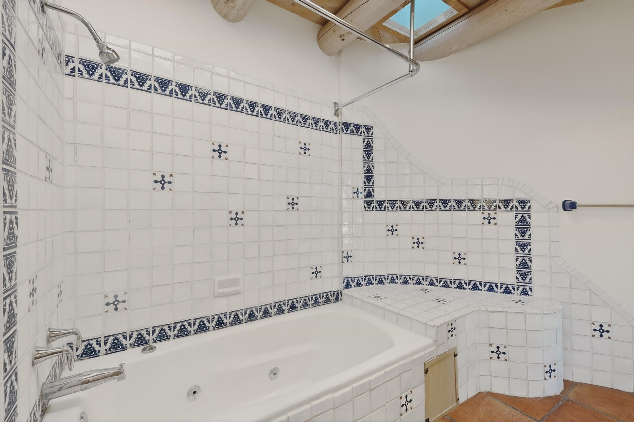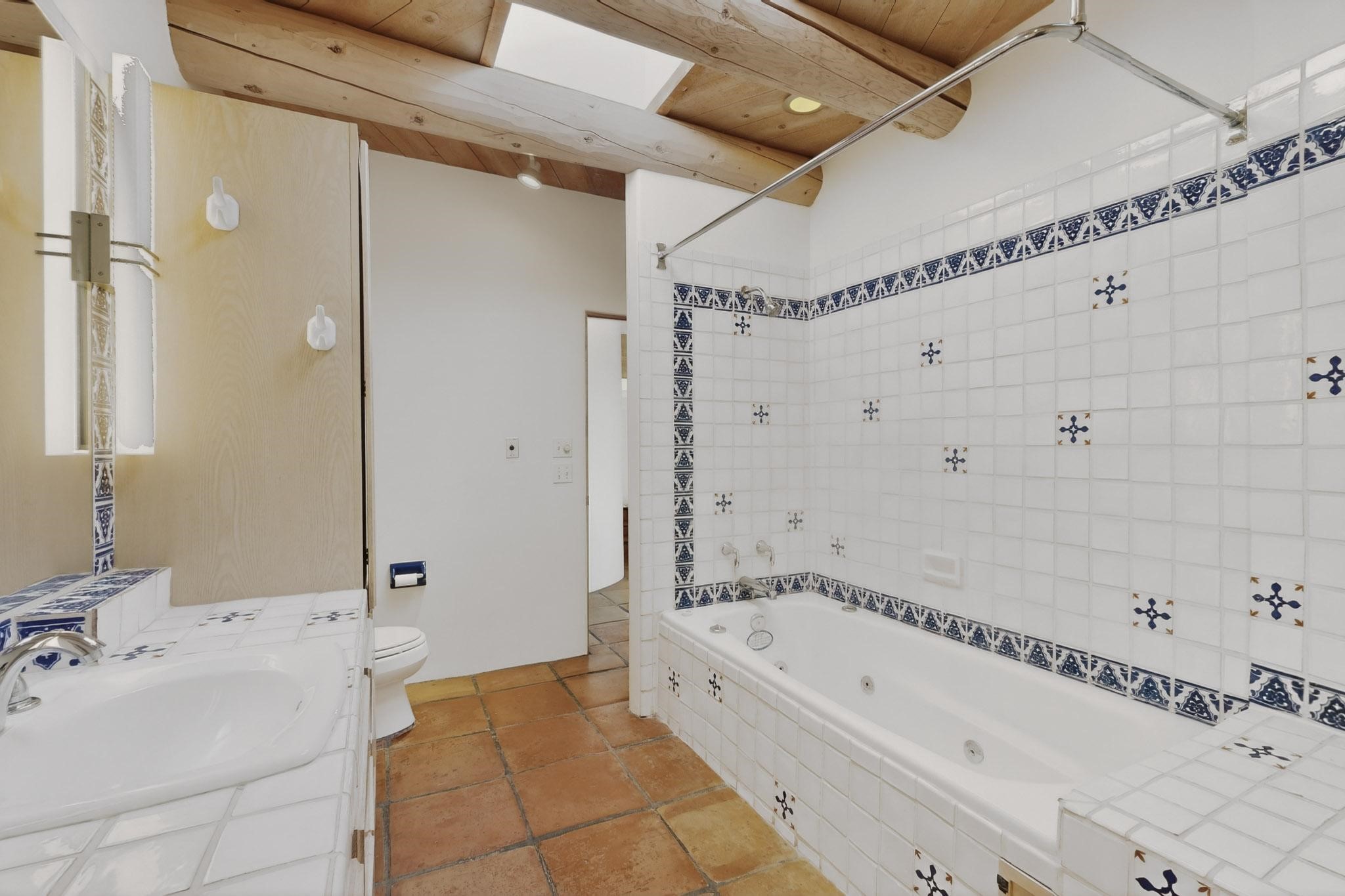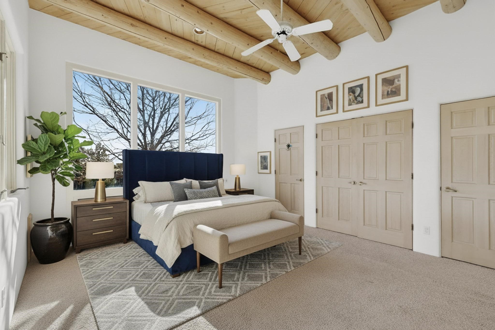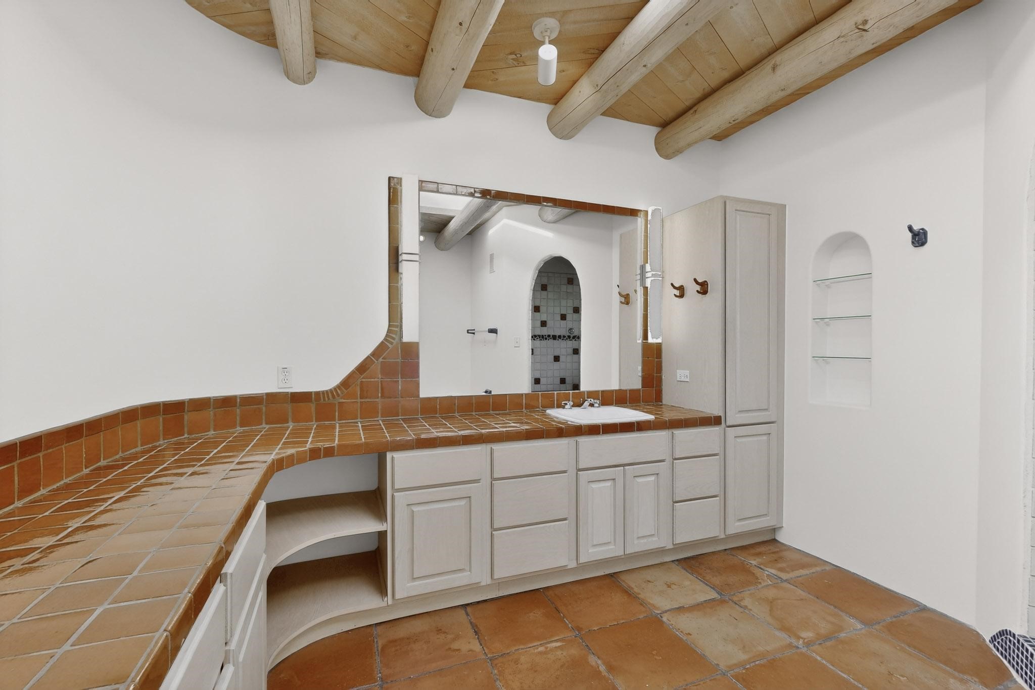 Lovely Eldorado home, situated on an expansive and beautifully landscaped almost 2-acre lot, is filled with natural light and exudes Santa Fe charm. Enjoy panoramic mountain views and amazing sunsets from inside the home and multiple outdoor areas enclosed by coyote fencing and flagstone walk-ways. Offering 2 bedrooms and 2 bathrooms with approximately 2800 square feet, the home features versatile areas perfect for a range of uses. A heated flex space (with gas stove) with appx 390 sqft, separate entrance and direct access to the home provides the ideal setting for a studio, office, workout room, or playroom. Off the spacious primary suite, you'll find a cozy office or sitting room with built-in desk space, as well as a large, light-filled appx 550 sqft unheated room with direct outdoor access--perfect as a work-out room, sitting/TV area, or relaxation space. There is ample storage throughout. The inviting living room boasts soaring ceilings with vigas, a kiva fireplace, and abundant natural light. The owner's suite includes a fireplace and ensuite bath with separate tub and large walk-in show all offering a serene retreat. Car enthusiasts will love the oversized garage (approx. 1,365 sq ft) with room for up to six cars & possibly an RV. Additional highlights include: 4 fireplaces-Abundant skylights-Radiant heat (we have been told not Kitec or Entran II)-Wood doors-Large laundry room with closet & washer/dryer-Saltillo tile floors-Rooftop viewing deck-Vigas in almost every room including bathrooms-Nichos-Banco-Corbels-Archways-Ceiling fans-Newly paved Frasco Rd-Multiple decks and sitting areas and more. This unique property combines Southwestern character with extraordinary versatility and spectacular views.