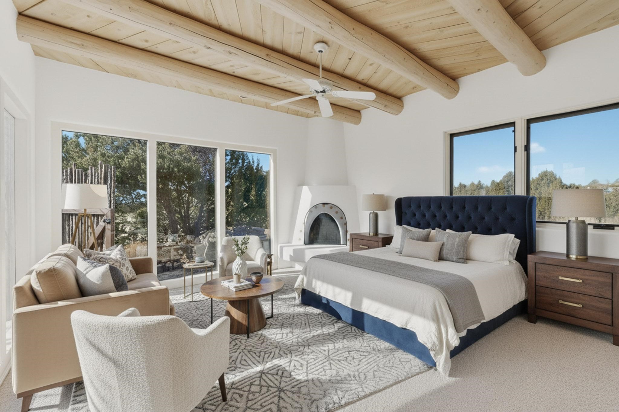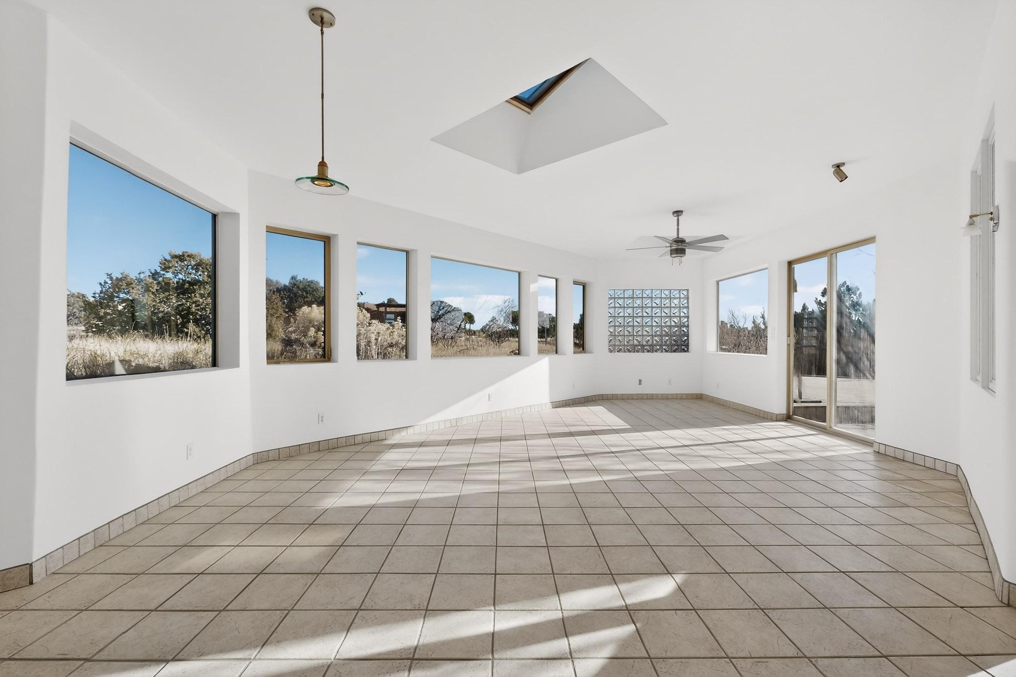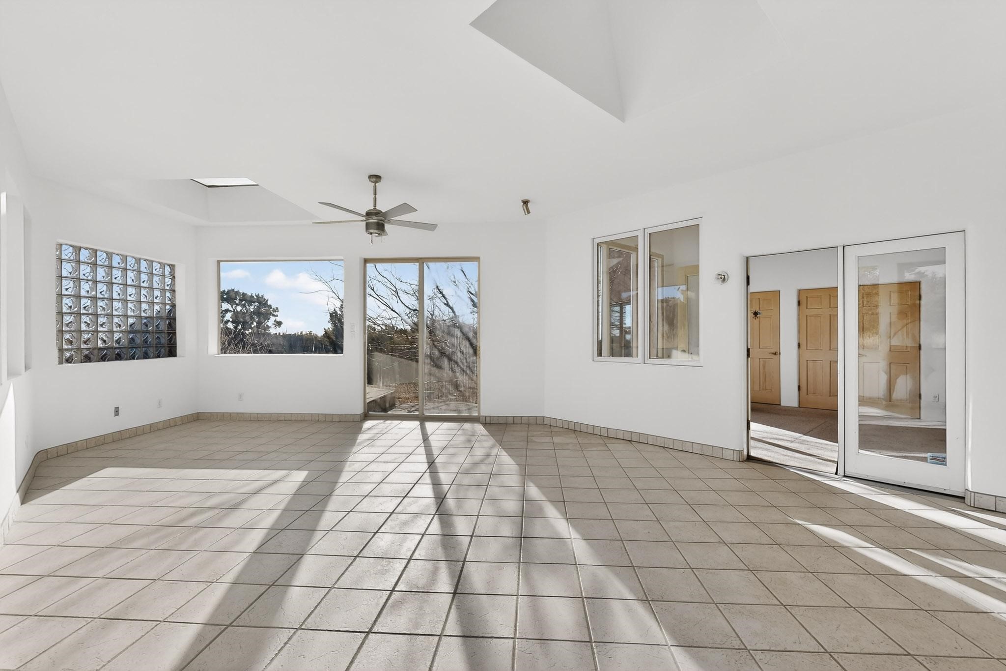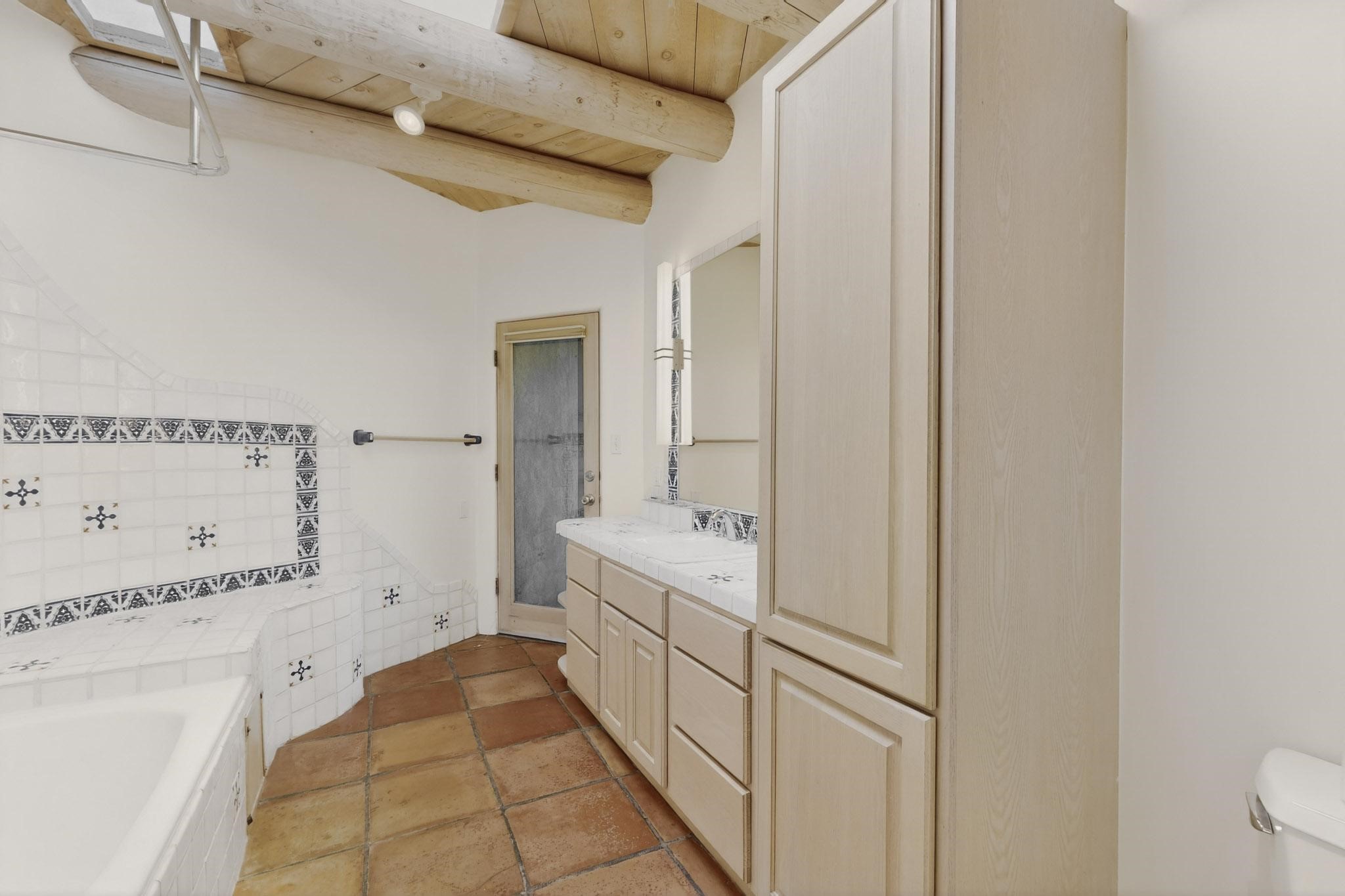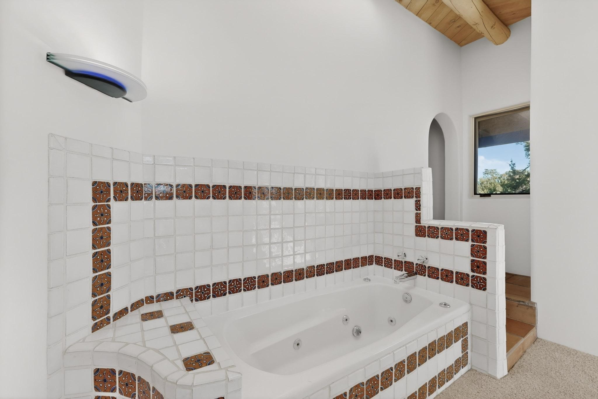 Lovely Eldorado home, situated on an expansive and beautifully landscaped almost 2-acre lot, is filled with natural light and exudes Santa Fe charm. Enjoy panoramic mountain views and amazing sunsets from inside the home and multiple outdoor areas enclosed by coyote fencing and flagstone walk-ways. Offering 2 bedrooms and 2 bathrooms with approximately 2800 square feet, the home features versatile areas perfect for a range of uses. A heated flex space (with gas stove) with appx 390 sqft, separate entrance and direct access to the home provides the ideal setting for a studio, office, workout room, or playroom. Off the spacious primary suite, you'll find a cozy office or sitting room with built-in desk space, as well as a large, light-filled appx 550 sqft unheated room with direct outdoor access--perfect as a work-out room, sitting/TV area, or relaxation space. There is ample storage throughout. The inviting living room boasts soaring ceilings with vigas, a kiva fireplace, and abundant natural light. The owner's suite includes a fireplace and ensuite bath with separate tub and large walk-in show all offering a serene retreat. Car enthusiasts will love the oversized garage (approx. 1,365 sq ft) with room for up to six cars & possibly an RV. Additional highlights include: 4 fireplaces-Abundant skylights-Radiant heat (we have been told not Kitec or Entran II)-Wood doors-Large laundry room with closet & washer/dryer-Saltillo tile floors-Rooftop viewing deck-Vigas in almost every room including bathrooms-Nichos-Banco-Corbels-Archways-Ceiling fans-Newly paved Frasco Rd-Multiple decks and sitting areas and more. This unique property combines Southwestern character with extraordinary versatility and spectacular views.