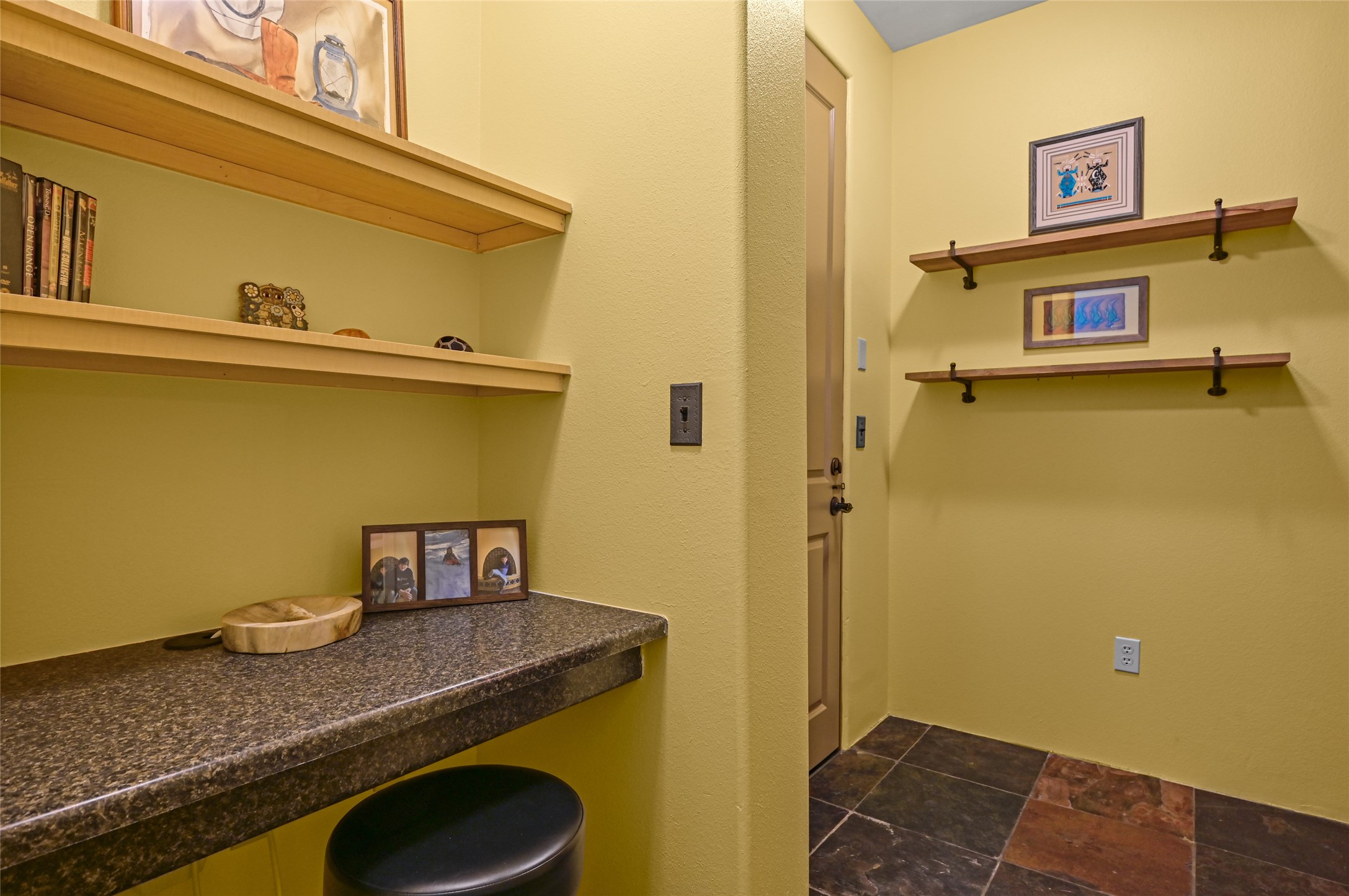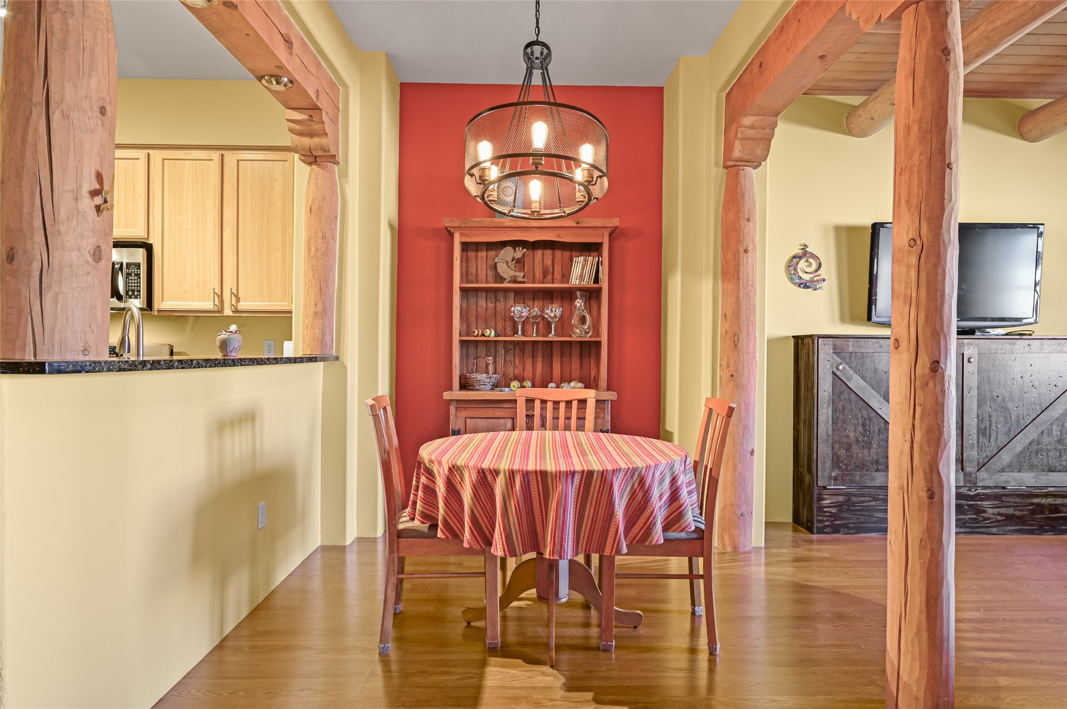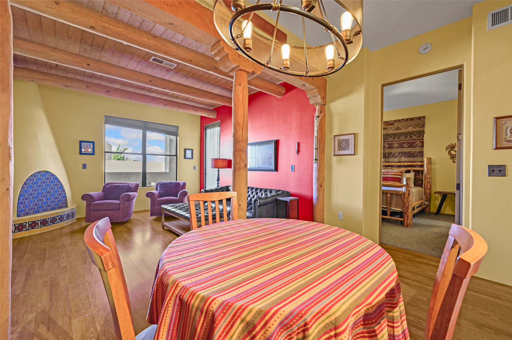 Simple living at The Alameda. This move-in-ready condominium offers one bedroom and one-and-a-half baths, showcasing classic Santa Fe architectural charm with exposed vigas and corbels, along with wood-like and slate tile flooring, granite countertops, and a gas kiva fireplace. A built-in office area provides an ideal work-from-home solution, complemented by an in-unit laundry room for added convenience.Ideally situated near the elevator and the door to the parking area, the location offers exceptional ease for daily living and bringing in groceries or supplies. The open, well-lit floor plan is warmed by the gas kiva fireplace--perfect for winter months--while stainless steel appliances and granite countertops elevate the kitchen's polished finish.The Alameda condominiums offer premier amenities, including a fitness center, community kitchen, multiple lounge and common areas, and a heated outdoor courtyard pool with BBQ grill. Residents enjoy periodic community events and happy hours that enhance the sense of community.Additional features include an extra storage unit conveniently located 2 doors down the hall, a single-car garage, onsite professional management, and 24-hour controlled access. Centrally located near shopping, dining, and entertainment, this residence blends timeless Santa Fe style with modern comfort and convenience.
