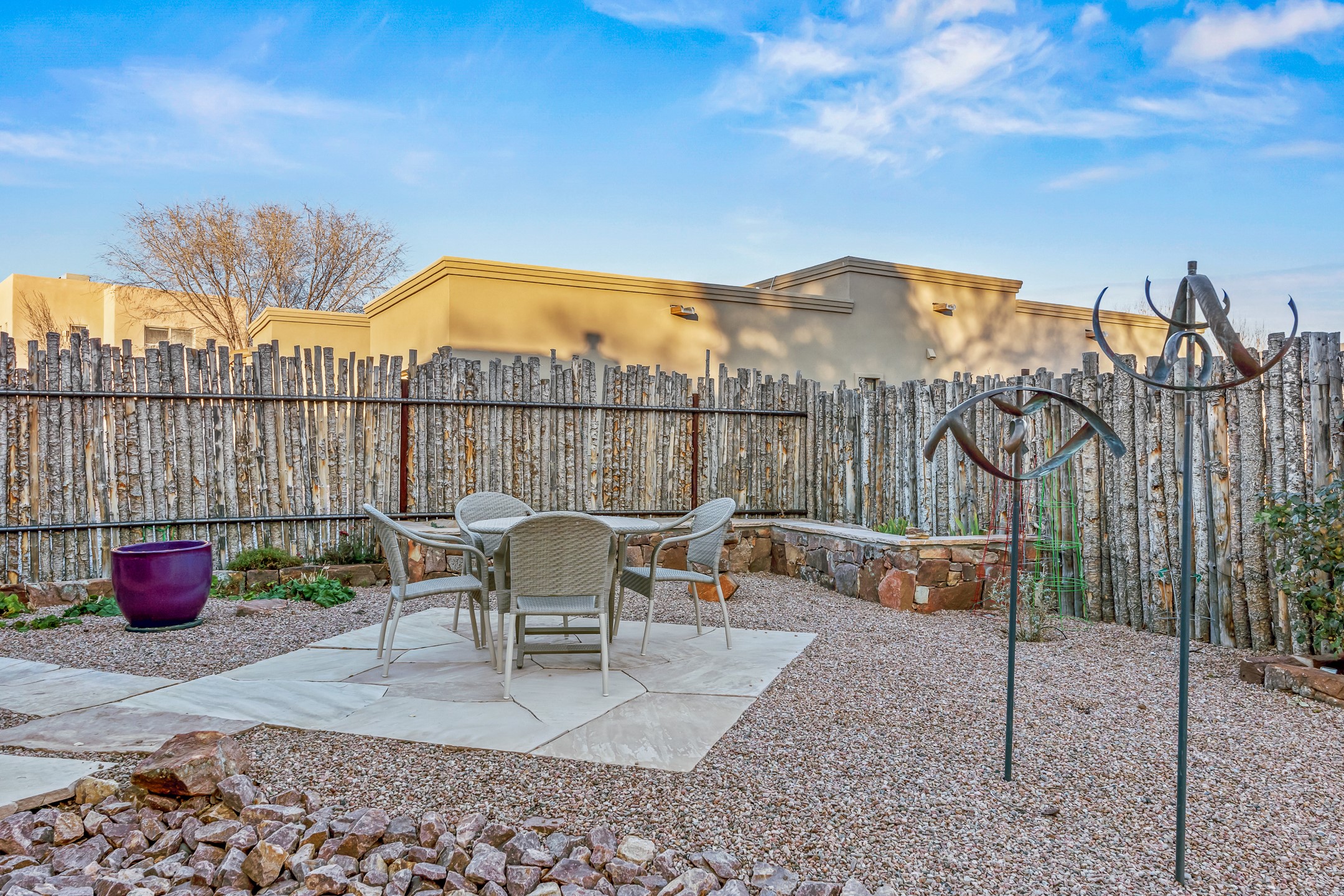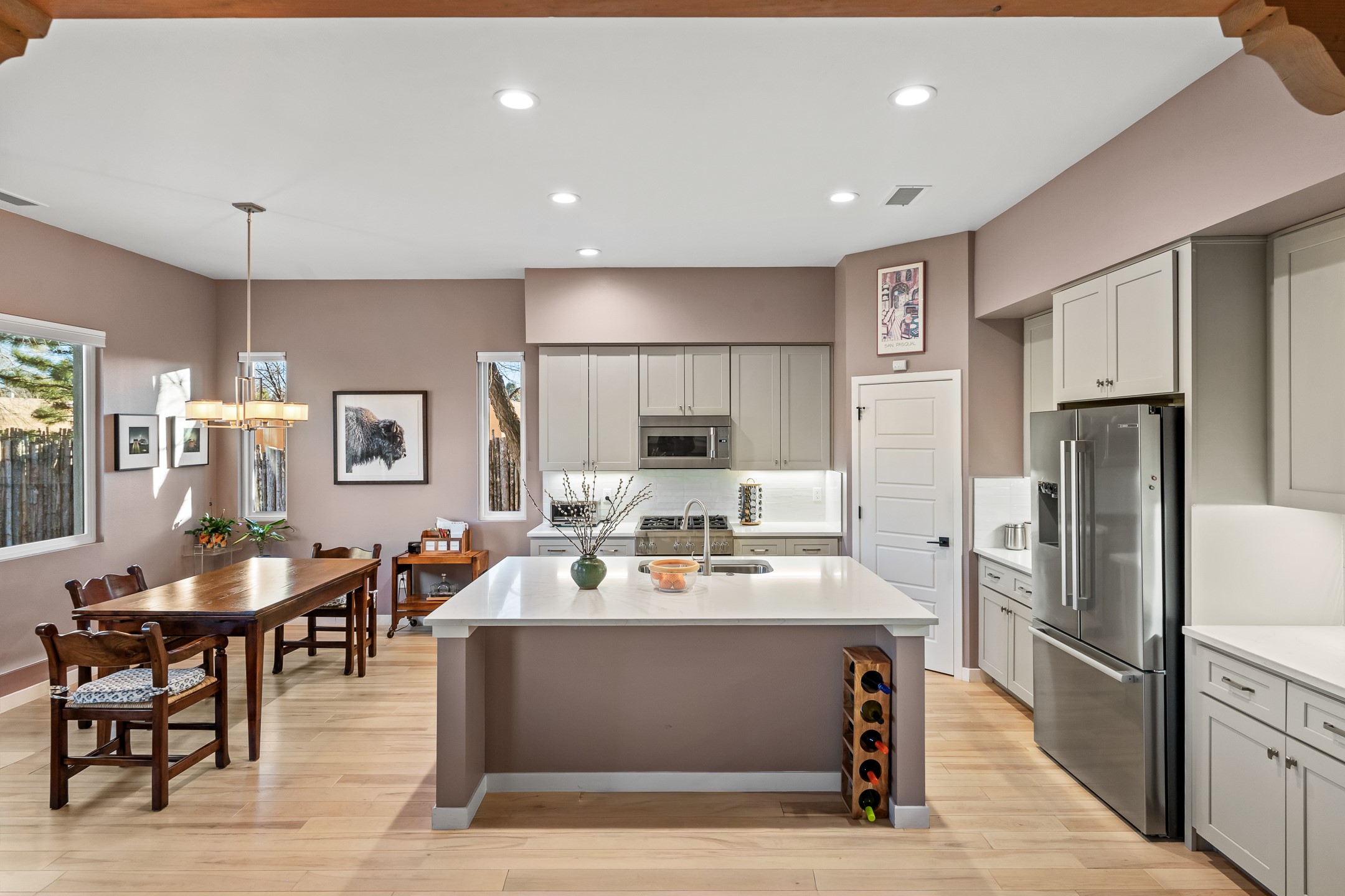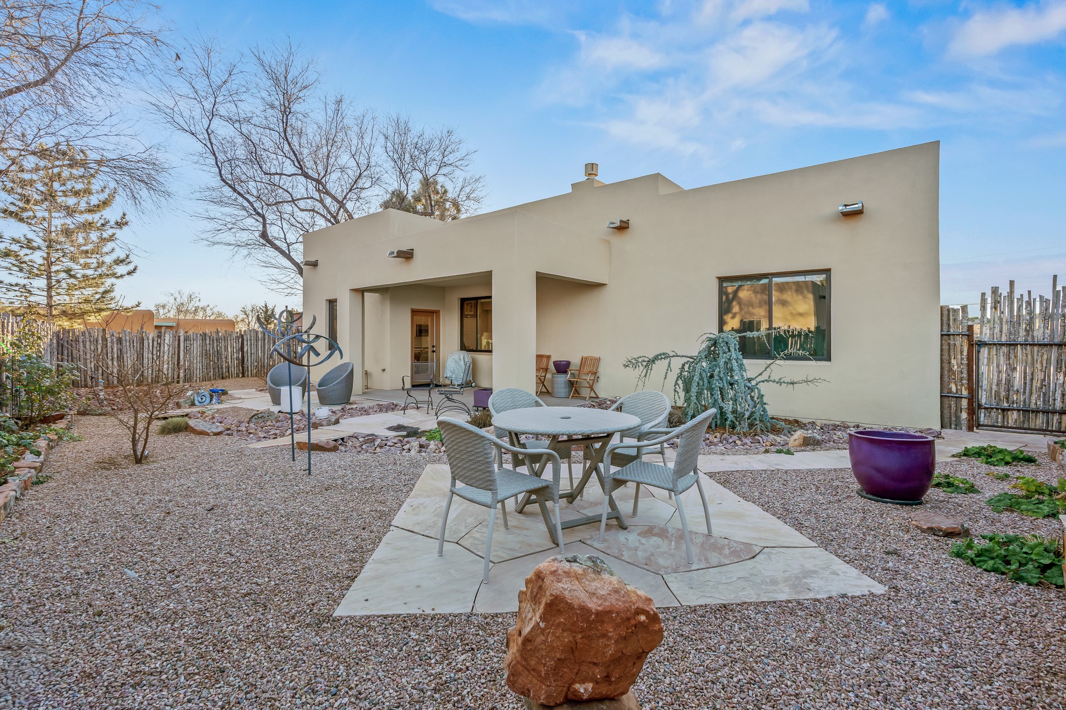 Built in 2022 by Arete Homes of Santa Fe, this beautifully designed single-level 3BD/2BA home offers 1,685 sq. ft. of light-filled living just minutes from The Plaza. Set on a 0.22-acre lot, it enjoys rare privacy, space, and a landscaped backdrop that feels like a hidden oasis. The open-concept kitchen, living, and dining area flows effortlessly into the beautifully hardscaped backyard--complete with flagstone patios, raised garden beds, and lush plantings. The kitchen is the social heart of the home, featuring stone countertops, brand-new stainless steel appliances (Bosch refrigerator and dishwasher/ Thermador oven and microwave), a central island with bar seating, and a sink perfectly placed for both prep and conversation. The living room is anchored by a gas kiva fireplace and rich hardwood floors, which extend throughout the main living areas and bedrooms. Two generous guest bedrooms share a well-appointed full bathroom off the main hallway. The private primary suite is ideally sited in the Northeast corner of the home, offering views of the backyard, abundant natural light, a spacious walk-in closet, and a serene en suite bath with double vanities and a large walk-in shower. Additional highlights include forced air heating and central air conditioning, a full laundry room with utility sink, and a coveted attached two-car garage. New construction opportunities in downtown Santa Fe are exceptionally rare--1728 Callejon Melinda presents a unique chance to enjoy the ease of newer construction in a quiet, tucked-away location near everything Santa Fe has to offer.