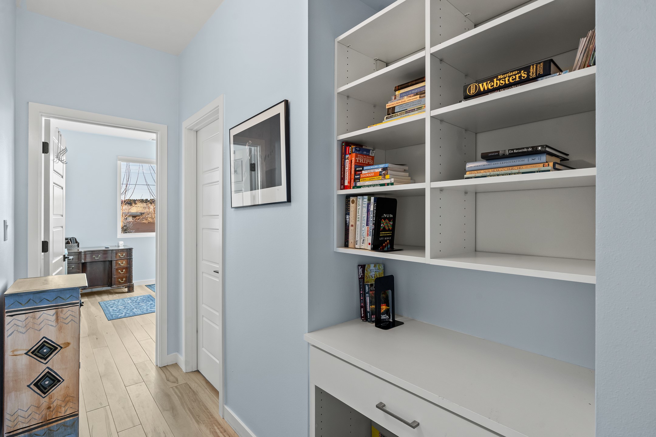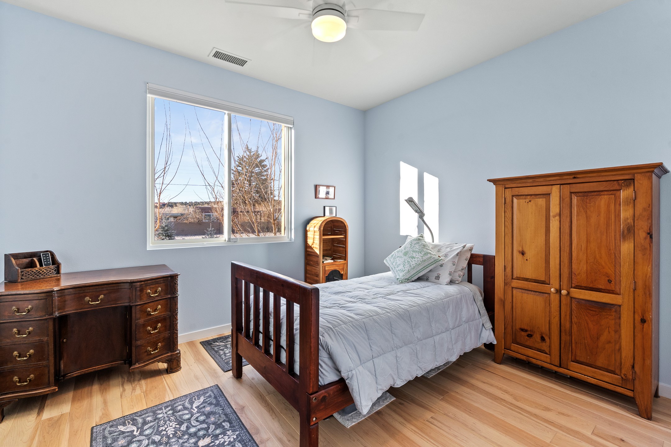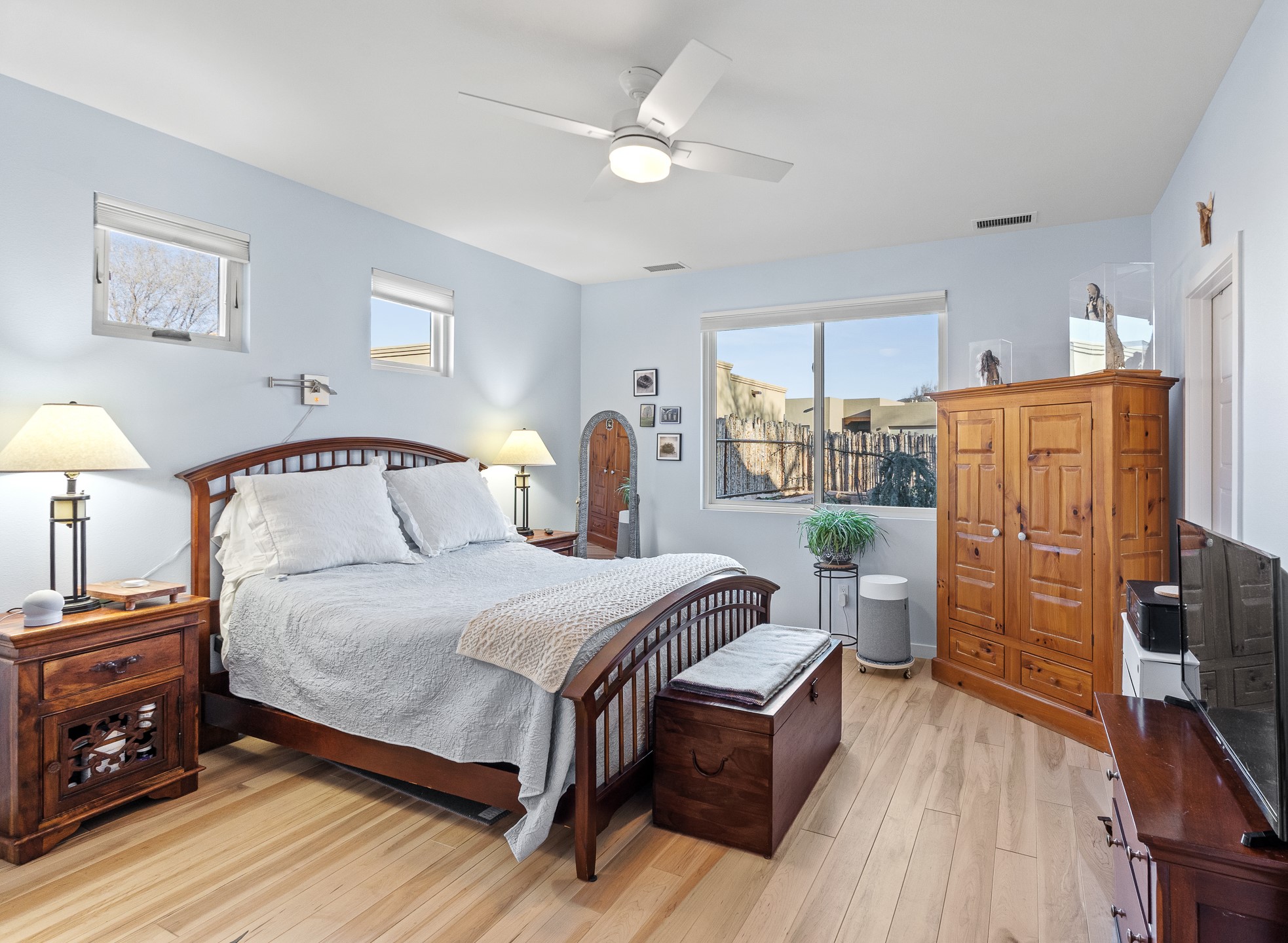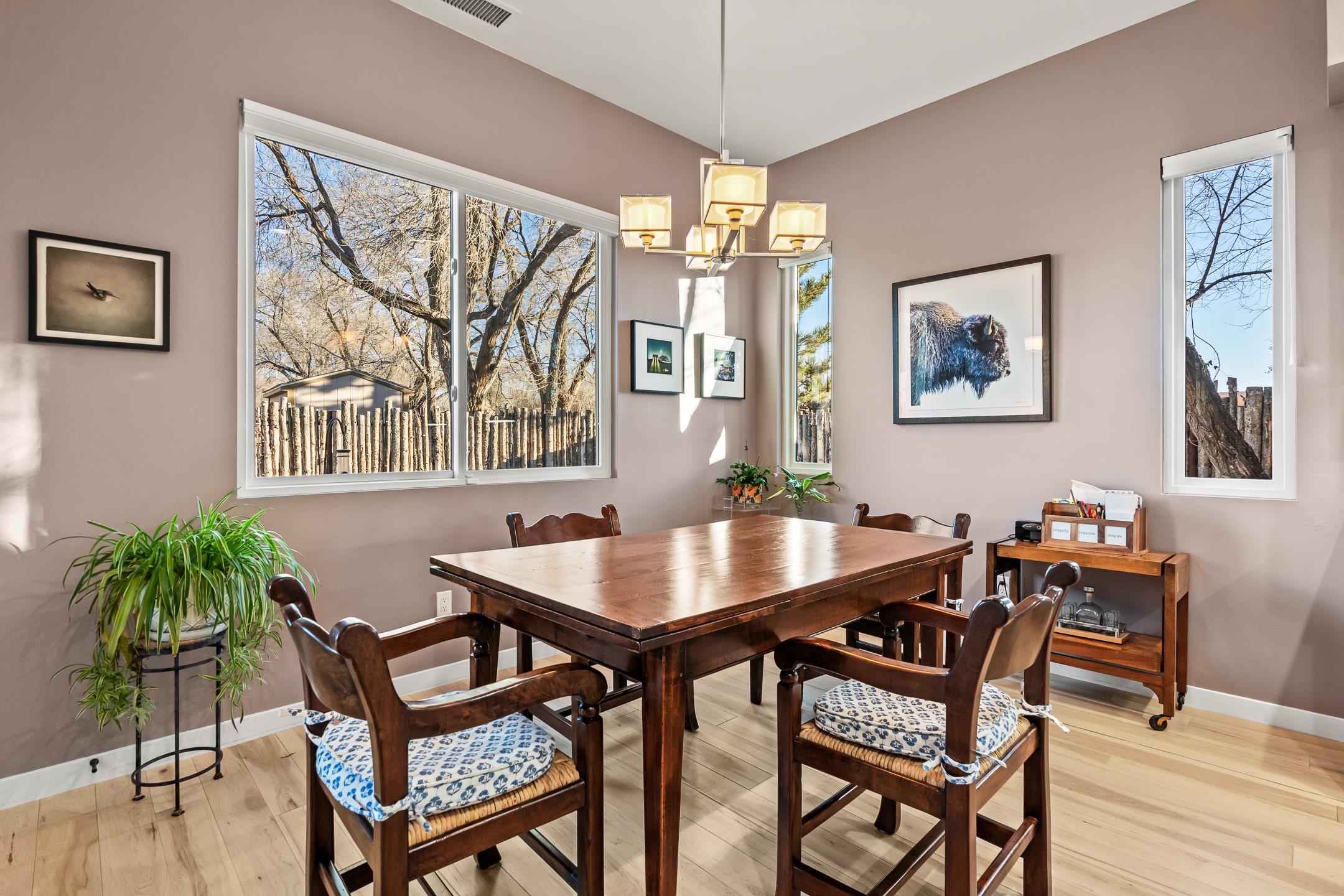 Built in 2022 by Arete Homes of Santa Fe, this beautifully designed single-level 3BD/2BA home offers 1,685 sq. ft. of light-filled living just minutes from The Plaza. Set on a 0.22-acre lot, it enjoys rare privacy, space, and a landscaped backdrop that feels like a hidden oasis. The open-concept kitchen, living, and dining area flows effortlessly into the beautifully hardscaped backyard--complete with flagstone patios, raised garden beds, and lush plantings. The kitchen is the social heart of the home, featuring stone countertops, brand-new stainless steel appliances (Bosch refrigerator and dishwasher/ Thermador oven and microwave), a central island with bar seating, and a sink perfectly placed for both prep and conversation. The living room is anchored by a gas kiva fireplace and rich hardwood floors, which extend throughout the main living areas and bedrooms. Two generous guest bedrooms share a well-appointed full bathroom off the main hallway. The private primary suite is ideally sited in the Northeast corner of the home, offering views of the backyard, abundant natural light, a spacious walk-in closet, and a serene en suite bath with double vanities and a large walk-in shower. Additional highlights include forced air heating and central air conditioning, a full laundry room with utility sink, and a coveted attached two-car garage. New construction opportunities in downtown Santa Fe are exceptionally rare--1728 Callejon Melinda presents a unique chance to enjoy the ease of newer construction in a quiet, tucked-away location near everything Santa Fe has to offer.